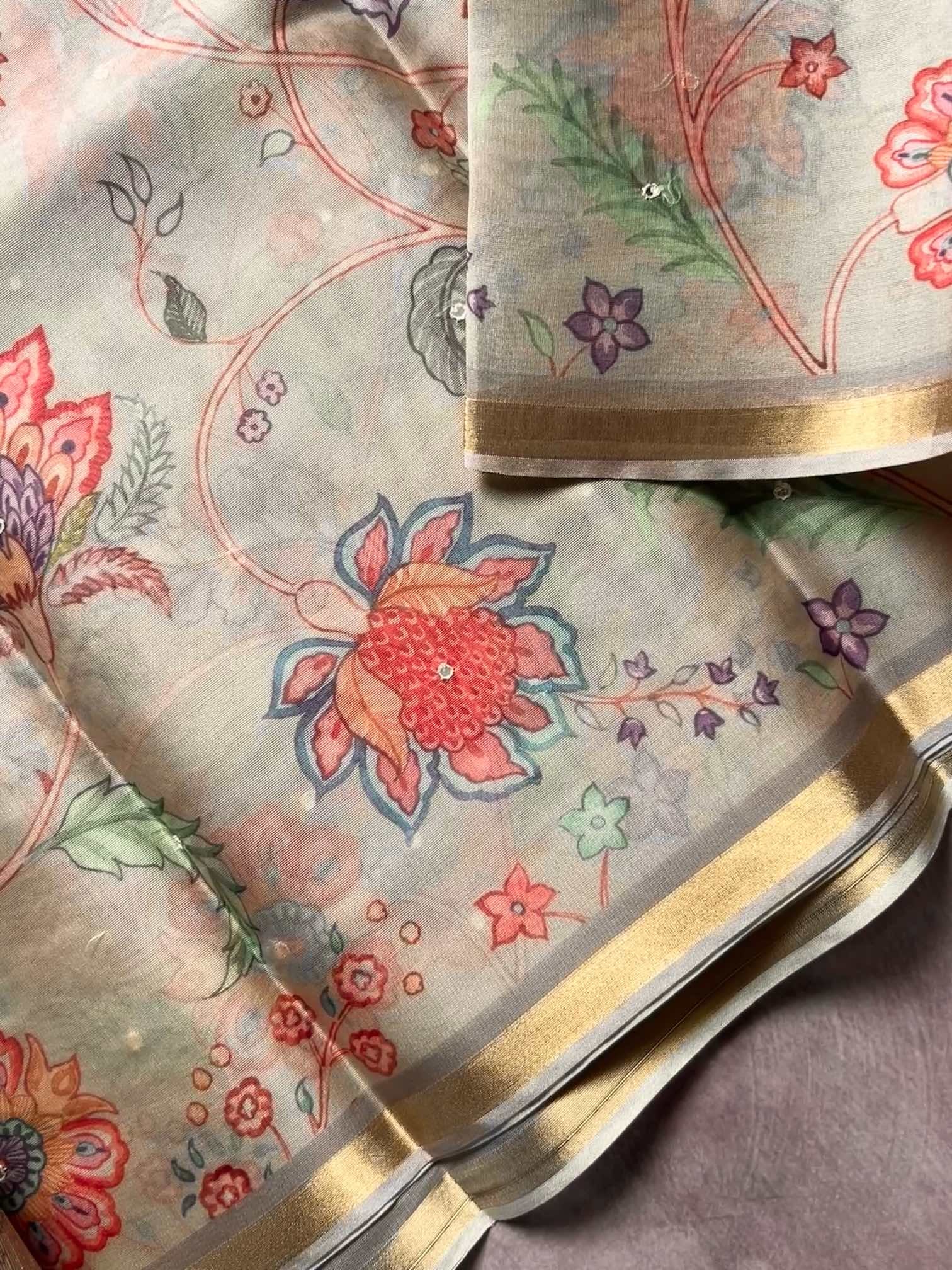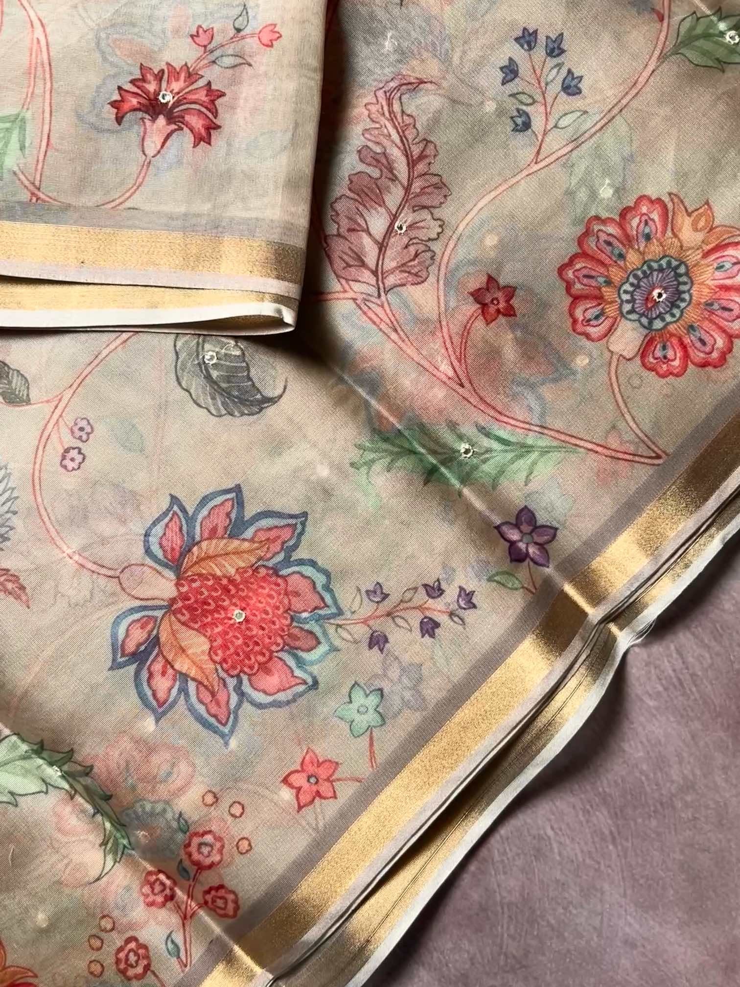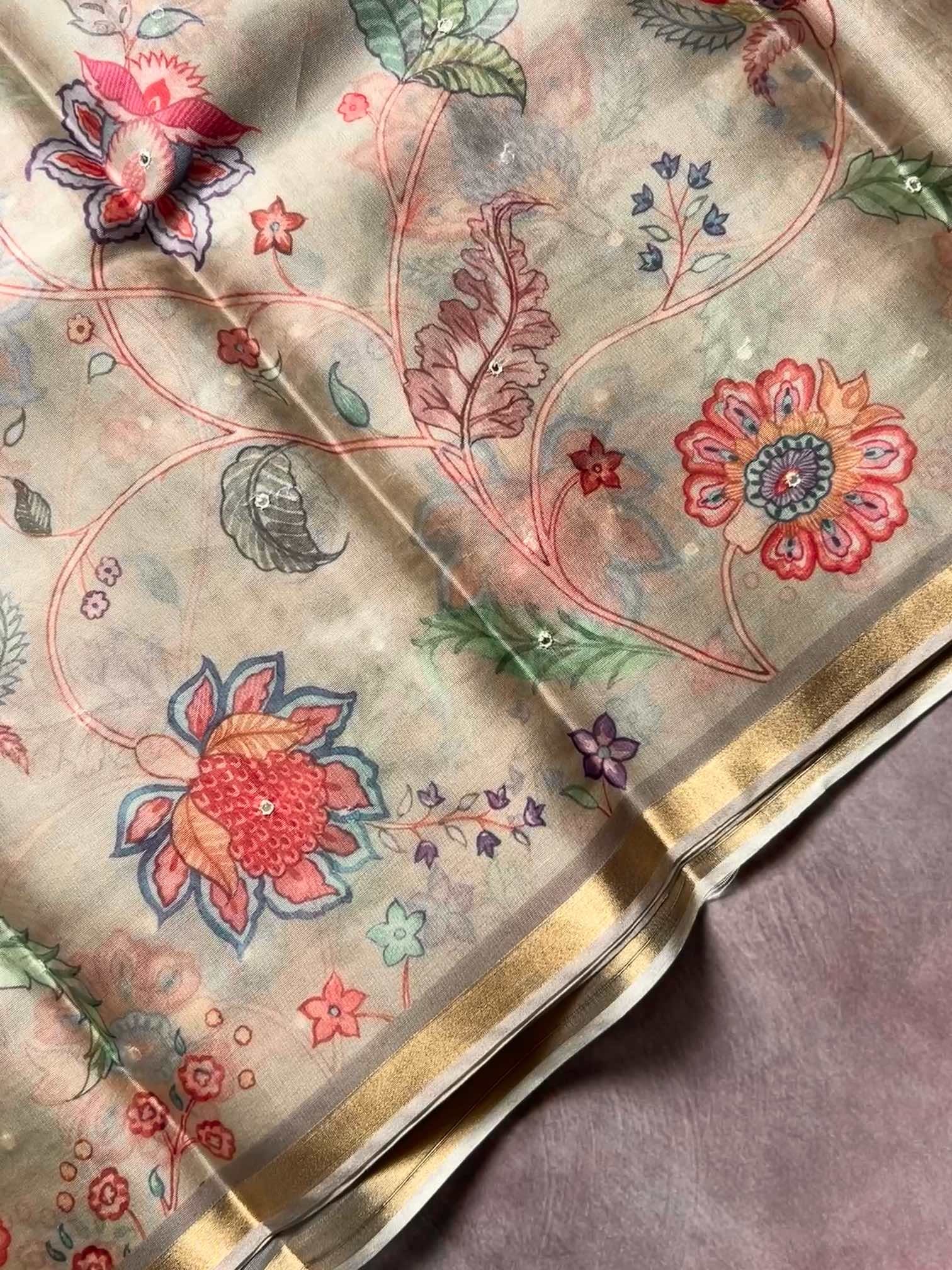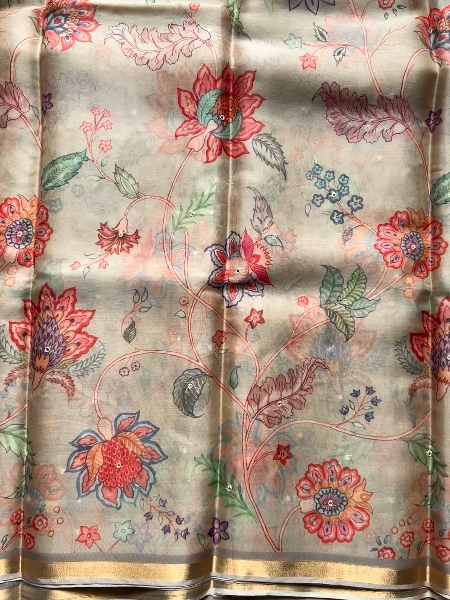 The lightweight synthetic fabric drapes effortlessly, while vibrant digital prints add sharp, contemporary designs. Intricate mirror-work embroidery enhances the saree with a touch of sparkle, making it perfect for festive occasions, parties, and celebrations.