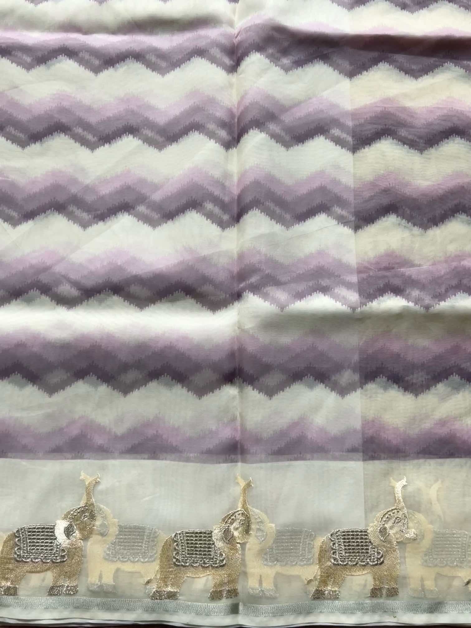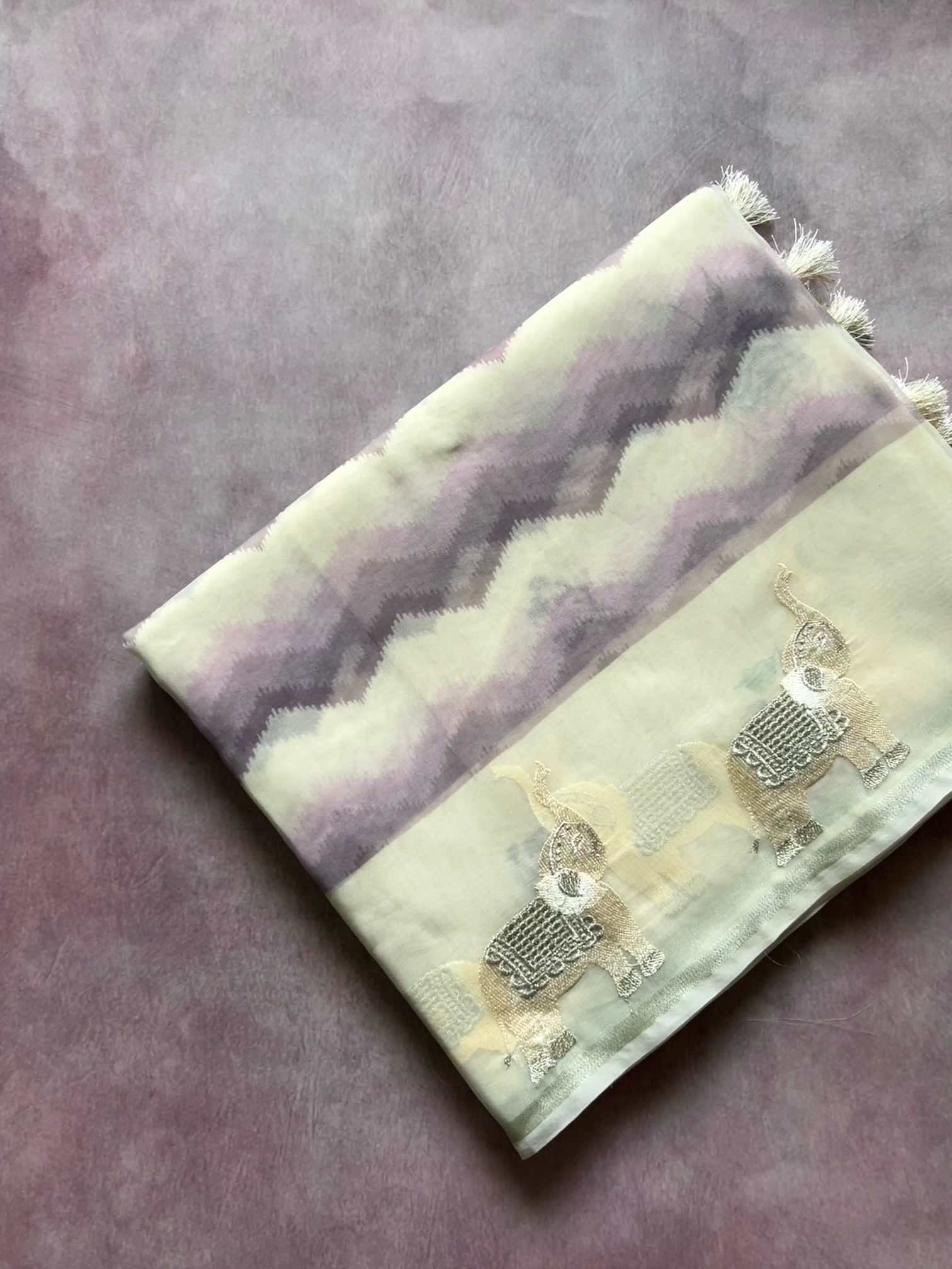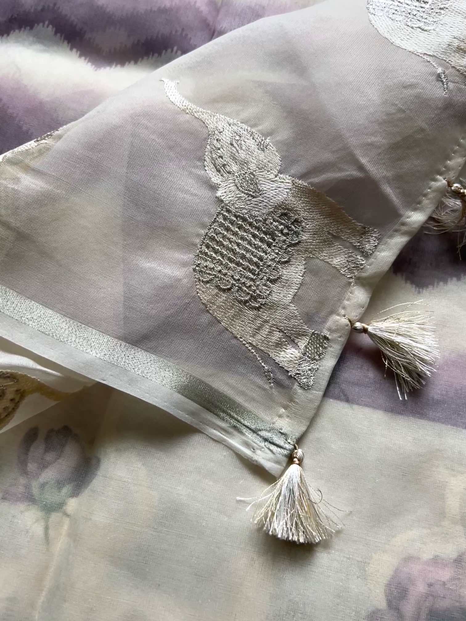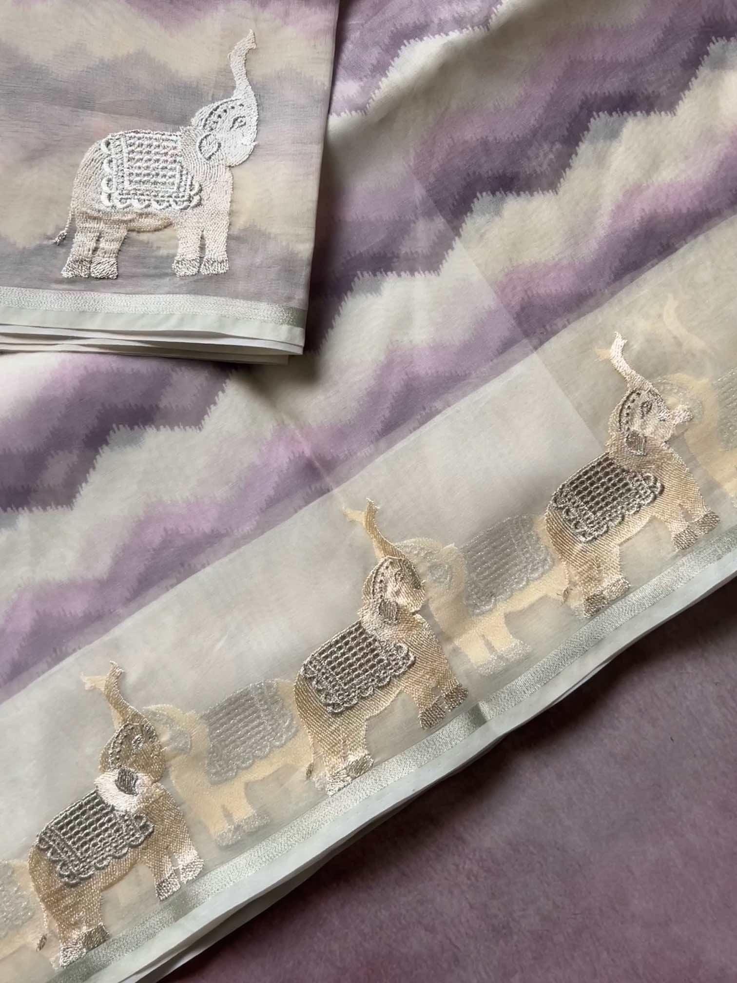 White printed fancy sarees with embroidered elephant motifs carry a quiet, graceful beauty. The soft white base feels pure and elegant, letting the delicate prints breathe, while the elephant embroidery adds a touch of tradition, strength, and charm