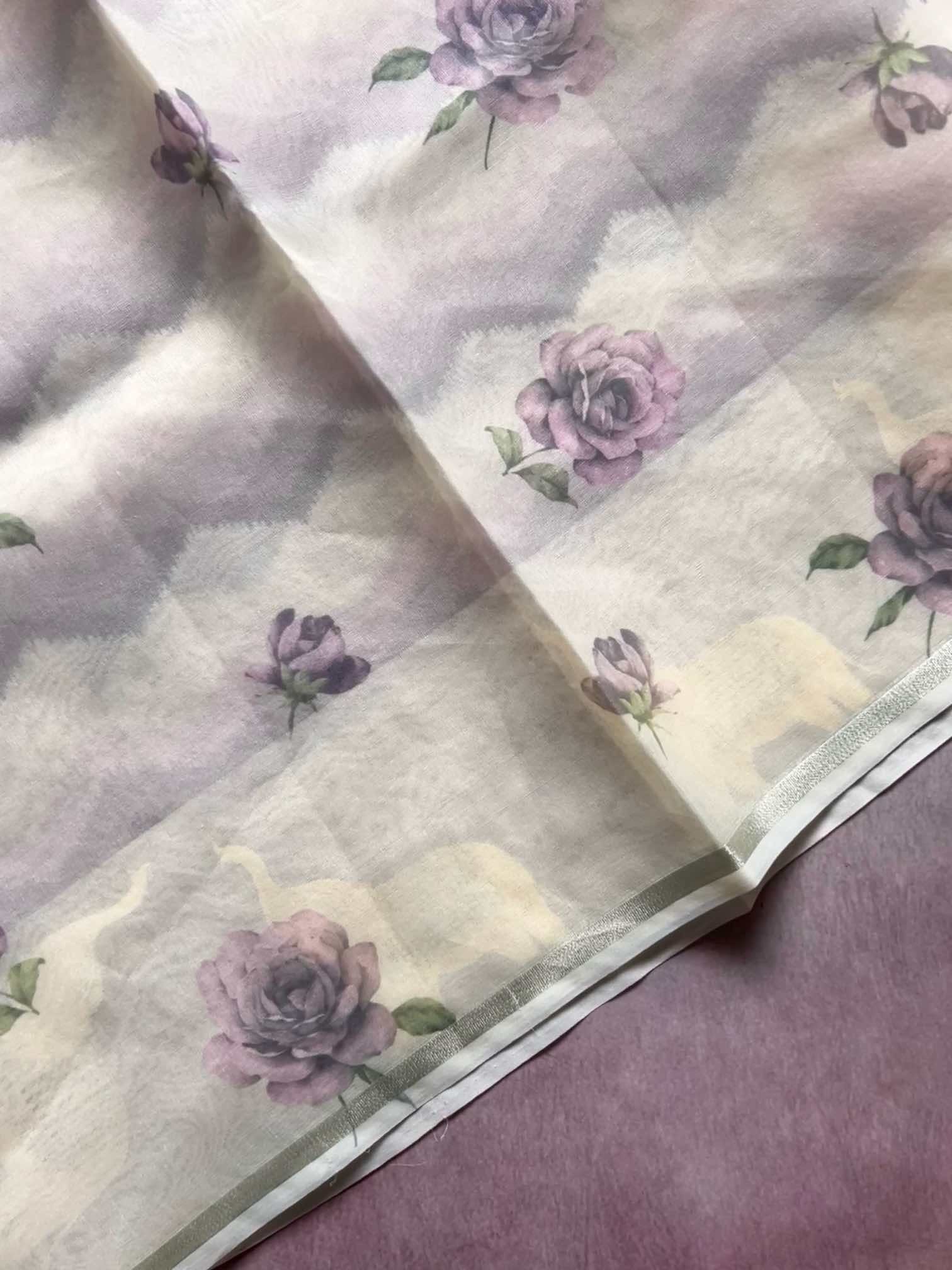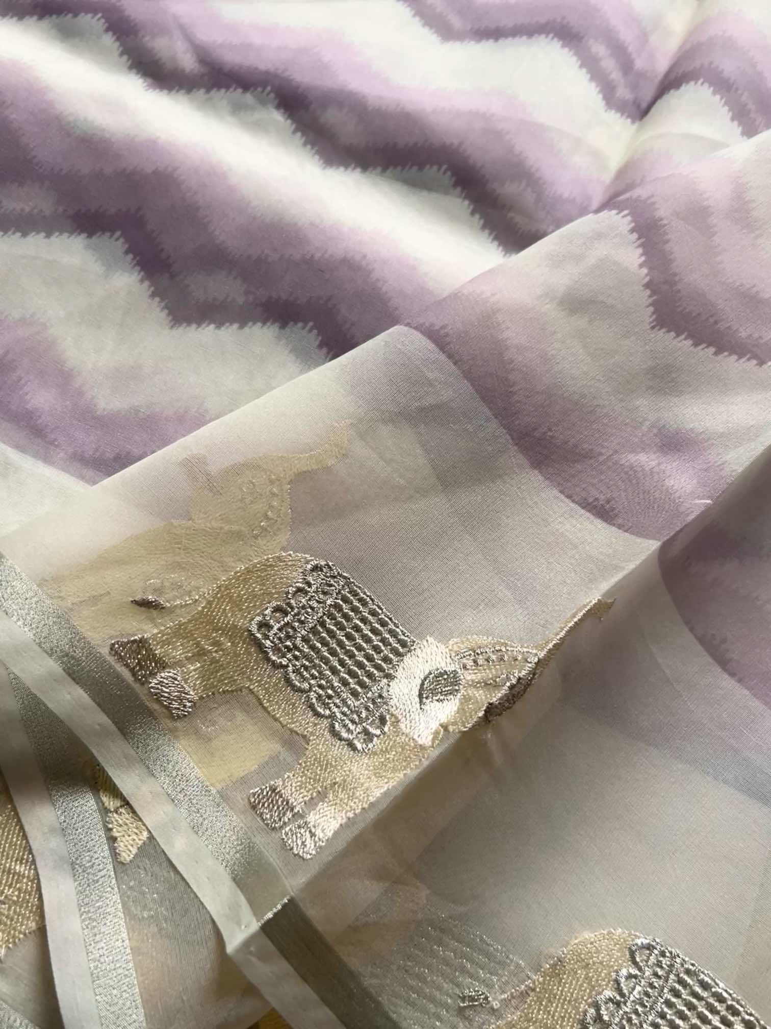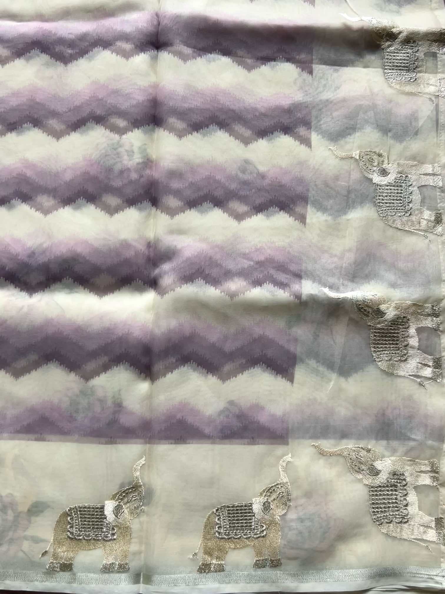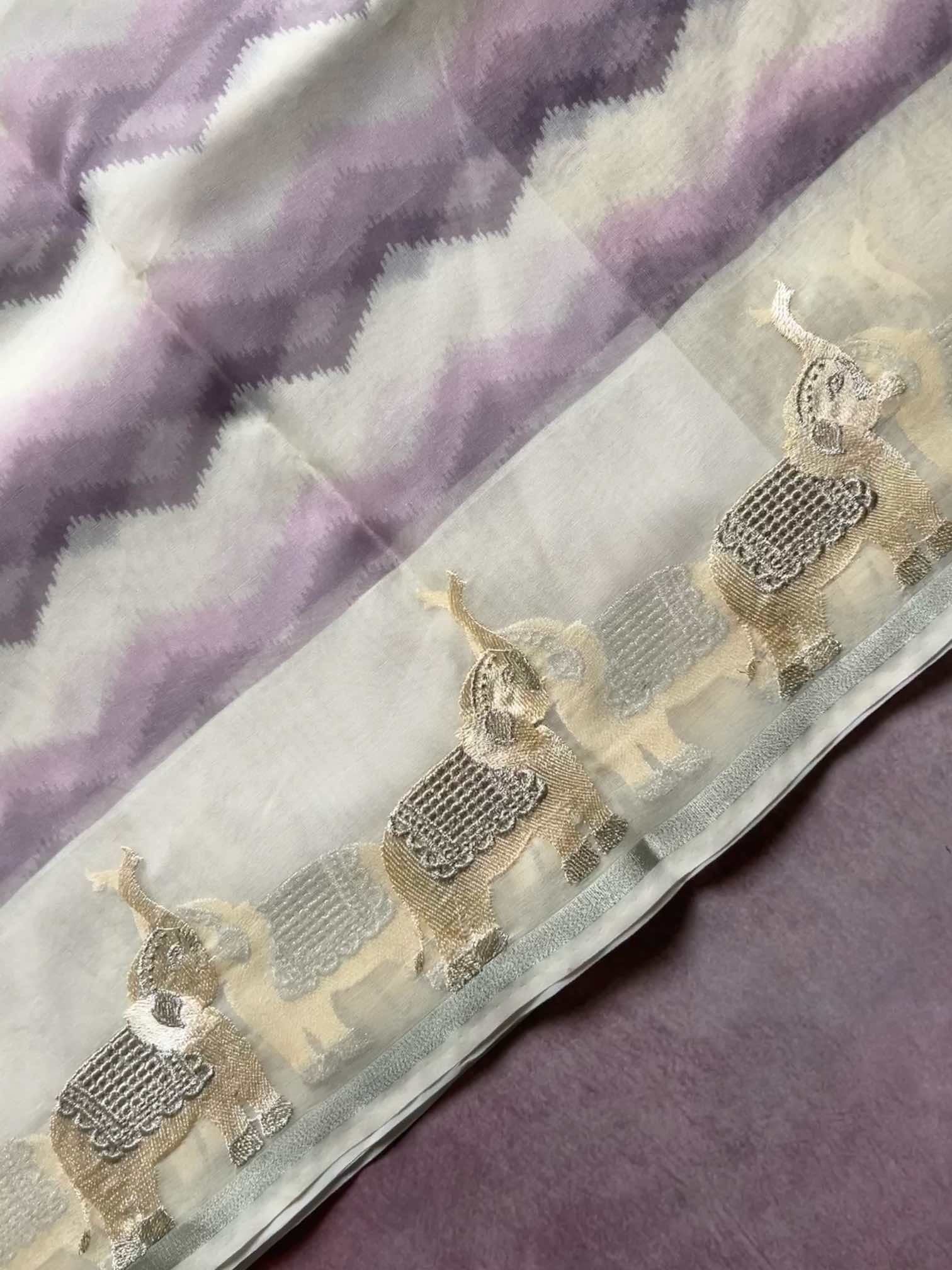 White printed fancy sarees with embroidered elephant motifs carry a quiet, graceful beauty. The soft white base feels pure and elegant, letting the delicate prints breathe, while the elephant embroidery adds a touch of tradition, strength, and charm