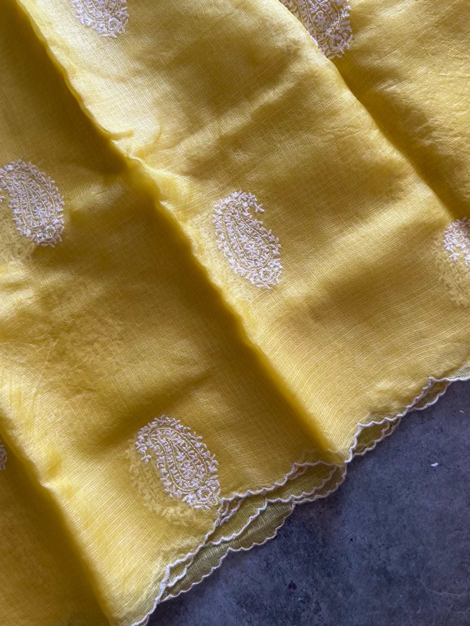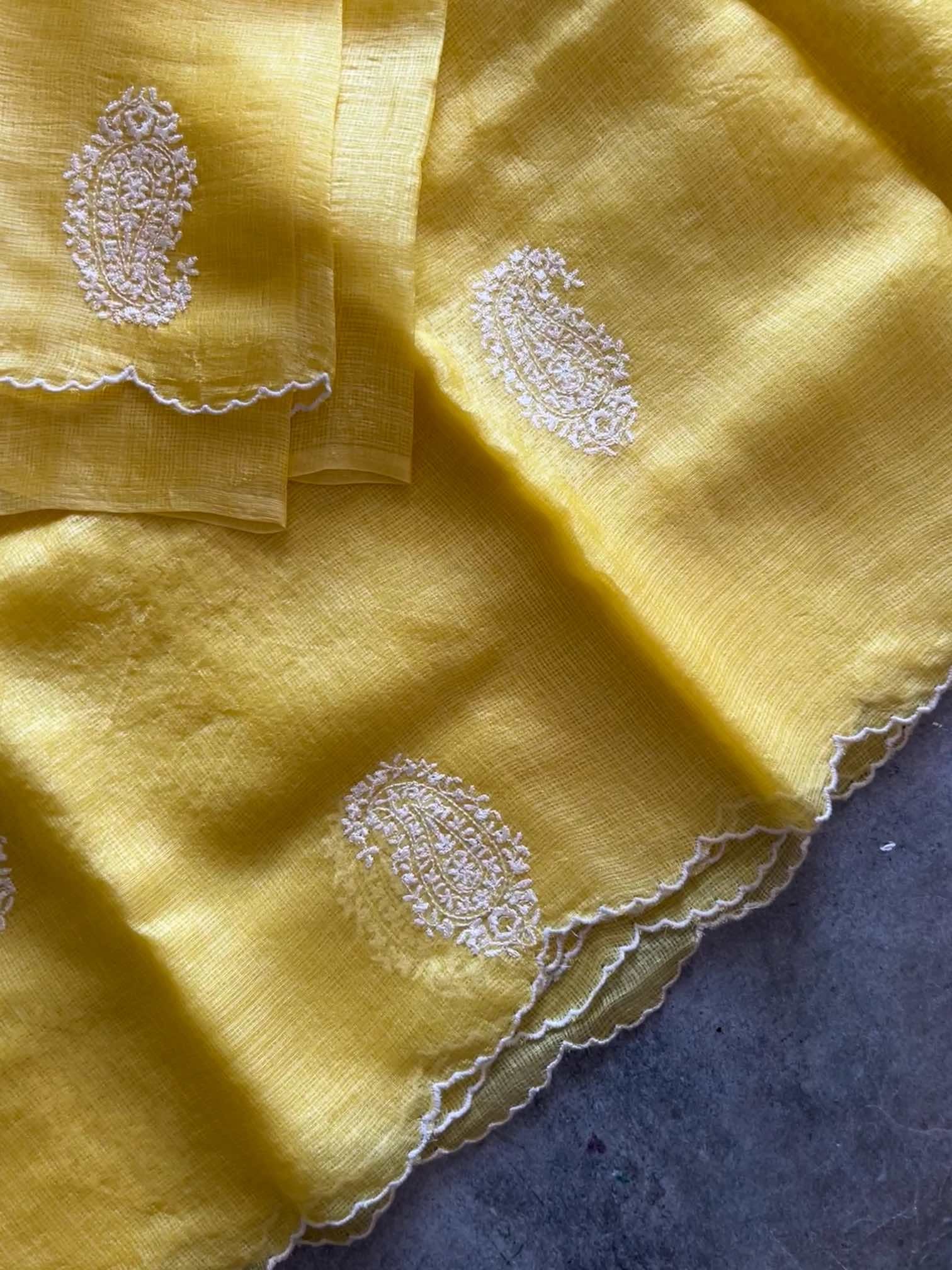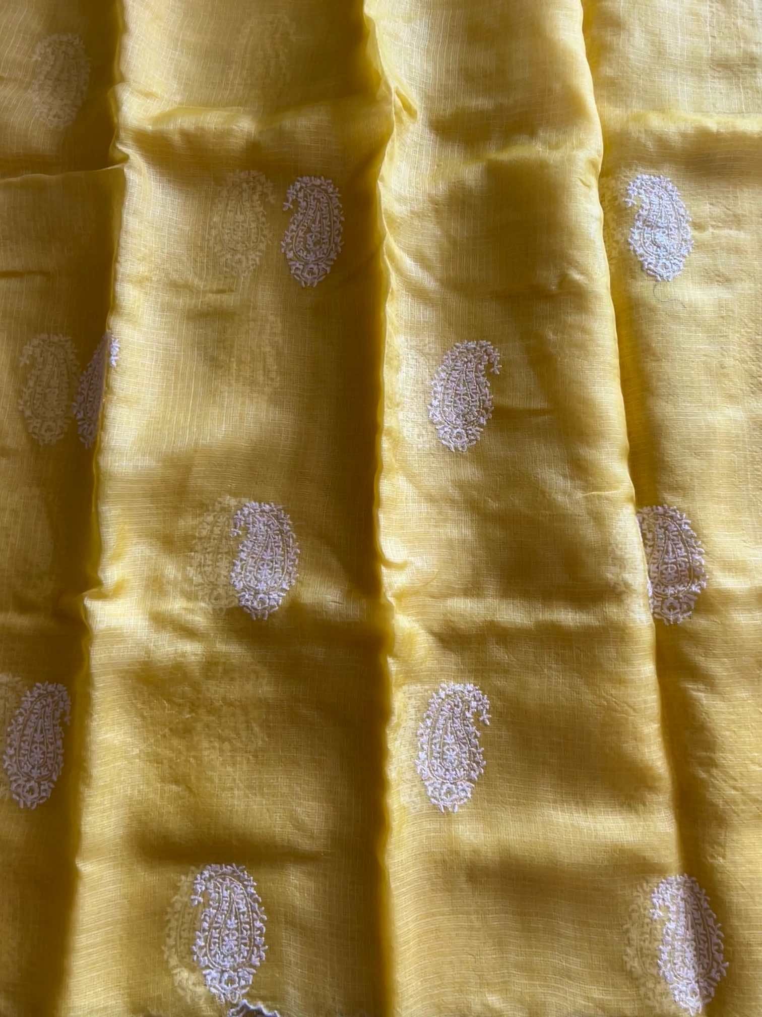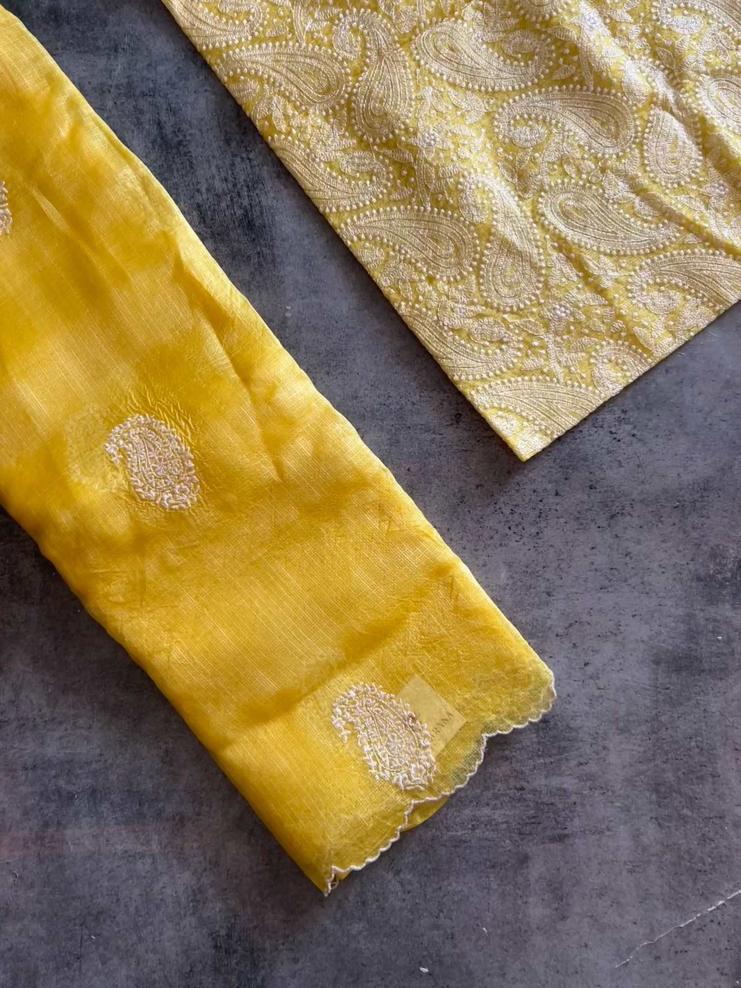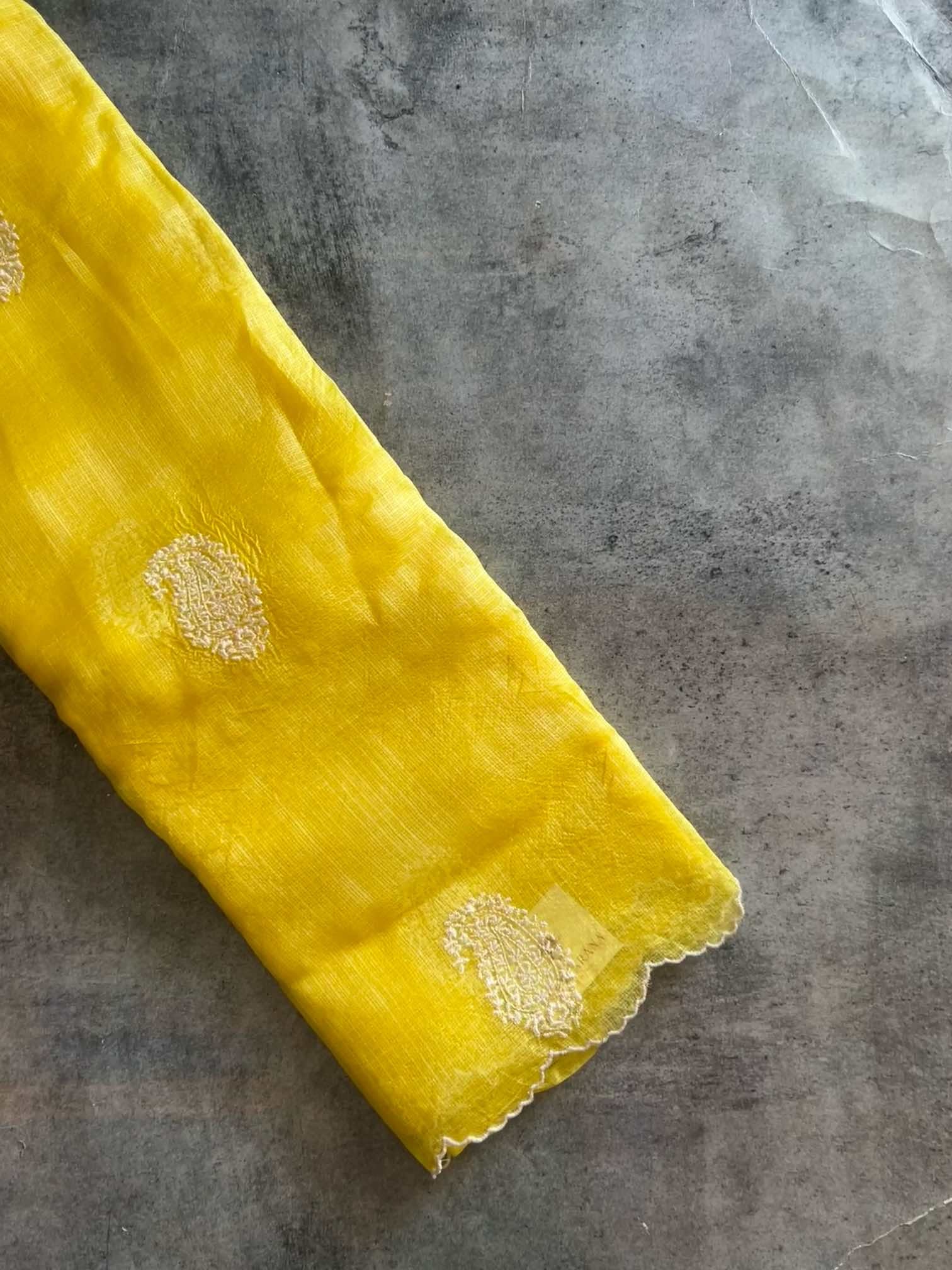 Tussar Kota with machine-embroidered mango buttas is a graceful fusion of tradition and modern craftsmanship. The natural sheen of tussar silk adds a rich, earthy elegance, while the lightweight Kota weave lends it an airy, delicate texture. The intricately embroidered mango buttas—symbolic of prosperity and heritage—bring a touch of timeless charm. This blend of refined fabric and subtle detailing makes it a perfect choice for both understated elegance and festive allure.