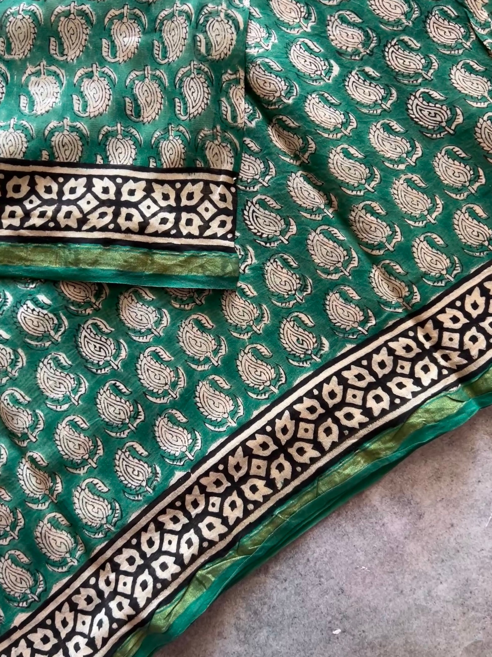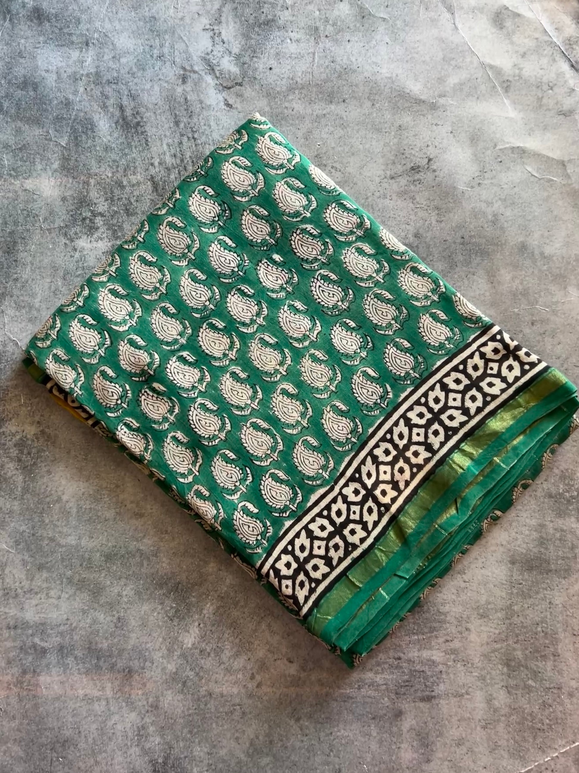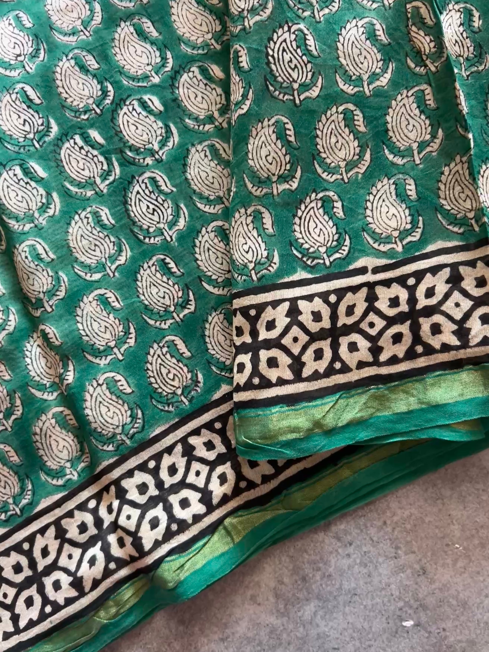 Elegant and classy hand block printed chandheri cotton silk saree. These exquisite pieces are very comfortable to wear and feel extremely soft and classy when draped.