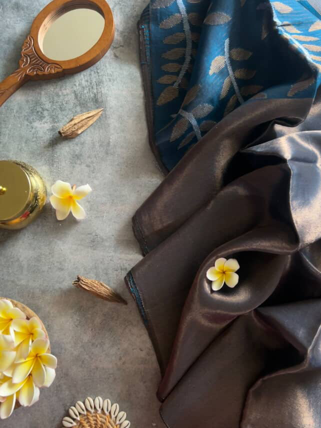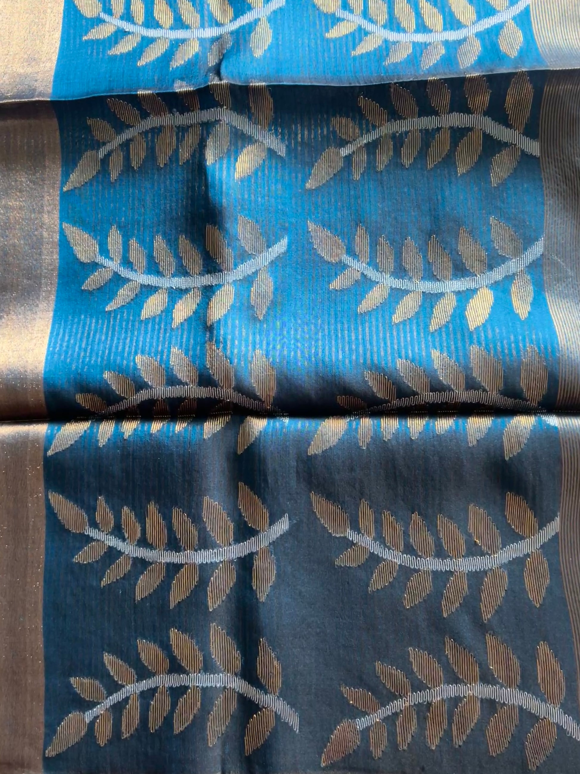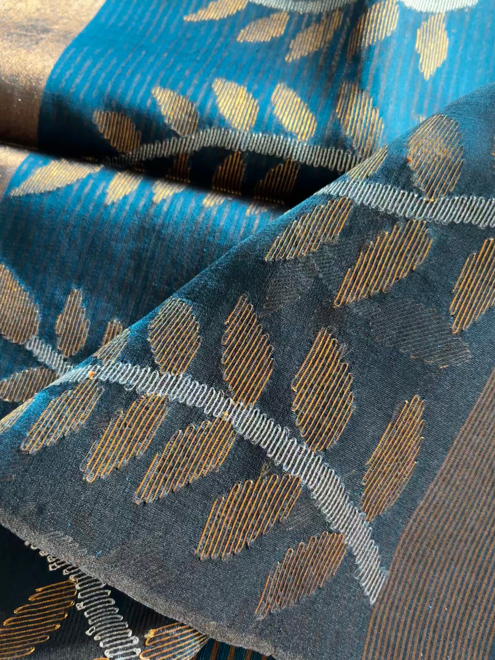 A pure tissue saree with a muslin pallu adorned with intricate Jamdani weave is a timeless expression of elegance and craftsmanship. The shimmering texture of tissue fabric lends a regal glow, while the airy softness of muslin adds grace and fluidity. The Jamdani weave, known for its delicate motifs and labor-intensive artistry, adds a heritage touch, turning the saree into a poetic blend of tradition and luxury — perfect for those who appreciate understated opulence and artisanal beauty.