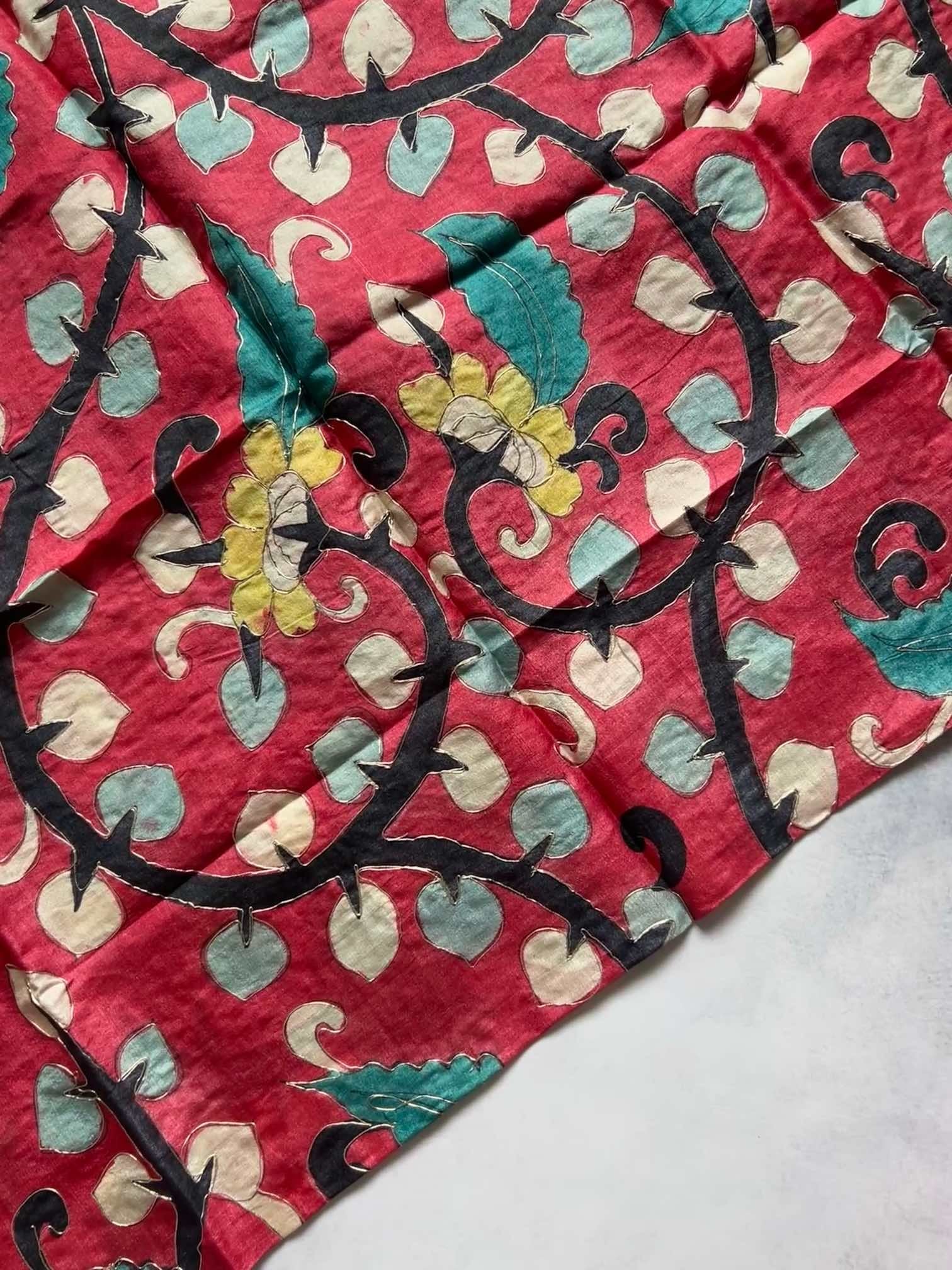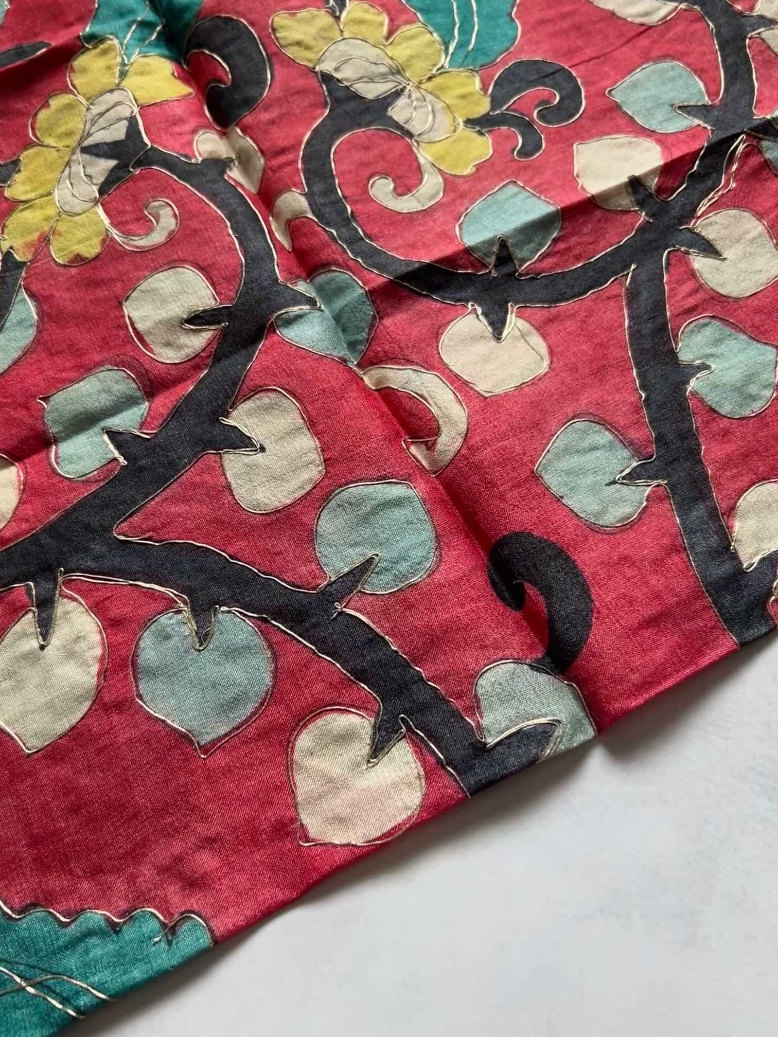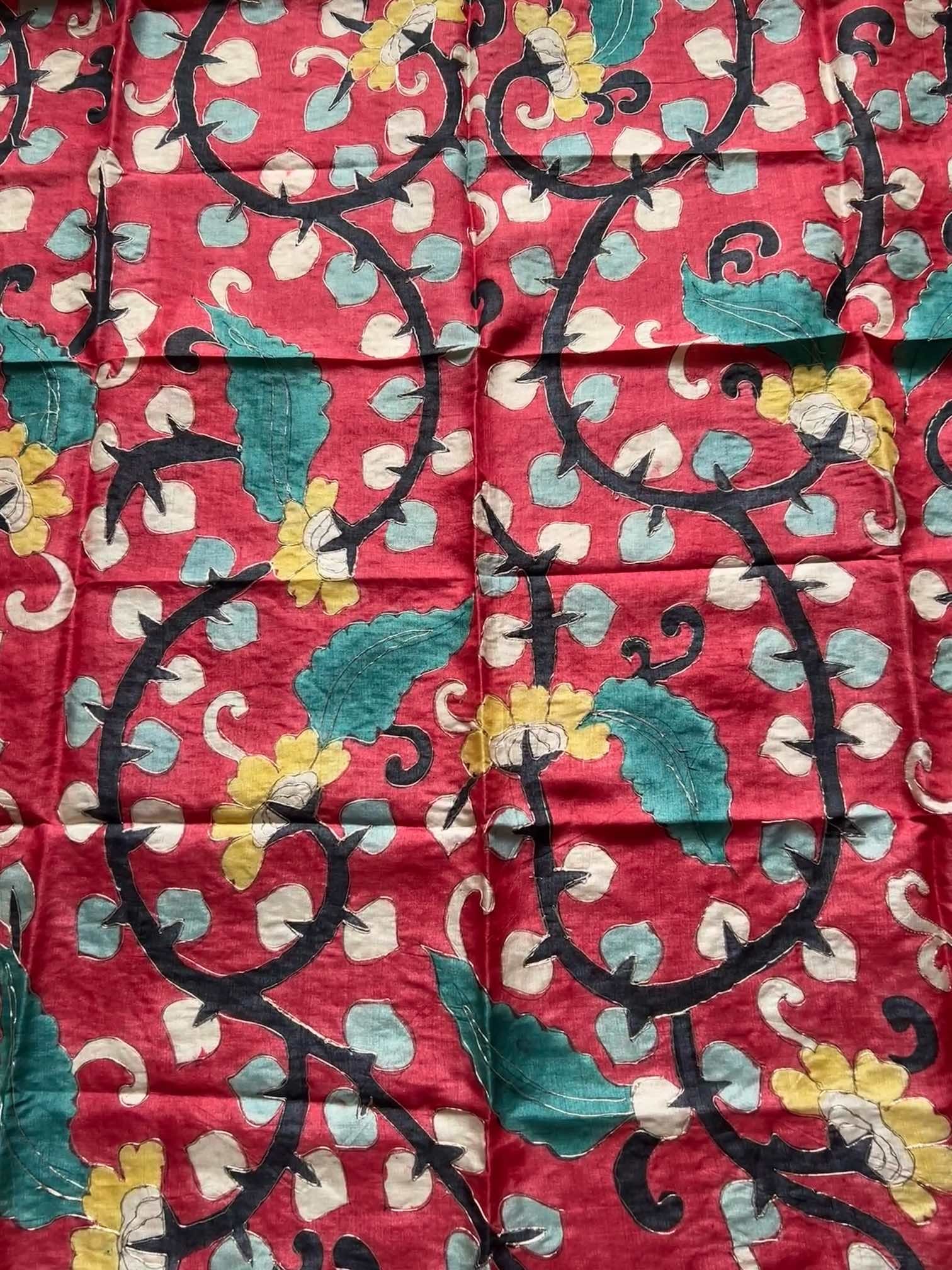 Pure tussar silk blouse fabric, adorned with hand-painted Kalamkari and delicate pita work, is a true celebration of artistry. The natural texture and subtle sheen of tussar form a perfect canvas for Kalamkari’s intricate storytelling motifs, each stroke adding soul and character. The shimmering metallic finesse of pita work further elevates it, creating a graceful blend of tradition and luxury.