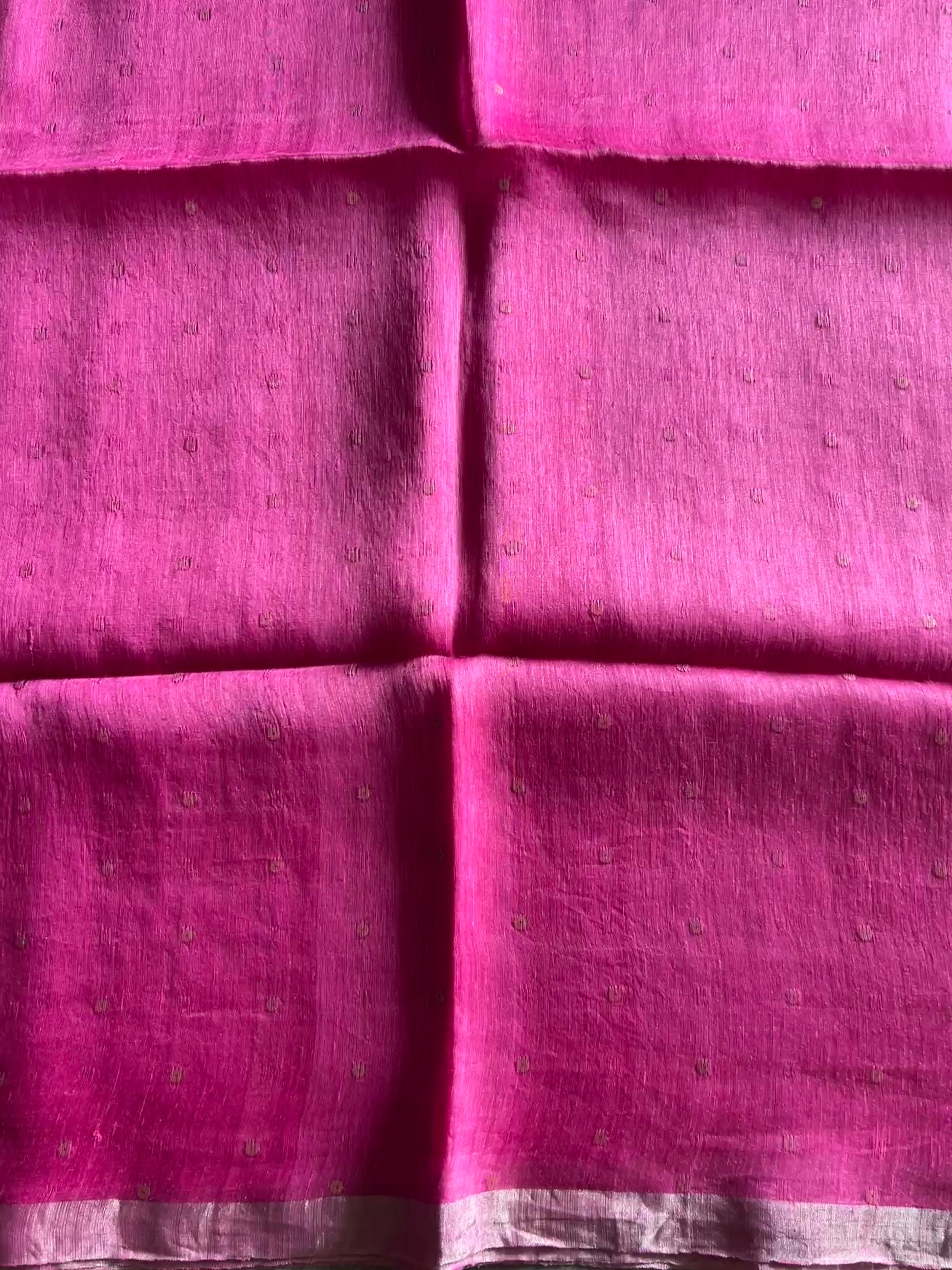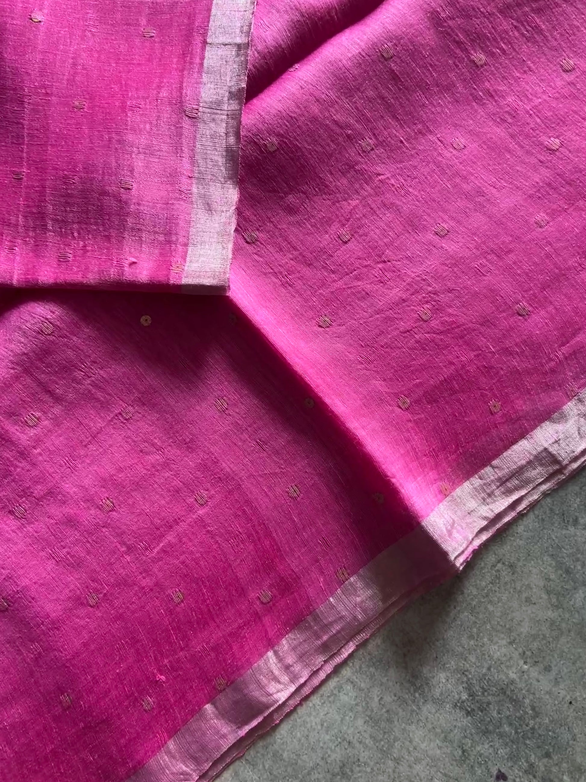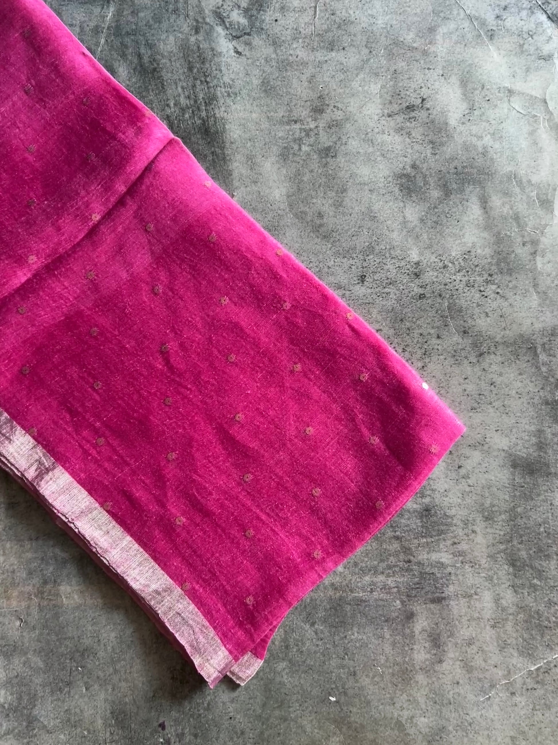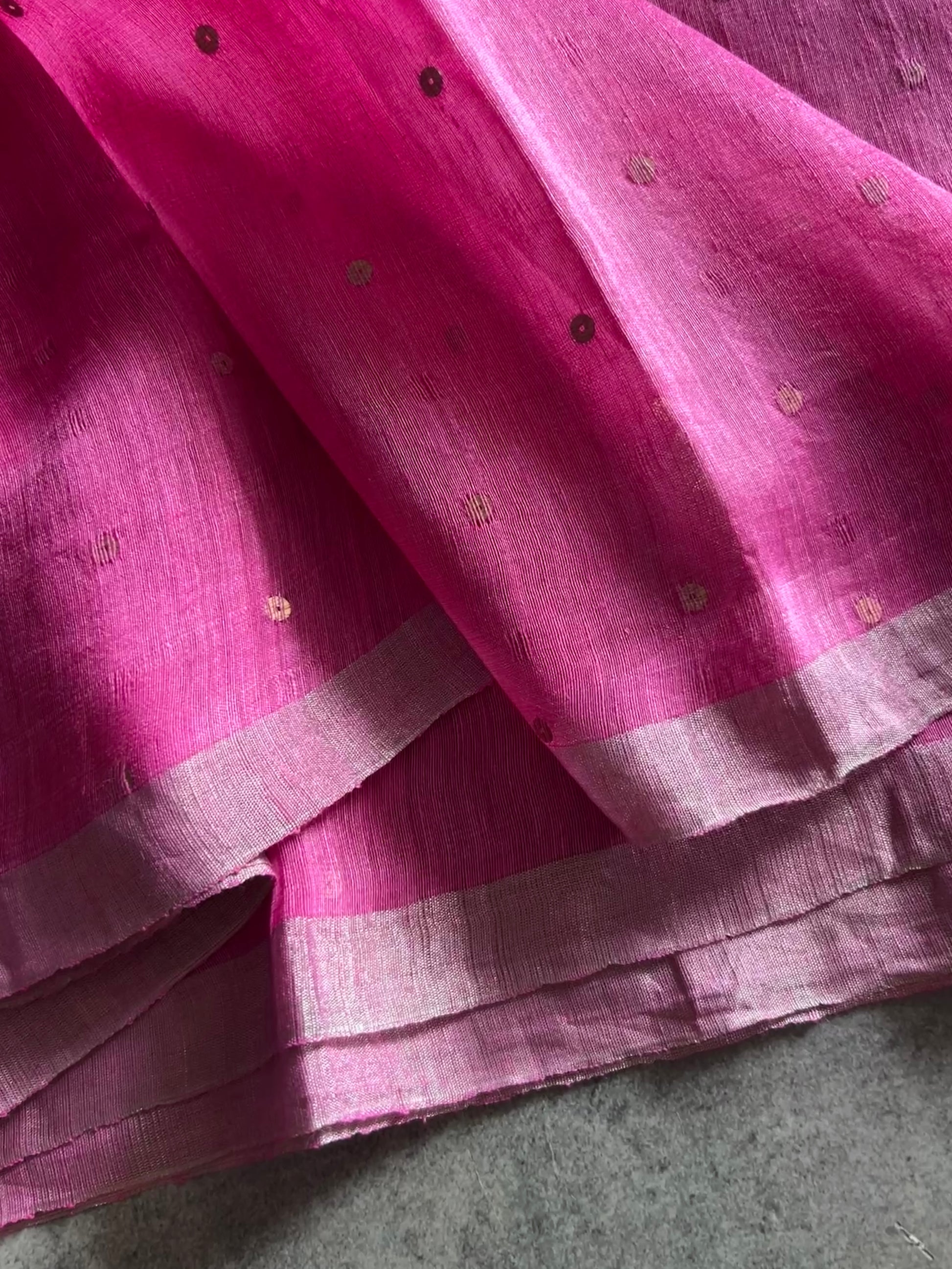 The linen silk fabric brings a perfect balance of softness and sheen, offering a lightweight yet luxurious feel. The Jamdhani work on the muslin pallu adds intricate, traditional handwoven motifs, elevating the saree with timeless beauty and cultural heritage. The gini work scattered across the saree adds a touch of opulence, with delicate metallic embroidery that catches the light. Together, these elements create a saree that exudes elegance, sophistication, and intricate craftsmanship, making it a stunning choice for special occasions.