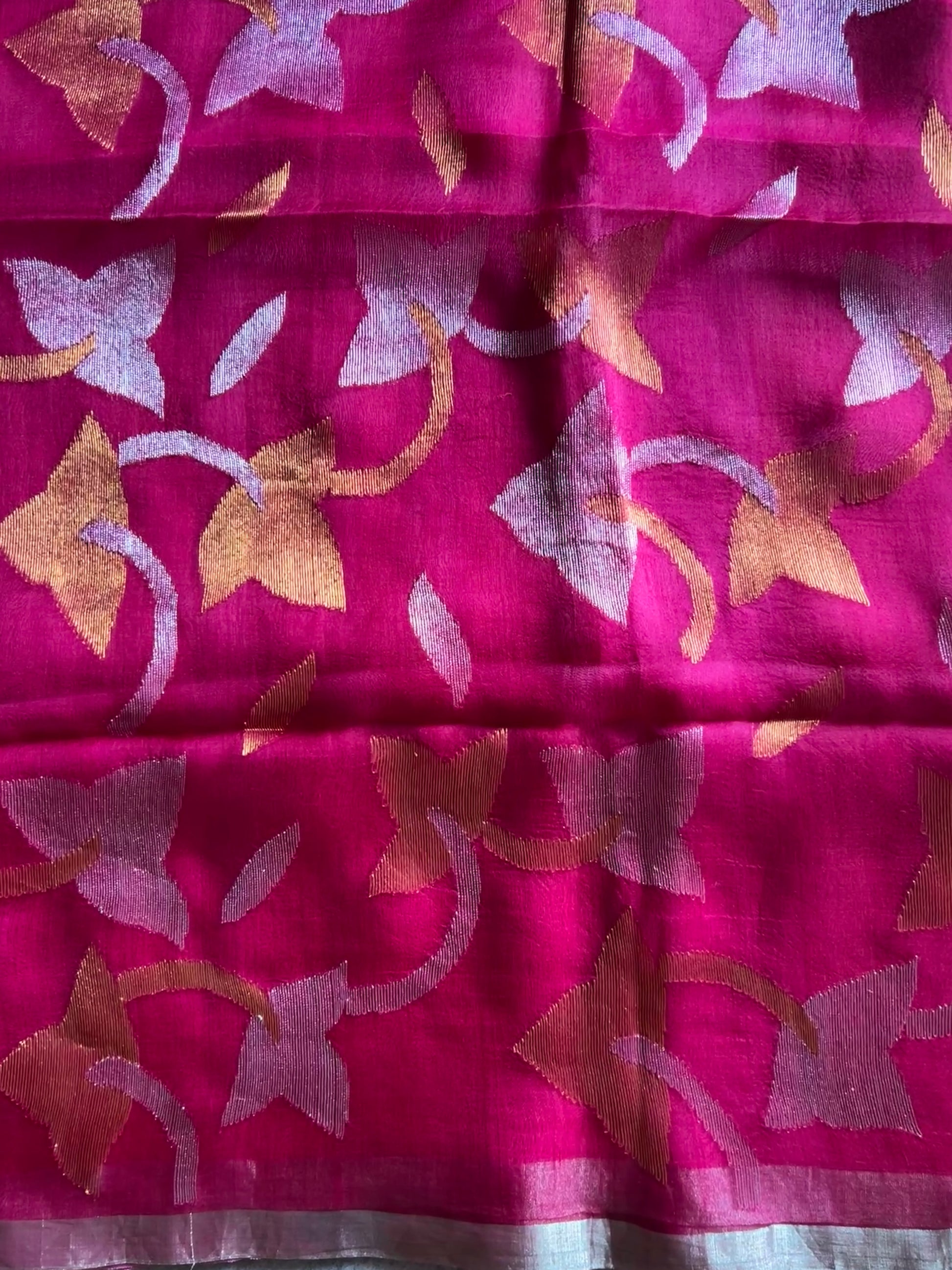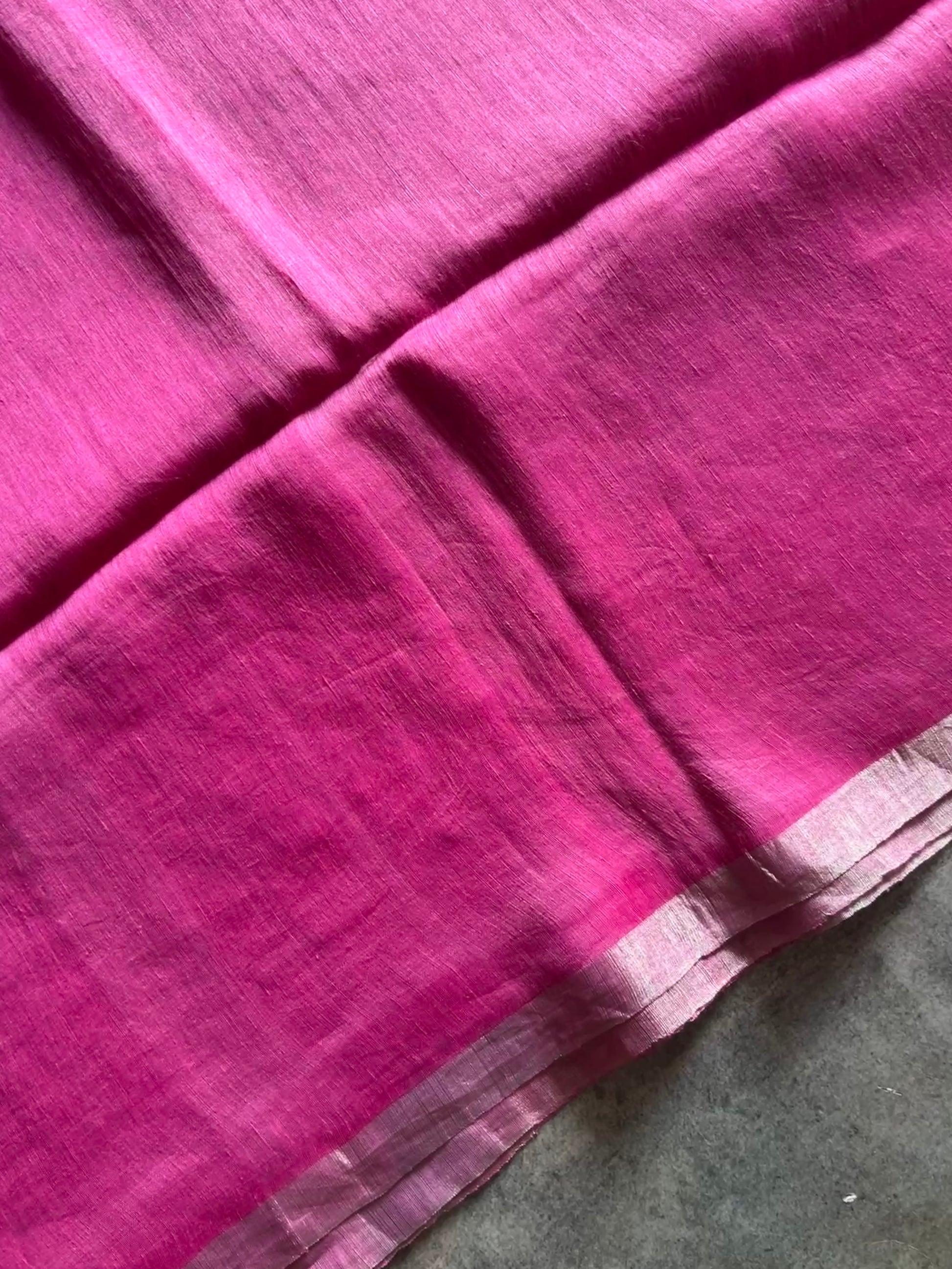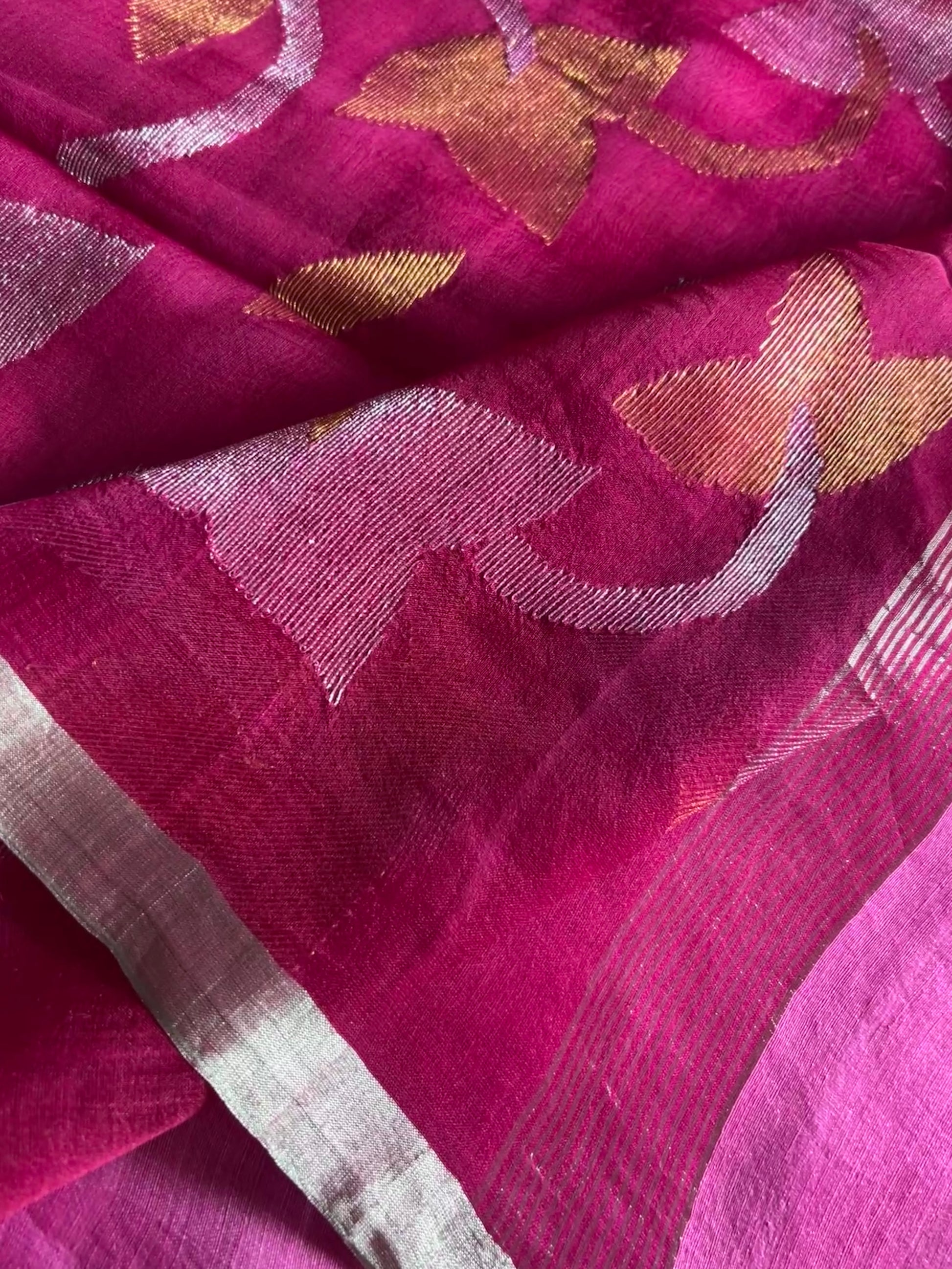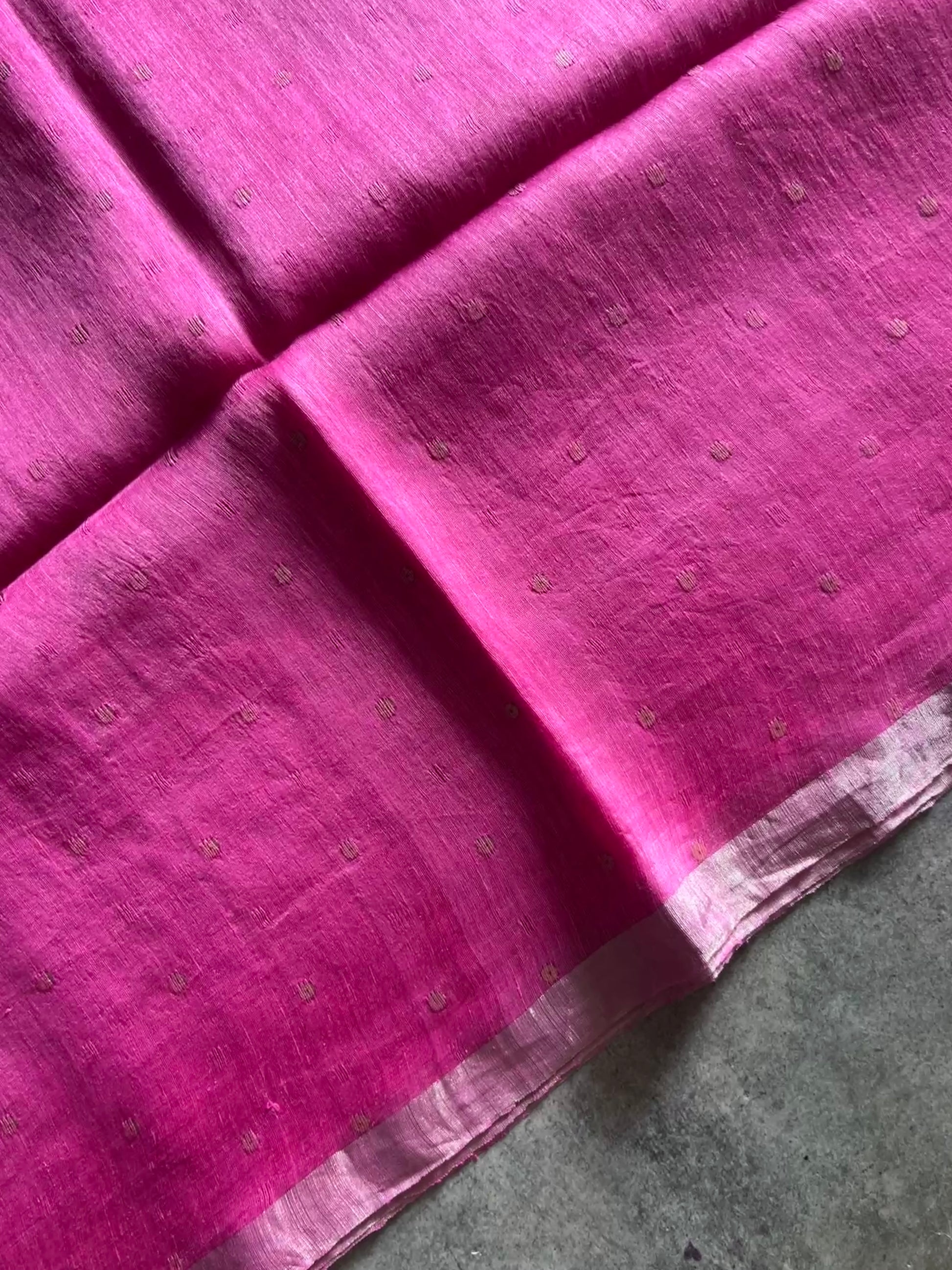 The linen silk fabric brings a perfect balance of softness and sheen, offering a lightweight yet luxurious feel. The Jamdhani work on the muslin pallu adds intricate, traditional handwoven motifs, elevating the saree with timeless beauty and cultural heritage. The gini work scattered across the saree adds a touch of opulence, with delicate metallic embroidery that catches the light. Together, these elements create a saree that exudes elegance, sophistication, and intricate craftsmanship, making it a stunning choice for special occasions.
