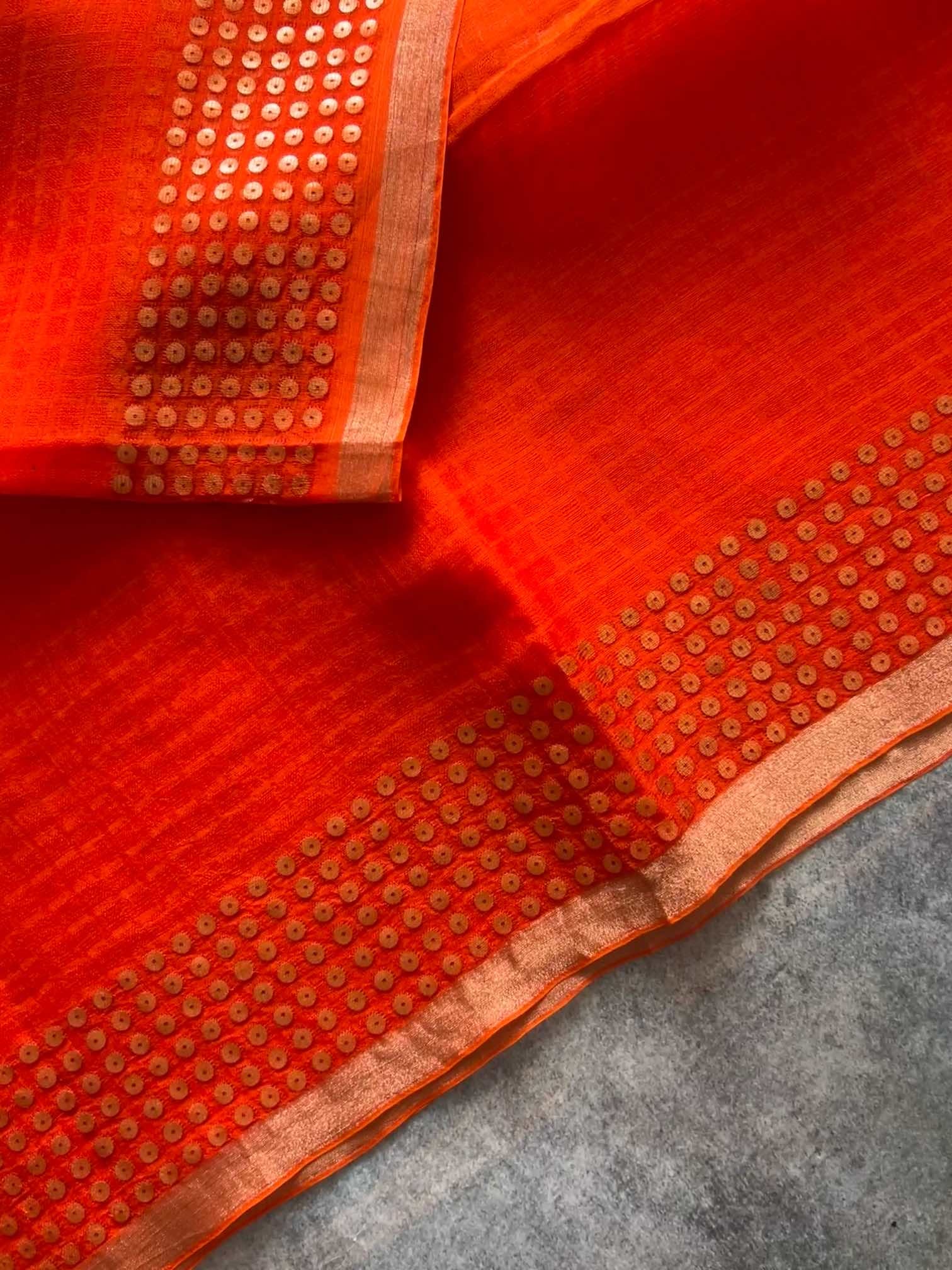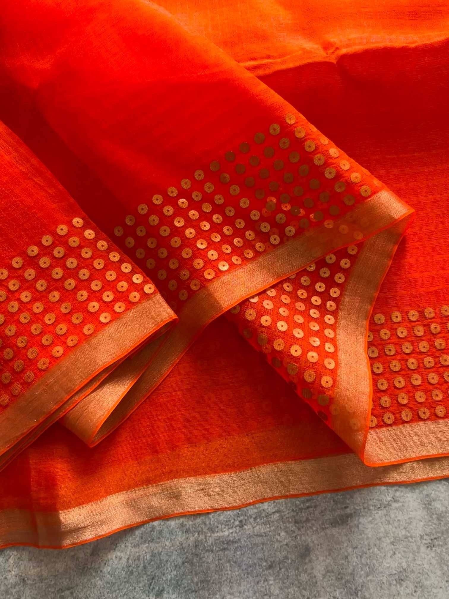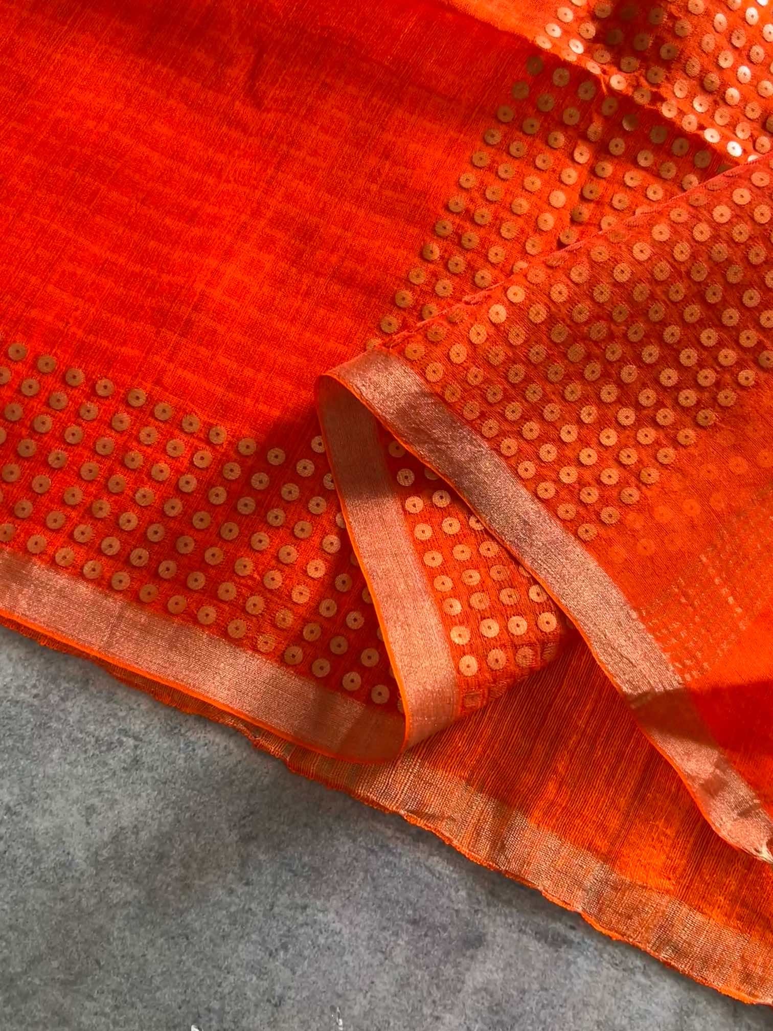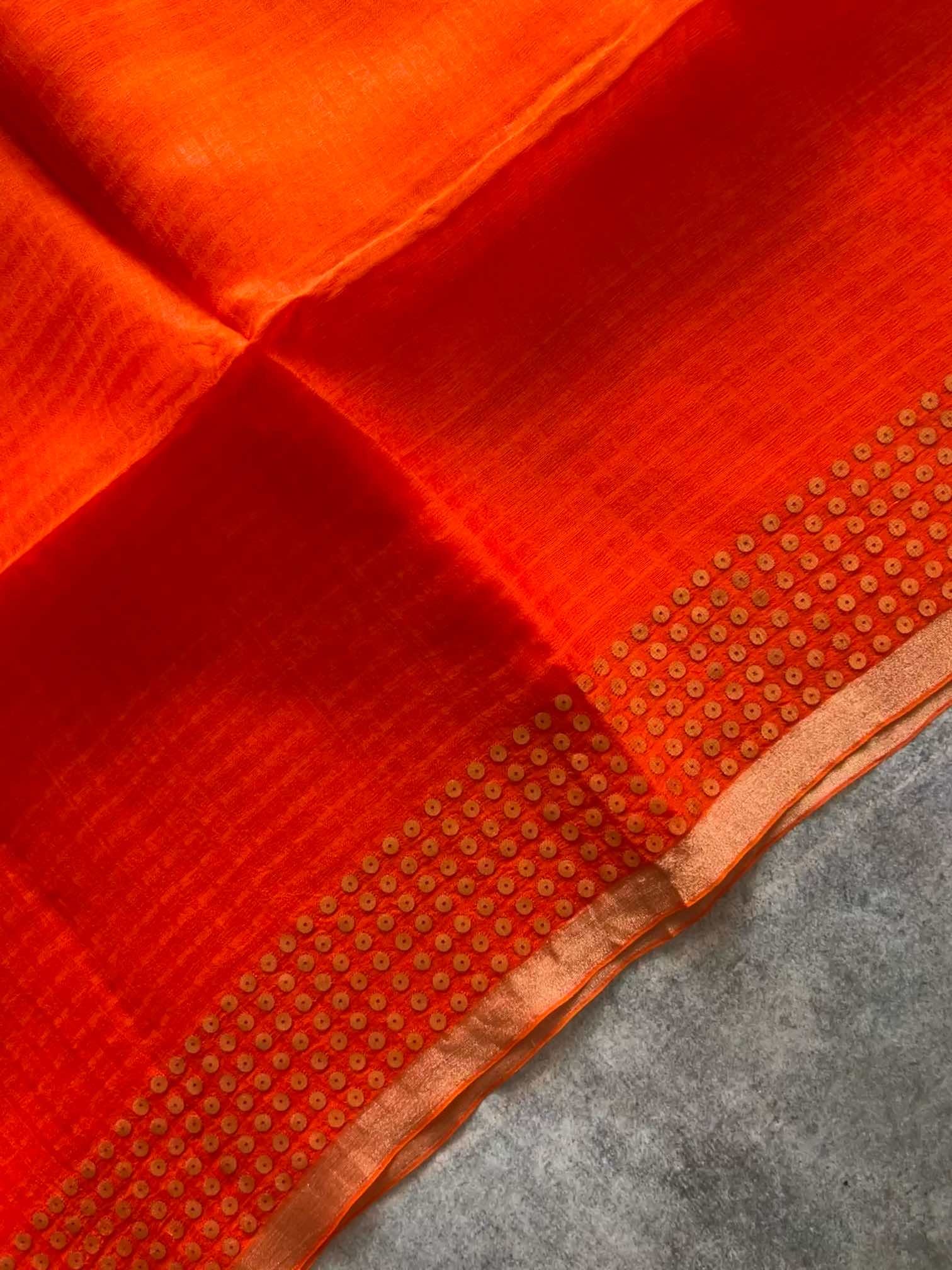 The muslin silk saree is a timeless expression of elegance, and when adorned with Gini work on the border and pallu, it exudes a subtle yet luxurious charm. The delicate shimmer of Gini highlights adds a touch of opulence, perfectly complementing the soft, airy texture of muslin silk. The Jamdhani creeper weave on the pallu adds depth and heritage, weaving in stories through its intricate patterns.
