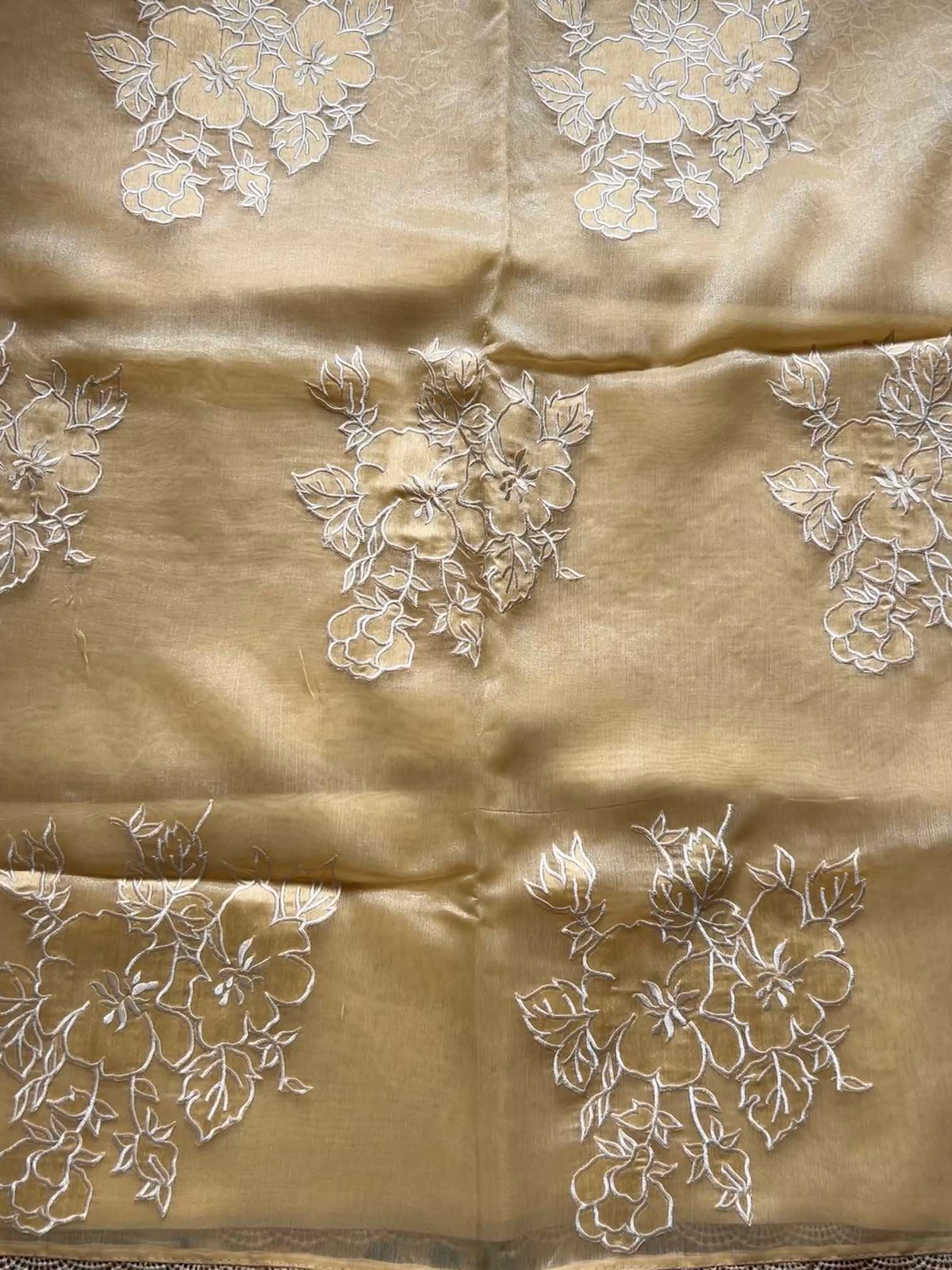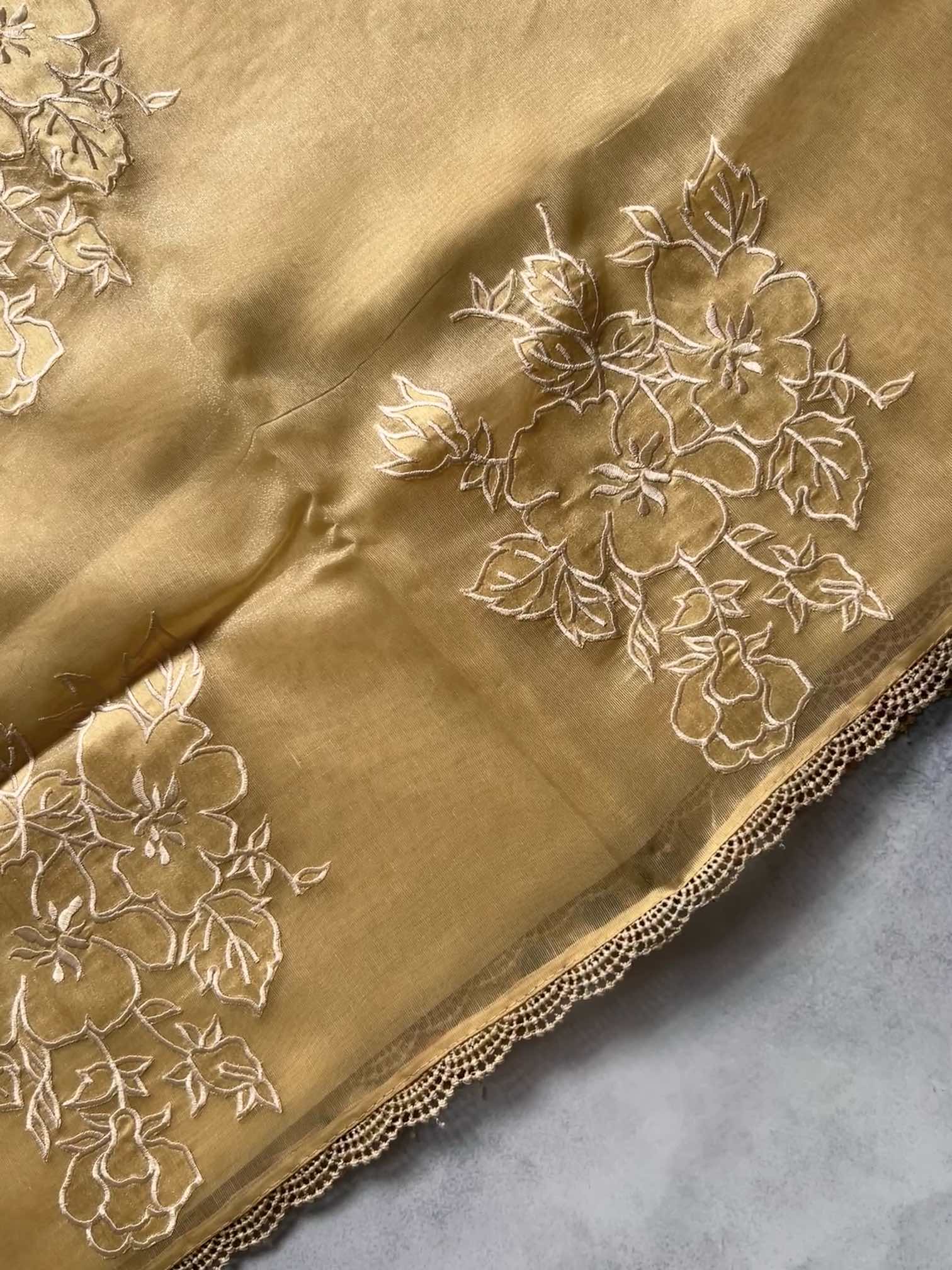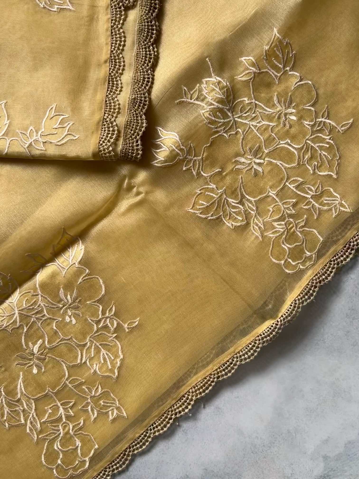 Chanderi tissue sarees glow with a sheer, luminous elegance, where tradition meets quiet luxury. The delicate fabric shimmers softly, and the appliqué floral work blooms like poetry on silk—adding texture, grace, and timeless charm.