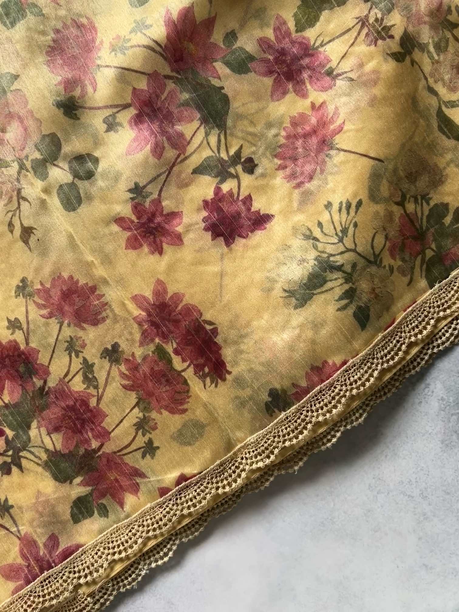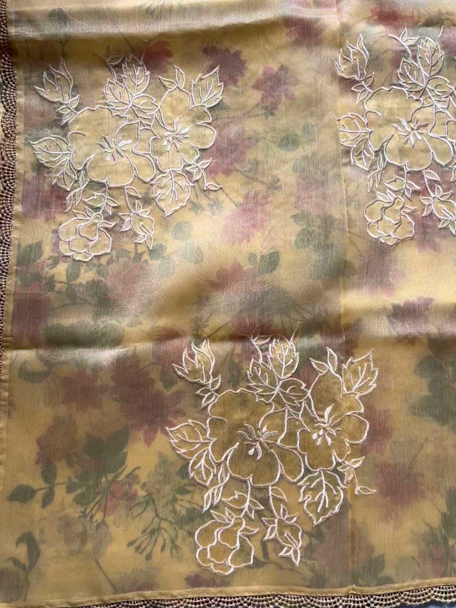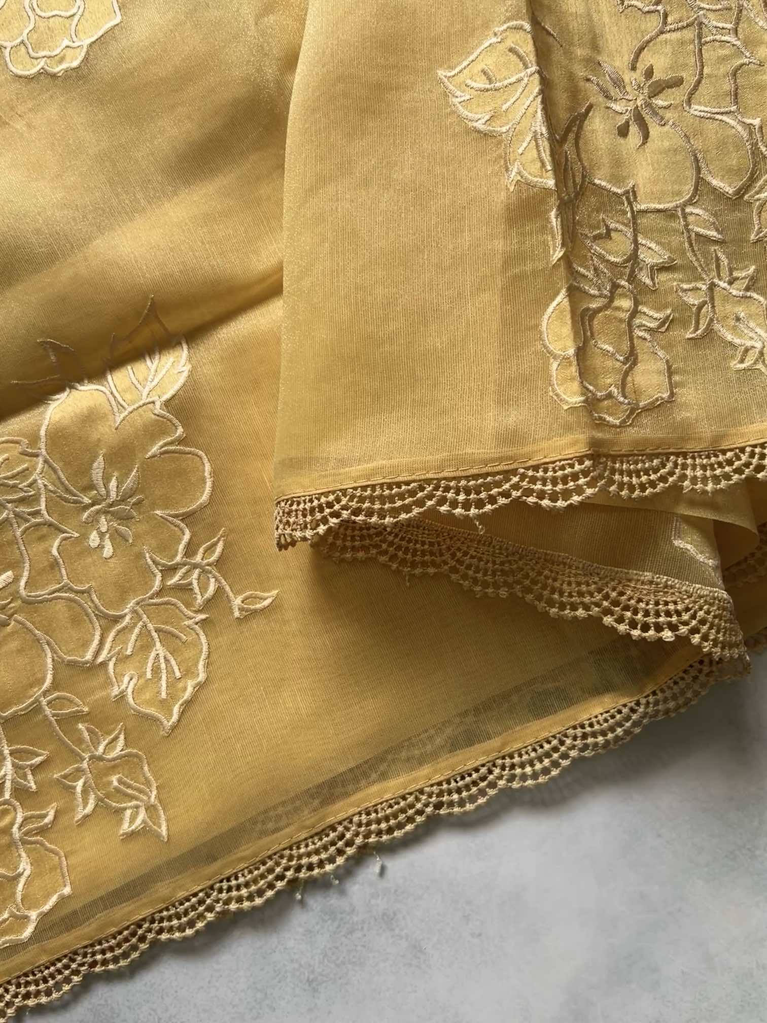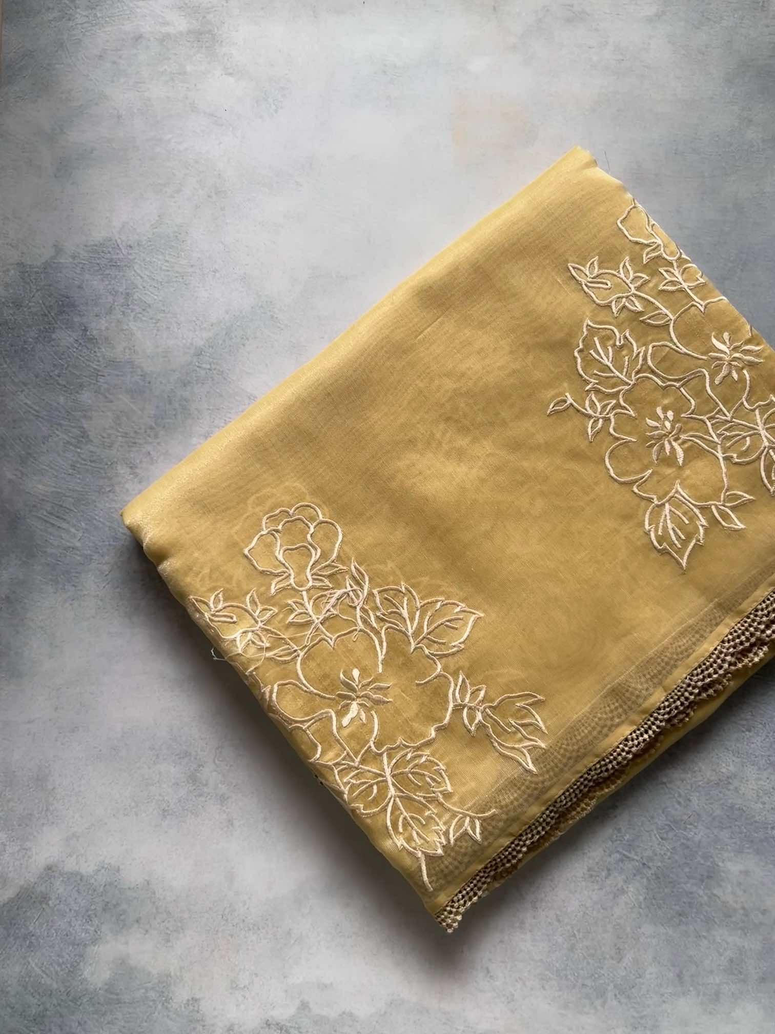 Chanderi tissue sarees glow with a sheer, luminous elegance, where tradition meets quiet luxury. The delicate fabric shimmers softly, and the appliqué floral work blooms like poetry on silk—adding texture, grace, and timeless charm.