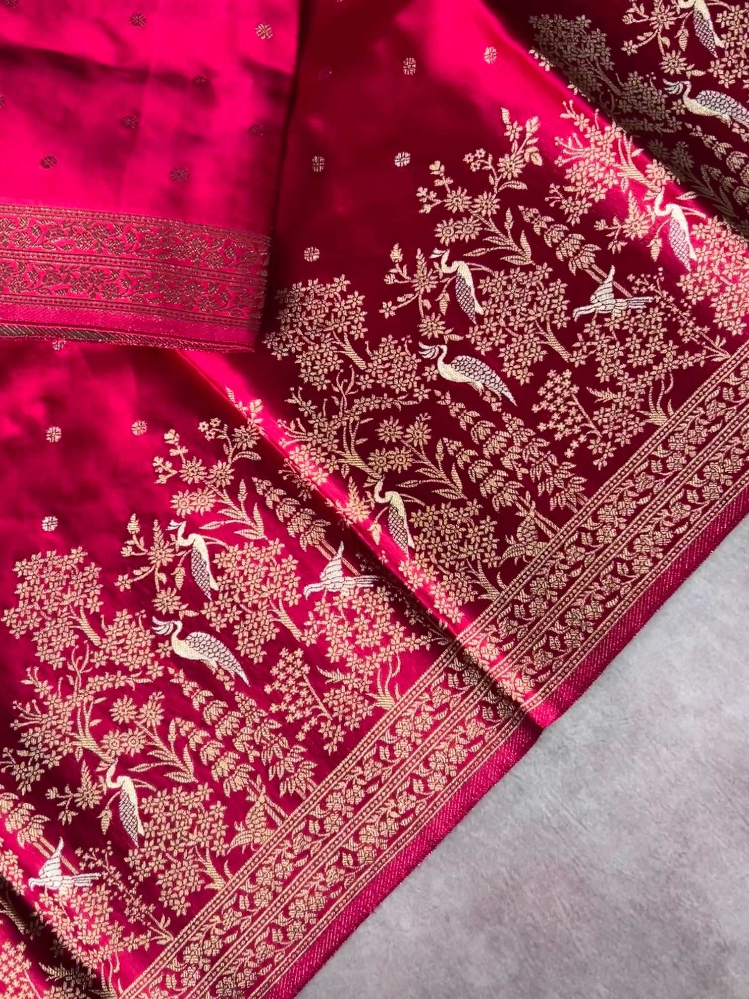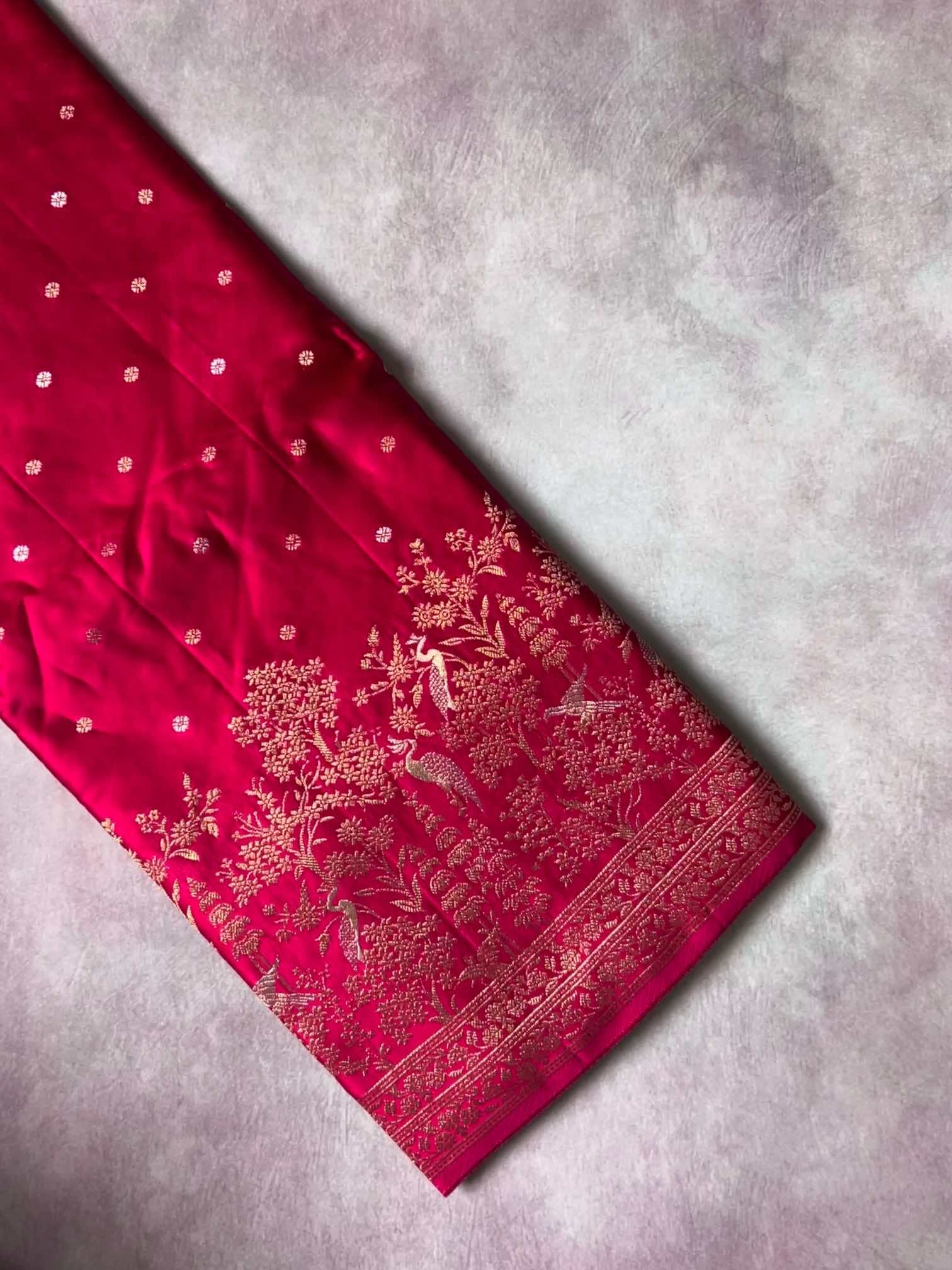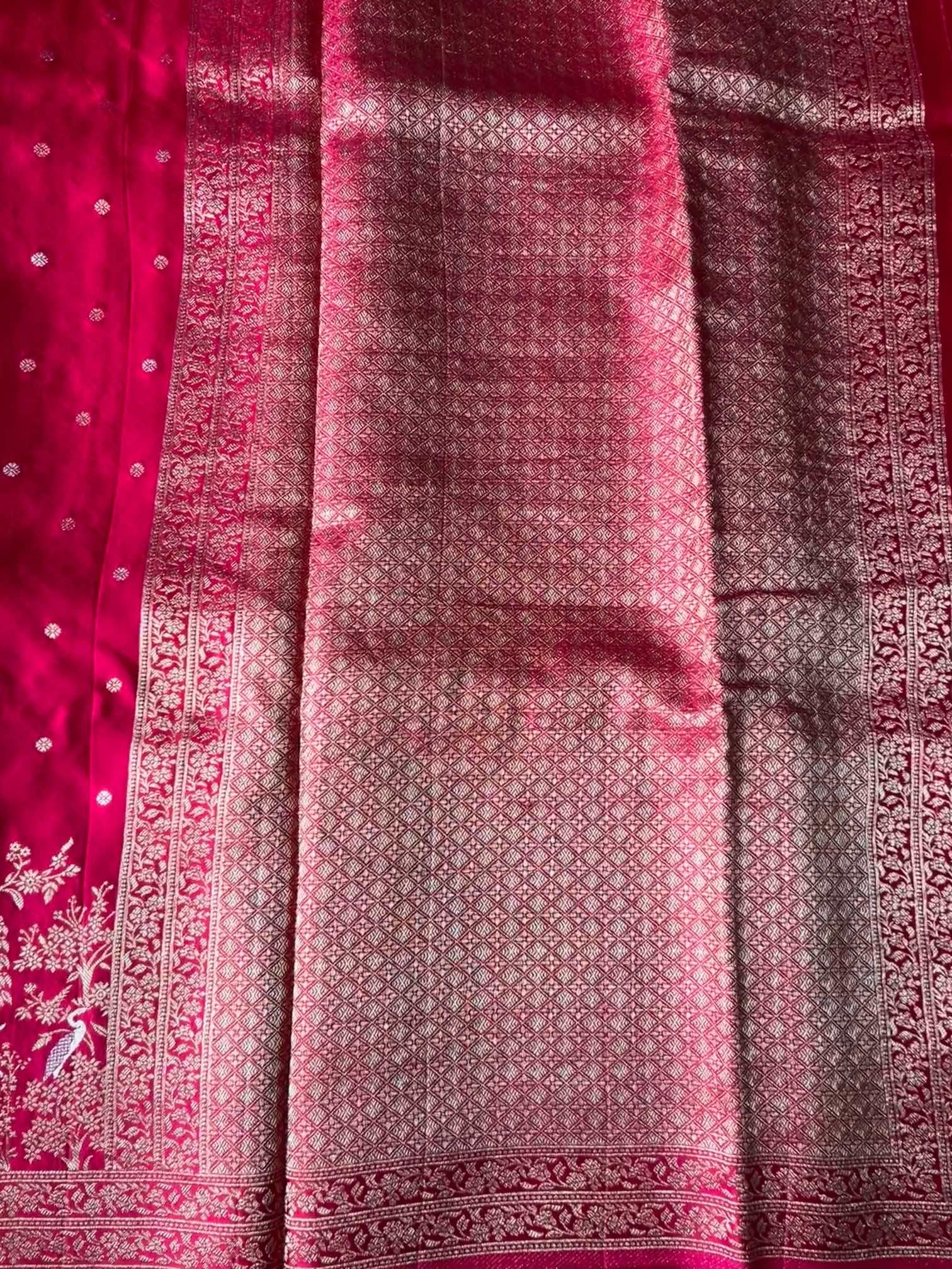 Mashru silk is a stunning blend of tradition and craftsmanship, known for its rich sheen and unique texture. Woven with silk on the outside and cotton on the inside, it offers both luxury and comfort. The fabric’s vibrant colors and intricate patterns reflect centuries of artisanal heritage, making it a favorite for elegant attire. Its smooth, glossy finish exudes sophistication, while its breathable nature ensures wearability.