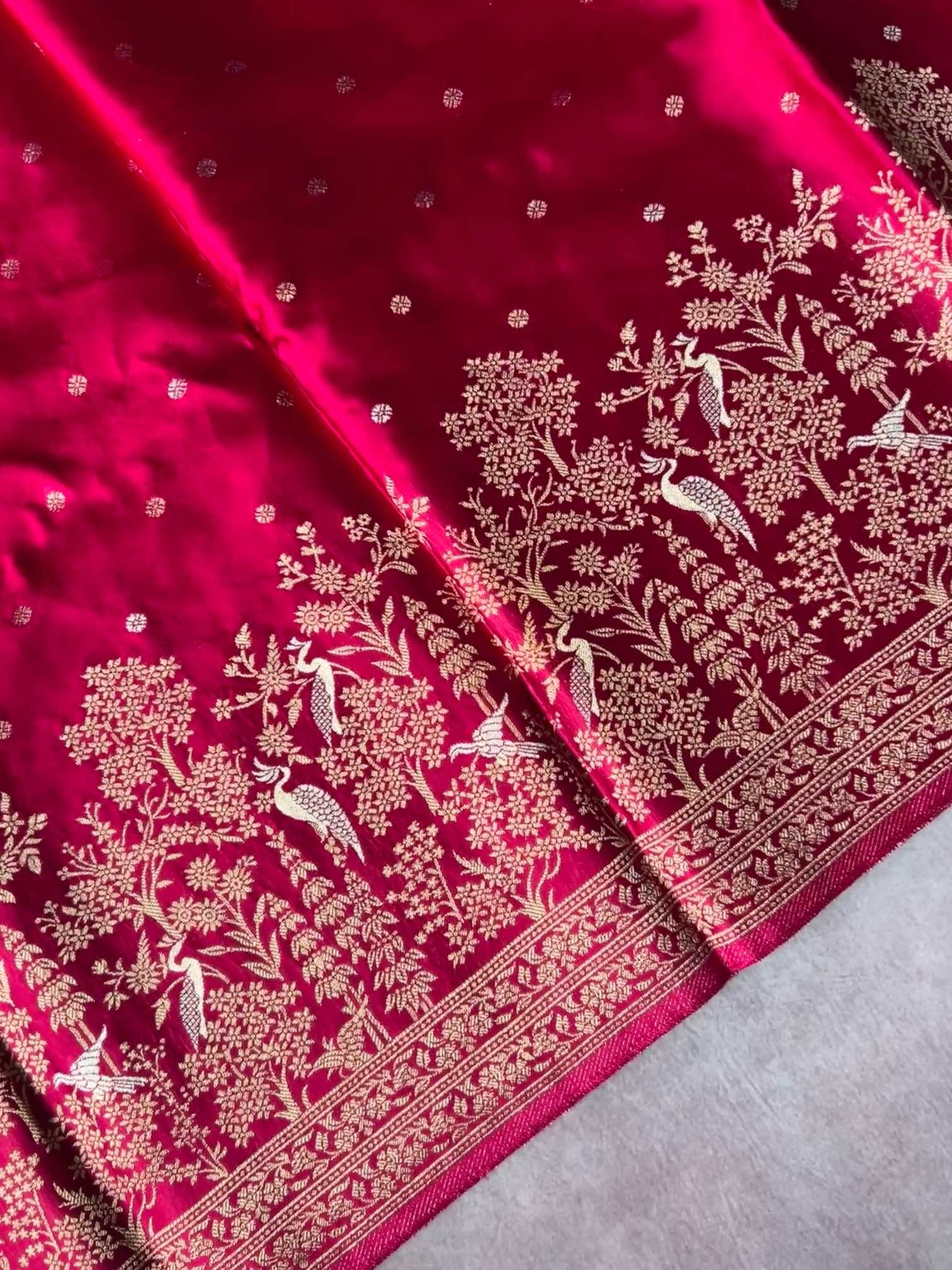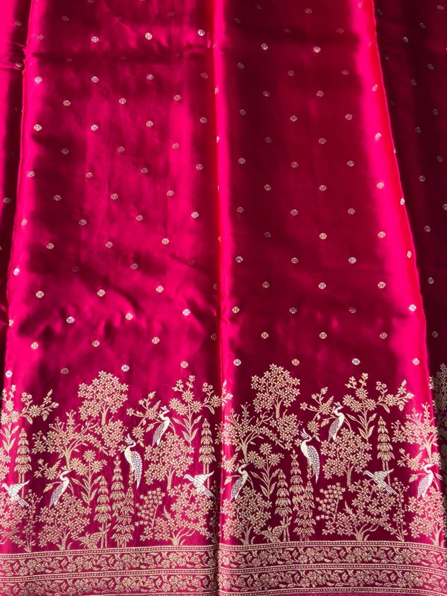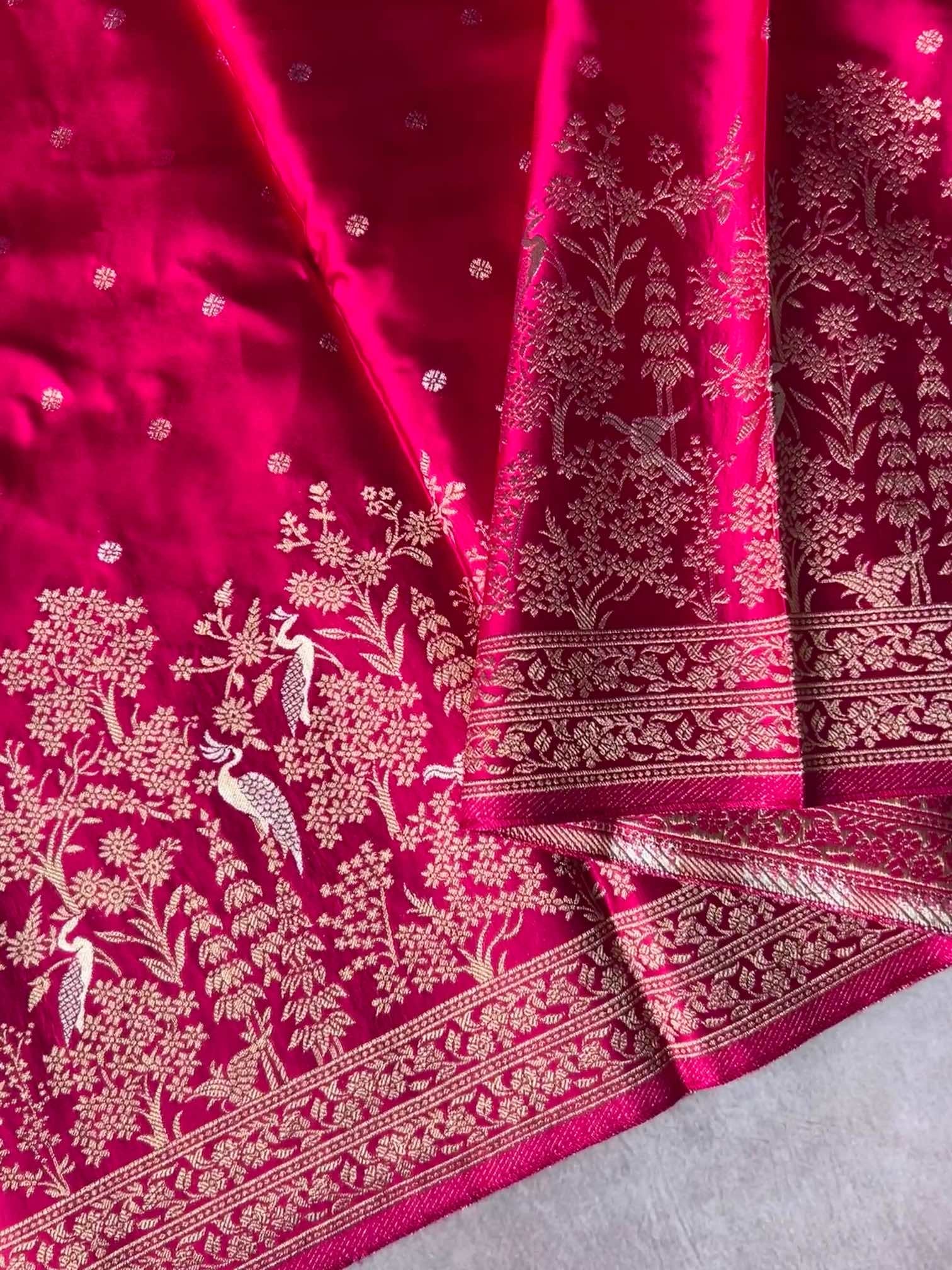 Mashru silk is a stunning blend of tradition and craftsmanship, known for its rich sheen and unique texture. Woven with silk on the outside and cotton on the inside, it offers both luxury and comfort. The fabric’s vibrant colors and intricate patterns reflect centuries of artisanal heritage, making it a favorite for elegant attire. Its smooth, glossy finish exudes sophistication, while its breathable nature ensures wearability.