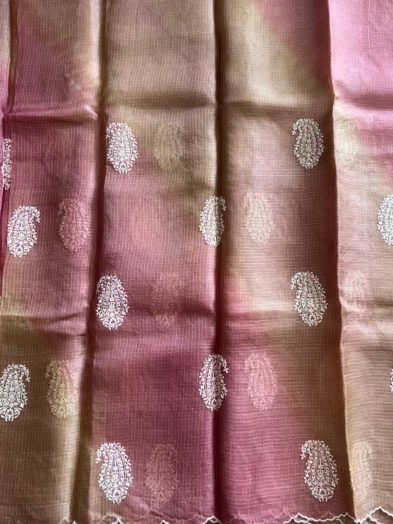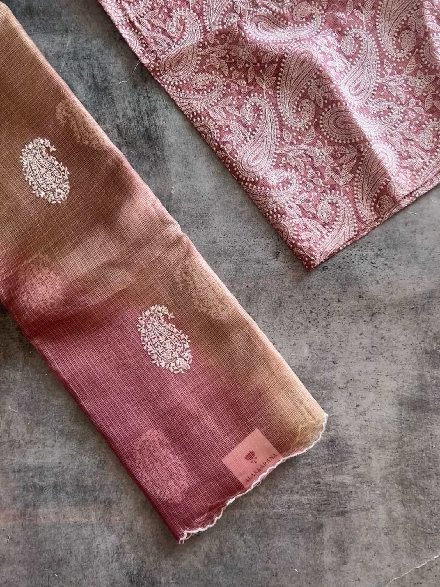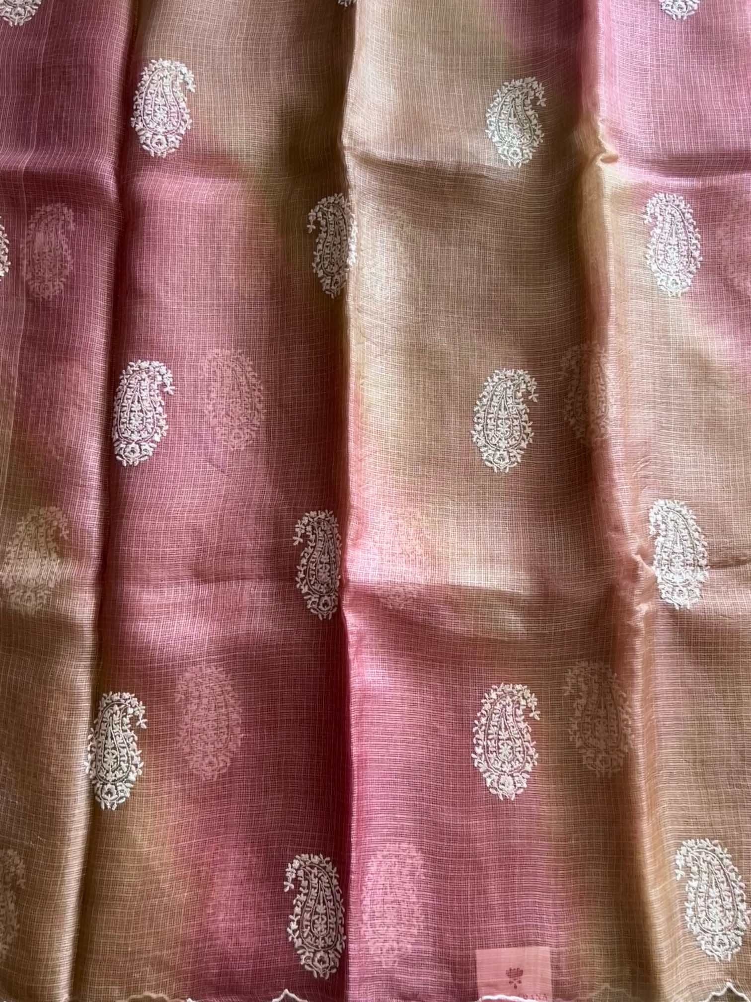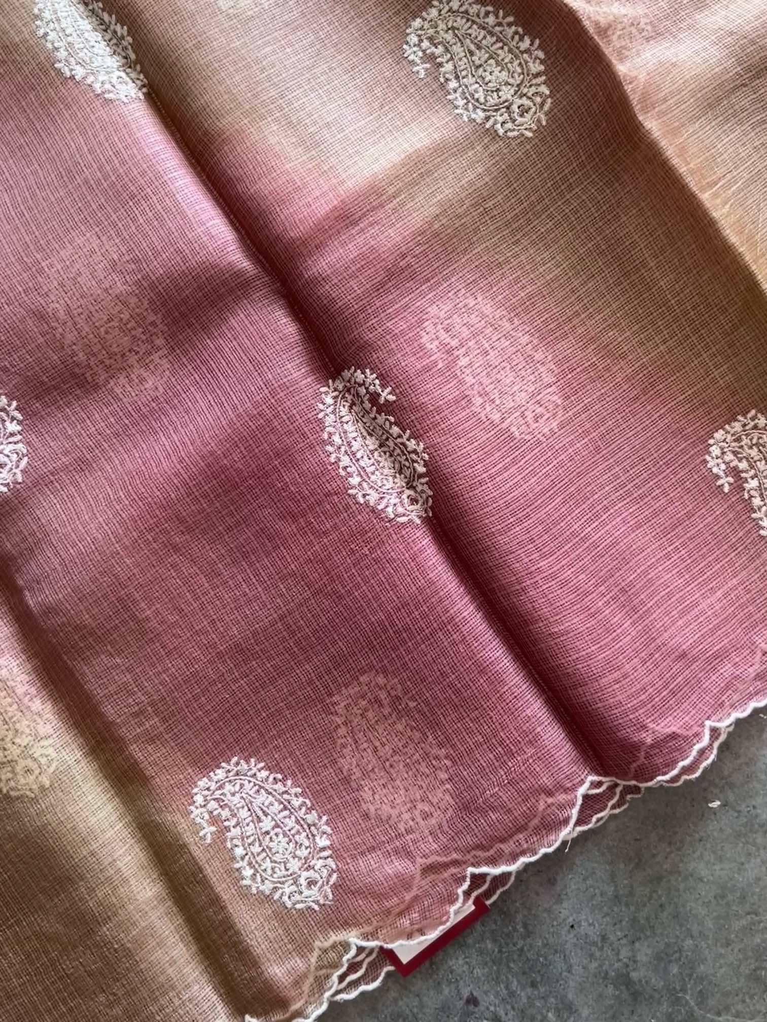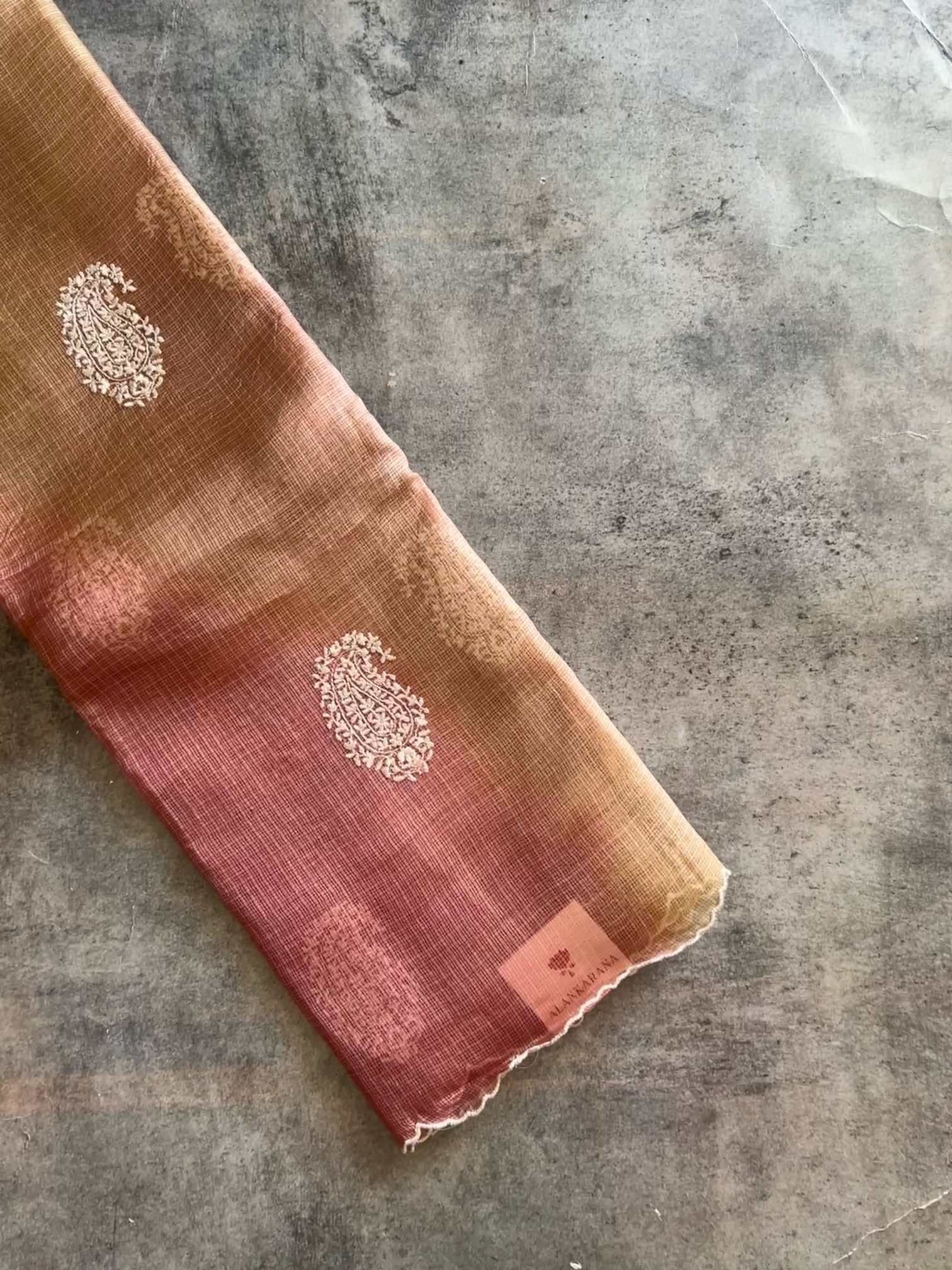 Tussar Kota with machine-embroidered mango buttas is a graceful fusion of tradition and modern craftsmanship. The natural sheen of tussar silk adds a rich, earthy elegance, while the lightweight Kota weave lends it an airy, delicate texture. The intricately embroidered mango buttas—symbolic of prosperity and heritage—bring a touch of timeless charm. This blend of refined fabric and subtle detailing makes it a perfect choice for both understated elegance and festive allure.