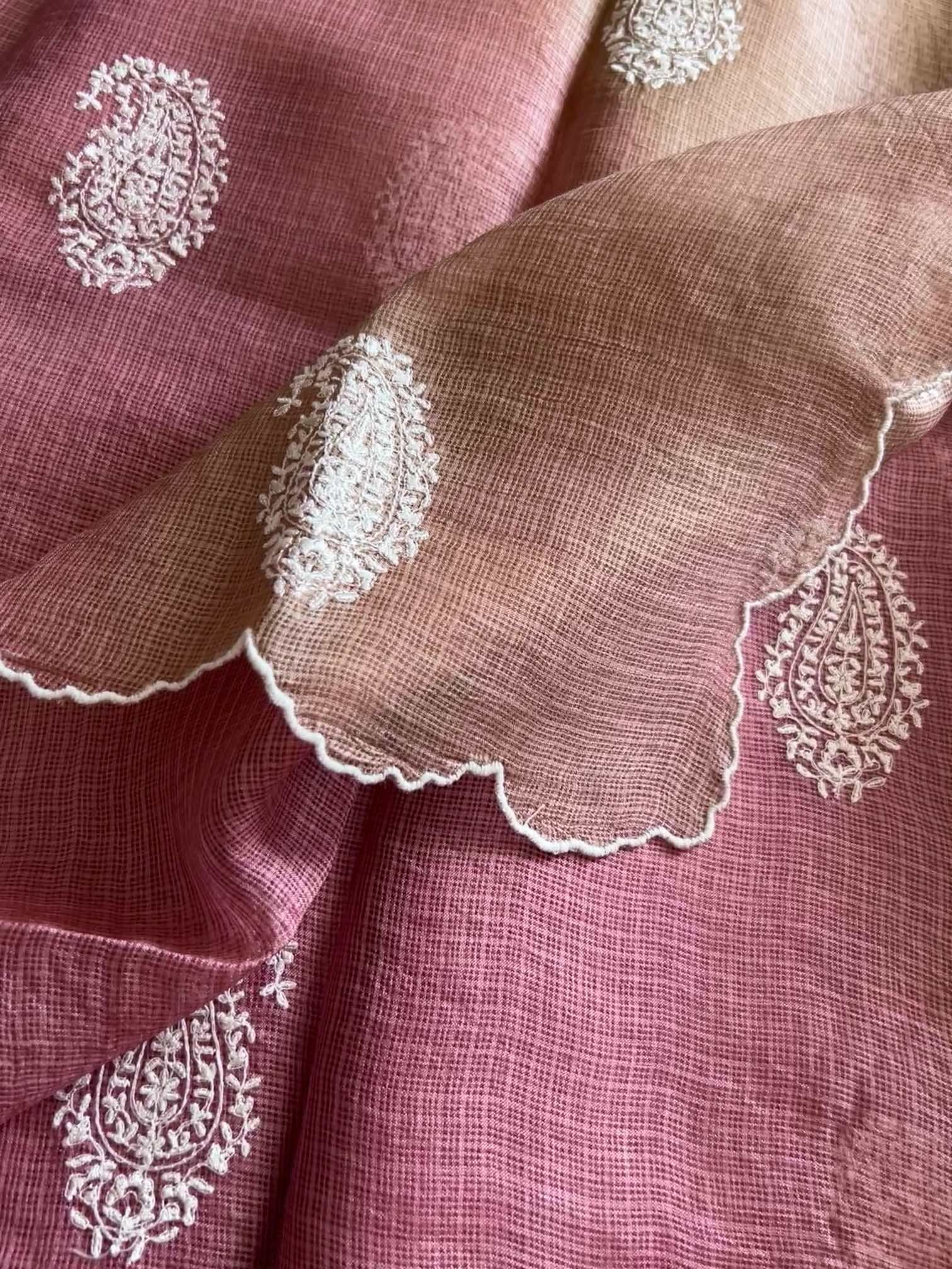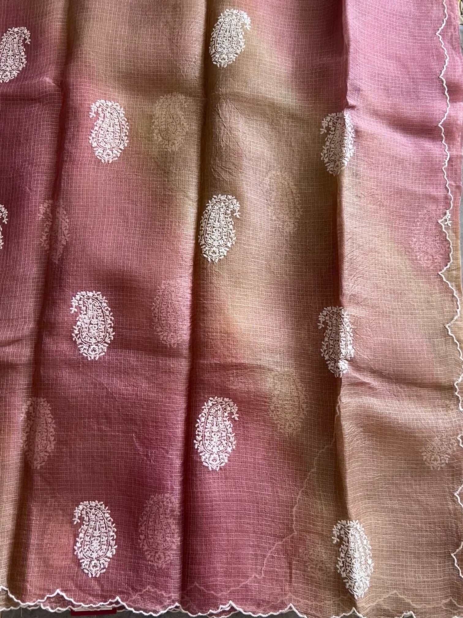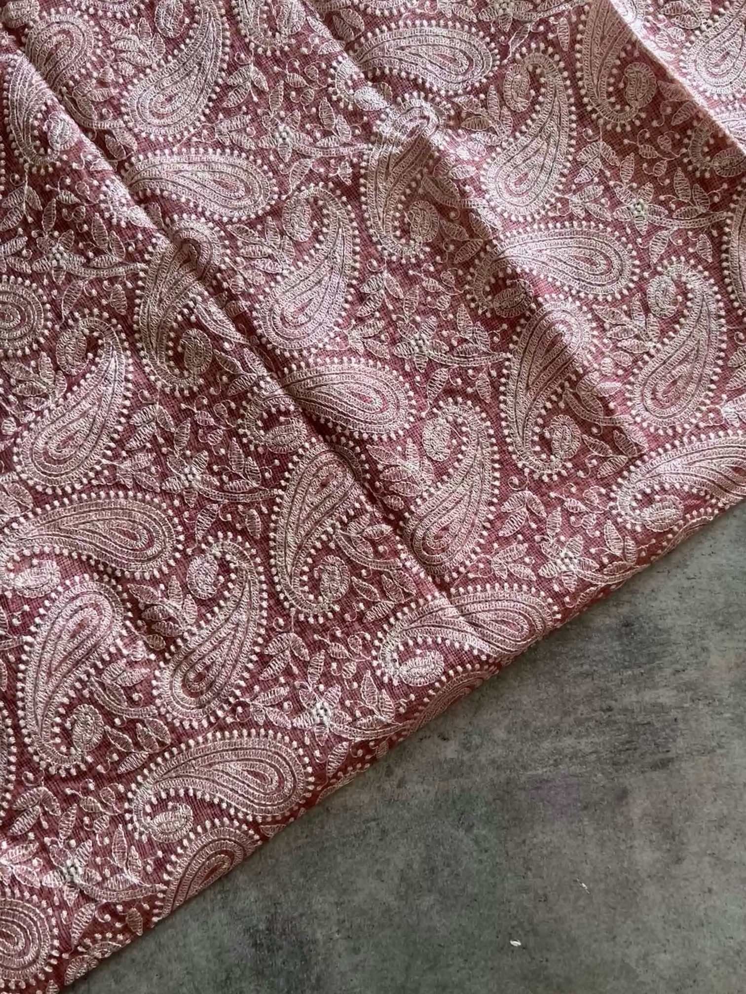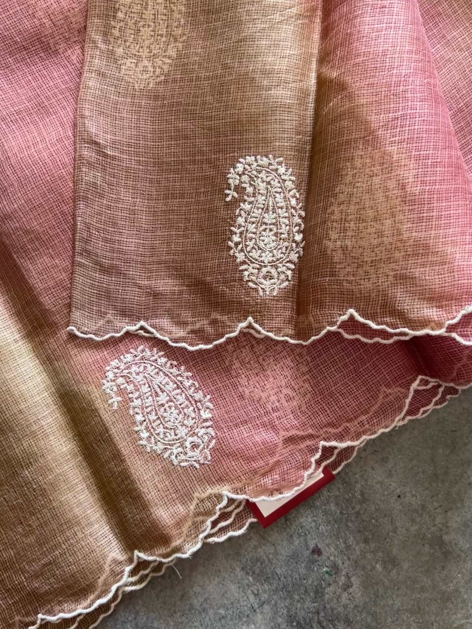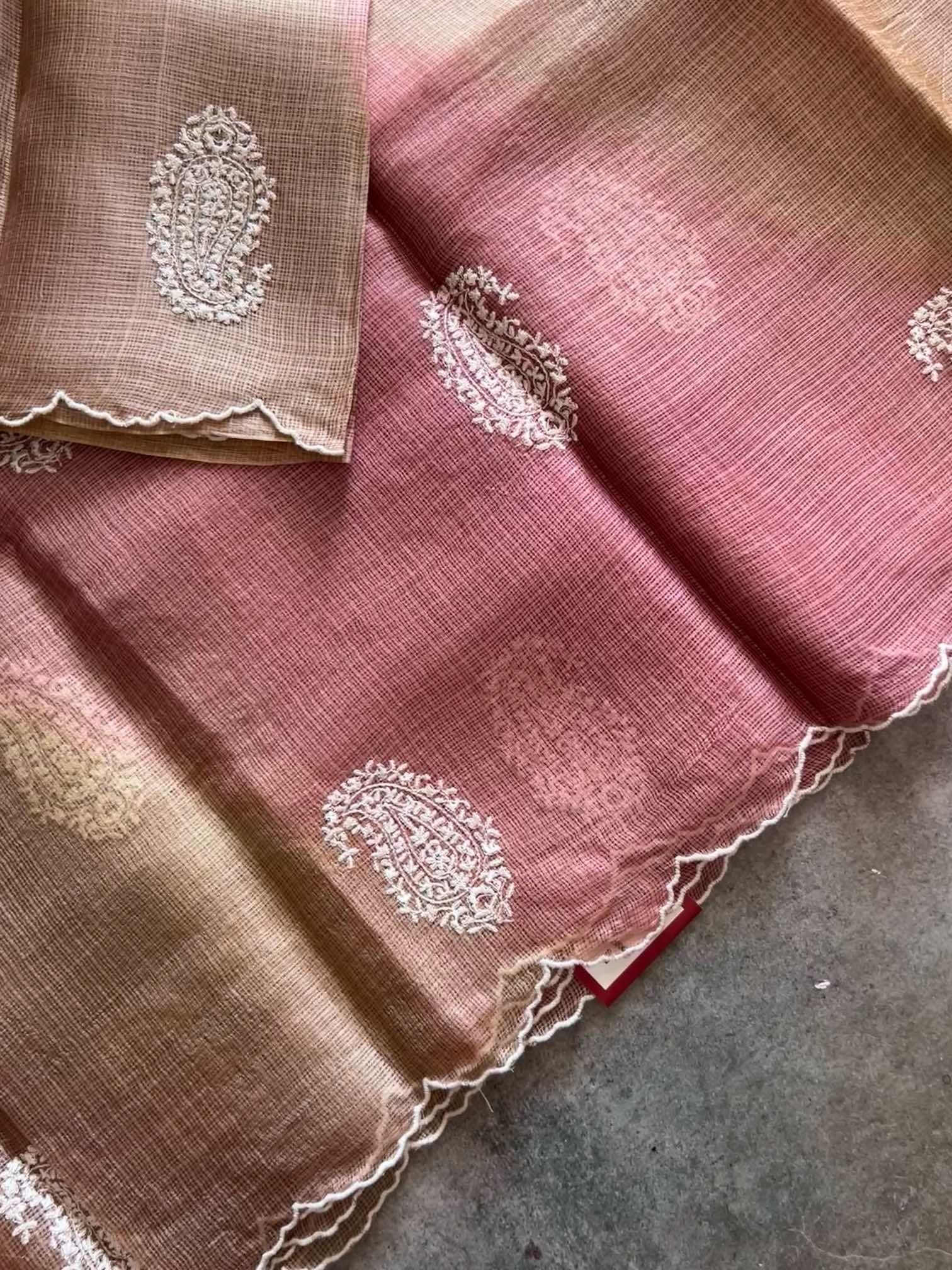 Tussar Kota with machine-embroidered mango buttas is a graceful fusion of tradition and modern craftsmanship. The natural sheen of tussar silk adds a rich, earthy elegance, while the lightweight Kota weave lends it an airy, delicate texture. The intricately embroidered mango buttas—symbolic of prosperity and heritage—bring a touch of timeless charm. This blend of refined fabric and subtle detailing makes it a perfect choice for both understated elegance and festive allure.