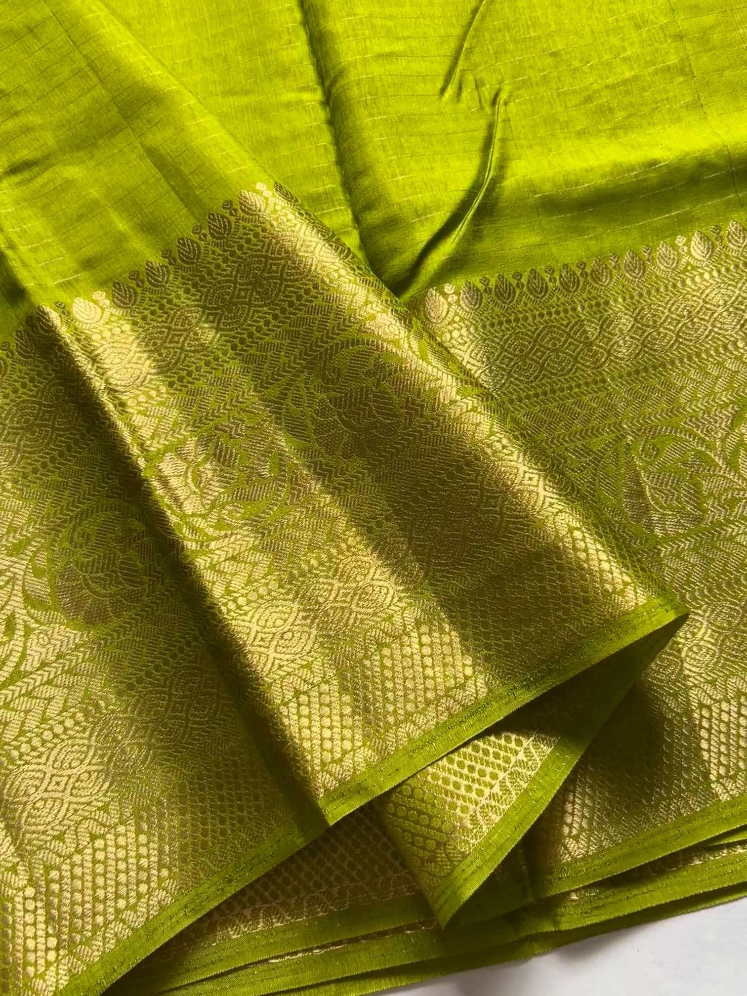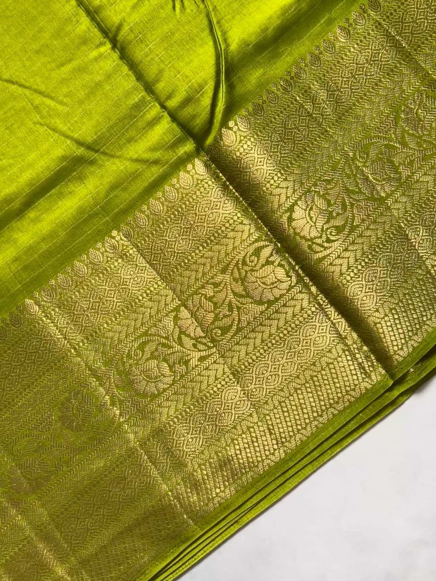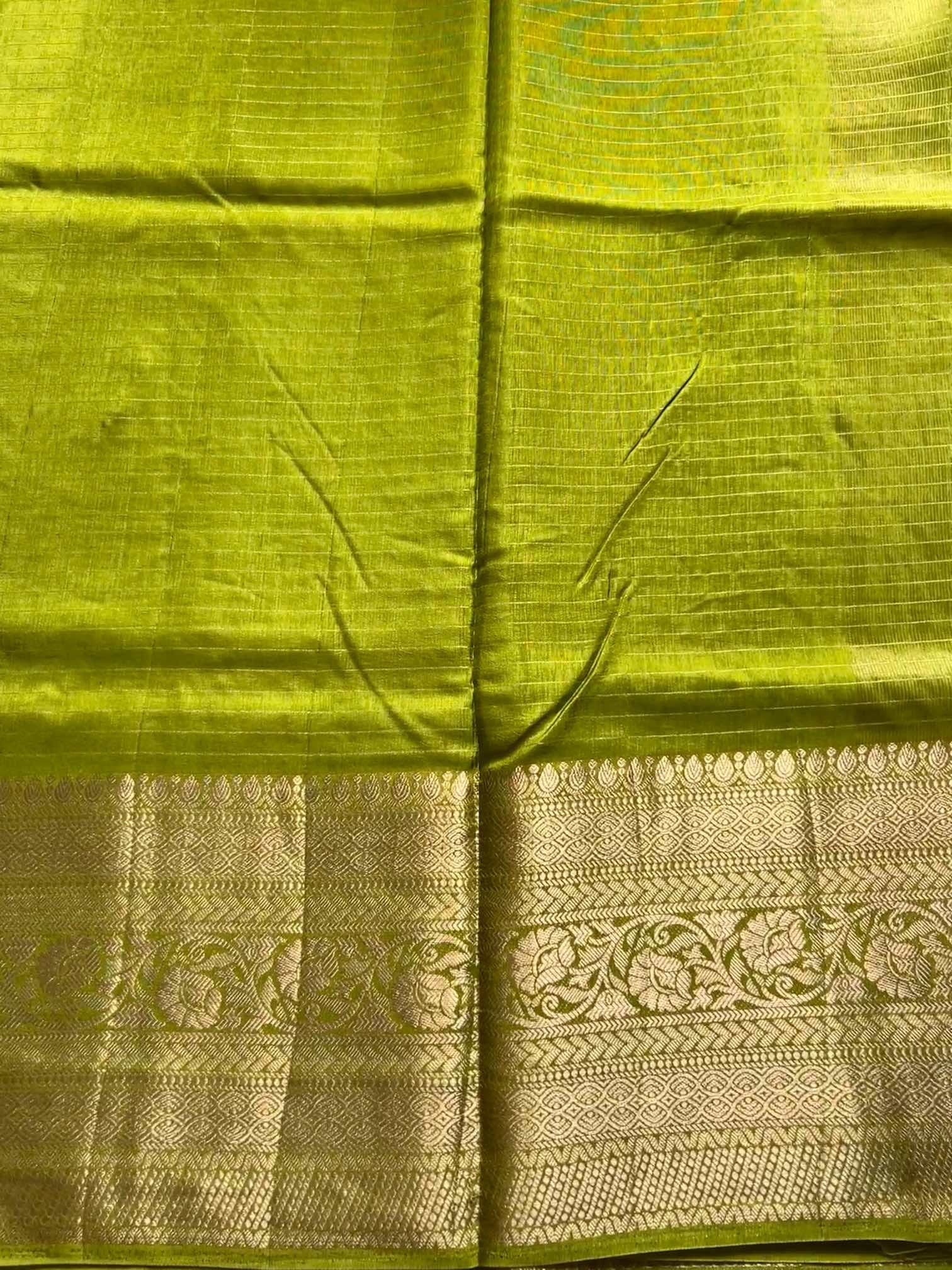 The soft, fluid texture of dola silk drapes with effortless grace, catching light in a gentle, elegant sheen. The brocade border adds a regal touch—rich, intricate, and timeless—while the fine zari lines running through the body create a subtle shimmer, giving the saree an ethereal charm.Together, these elements make the saree both sophisticated and captivating, perfect for moments that call for quiet grandeur and classic beauty.