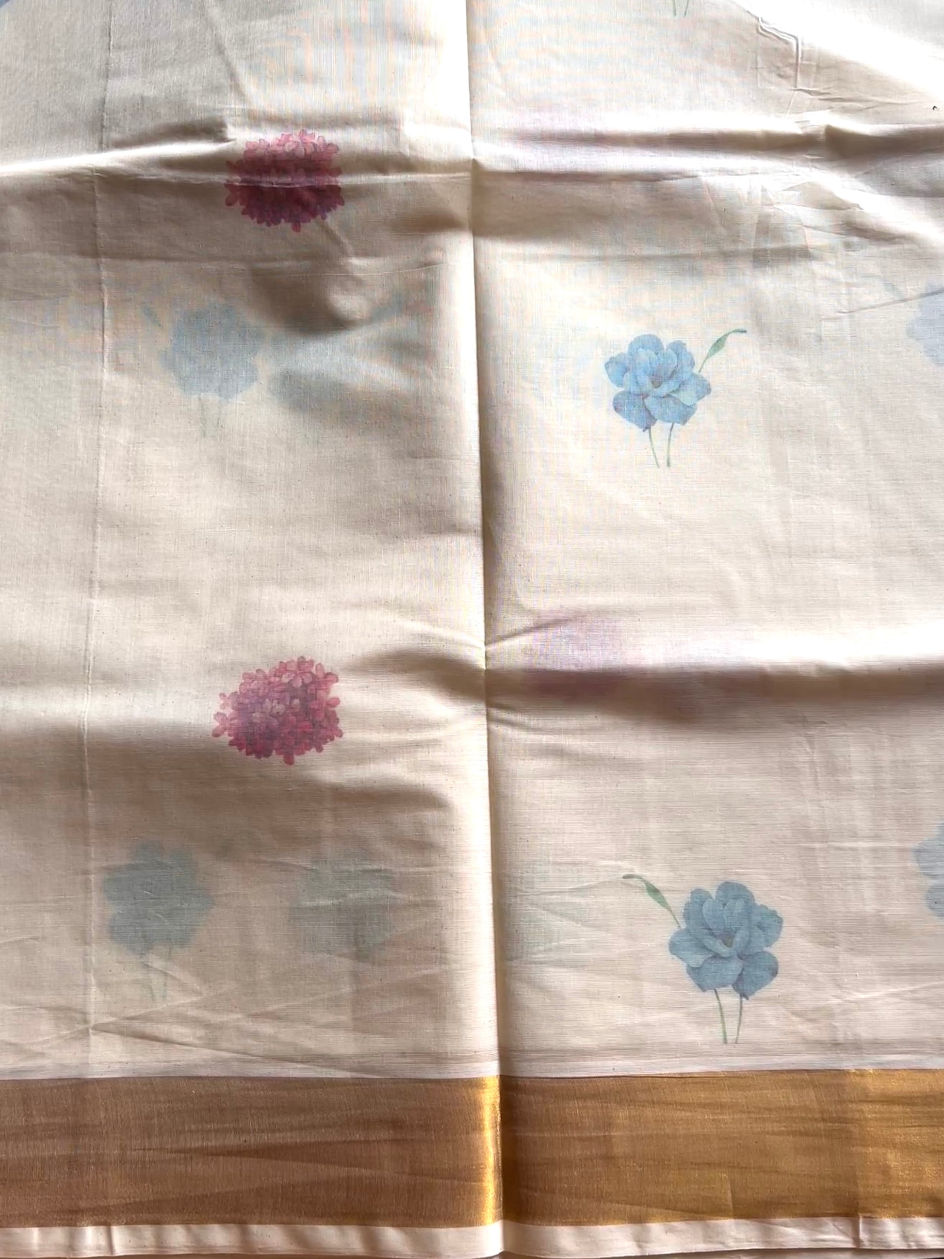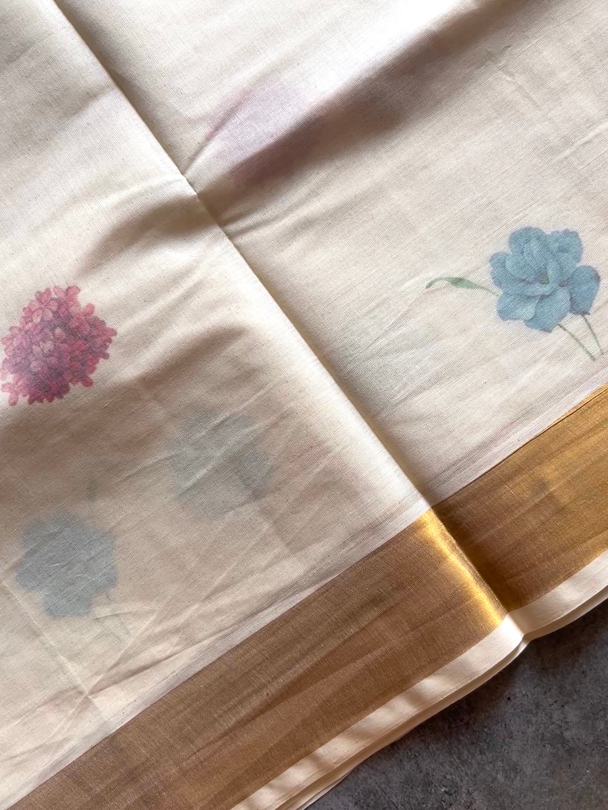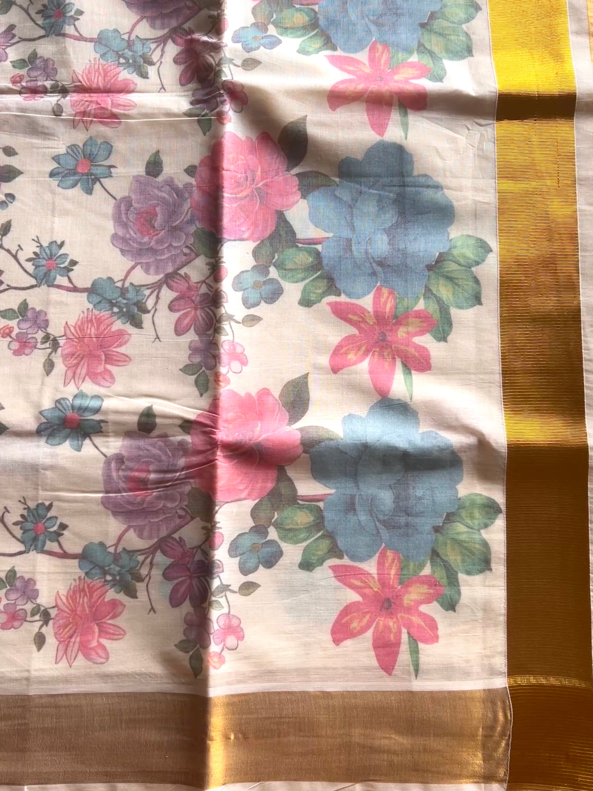 The soft cotton offers comfort and ease, while the floral prints add a delicate, festive charm that mirrors the blooming pookalam (flower rangoli). These sarees blend the grace of Kerala's heritage with a touch of modern artistry, making them a perfect choice for celebrating Onam with style and grace.
