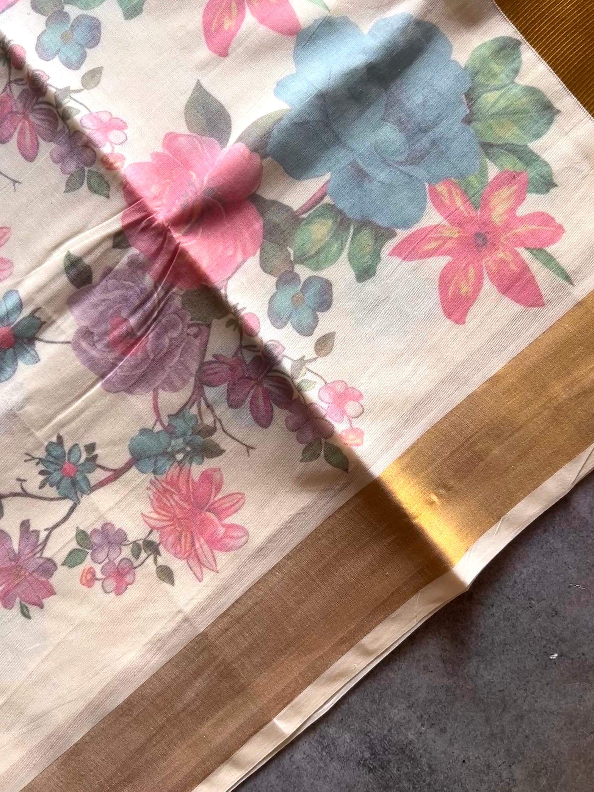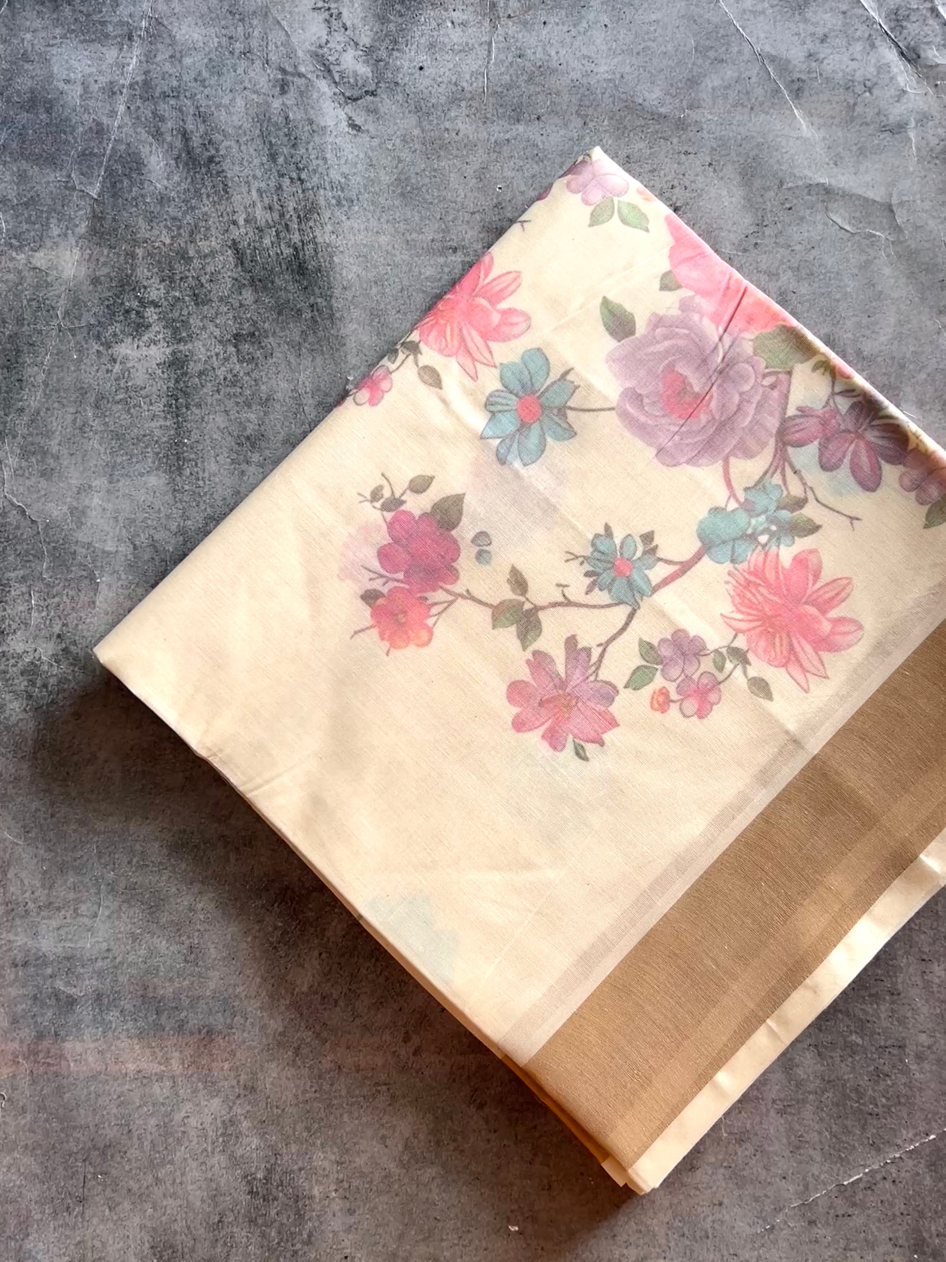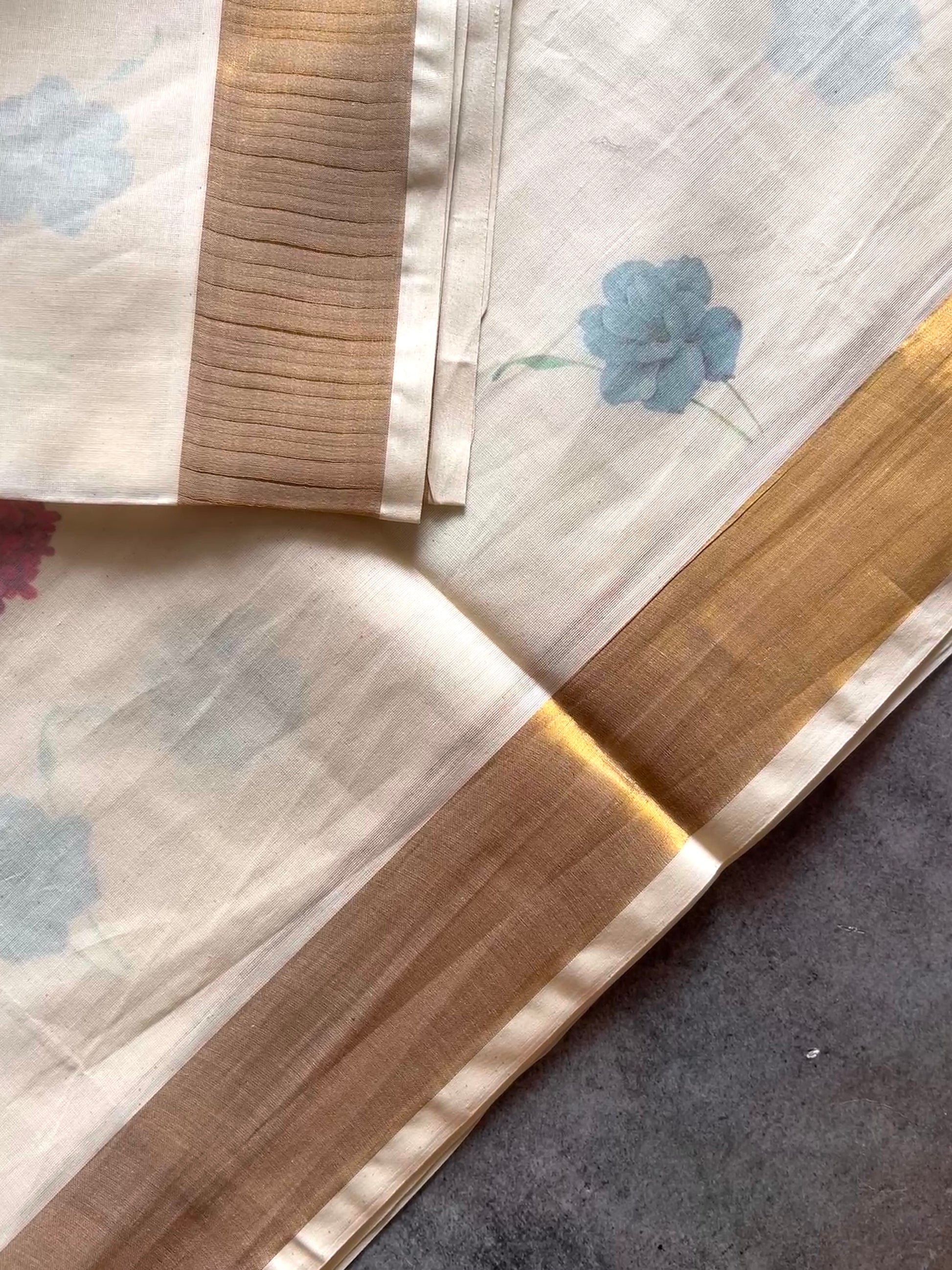 The soft cotton offers comfort and ease, while the floral prints add a delicate, festive charm that mirrors the blooming pookalam (flower rangoli). These sarees blend the grace of Kerala's heritage with a touch of modern artistry, making them a perfect choice for celebrating Onam with style and grace.
