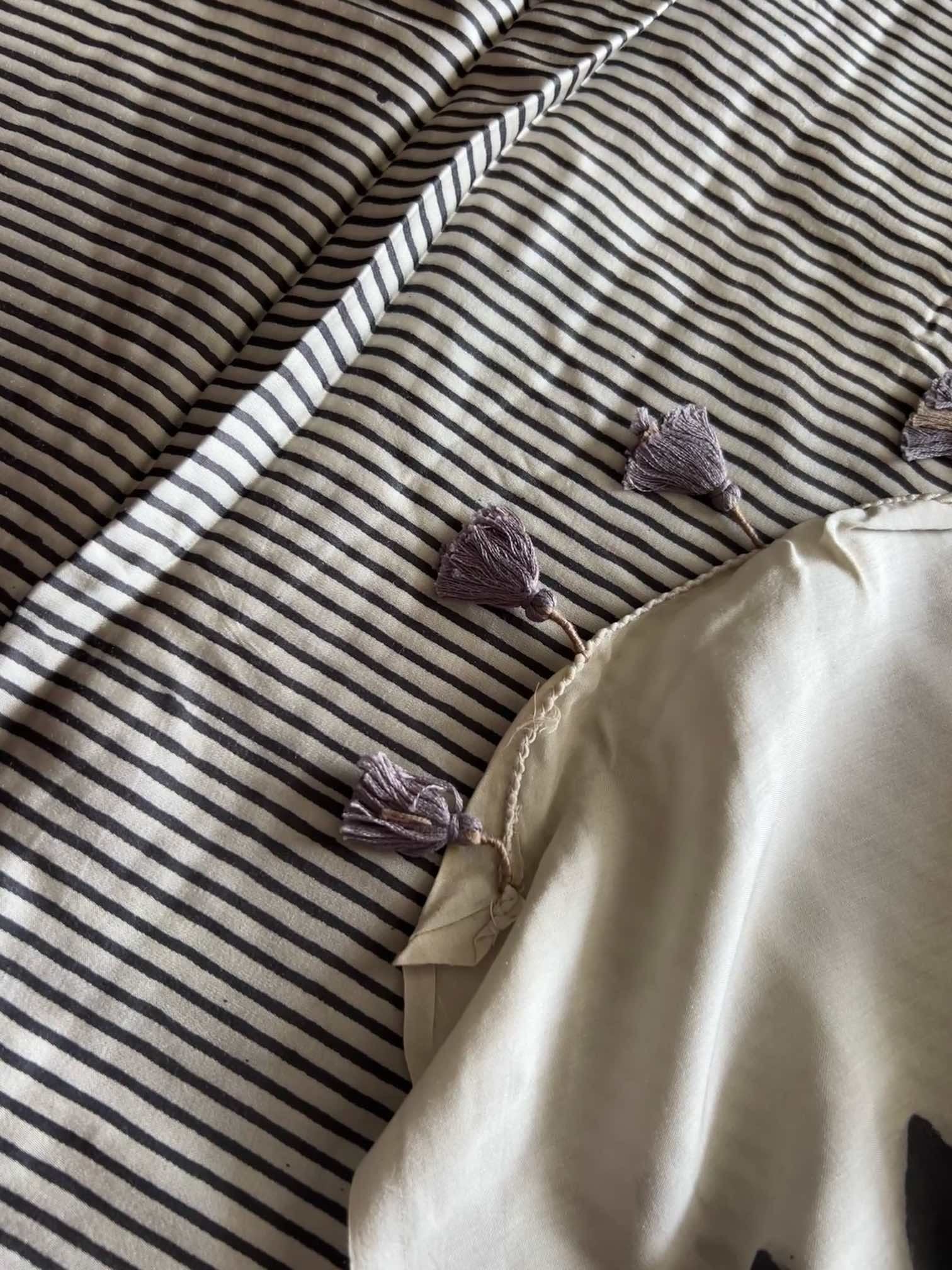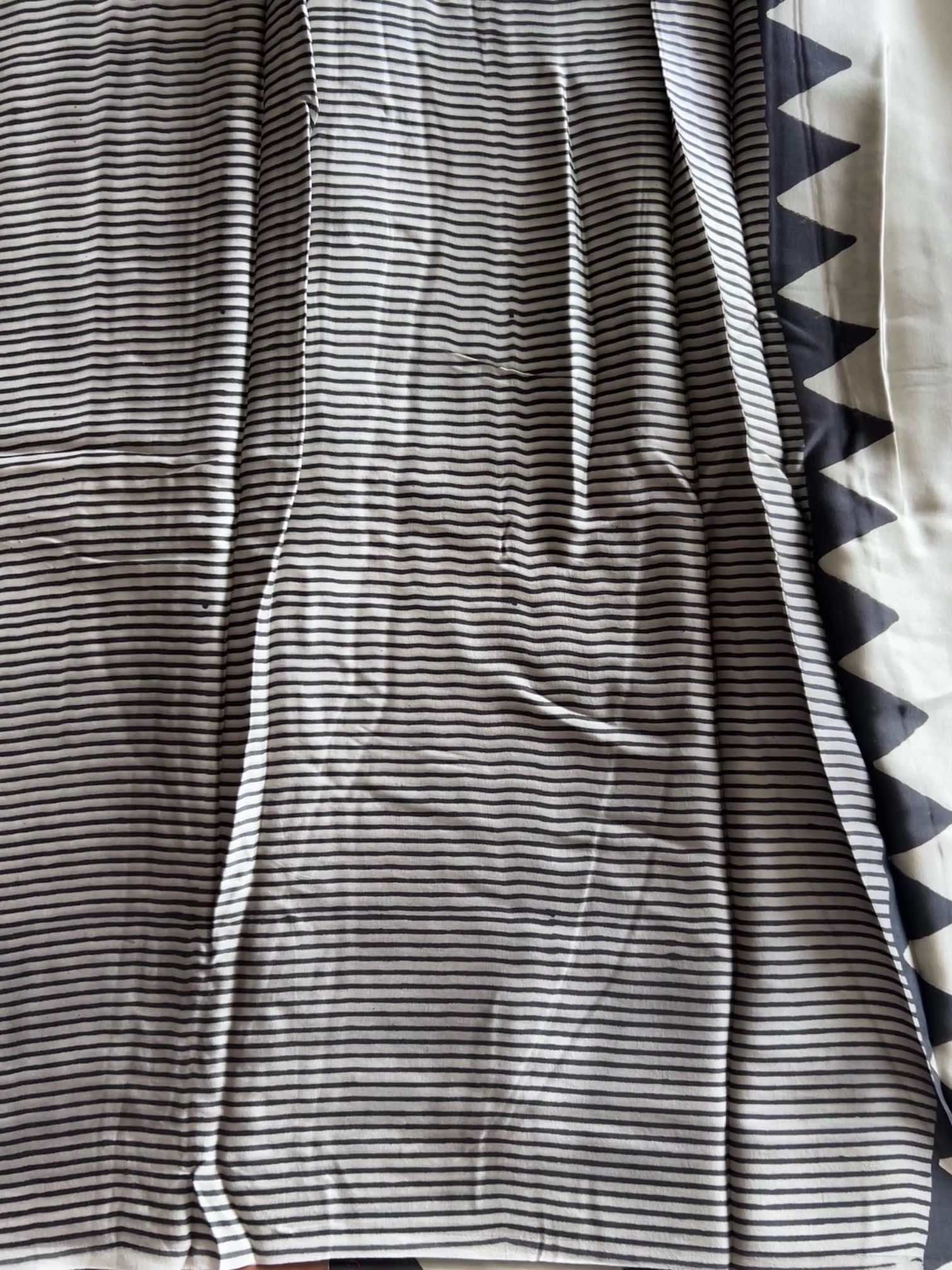 Modal silk with Ajrakh is a mesmerizing fusion of elegance and tradition. The smooth, lustrous sheen of modal silk enhances the intricate, geometric patterns of Ajrakh printing, creating a fabric that is both luxurious and rich in cultural heritage. Each piece is a testament to the skill and artistry of master craftsmen, resulting in garments that drape beautifully and exude timeless sophistication.