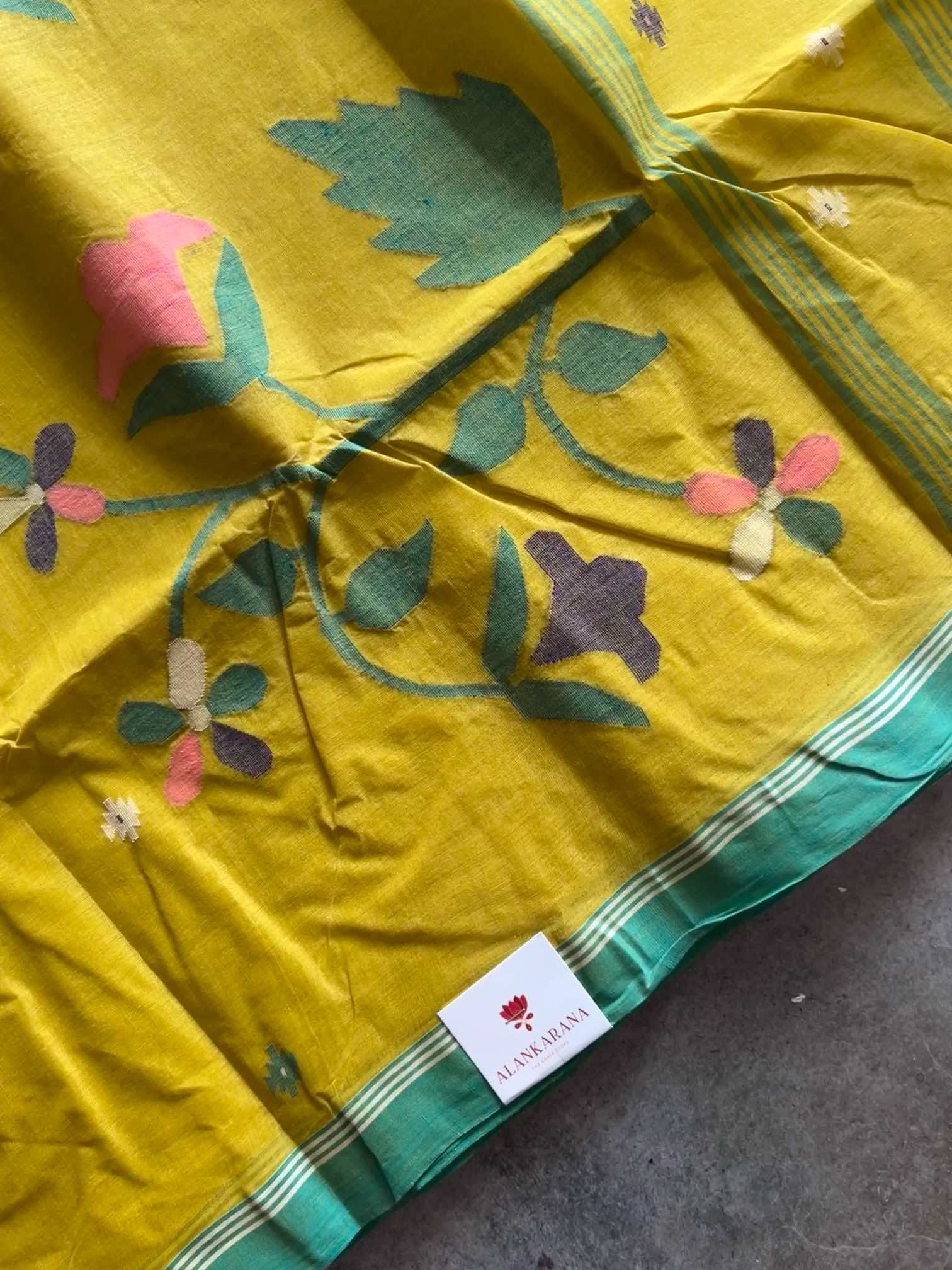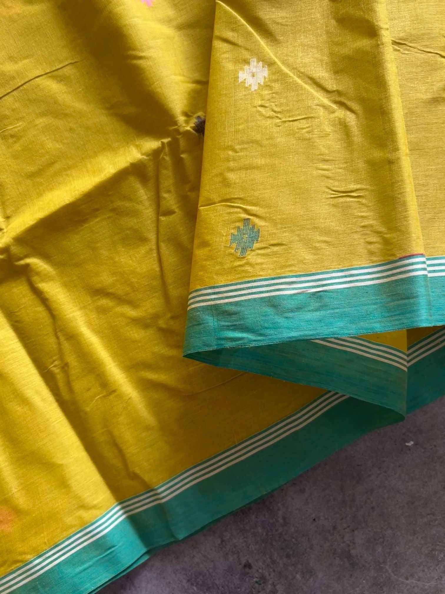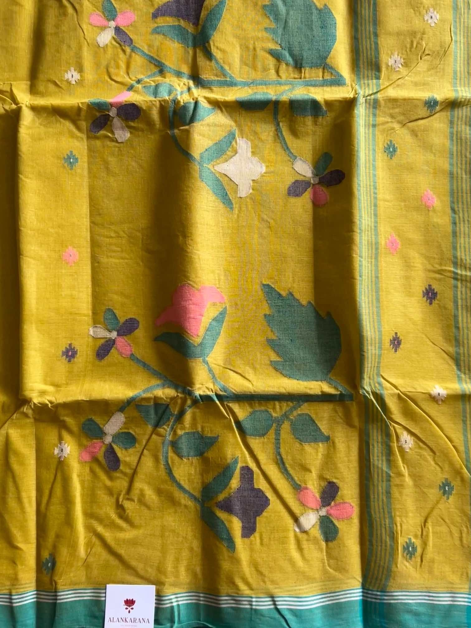 Handloom Bengal cotton sarees with Jamdani work are a beautiful fusion of craftsmanship and tradition. Each saree is an art piece, with the Jamdani motifs—ranging from floral to geometric patterns—woven into the fabric using the finest cotton threads. The handloom process ensures every saree is unique, with slight variations that speak to the skill and dedication of the weavers. The gentle drape, coupled with the elegance of the intricate Jamdani work, gives these sarees an understated yet timeless beauty, making them a favorite for both everyday wear and special occasions.