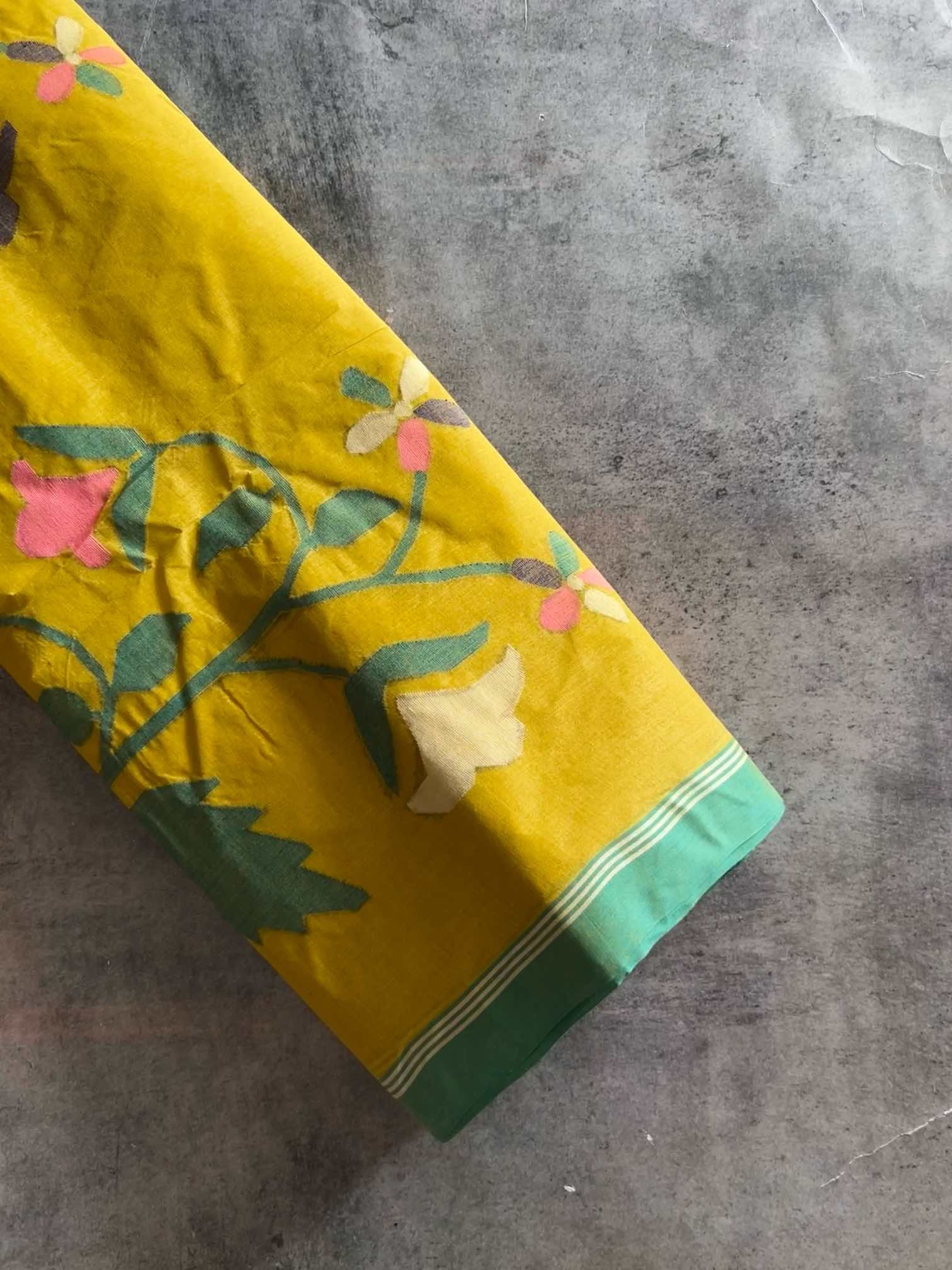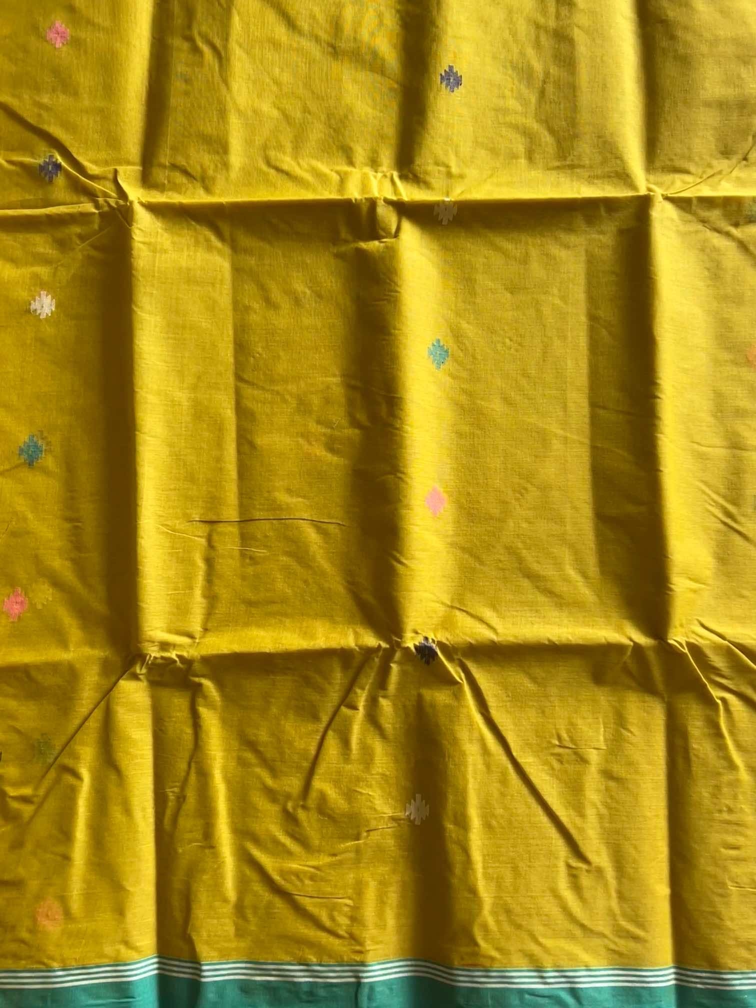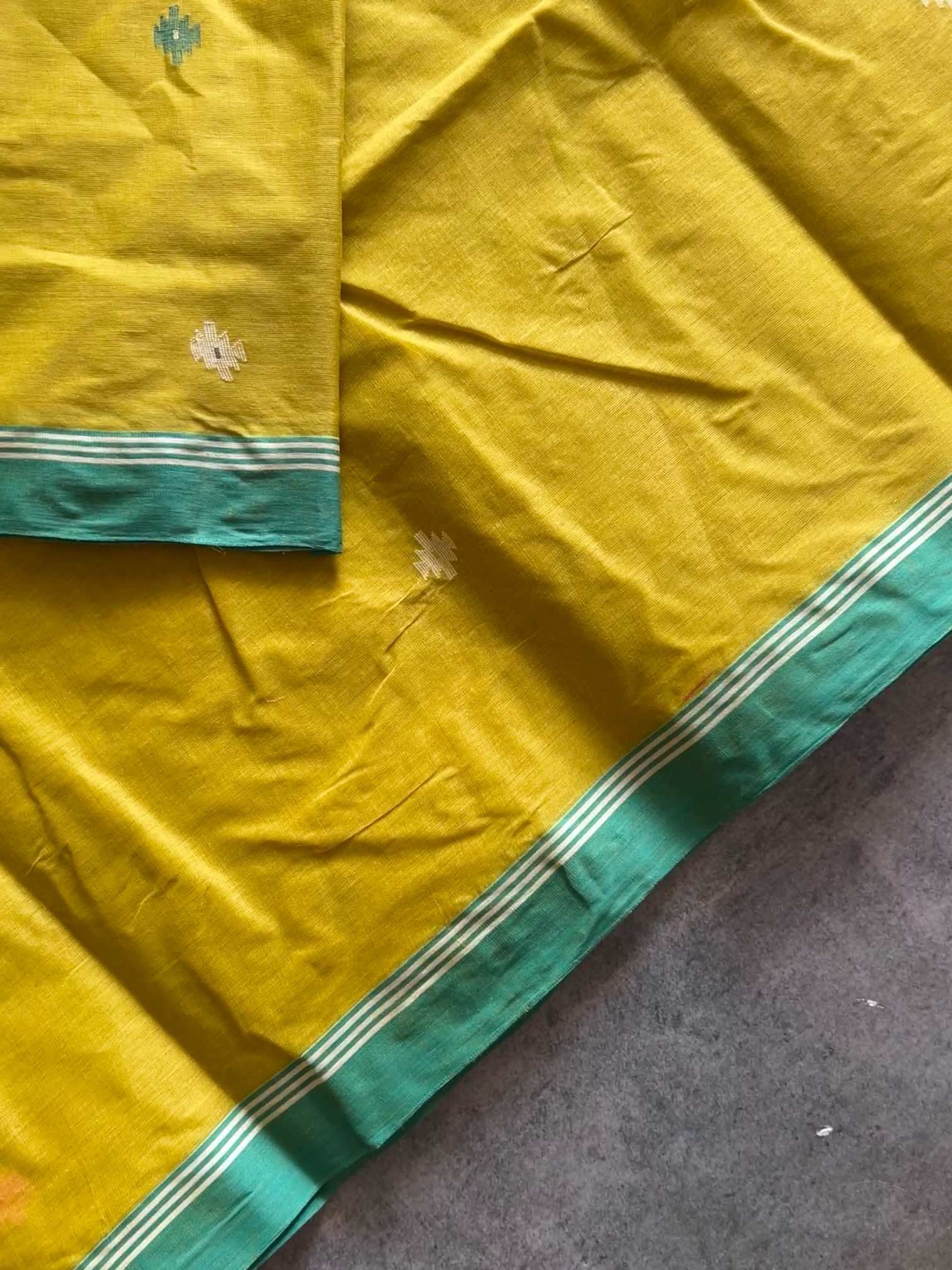 Handloom Bengal cotton sarees with Jamdani work are a beautiful fusion of craftsmanship and tradition. Each saree is an art piece, with the Jamdani motifs—ranging from floral to geometric patterns—woven into the fabric using the finest cotton threads. The handloom process ensures every saree is unique, with slight variations that speak to the skill and dedication of the weavers. The gentle drape, coupled with the elegance of the intricate Jamdani work, gives these sarees an understated yet timeless beauty, making them a favorite for both everyday wear and special occasions.