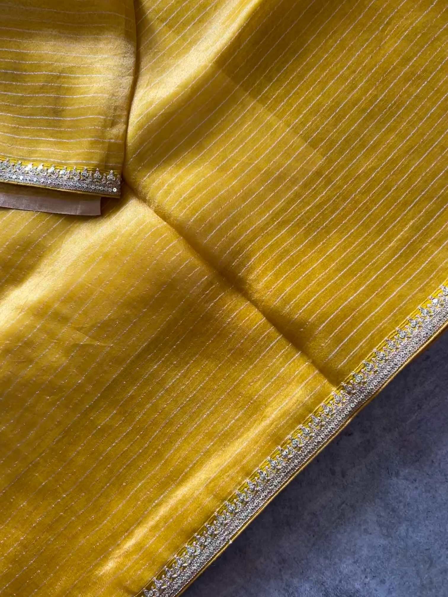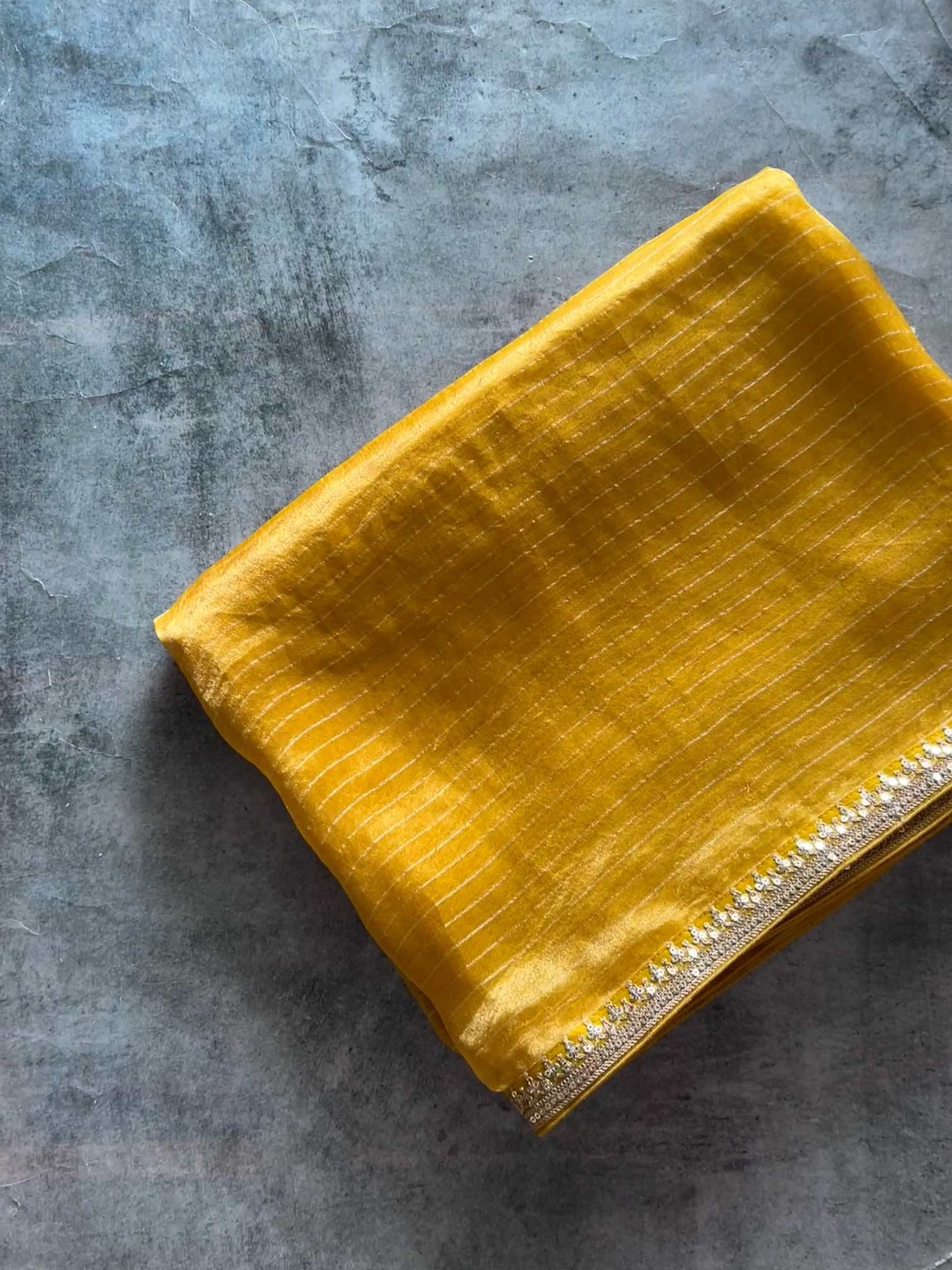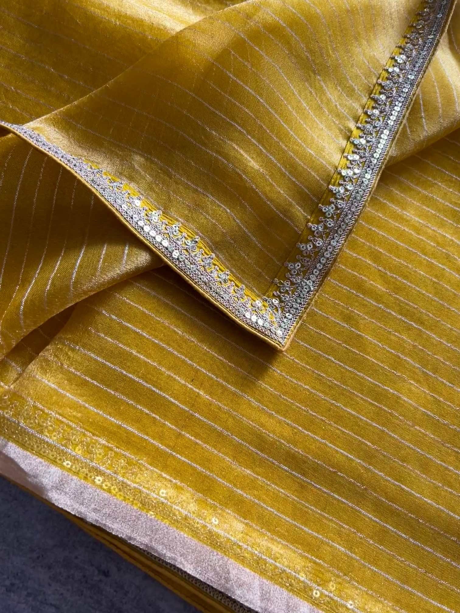The organza silk lends a sheer, lightweight grace to the saree, giving it a delicate, ethereal charm. Complementing this is the appliqué border work, which brings artistic detail and texture, elevating the saree into a unique statement piece. Together, this combination makes the saree perfect for festive occasions, weddings, or elegant evening events—where timeless style meets artistic expression.