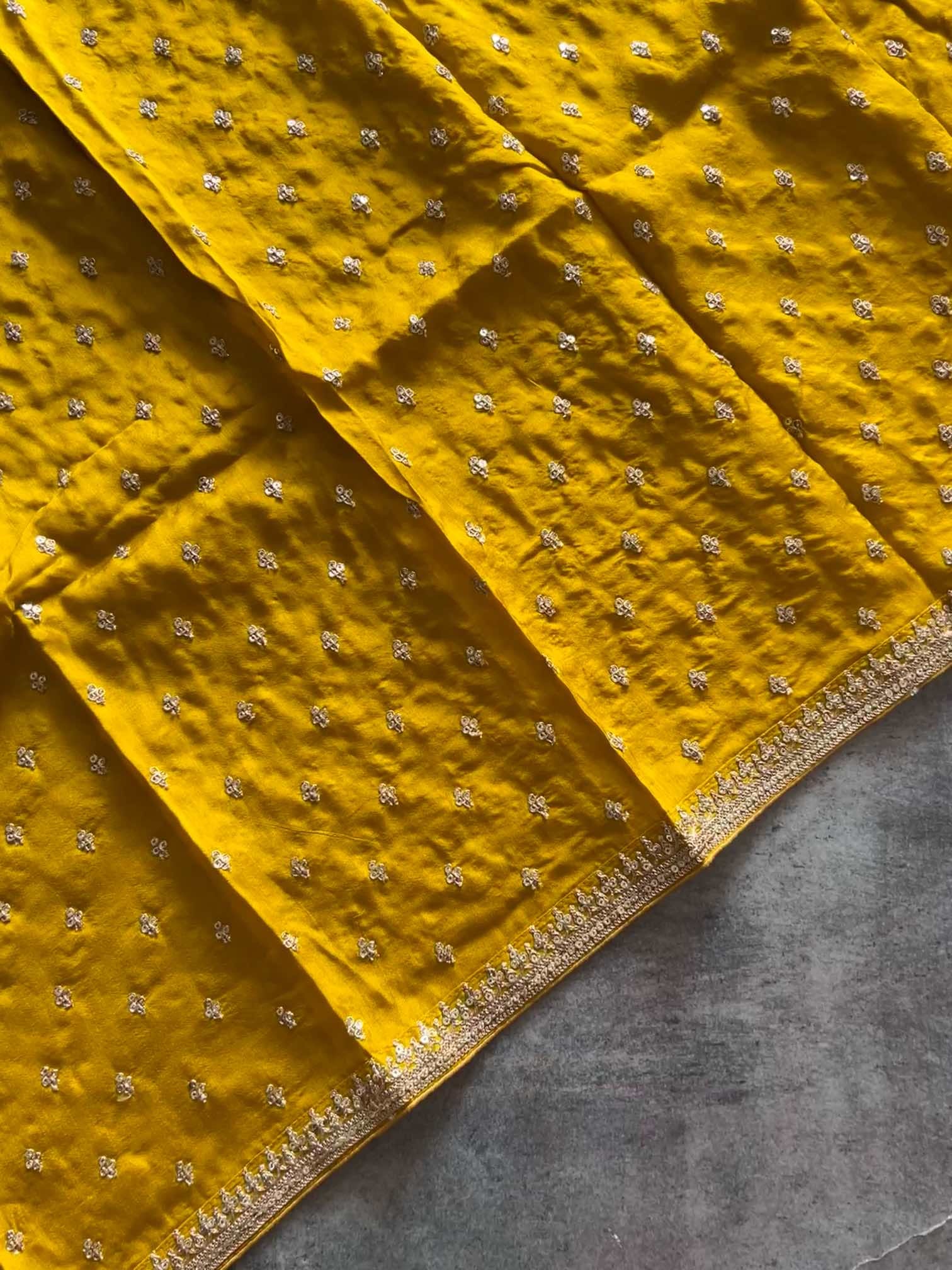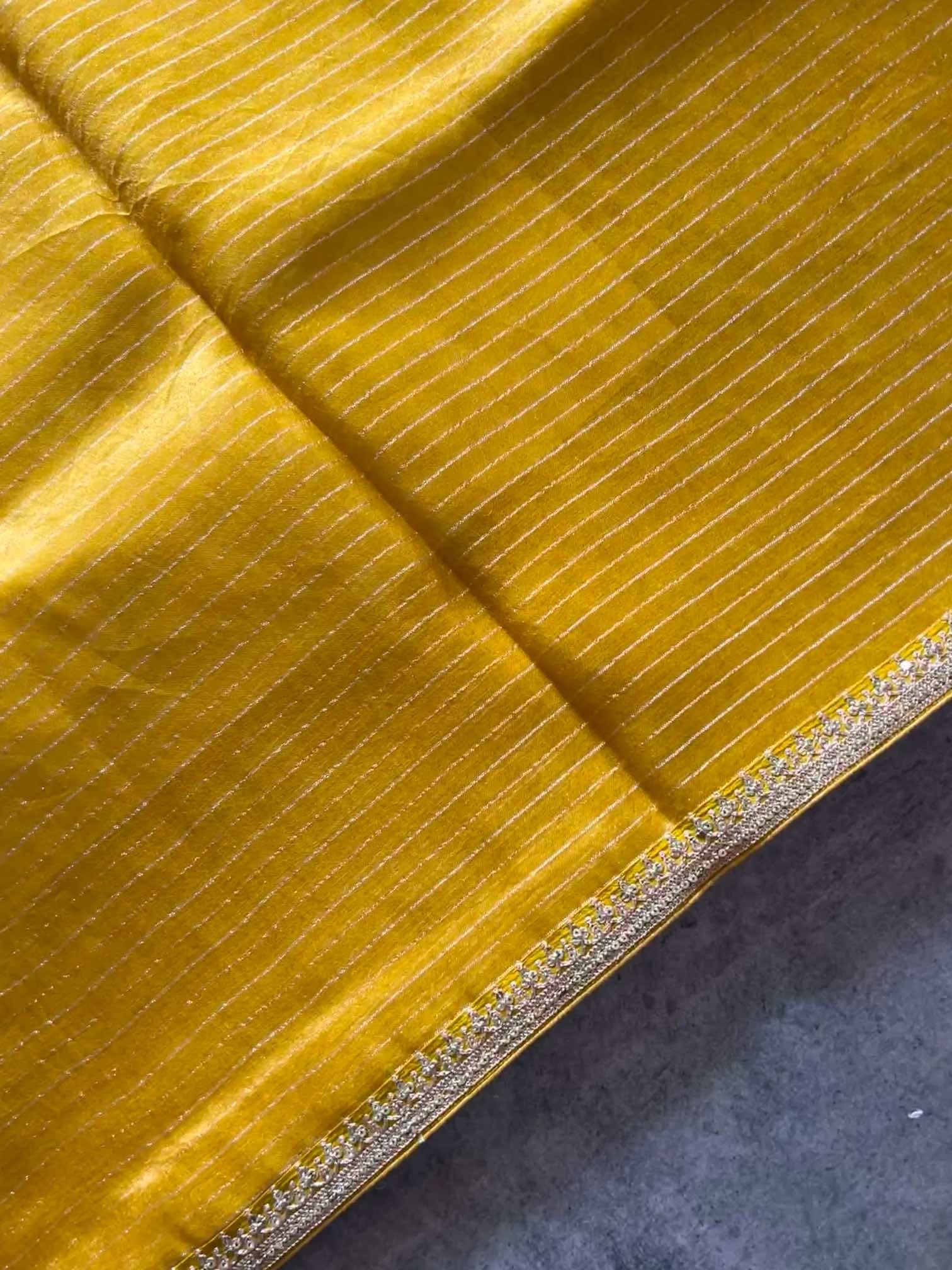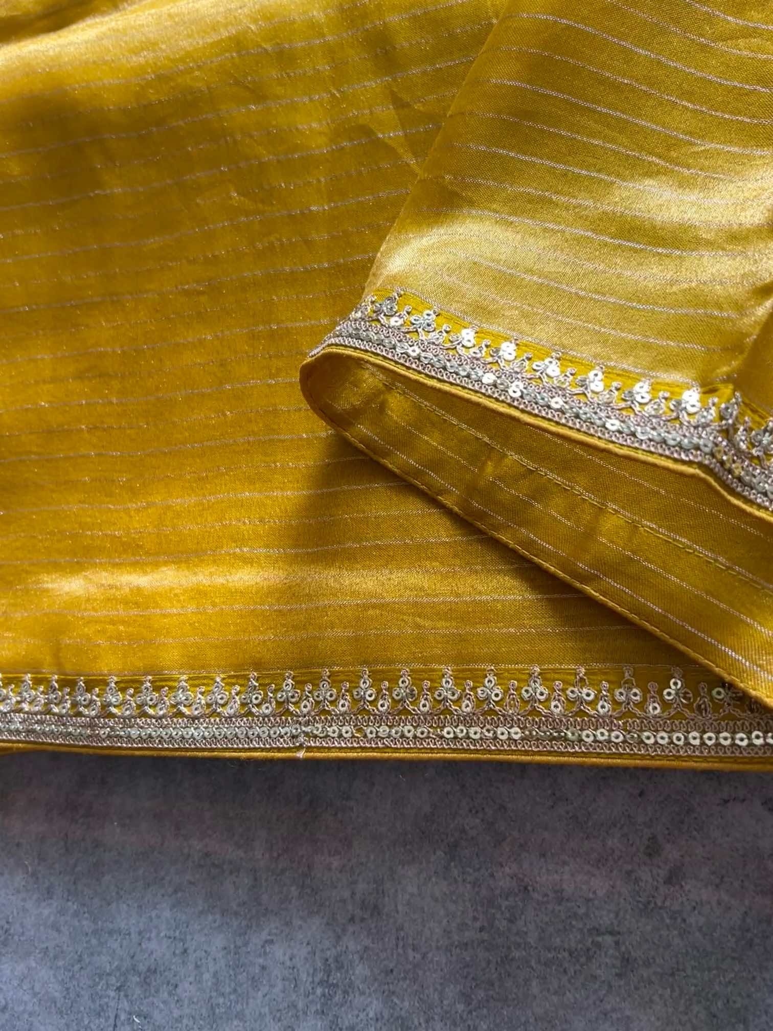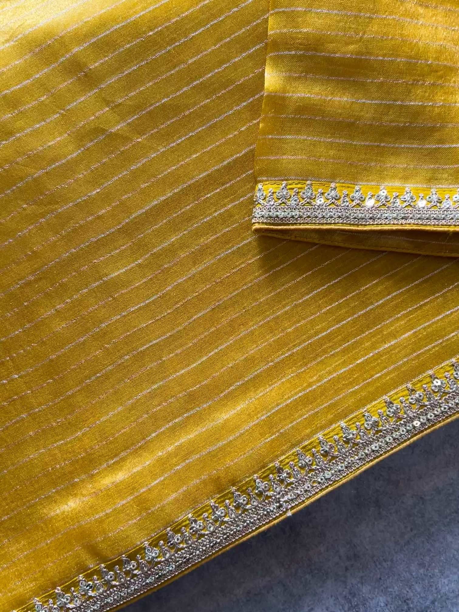 The organza silk lends a sheer, lightweight grace to the saree, giving it a delicate, ethereal charm. Complementing this is the appliqué border work, which brings artistic detail and texture, elevating the saree into a unique statement piece. Together, this combination makes the saree perfect for festive occasions, weddings, or elegant evening events—where timeless style meets artistic expression.