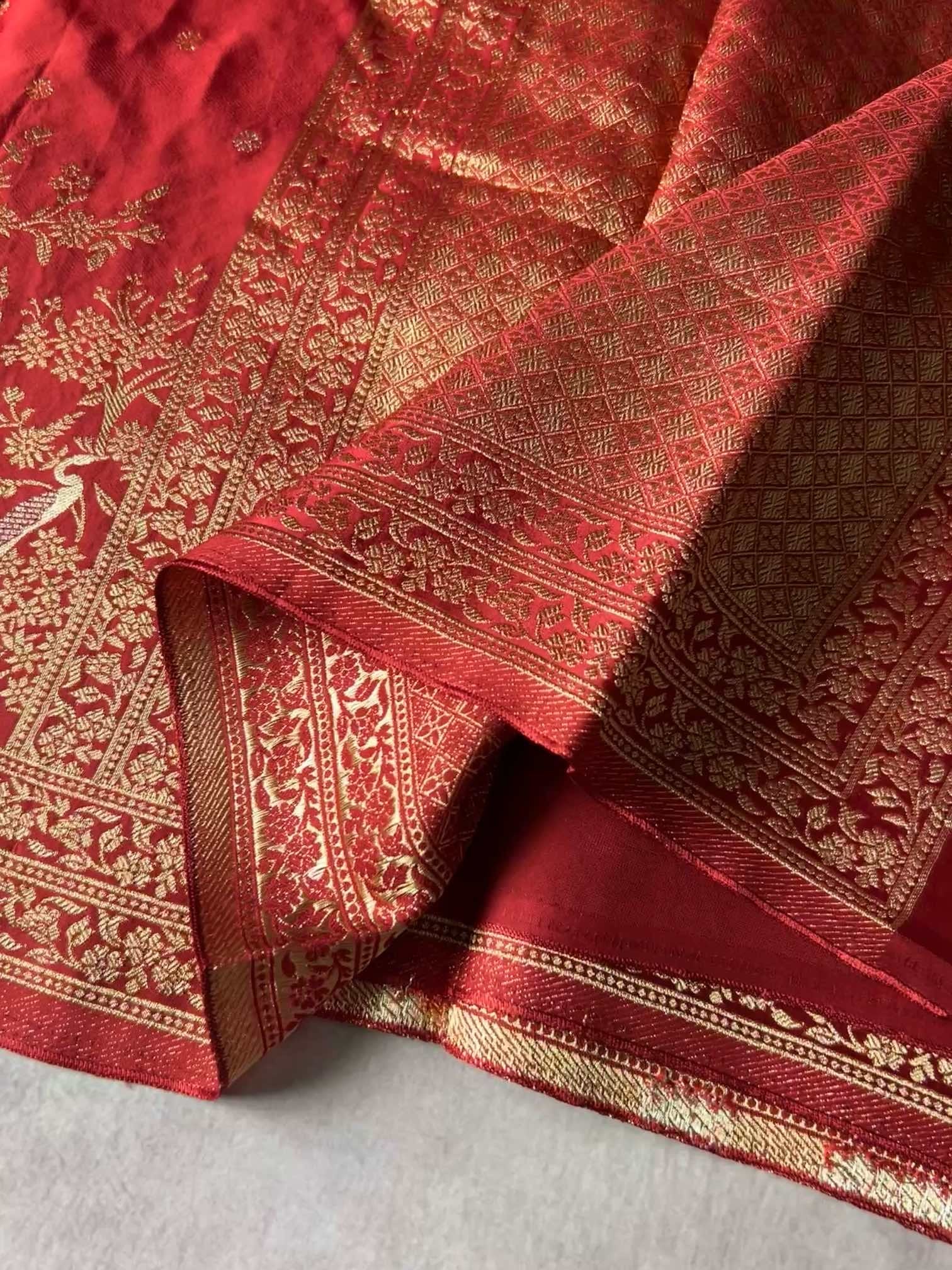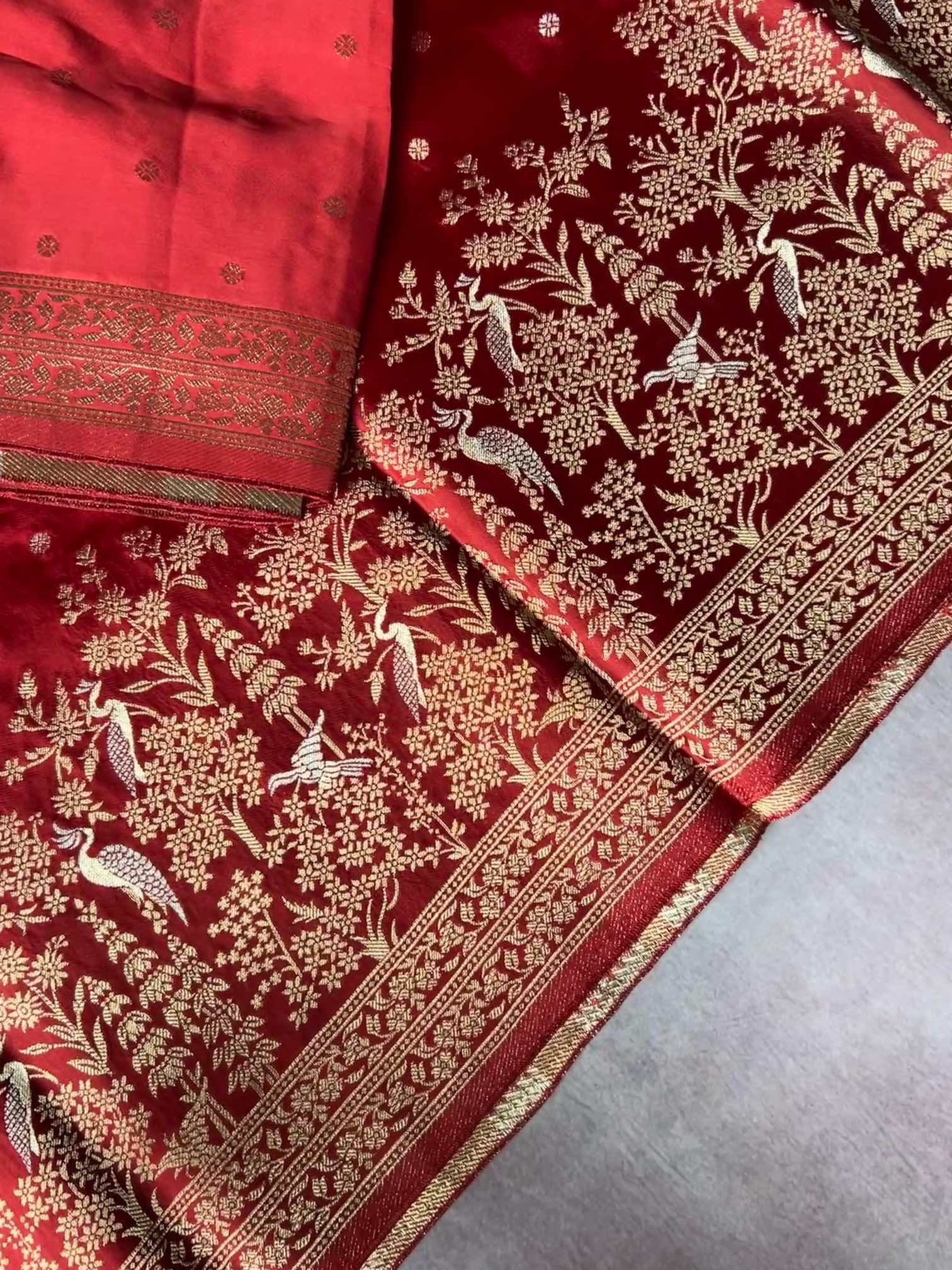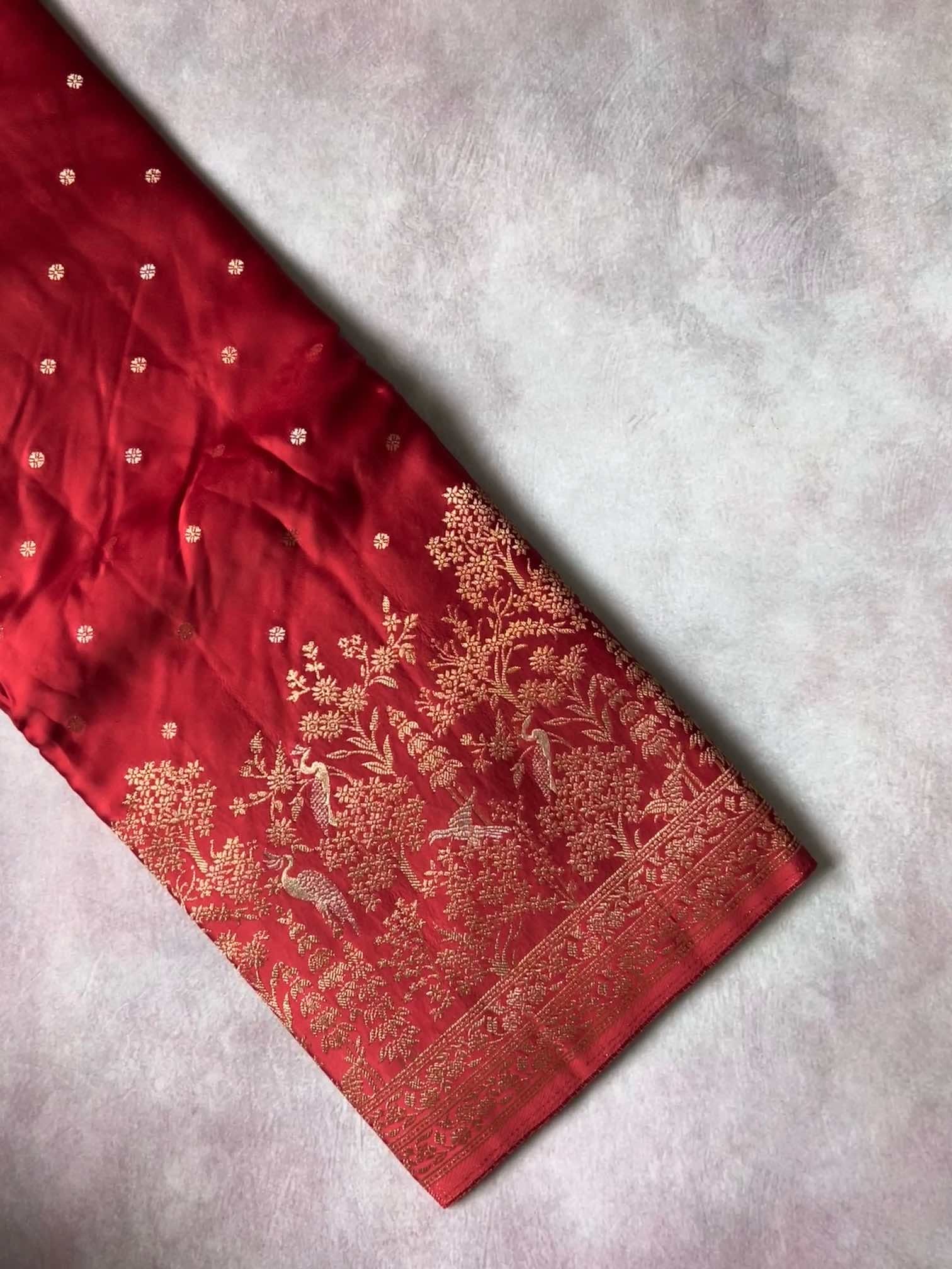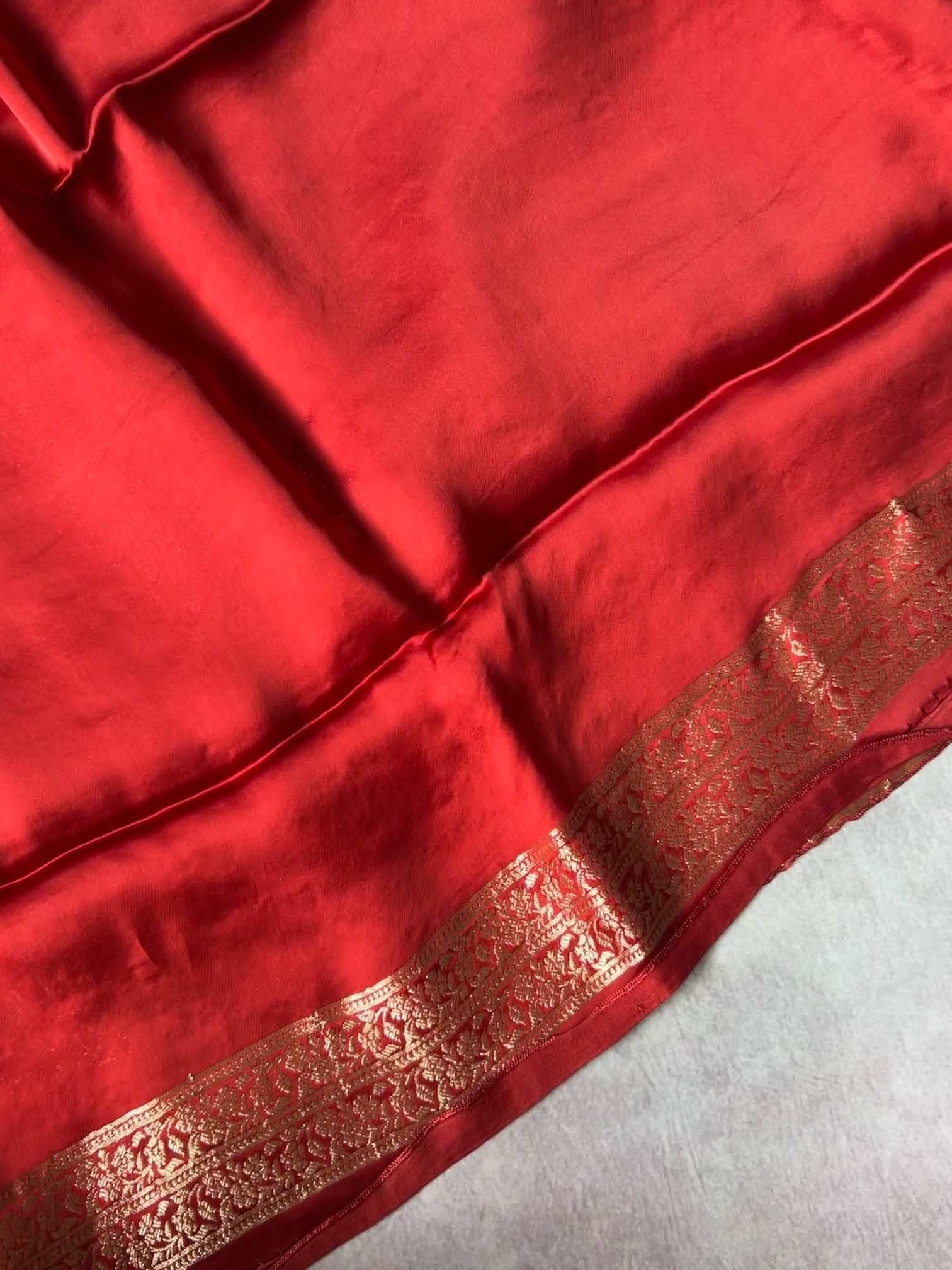 Mashru silk is a stunning blend of tradition and craftsmanship, known for its rich sheen and unique texture. Woven with silk on the outside and cotton on the inside, it offers both luxury and comfort. The fabric’s vibrant colors and intricate patterns reflect centuries of artisanal heritage, making it a favorite for elegant attire. Its smooth, glossy finish exudes sophistication, while its breathable nature ensures wearability.