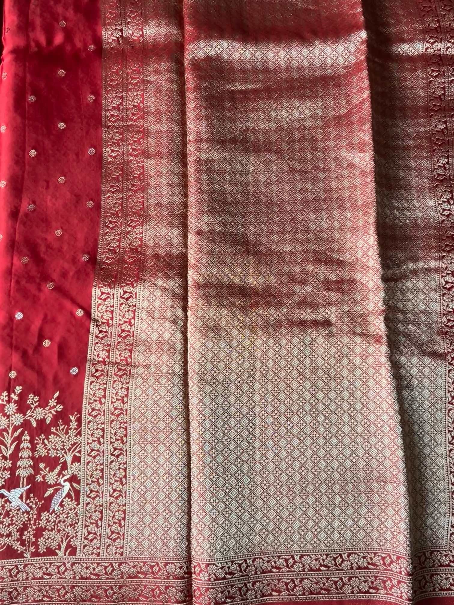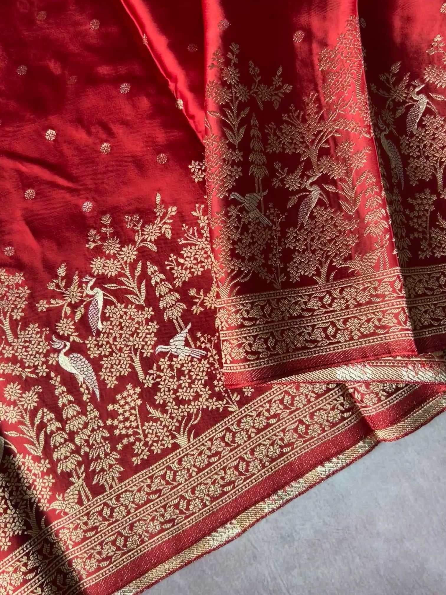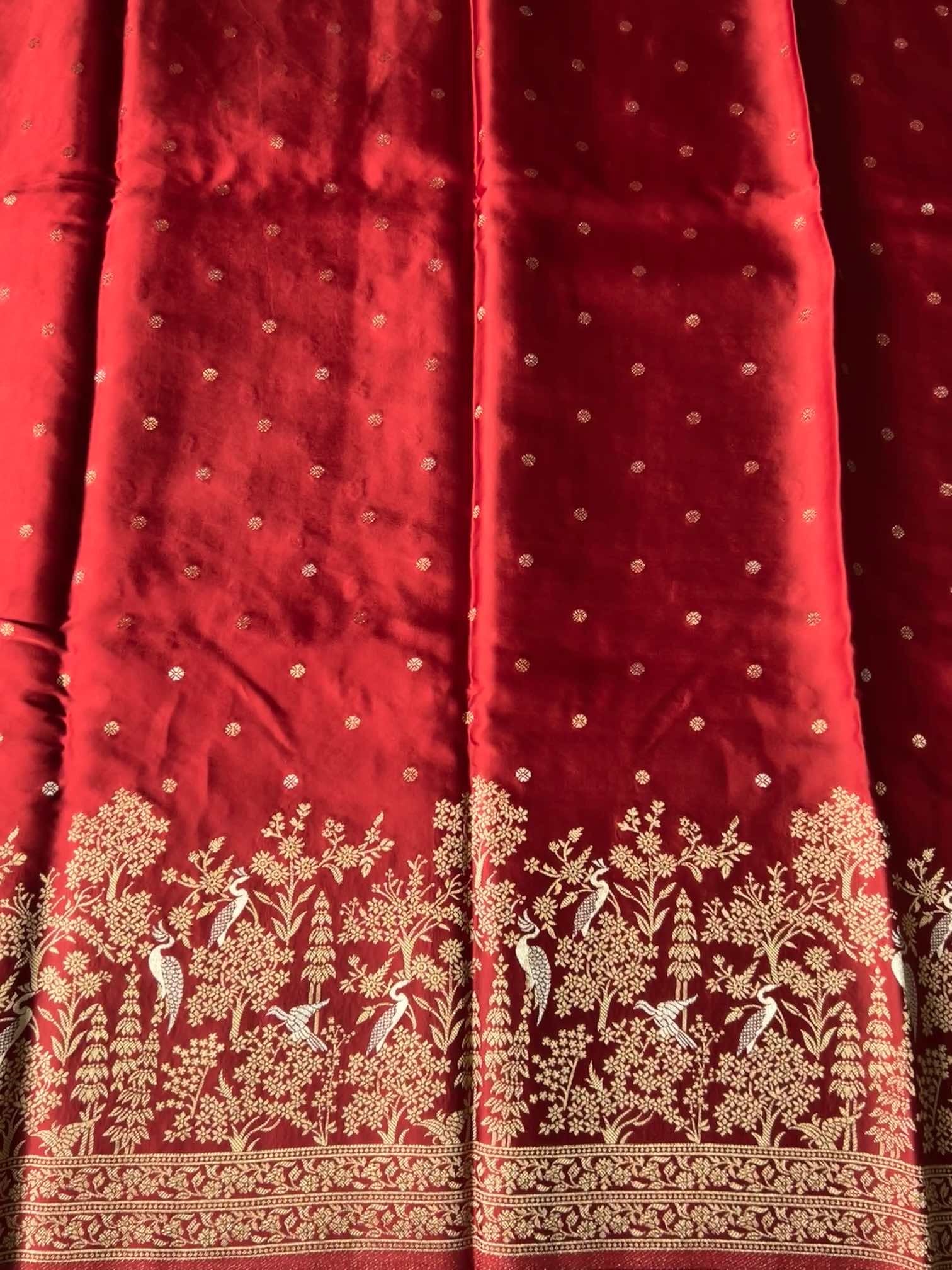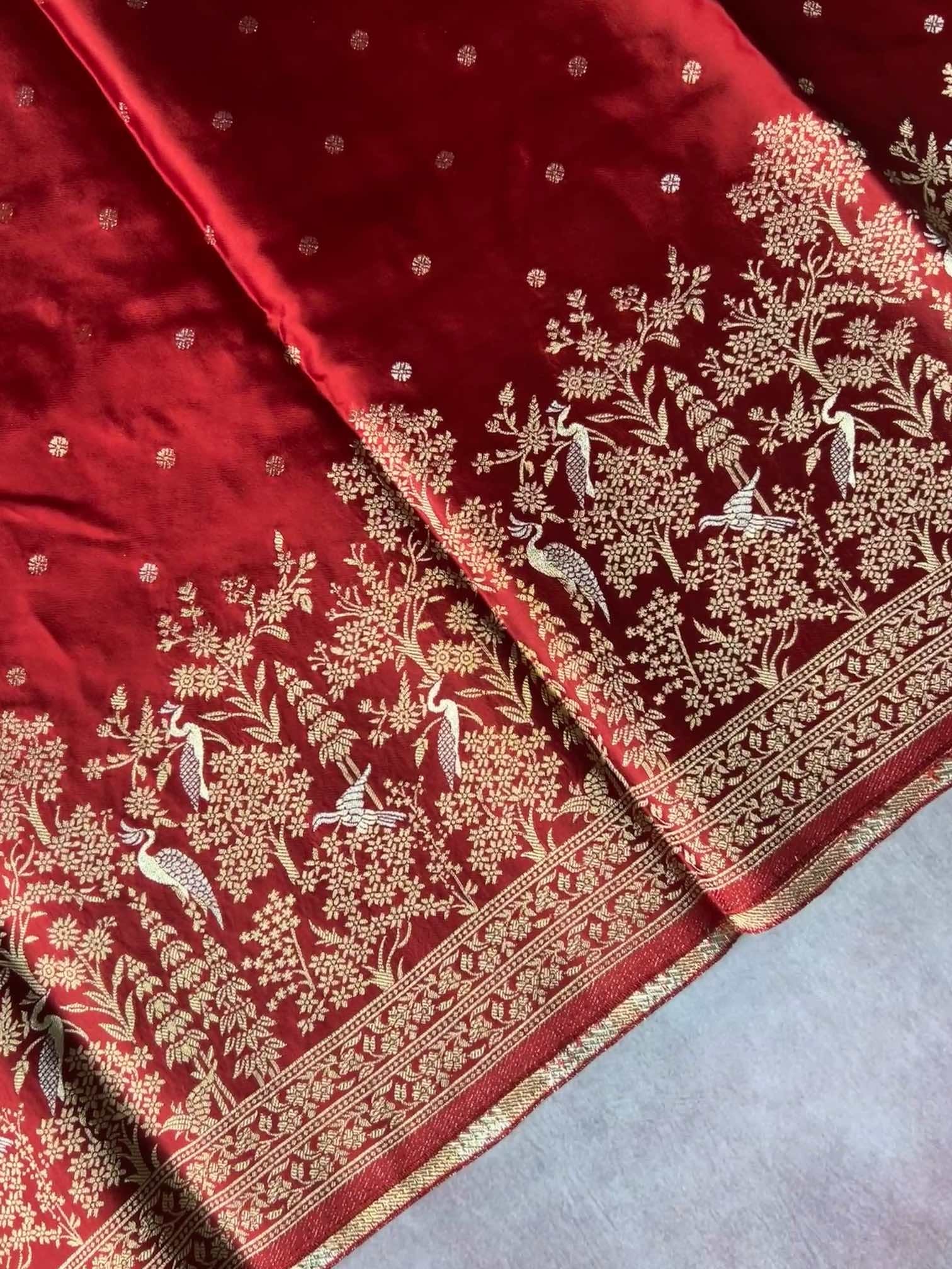 Mashru silk is a stunning blend of tradition and craftsmanship, known for its rich sheen and unique texture. Woven with silk on the outside and cotton on the inside, it offers both luxury and comfort. The fabric’s vibrant colors and intricate patterns reflect centuries of artisanal heritage, making it a favorite for elegant attire. Its smooth, glossy finish exudes sophistication, while its breathable nature ensures wearability.