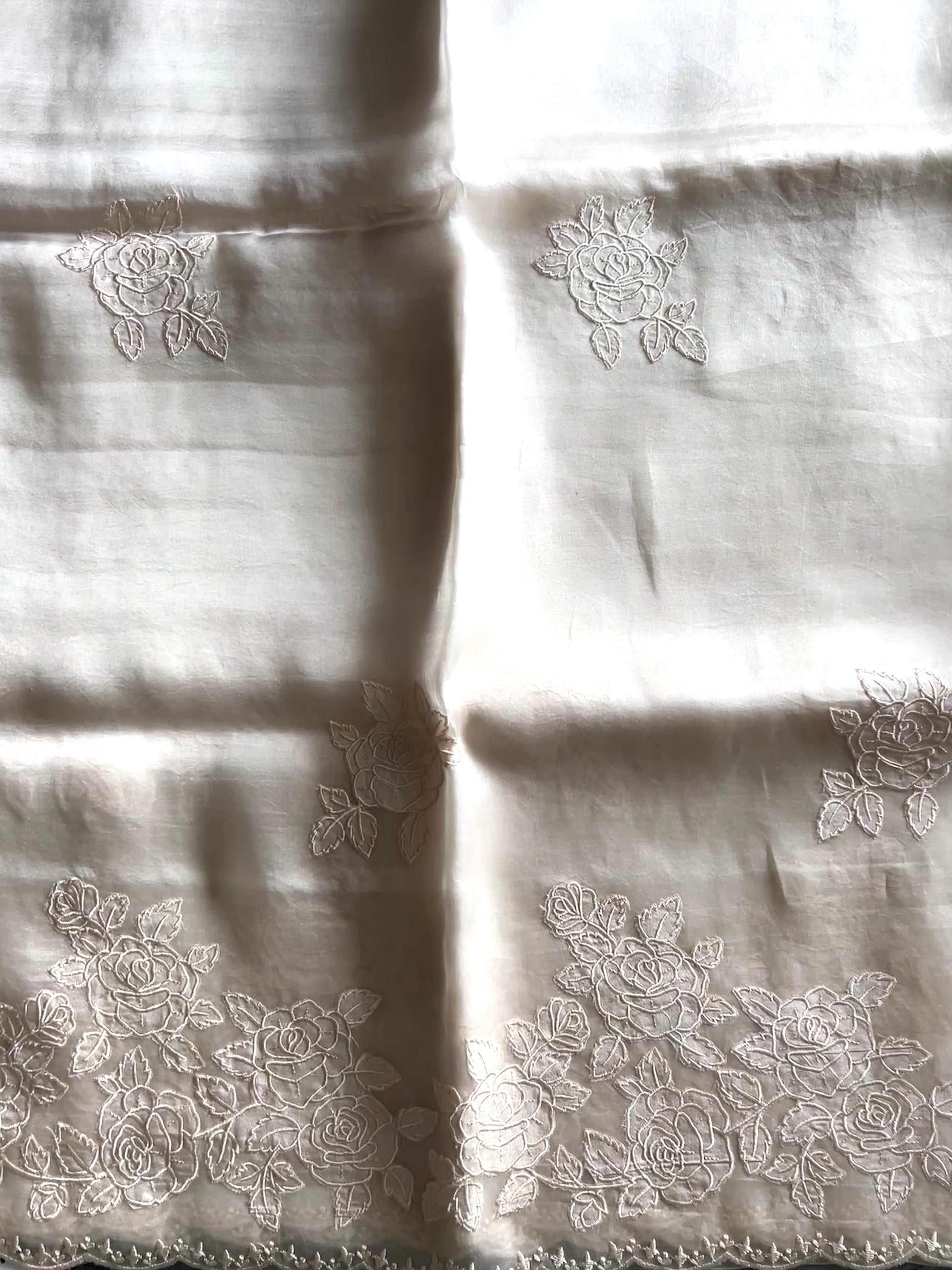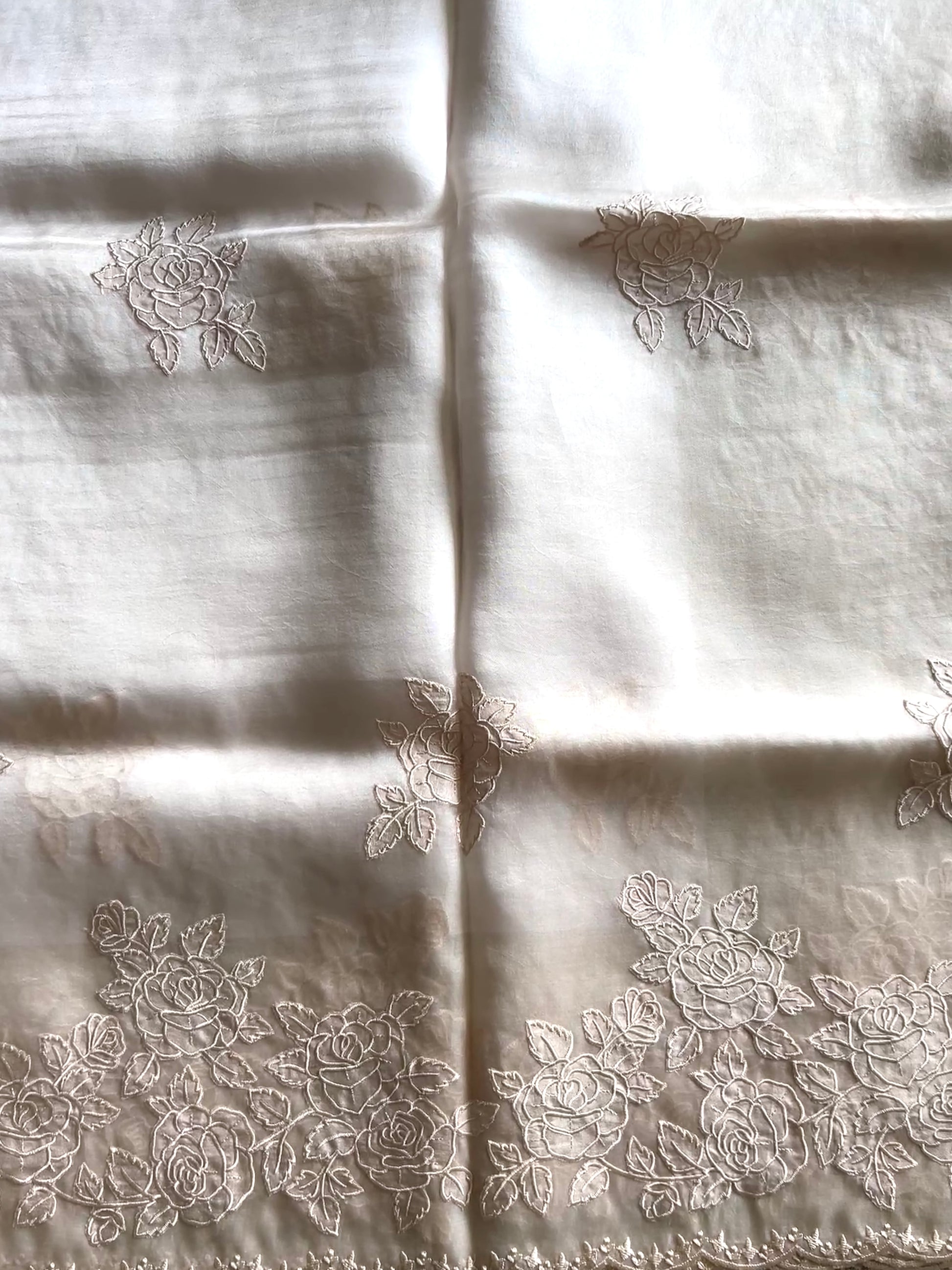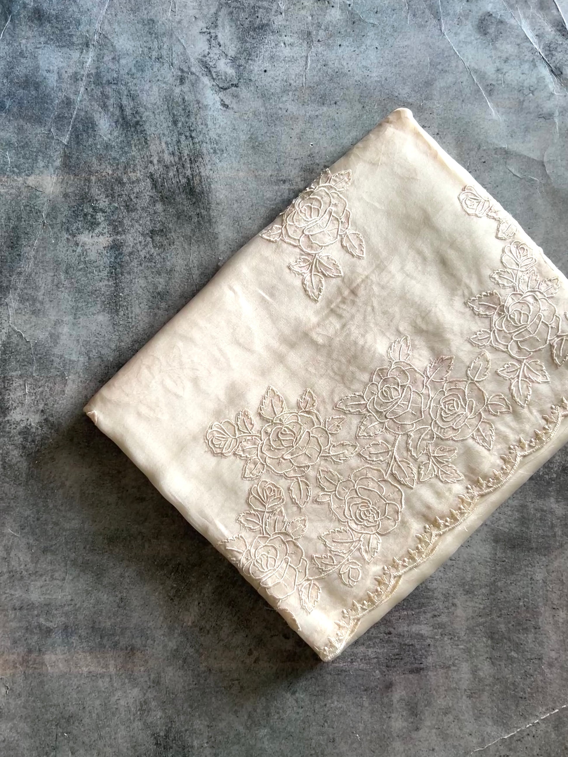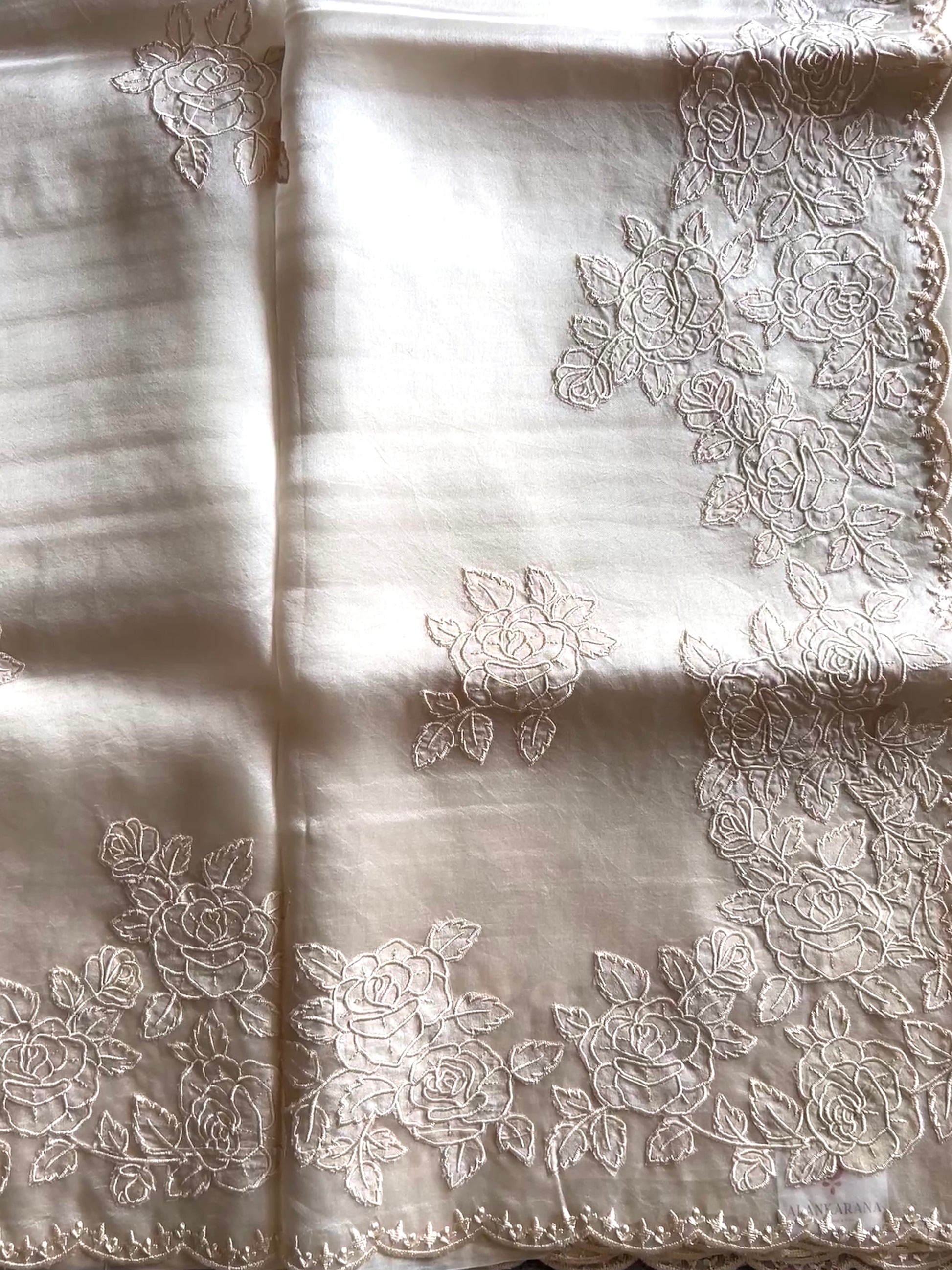 The organza silk lends a sheer, lightweight grace to the saree, giving it a delicate, ethereal charm. Complementing this is the appliqué border work, which brings artistic detail and texture, elevating the saree into a unique statement piece. Together, this combination makes the saree perfect for festive occasions, weddings, or elegant evening events—where timeless style meets artistic expression.
