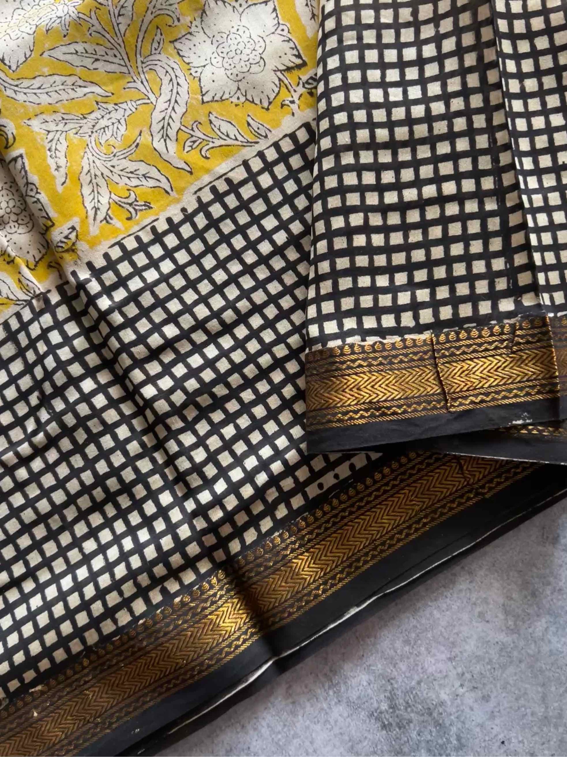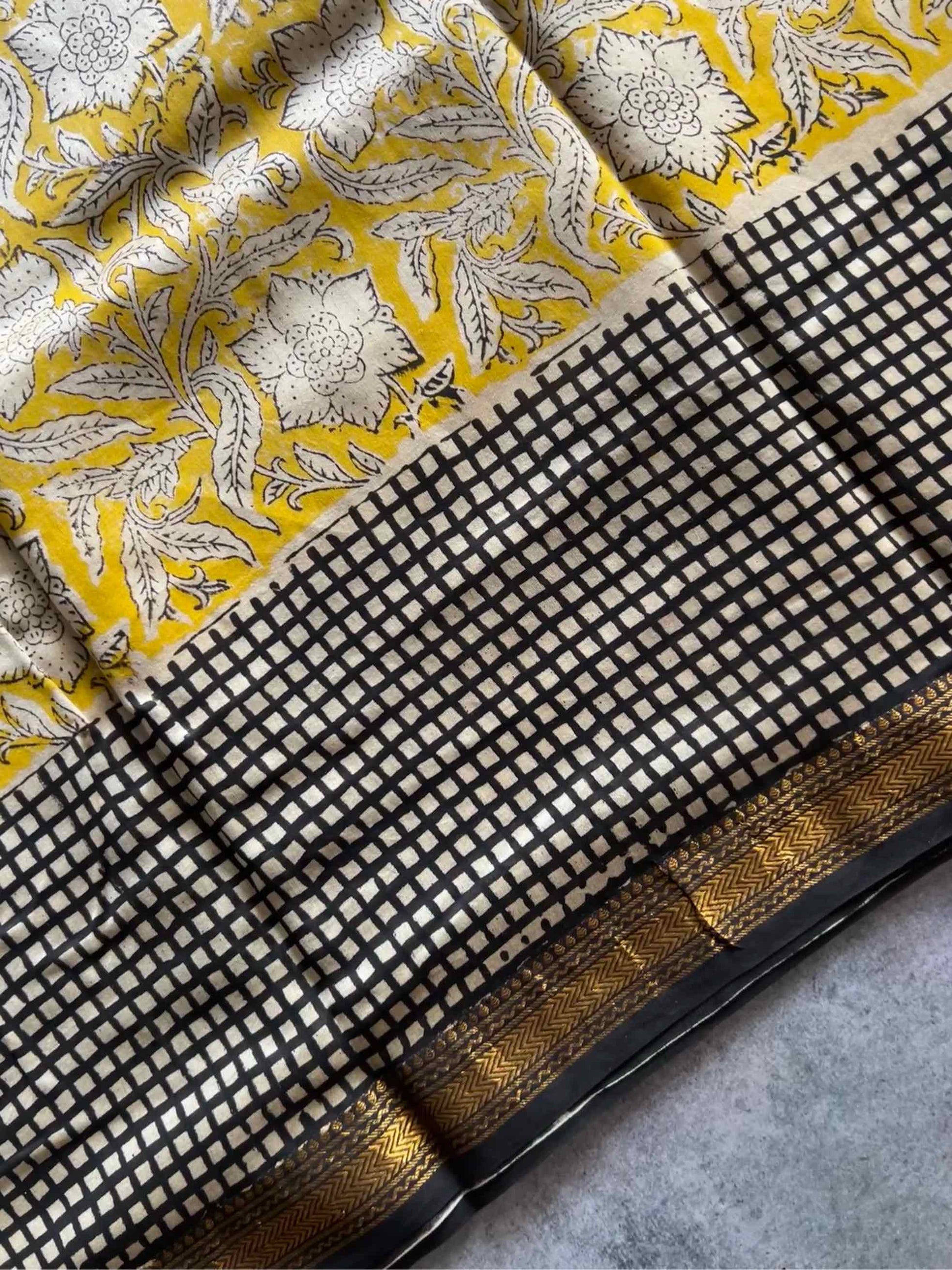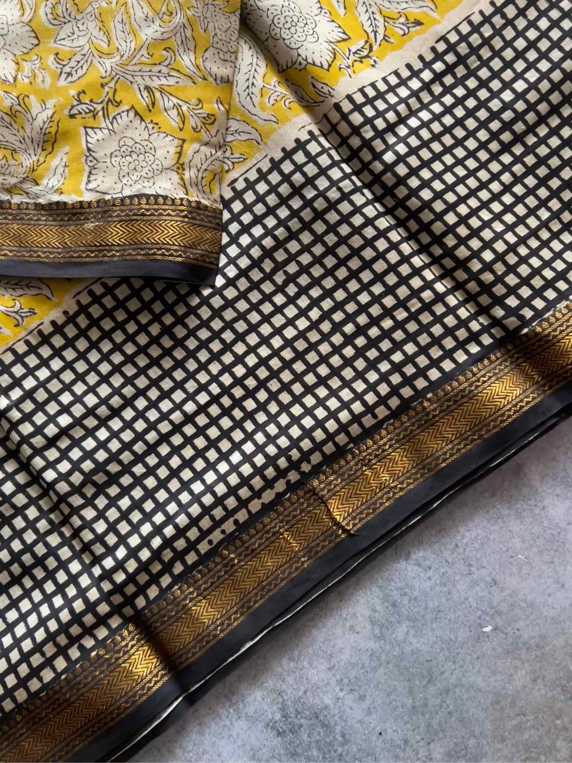 Elegant and classy handblock printed maheswari cotton silk saree. These exquisite pieces are very comfortable to wear and feels extremely soft and classy when draped.
