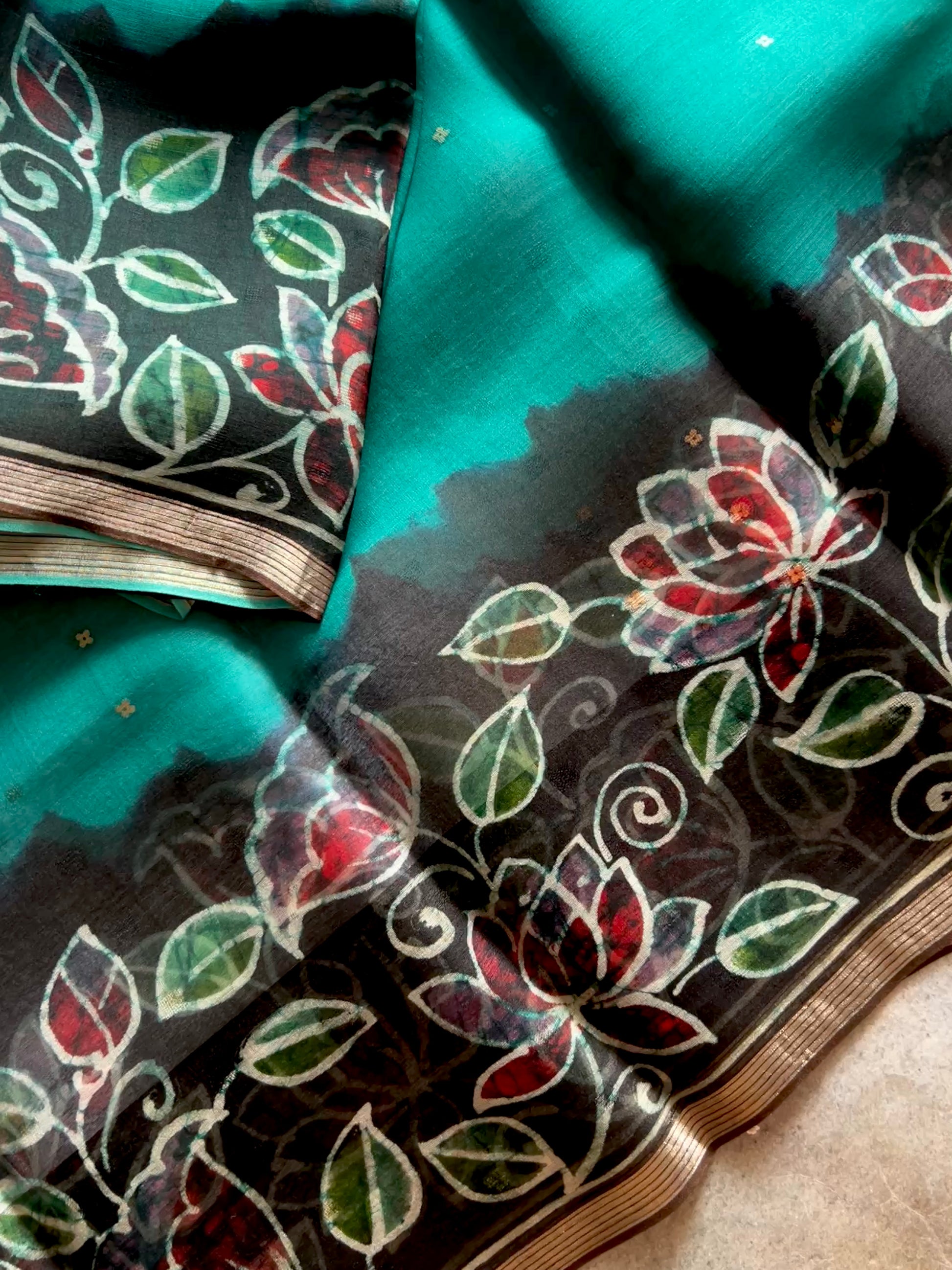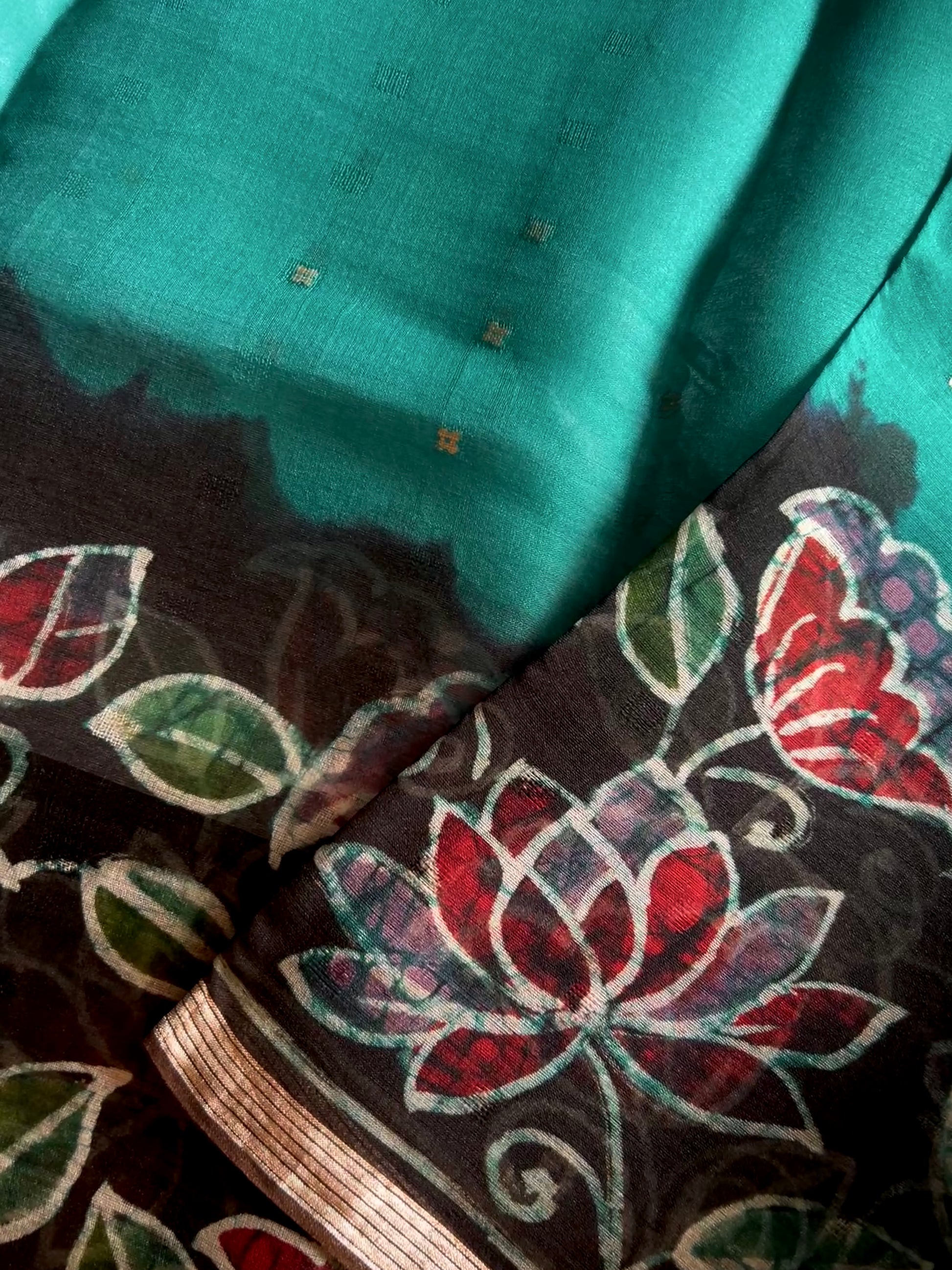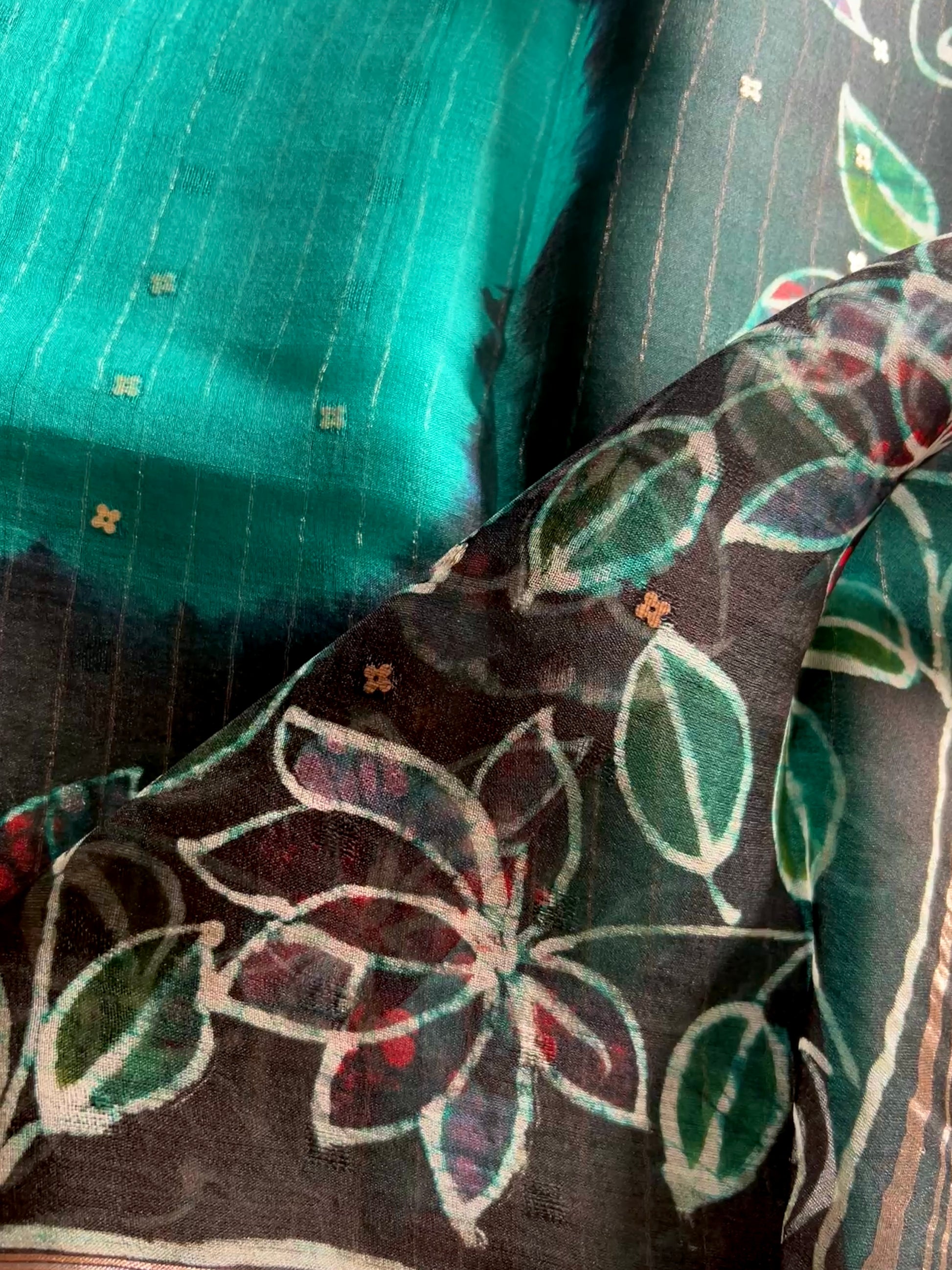 The sheer, airy texture of muslin silk offers a graceful drape, while the delicate shimmer of Gini work adds a subtle touch of luxury. The floral batik print brings a splash of artistry and tradition, creating a harmonious blend of handcrafted heritage and refined beauty. This saree is perfect for those who appreciate understated charm with a touch of cultural sophistication.