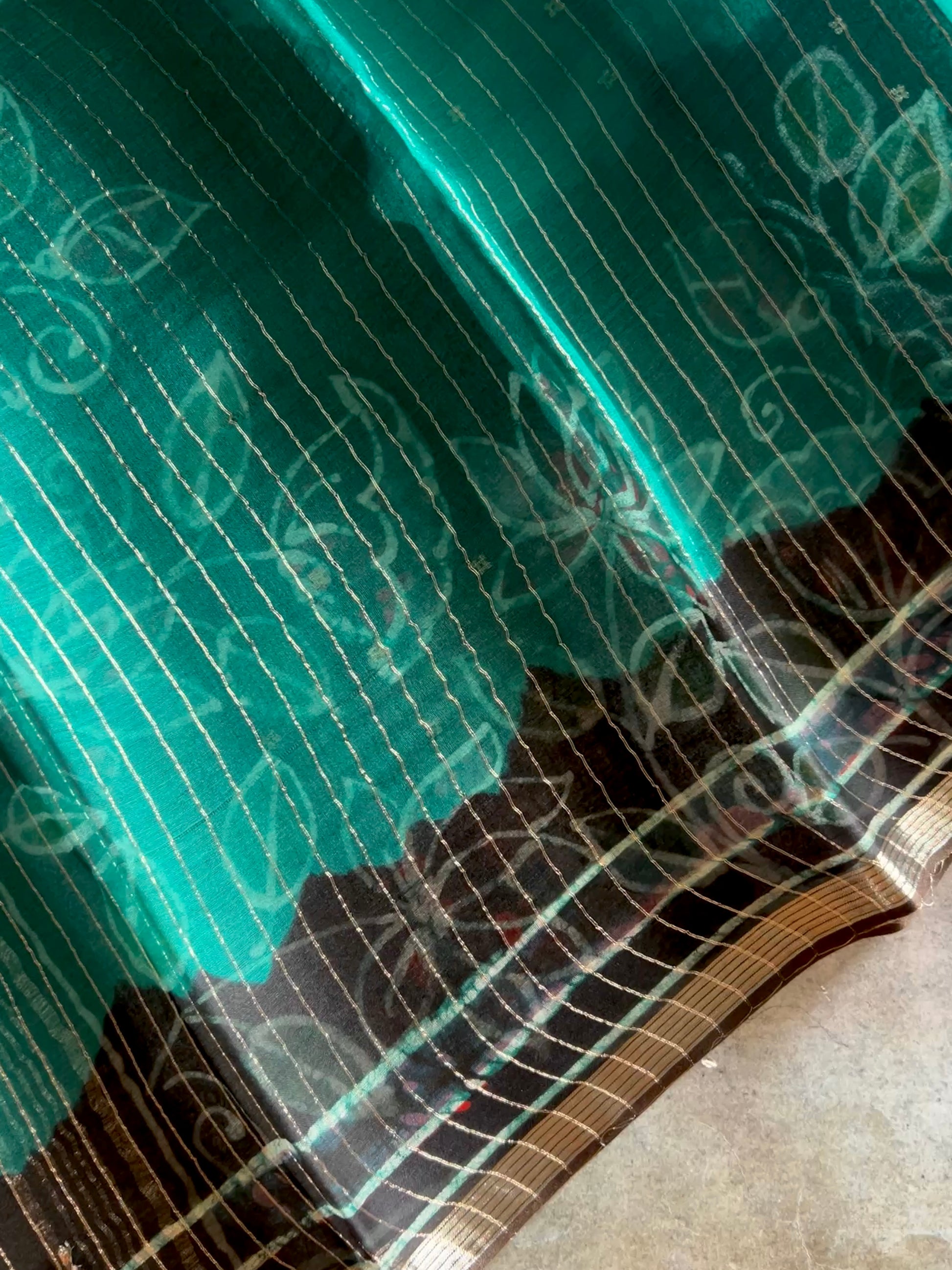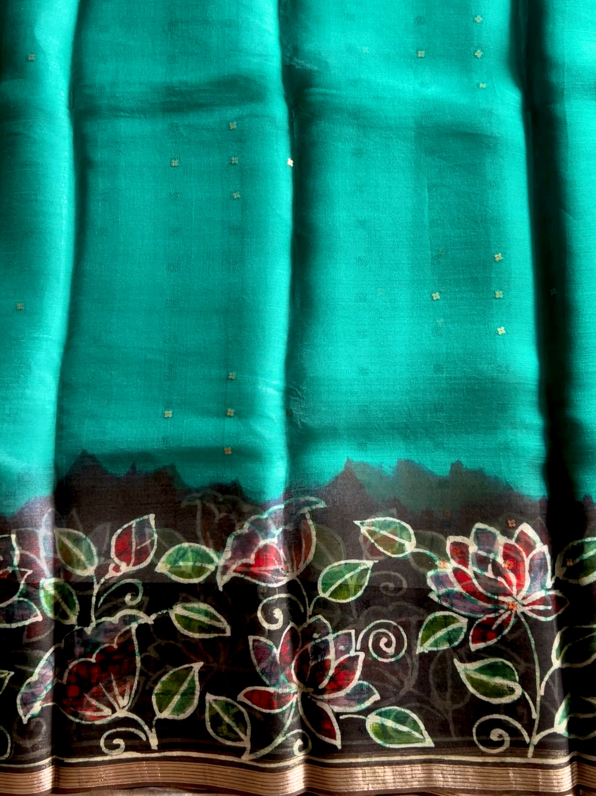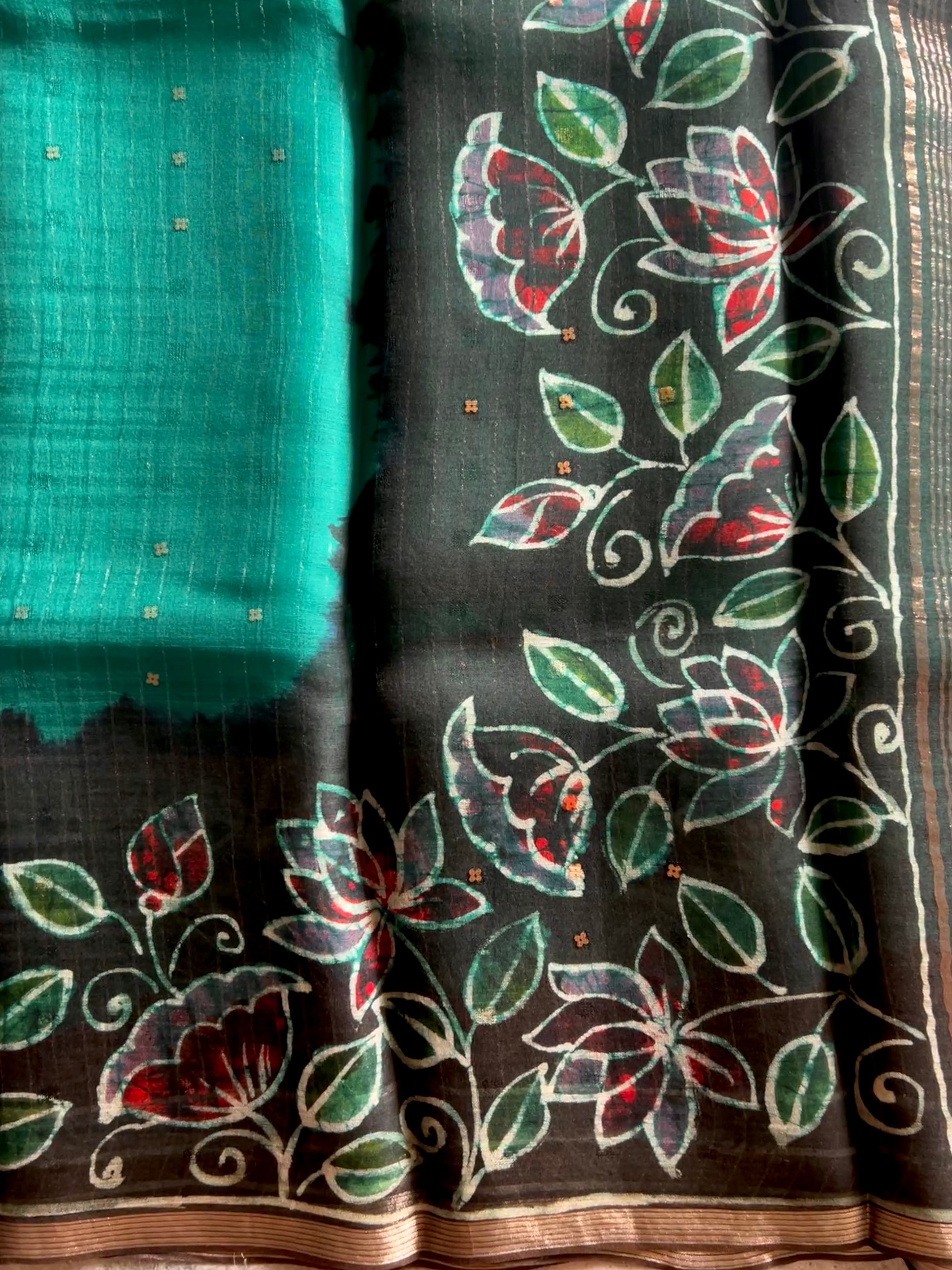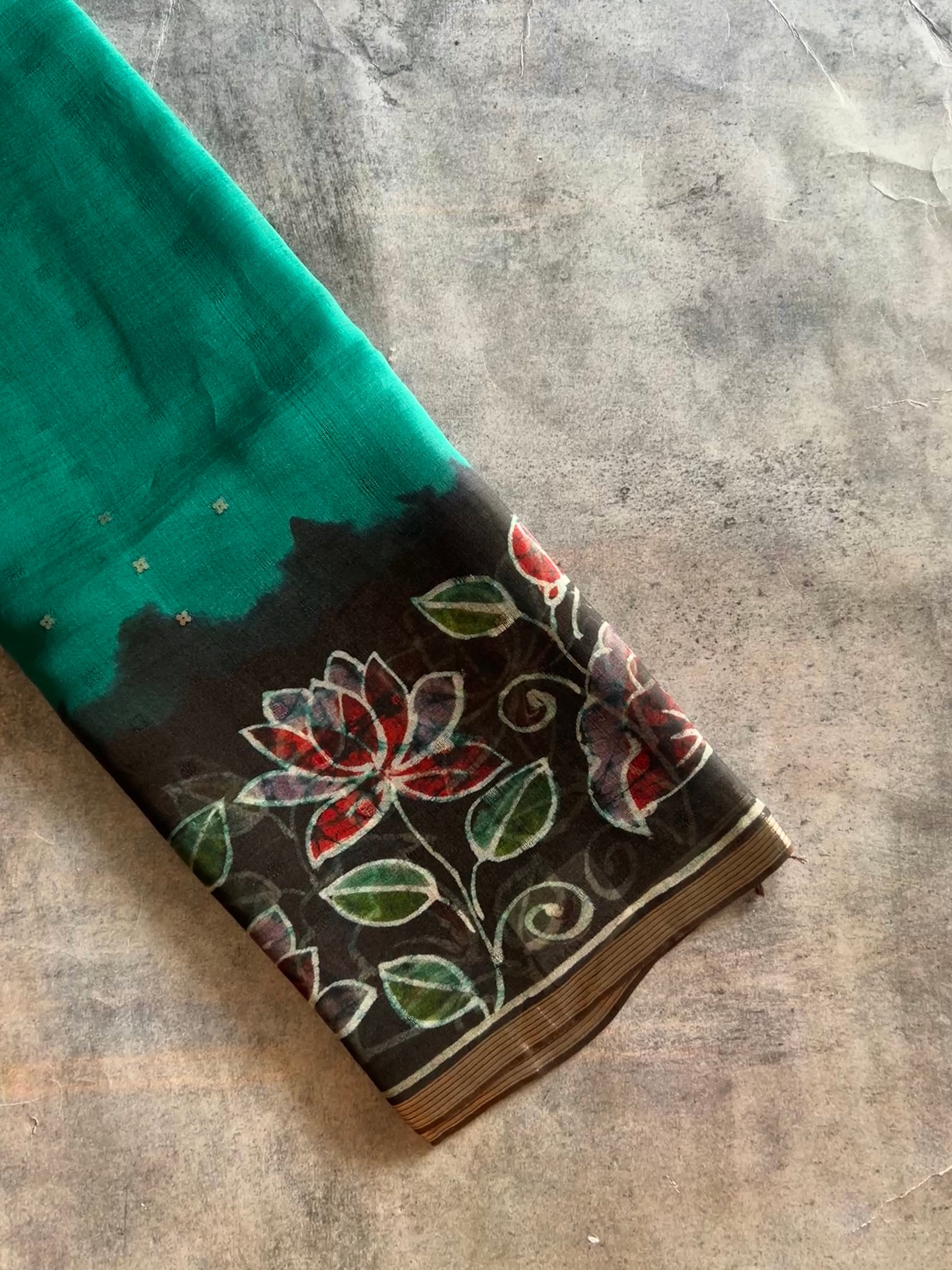 The sheer, airy texture of muslin silk offers a graceful drape, while the delicate shimmer of Gini work adds a subtle touch of luxury. The floral batik print brings a splash of artistry and tradition, creating a harmonious blend of handcrafted heritage and refined beauty. This saree is perfect for those who appreciate understated charm with a touch of cultural sophistication.