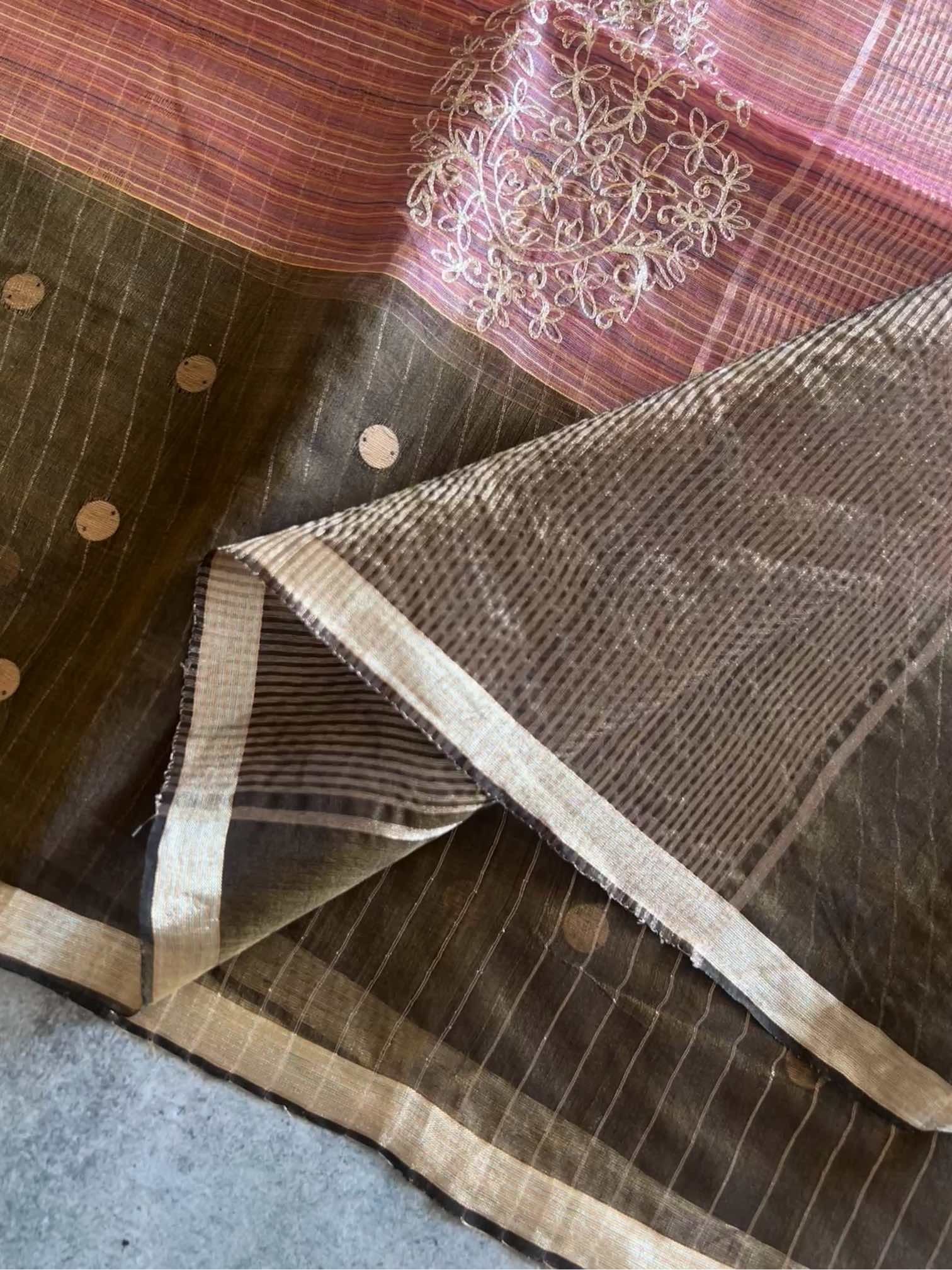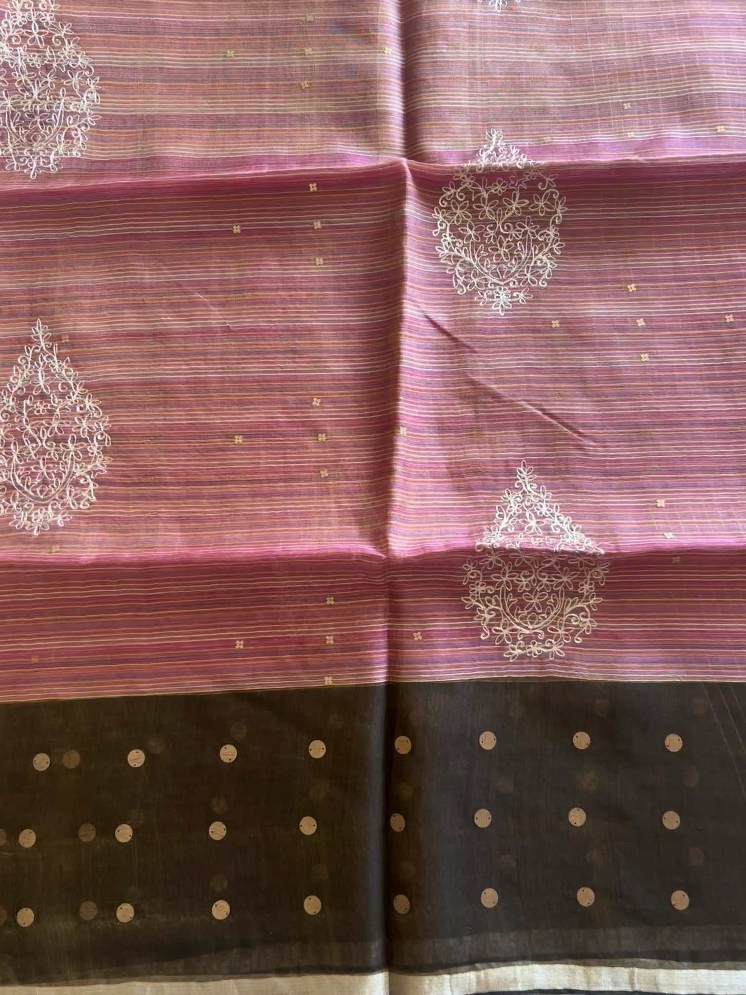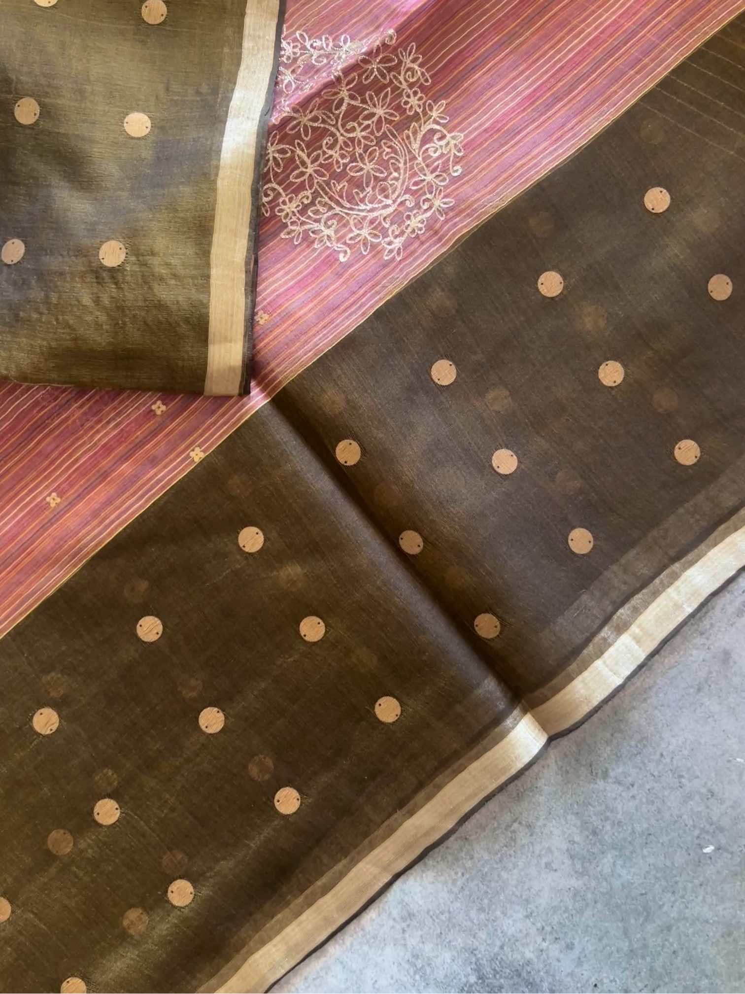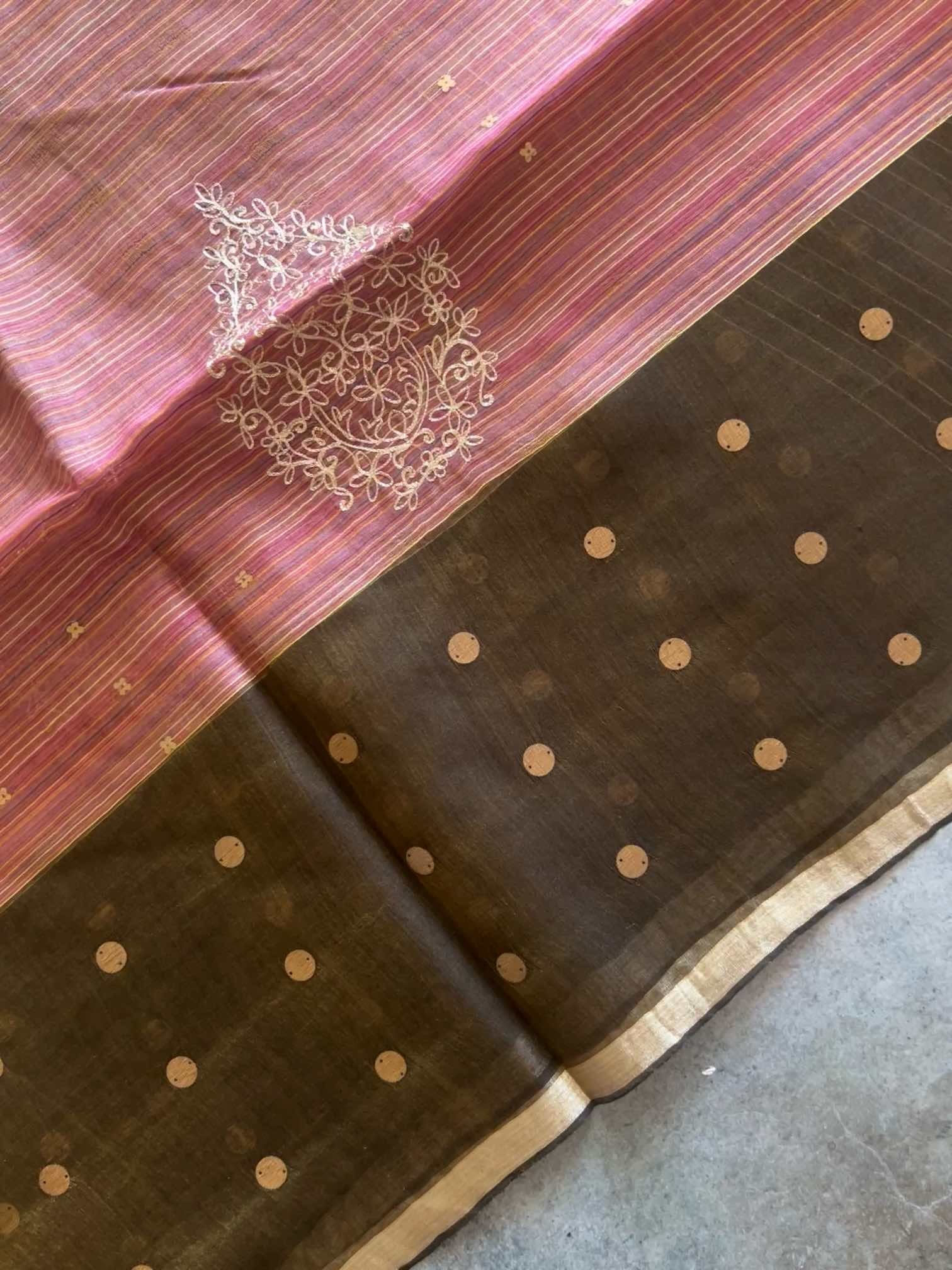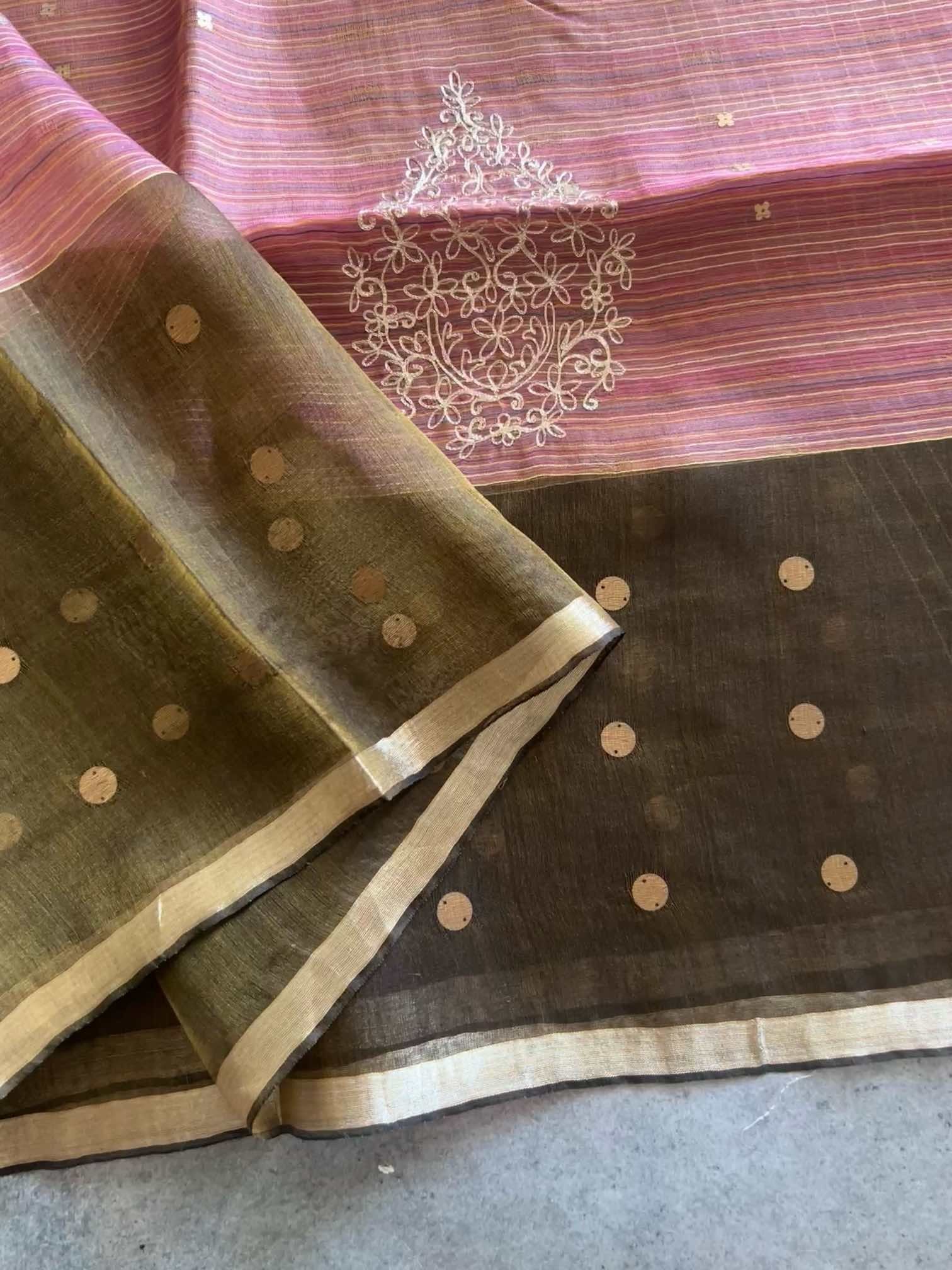 The Kora saree, renowned for its understated elegance, is crafted from a delicate, sheer fabric that exudes sophistication. Its translucent texture, often adorned with intricate embroidery or subtle embellishments, highlights a timeless grace. The saree's lightness and drape make it perfect for both traditional and contemporary occasions, allowing for a seamless blend of tradition and modernity.
