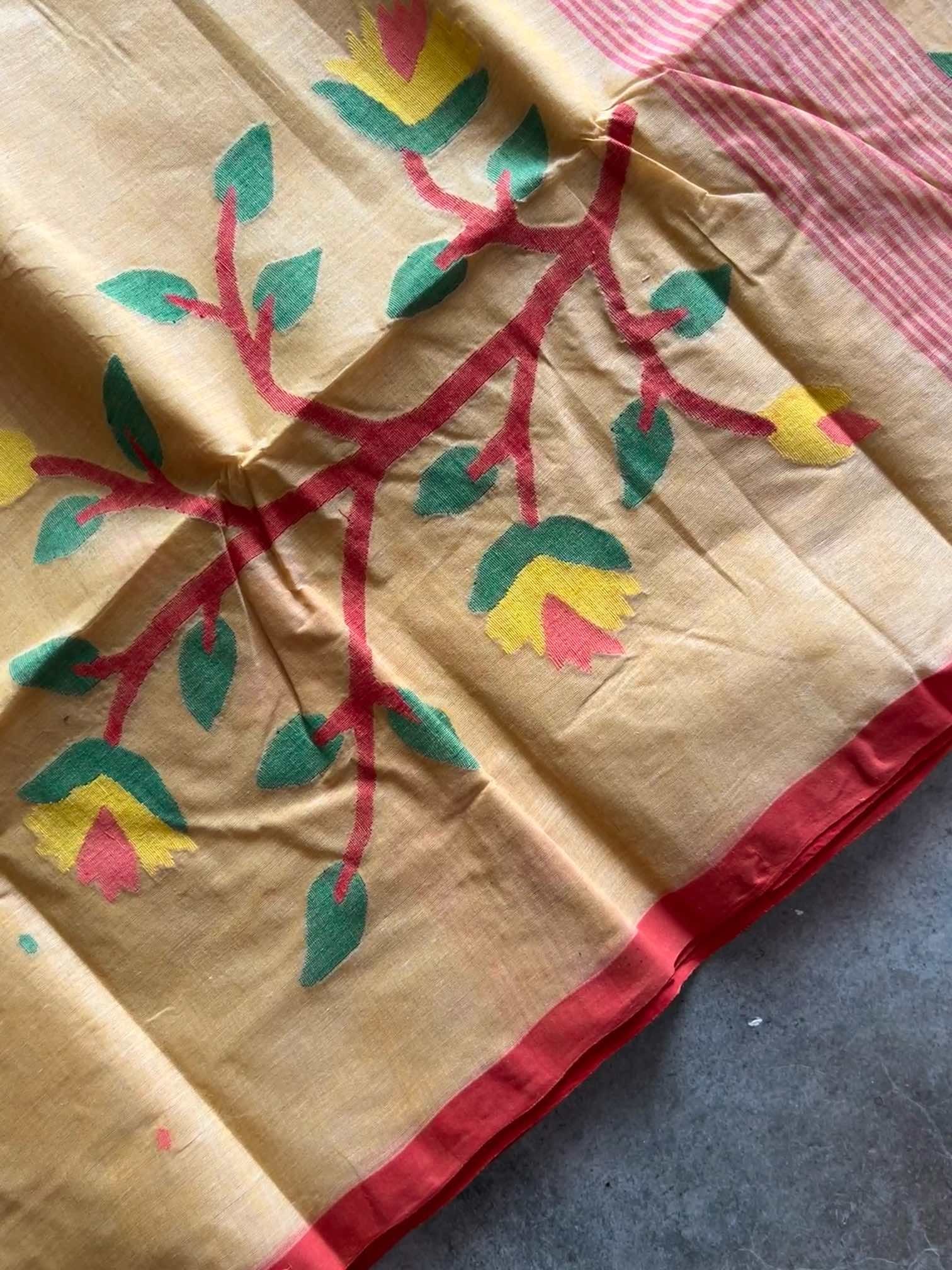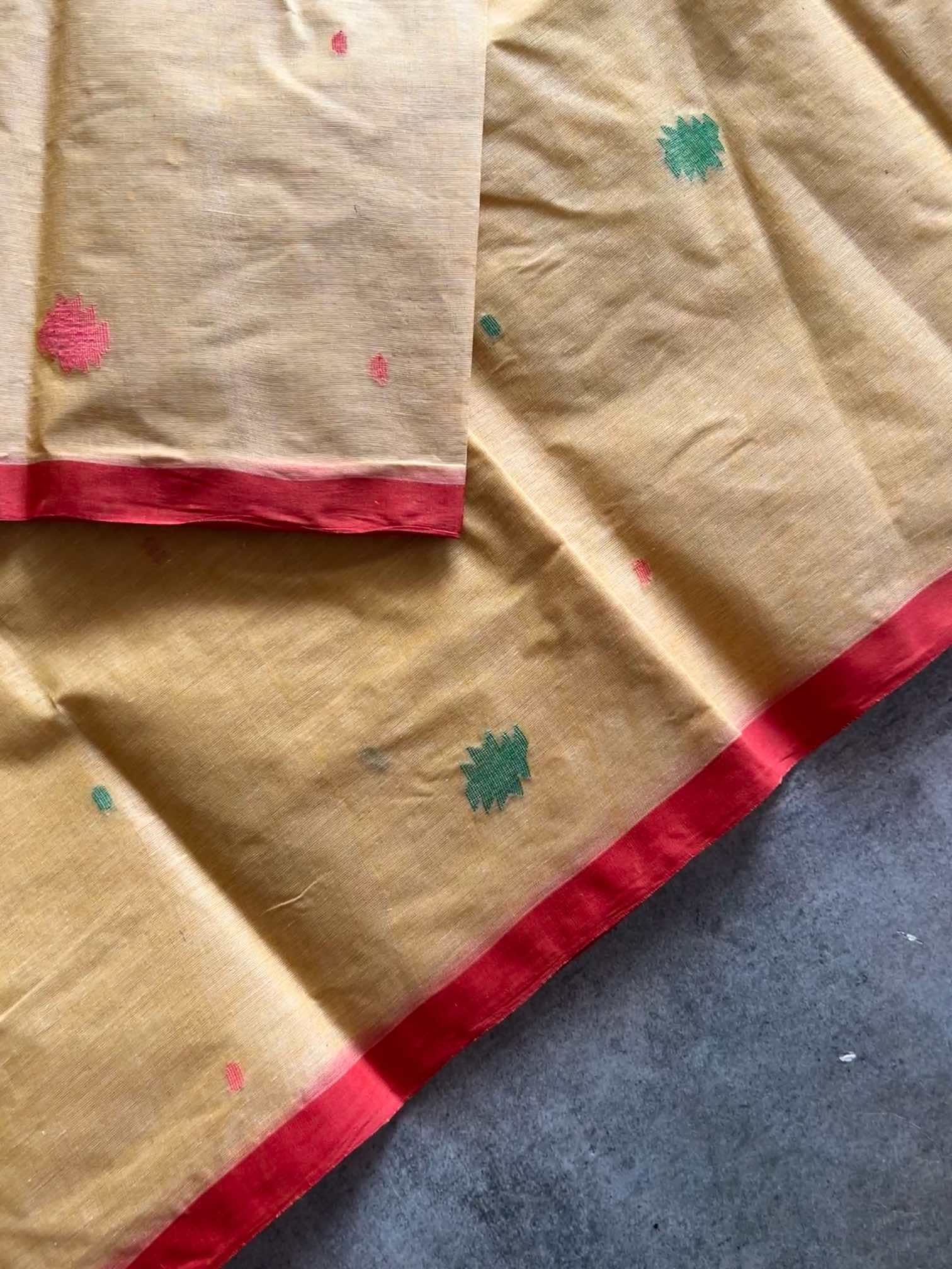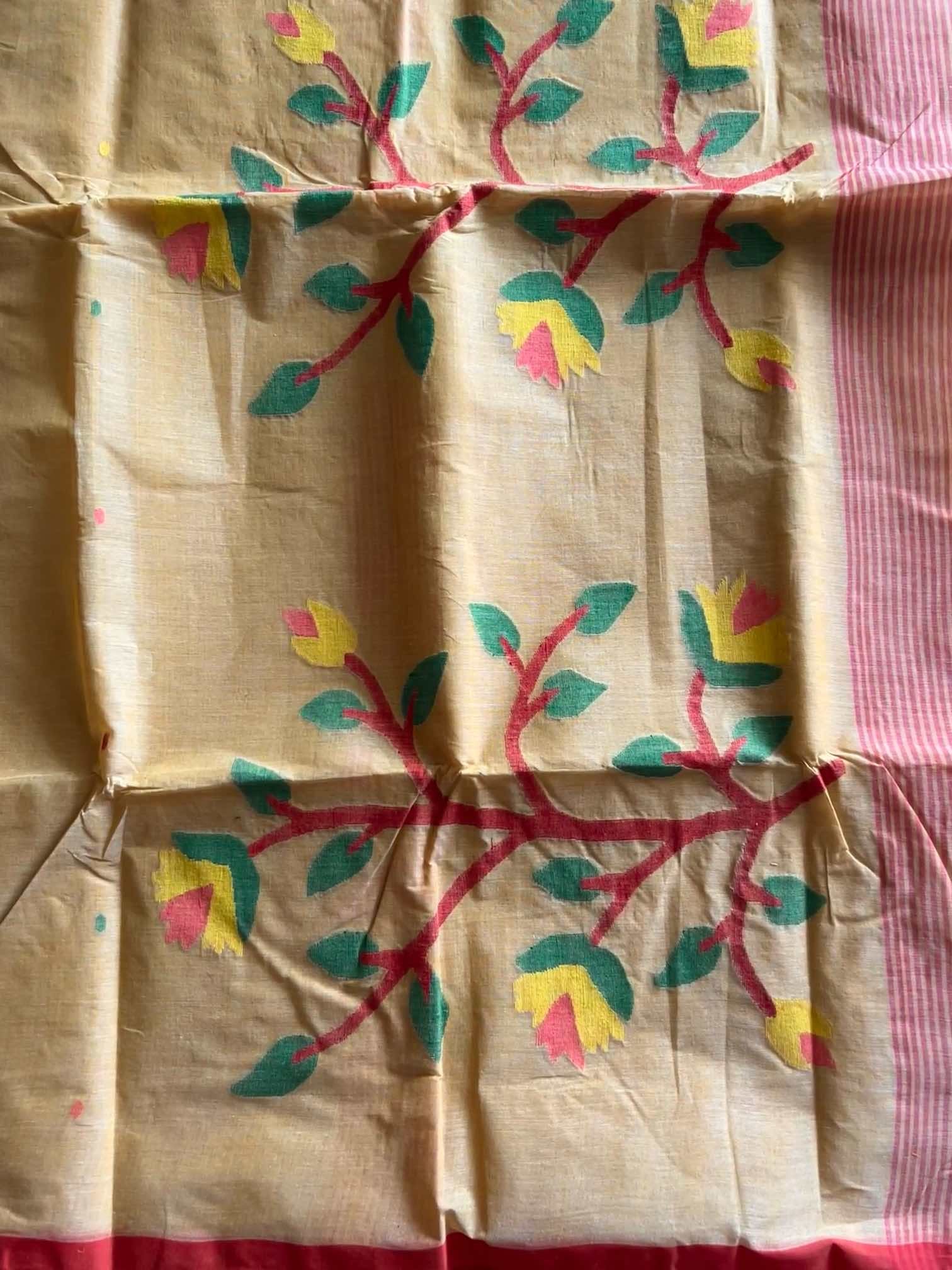 Handloom Bengal cotton sarees with Jamdani work are a beautiful fusion of craftsmanship and tradition. Each saree is an art piece, with the Jamdani motifs—ranging from floral to geometric patterns—woven into the fabric using the finest cotton threads. The handloom process ensures every saree is unique, with slight variations that speak to the skill and dedication of the weavers. The gentle drape, coupled with the elegance of the intricate Jamdani work, gives these sarees an understated yet timeless beauty, making them a favorite for both everyday wear and special occasions.