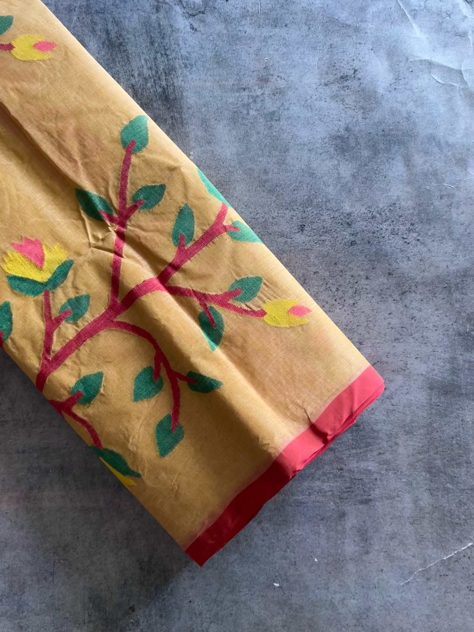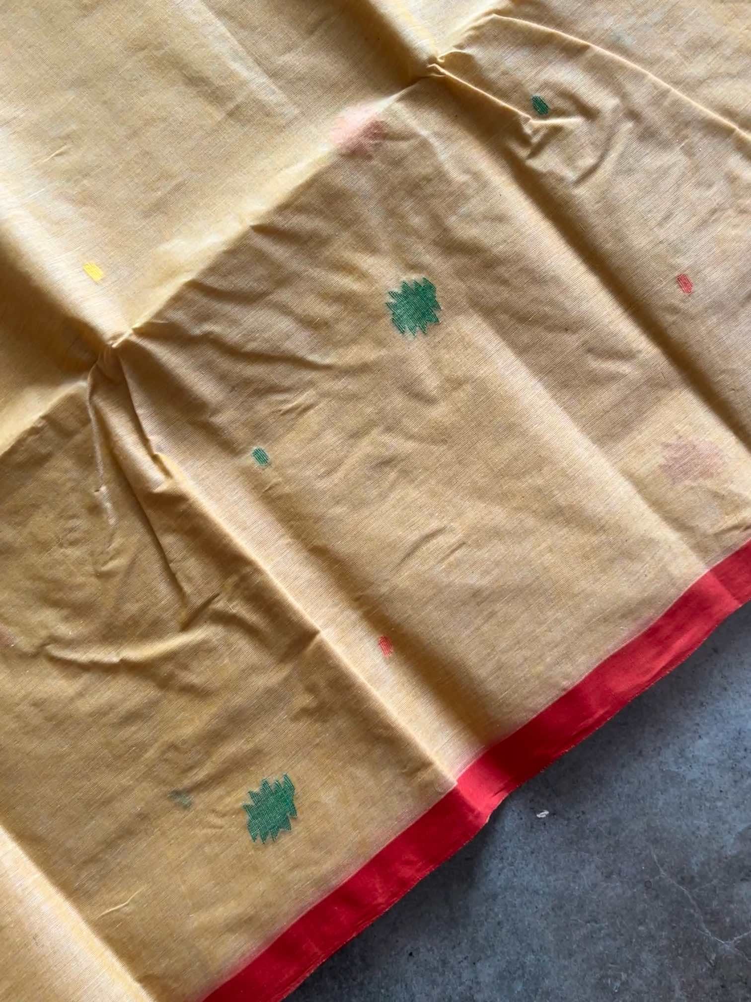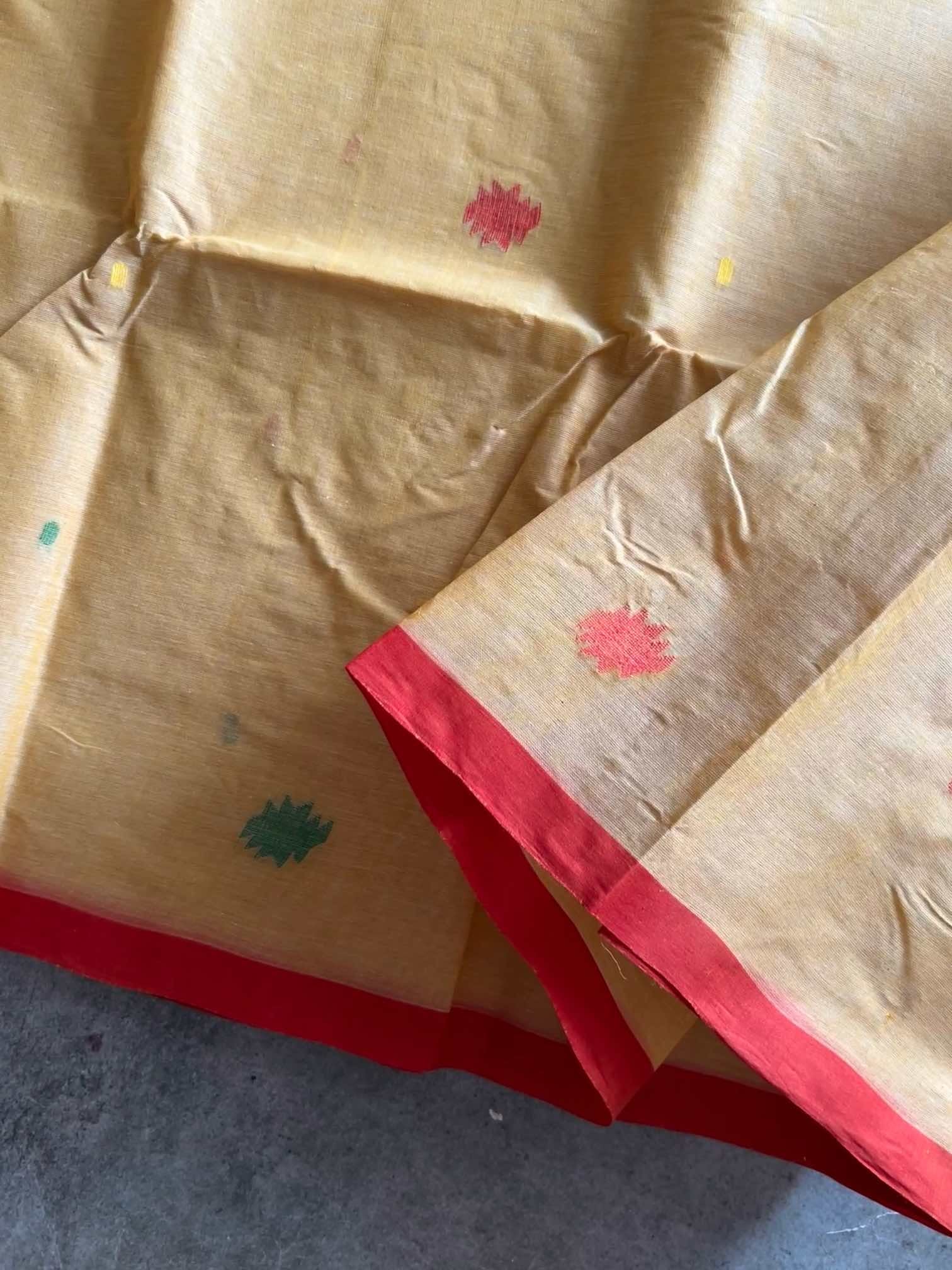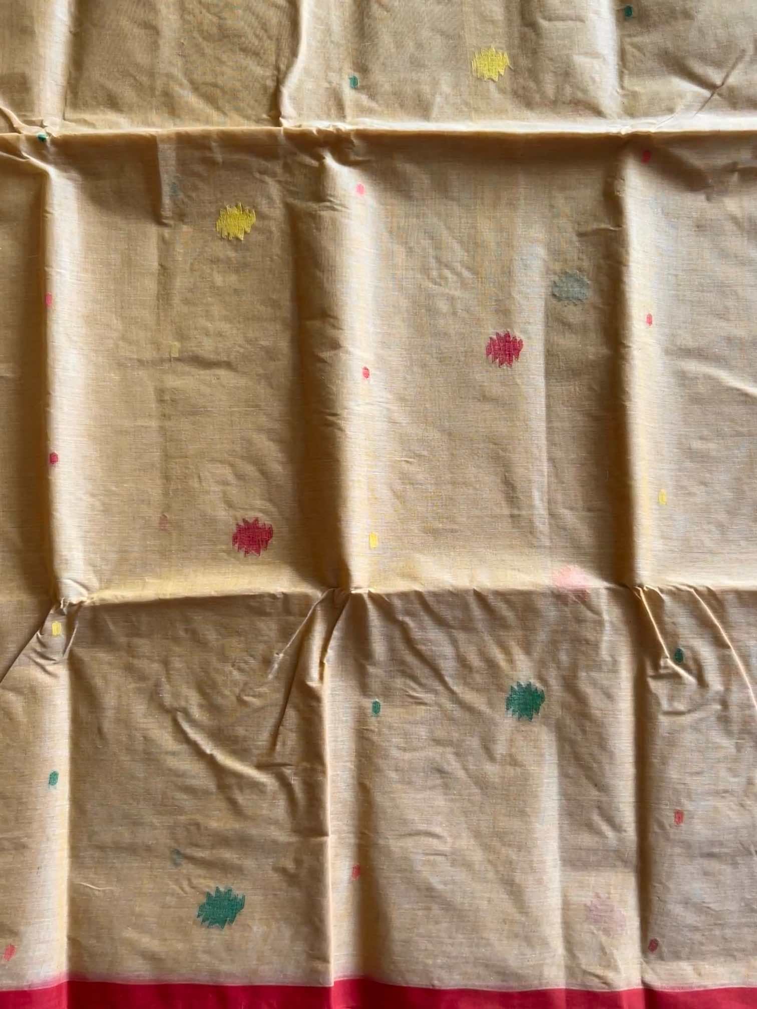 Handloom Bengal cotton sarees with Jamdani work are a beautiful fusion of craftsmanship and tradition. Each saree is an art piece, with the Jamdani motifs—ranging from floral to geometric patterns—woven into the fabric using the finest cotton threads. The handloom process ensures every saree is unique, with slight variations that speak to the skill and dedication of the weavers. The gentle drape, coupled with the elegance of the intricate Jamdani work, gives these sarees an understated yet timeless beauty, making them a favorite for both everyday wear and special occasions.