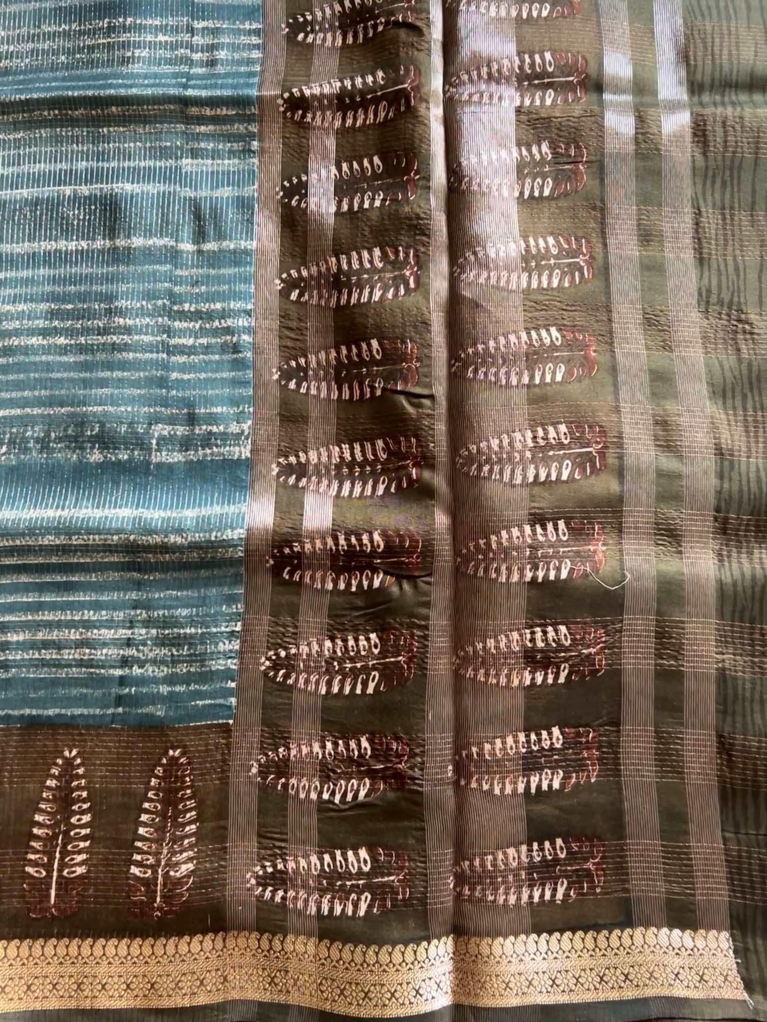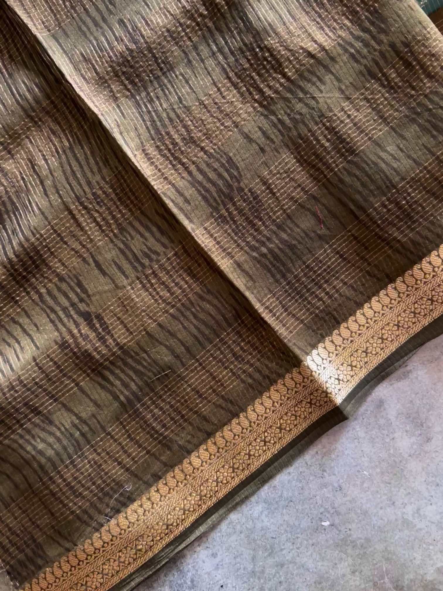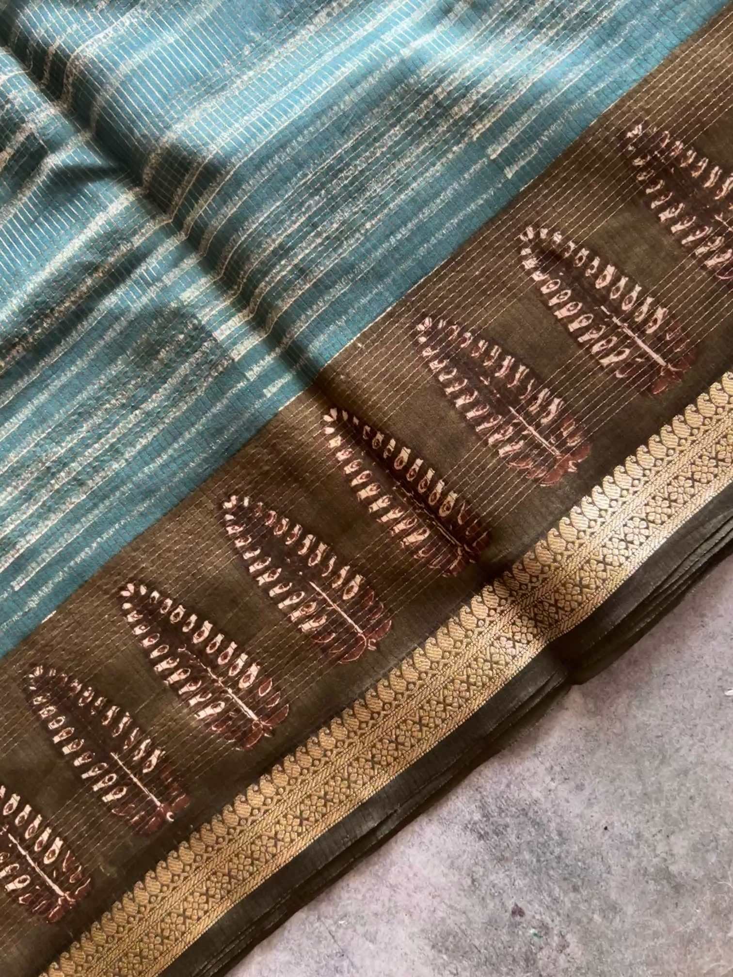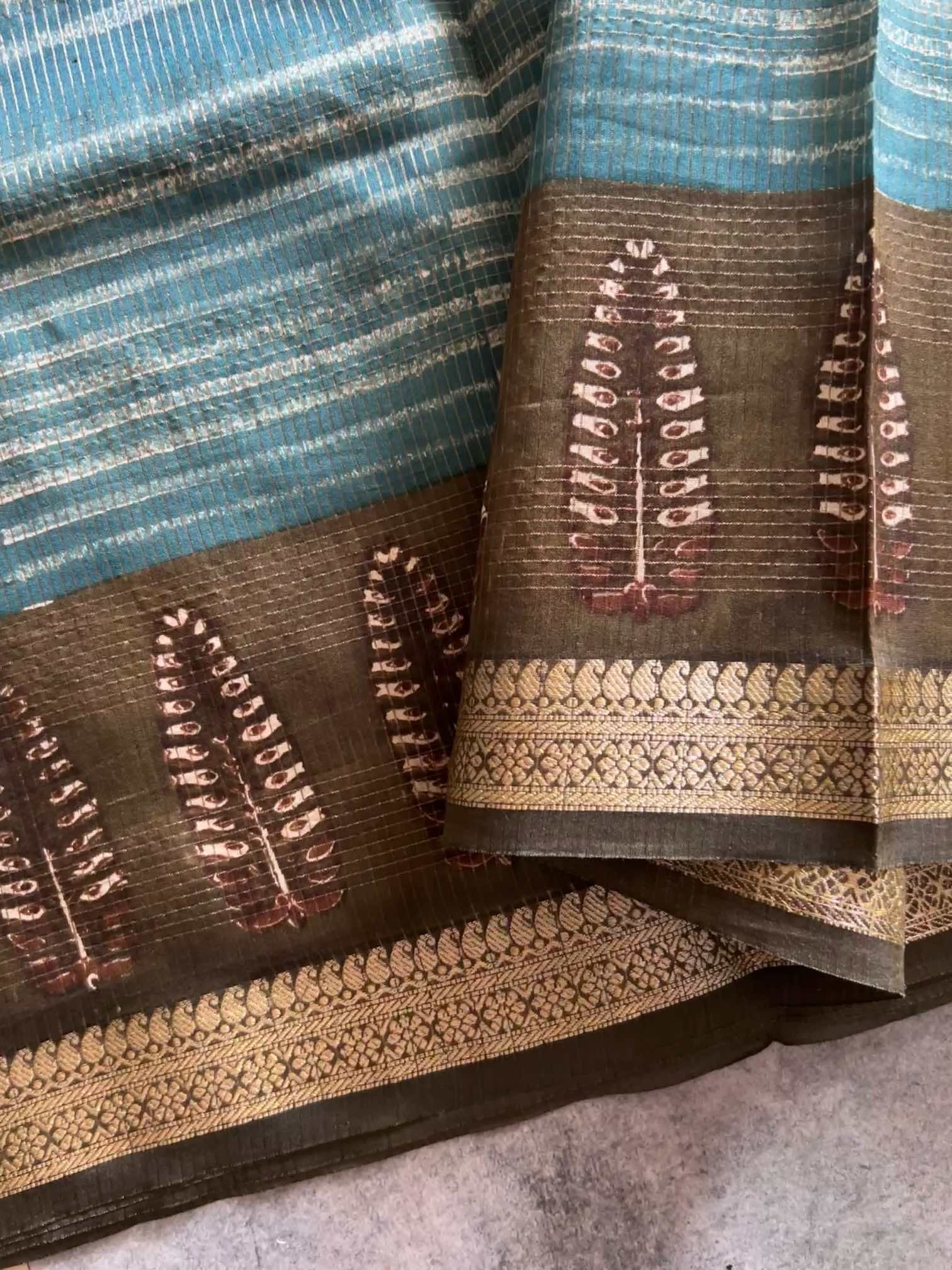 Elegant Chanderi fancy saree featuring all-over stripes and prints, highlighted with a rich zari border and graceful zari pallu. Paired with a plain blouse, it offers a perfect blend of tradition and contemporary charm.