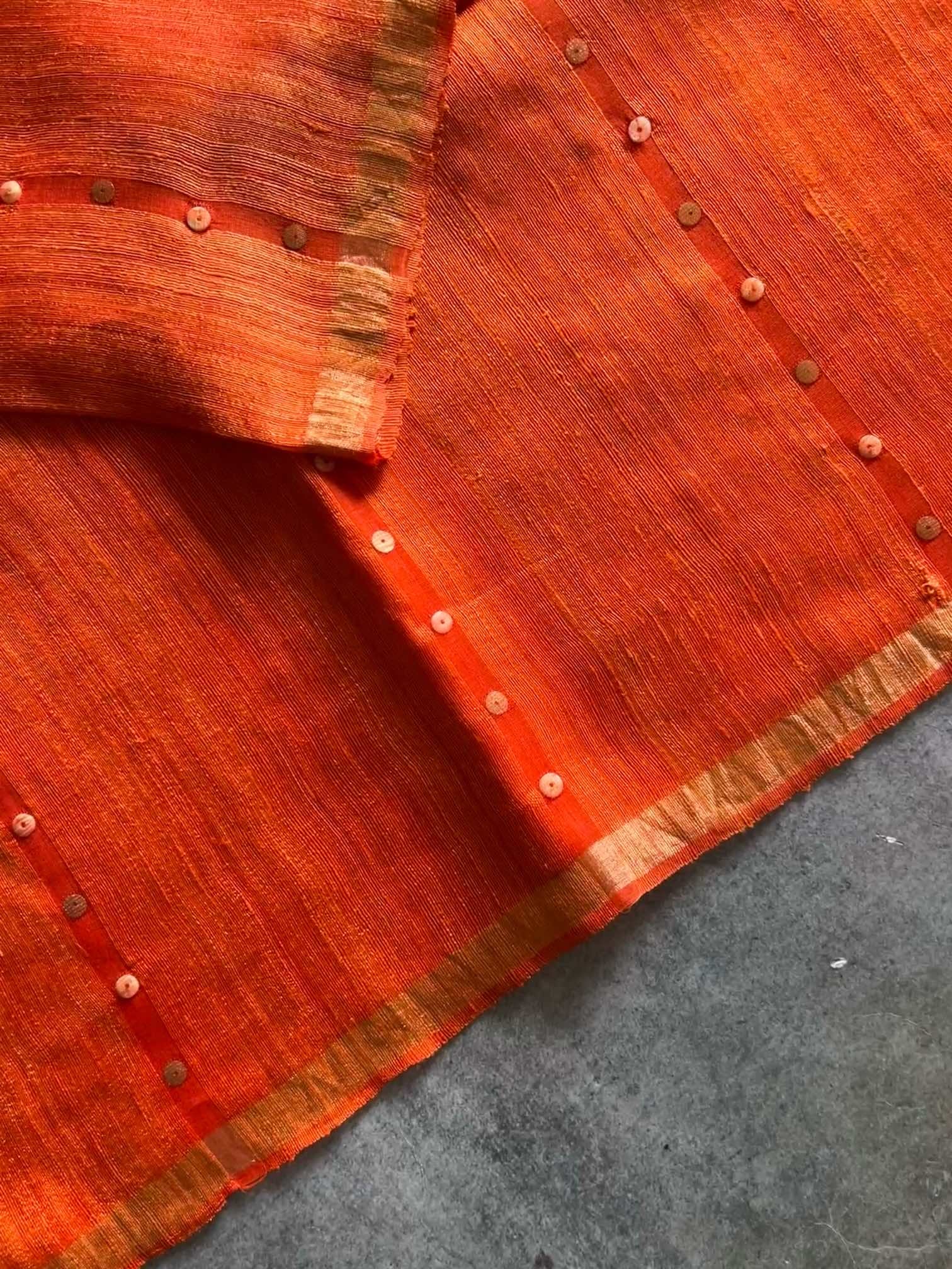 A matka silk saree with muslin vertical stripes flows with quiet elegance—its textured silk lending earthy richness, while the airy muslin stripes add a soft, graceful rhythm. The delicate button motifs woven along the stripes feel like tiny jewels, subtle yet distinctive. Completing the saree, the Paithani pallu brings a burst of regal heritage, its intricate craftsmanship and luminous colors creating a striking contrast that elevates the drape into timeless beauty.