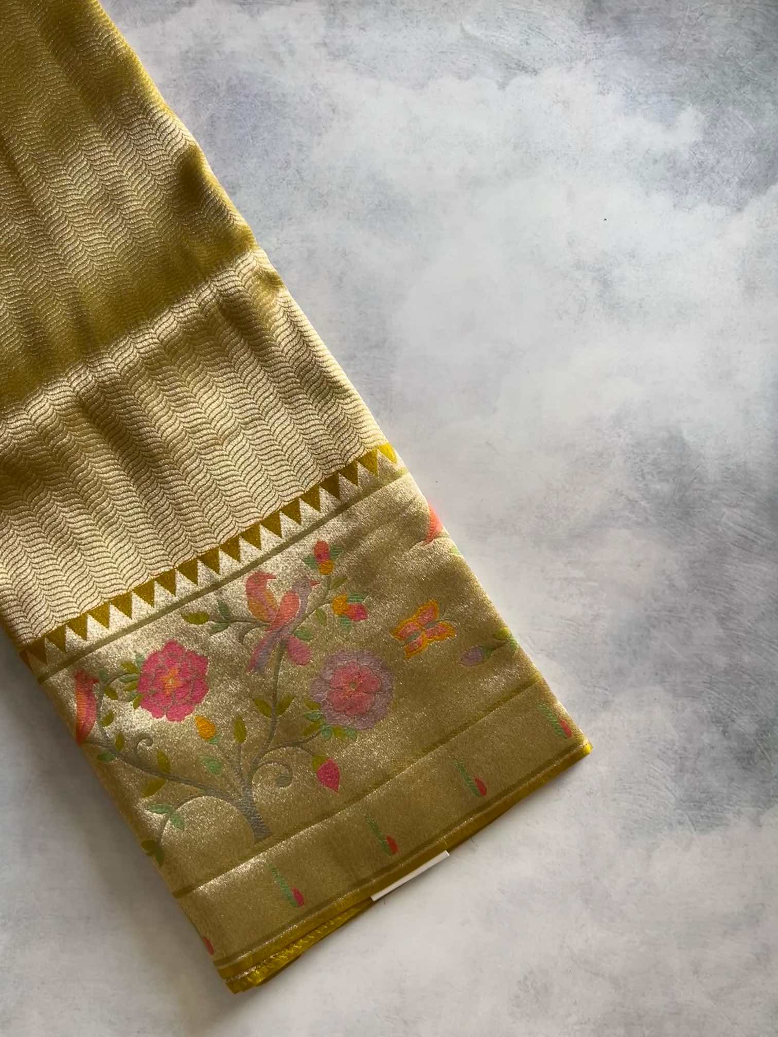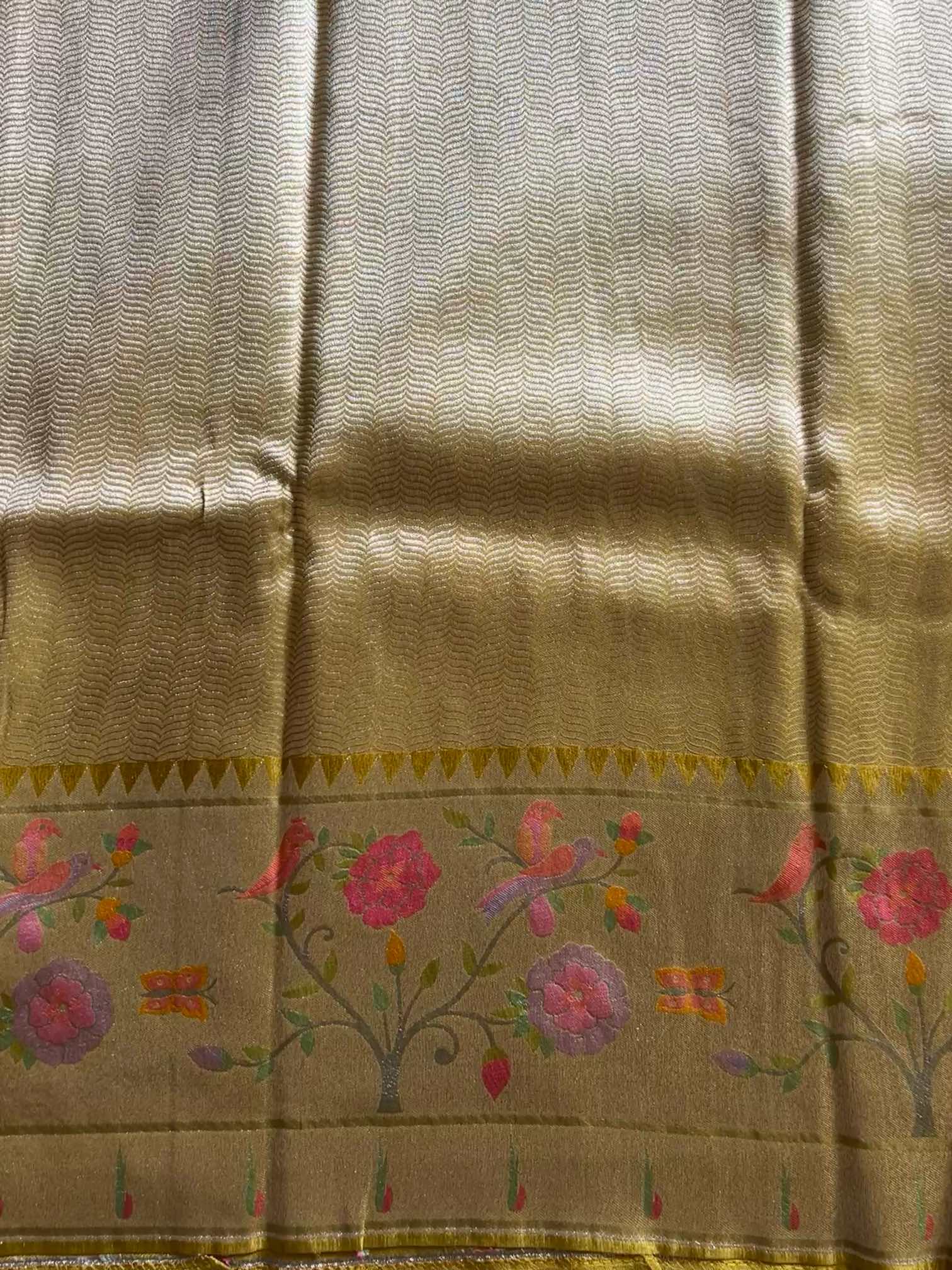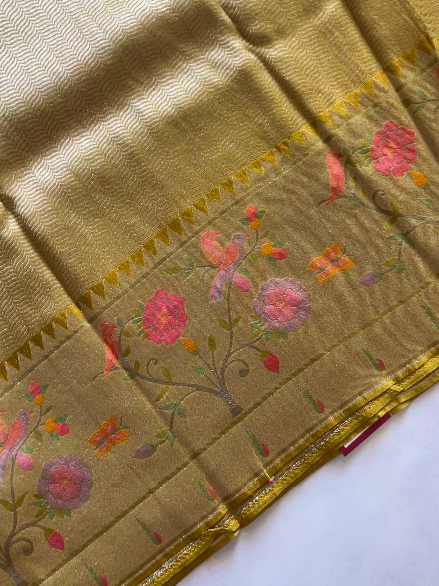 A brocade crepe tissue silk saree with a Paithani border is pure elegance. Its soft, shimmering fabric drapes beautifully, while the intricate brocade adds a rich, graceful charm. The Paithani border—rooted in the heritage of Paithan—brings timeless artistry with its vibrant zari motifs. A perfect blend of tradition and sophistication. ✨