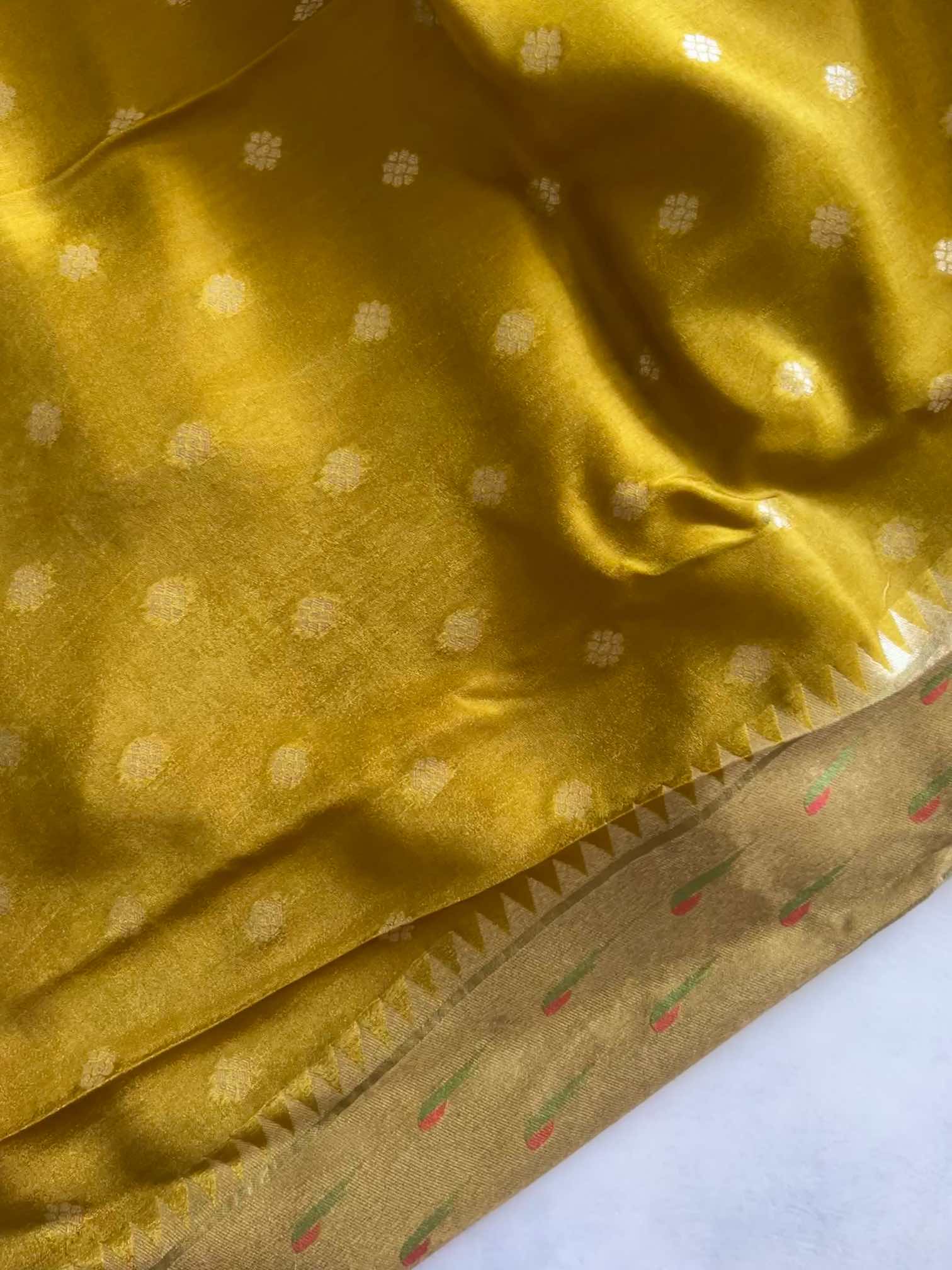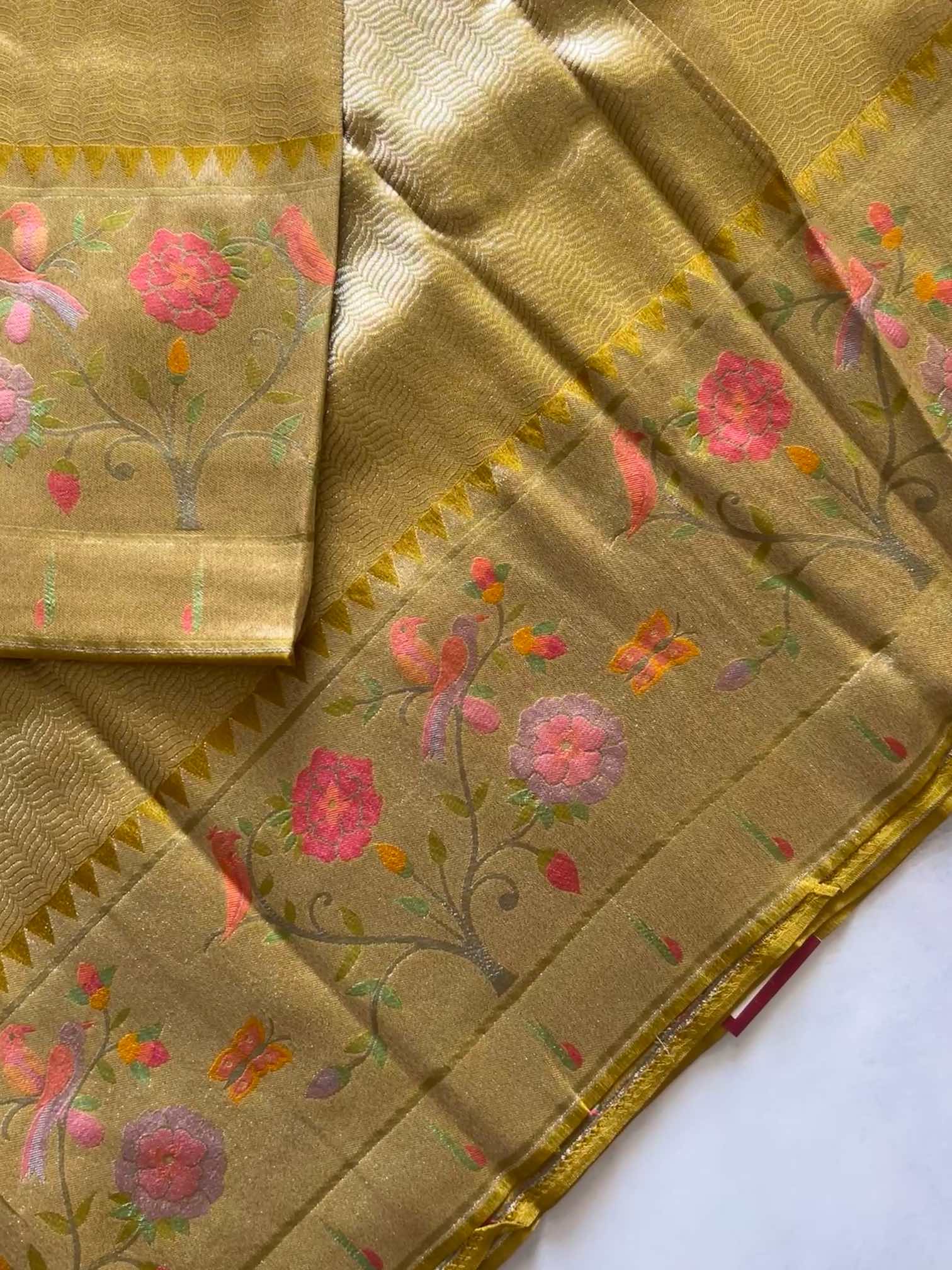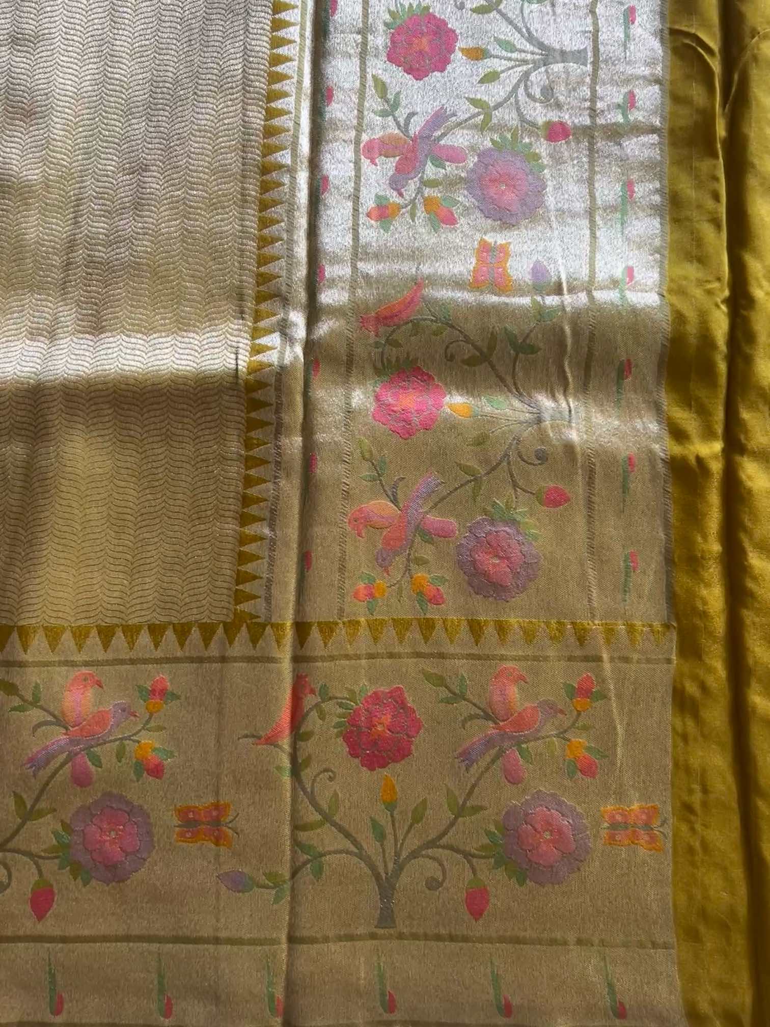 A brocade crepe tissue silk saree with a Paithani border is pure elegance. Its soft, shimmering fabric drapes beautifully, while the intricate brocade adds a rich, graceful charm. The Paithani border—rooted in the heritage of Paithan—brings timeless artistry with its vibrant zari motifs. A perfect blend of tradition and sophistication. ✨