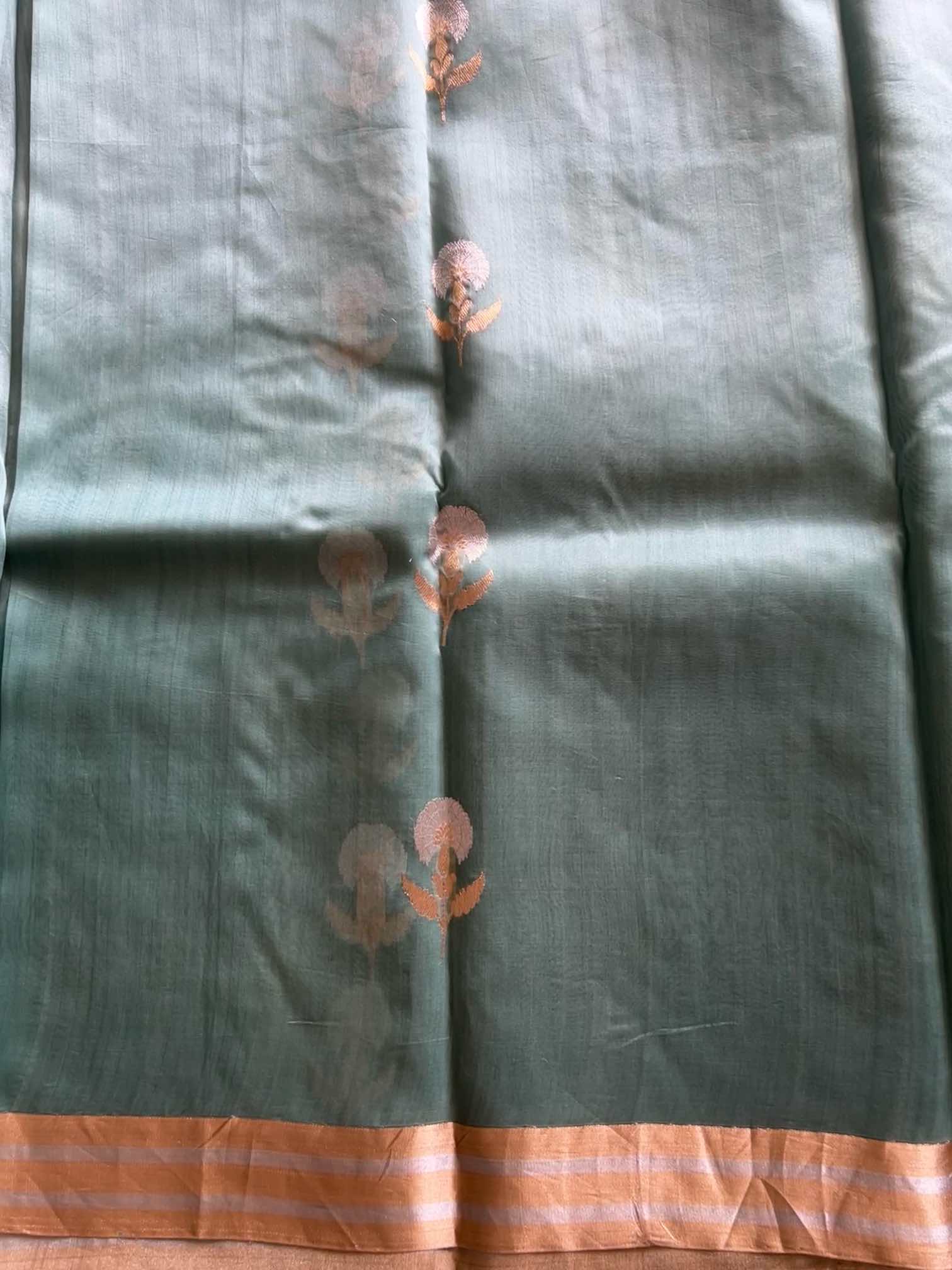 Pure Kora Banarasi silk saree with zari buttas is sheer elegance woven in light. Its delicate transparency, soft golden sheen, and finely scattered zari motifs create a look that’s graceful, timeless, and quietly regal—luxury that whispers rather than shouts. ✨