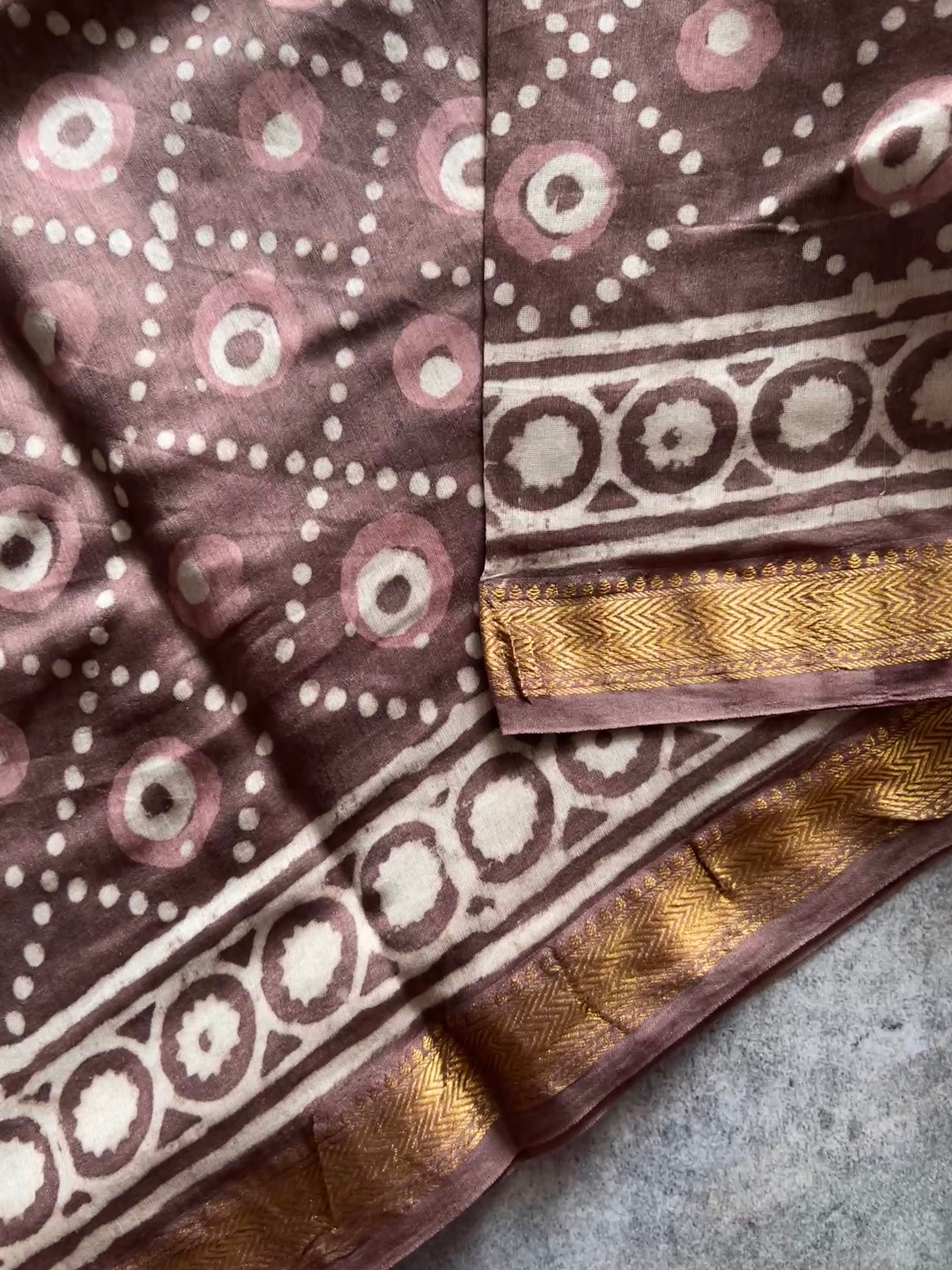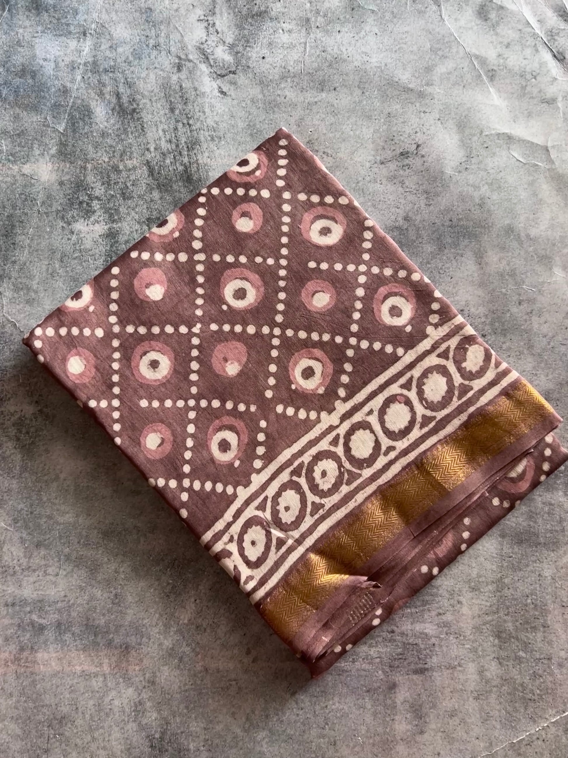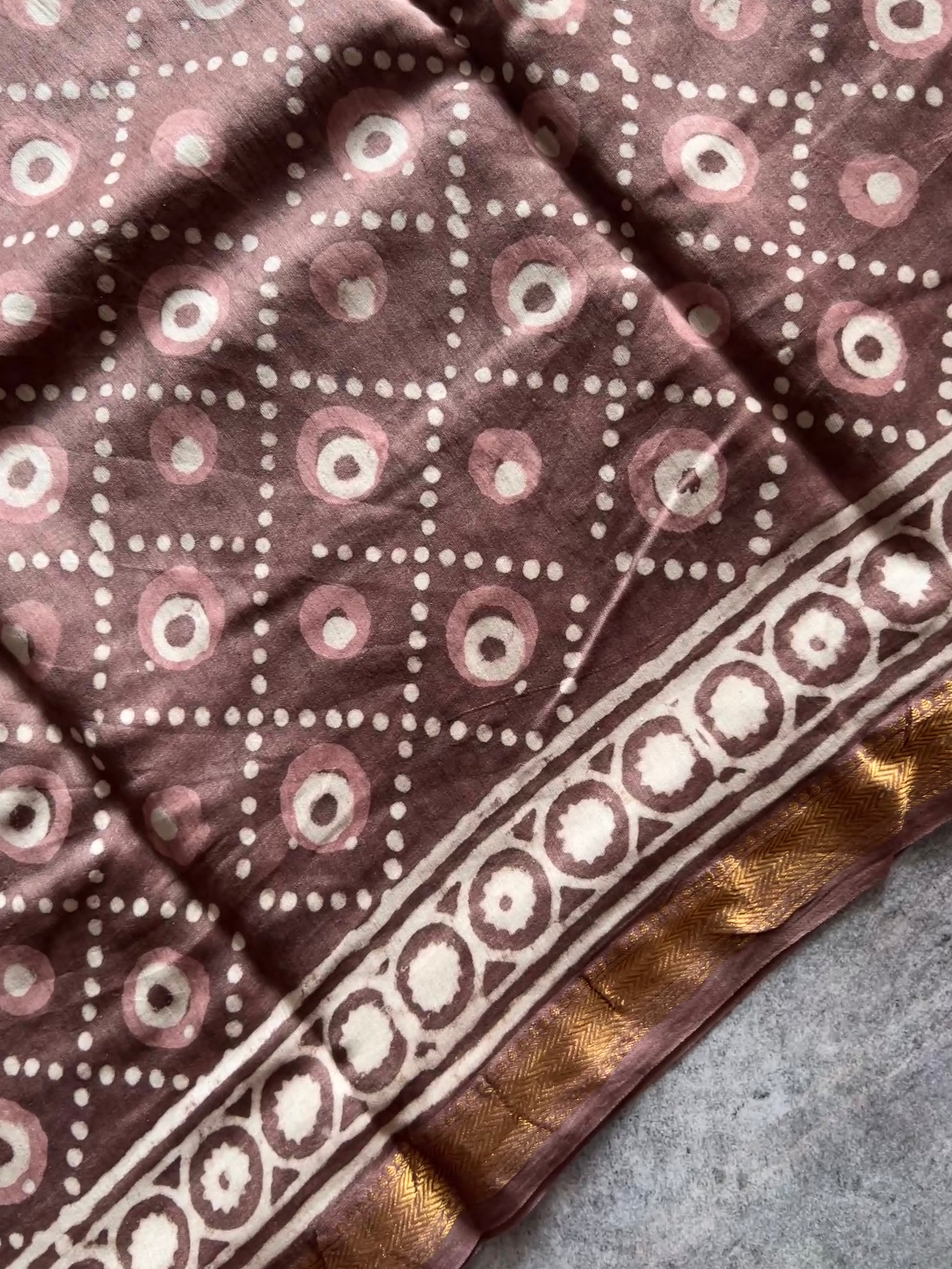 Elegant and classy handblock printed maheswari cotton silk saree. These exquisite pieces are very comfortable to wear and feels extremely soft and classy when draped.