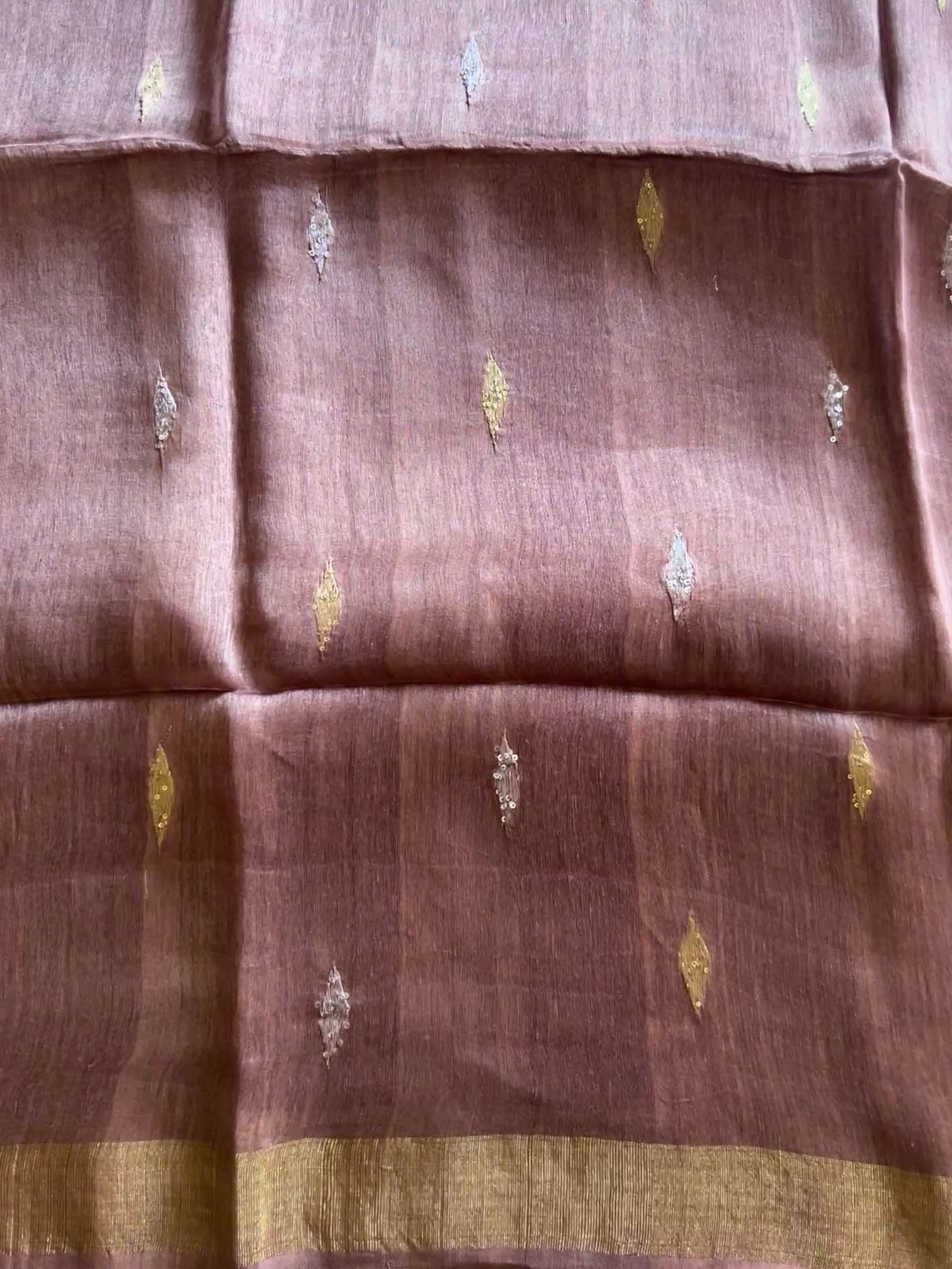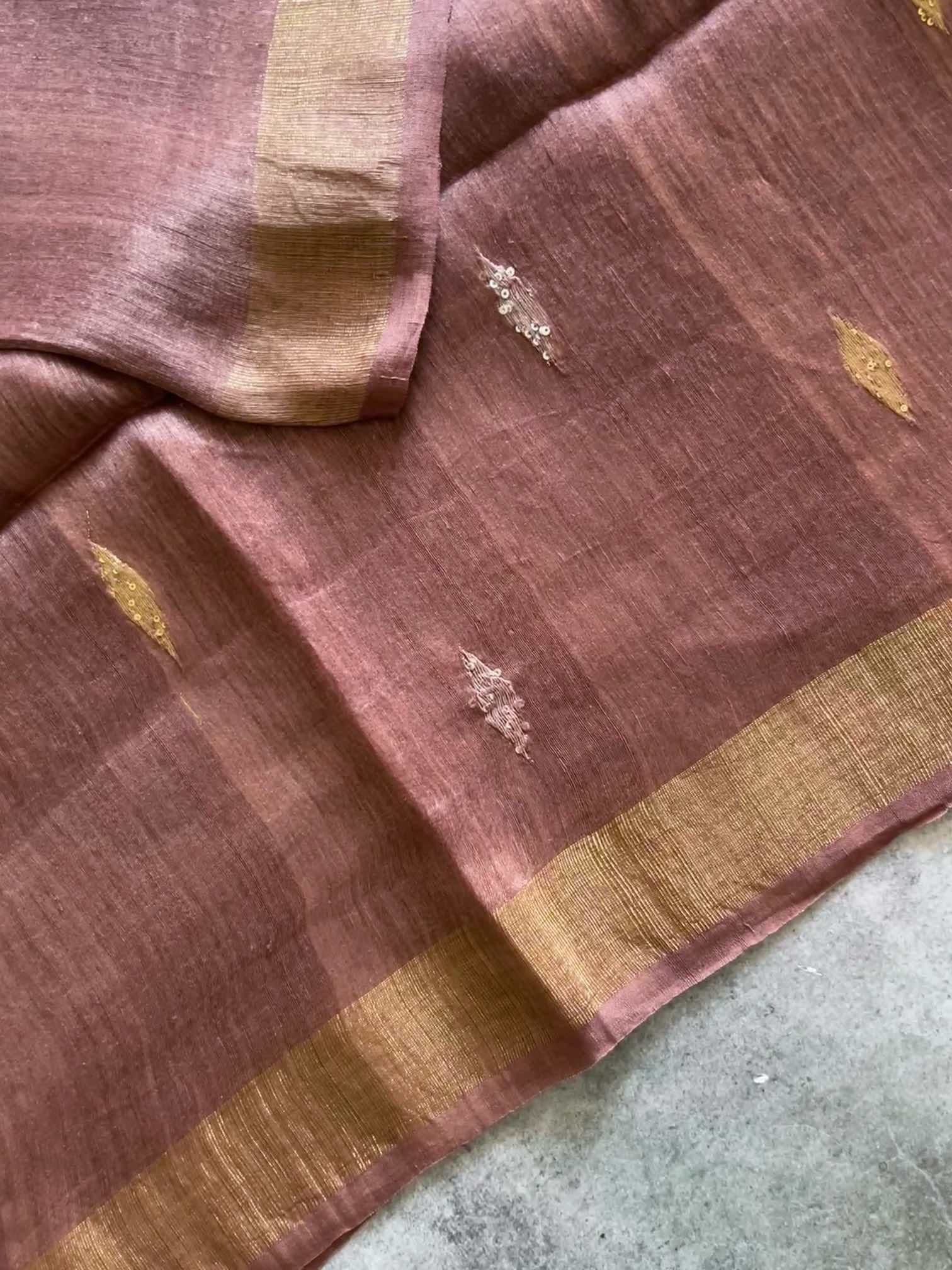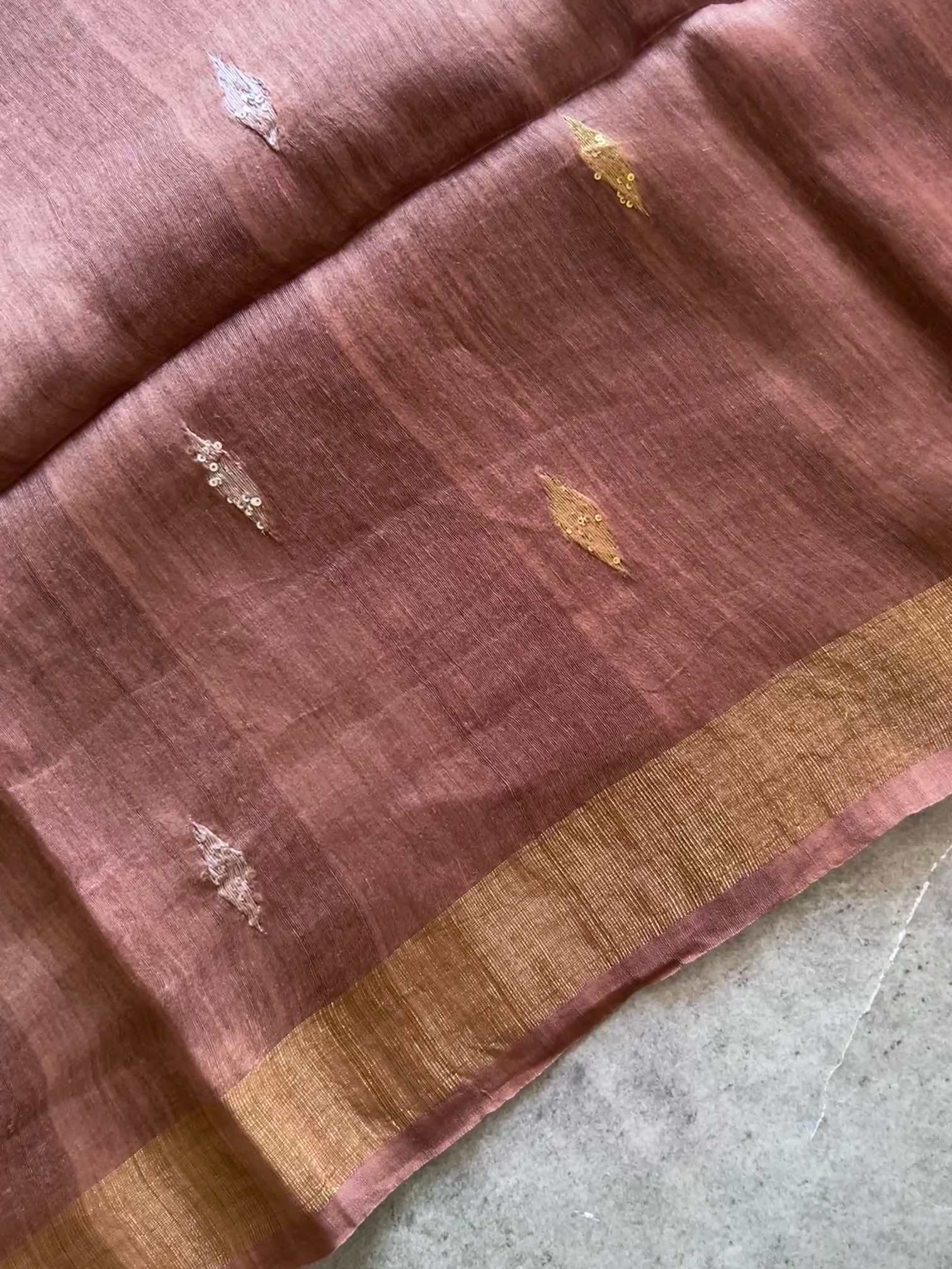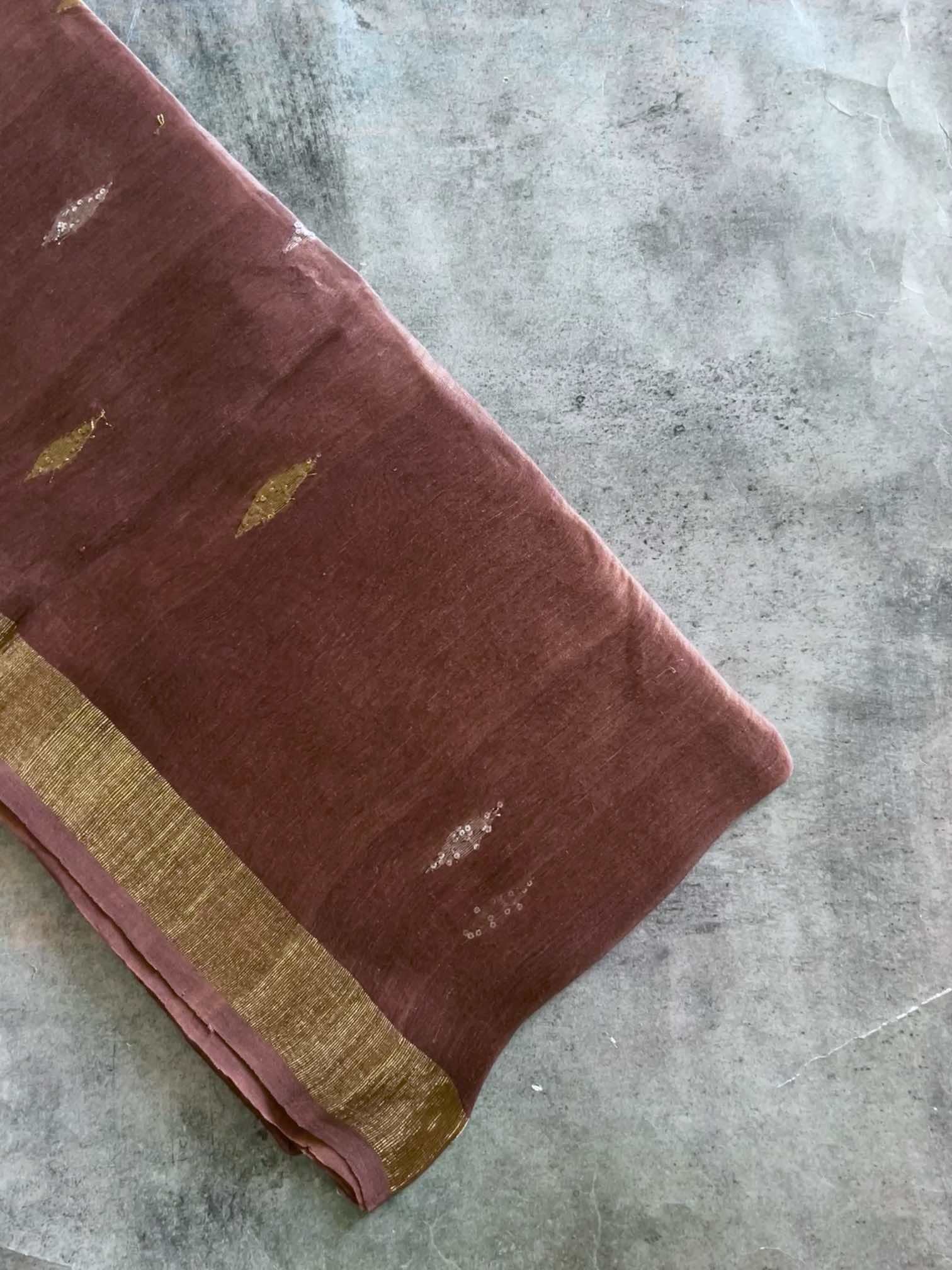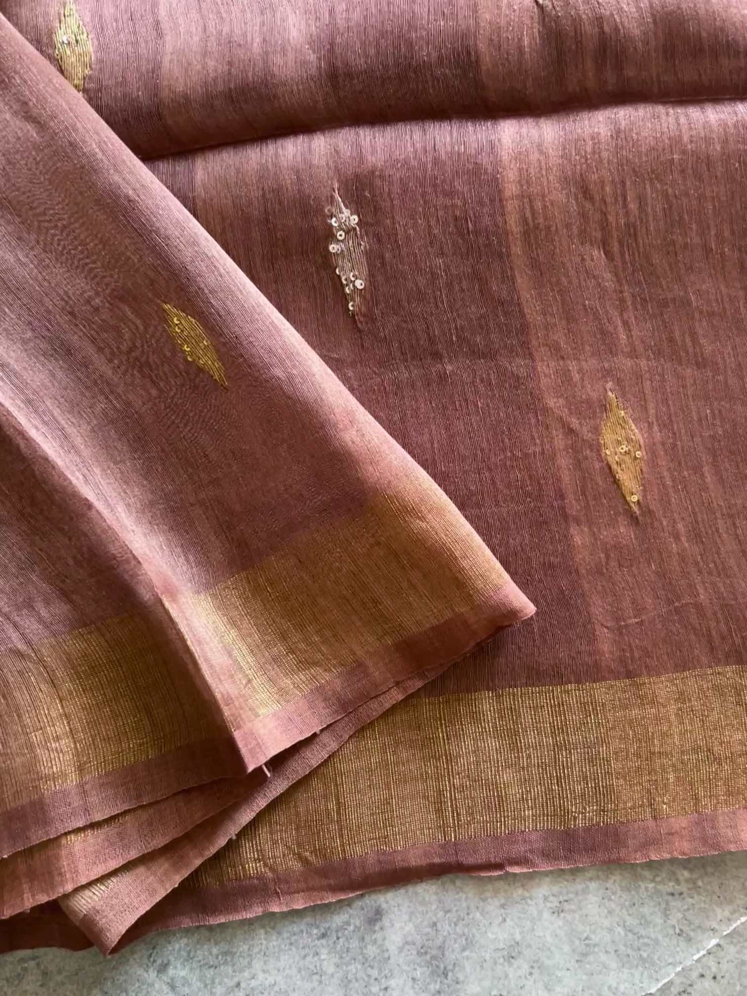 The linen silk saree is a stunning blend of subtle charm and regal artistry. The body is adorned with small diamond-shaped Jamdhani motifs, delicately highlighted with sequins that add a gentle sparkle without overpowering its elegance. The true showstopper is the Paithani-inspired Jamdhani pallu — rich in heritage, with intricate patterns woven to reflect timeless tradition. The crisp texture of linen silk paired with the shimmer of sequins and the grandeur of Paithani design makes this saree a perfect harmony of understated beauty and cultural richness.