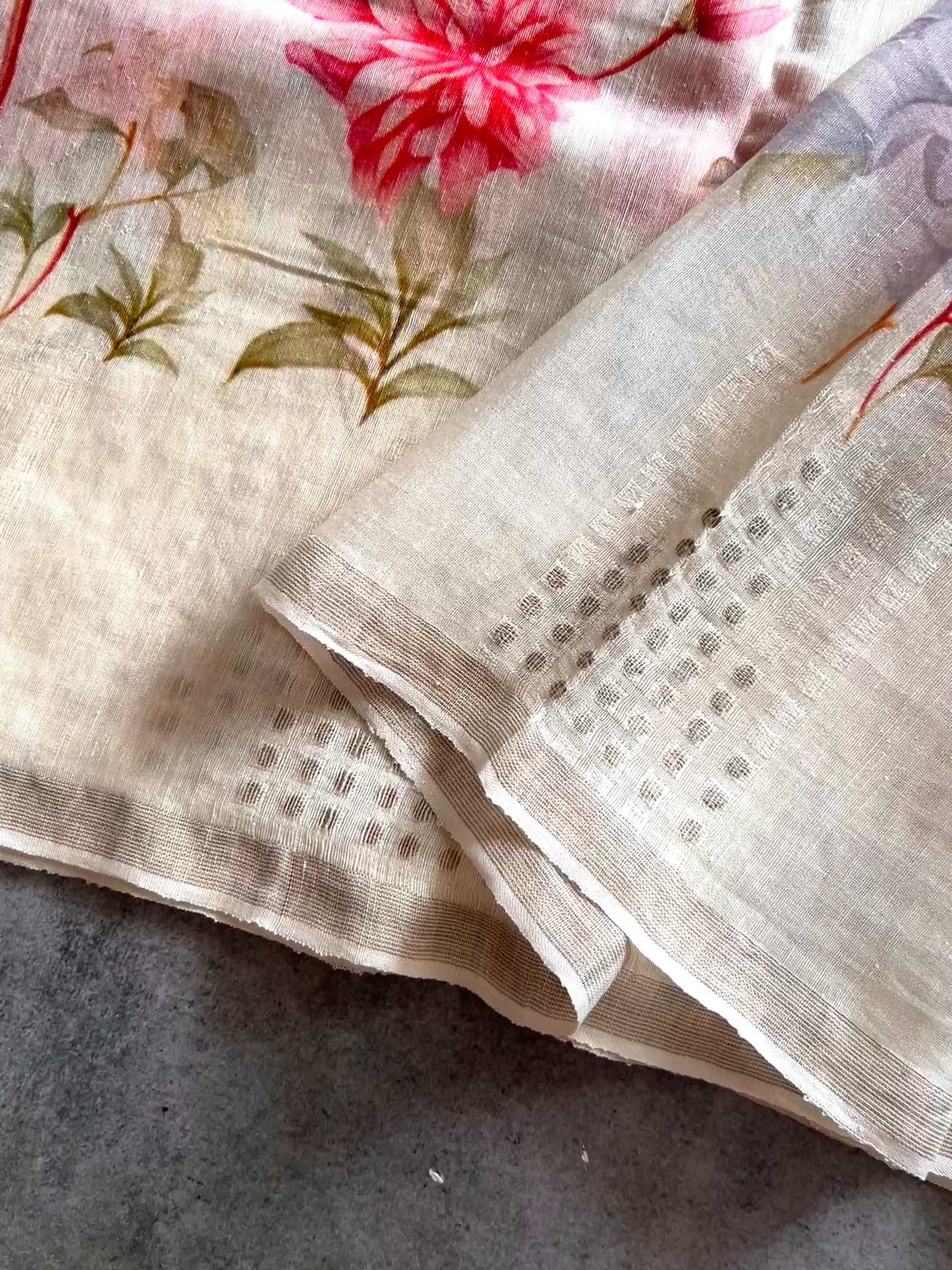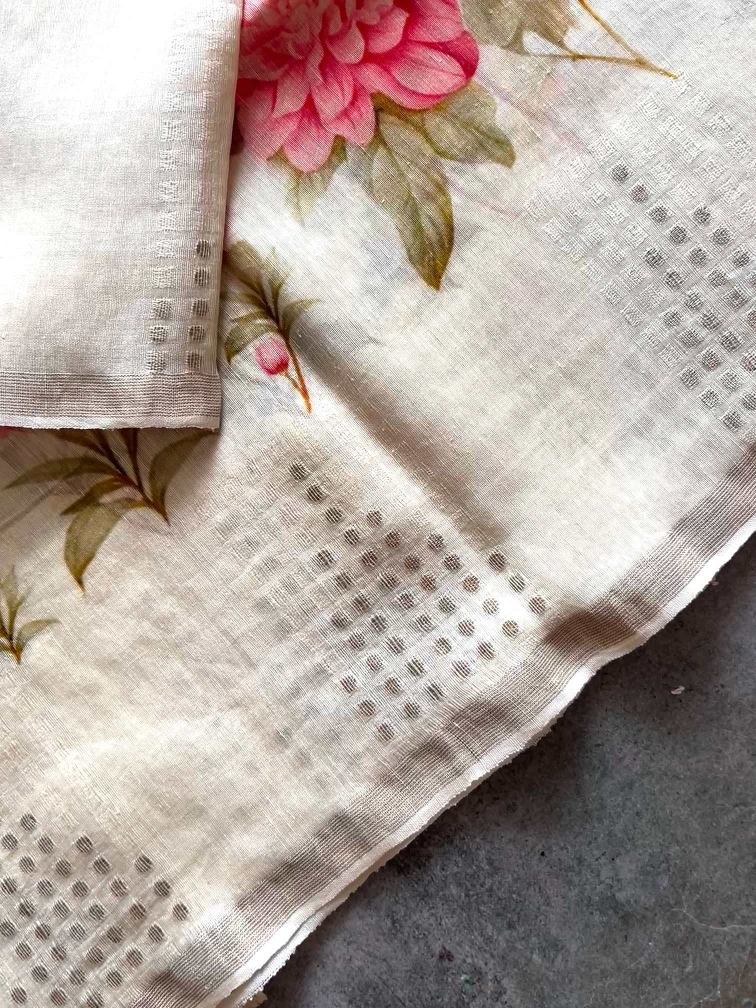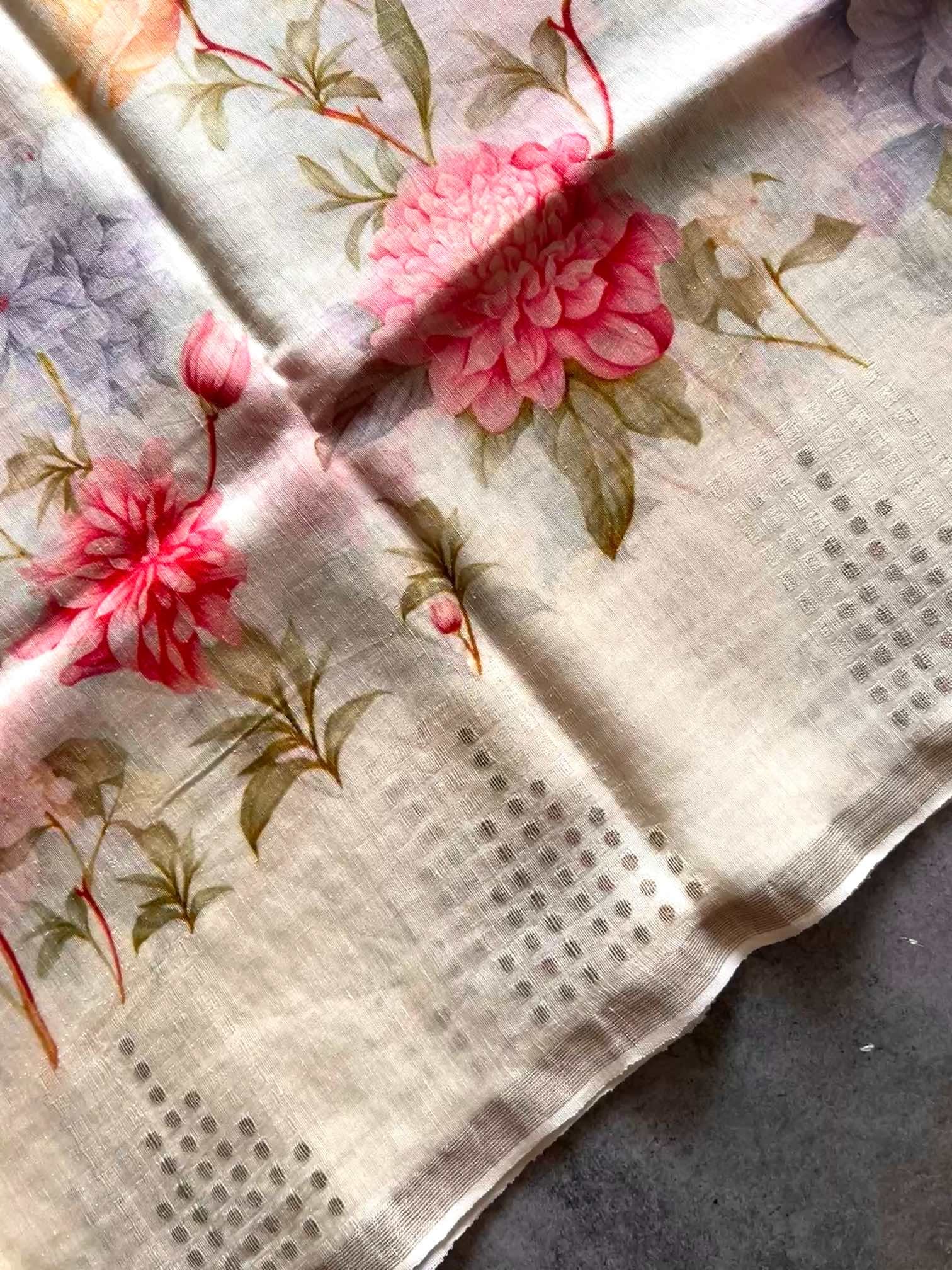 A graceful blend of nature and artistry, this floral printed linen silk saree exudes effortless elegance. The soft, breathable texture drapes beautifully, while the delicate gini work along the border adds a touch of refined shimmer, making it perfect for timeless, understated charm.