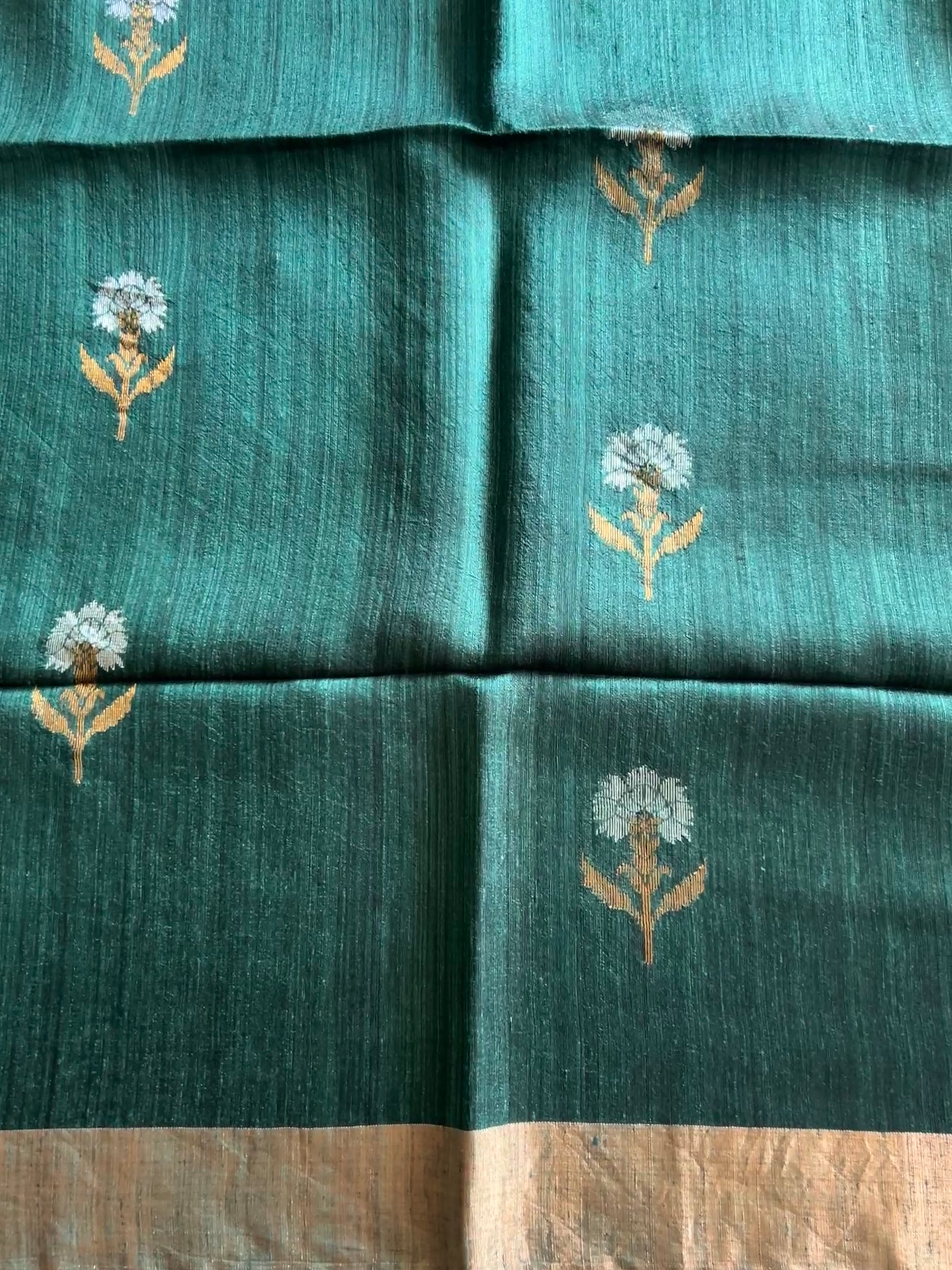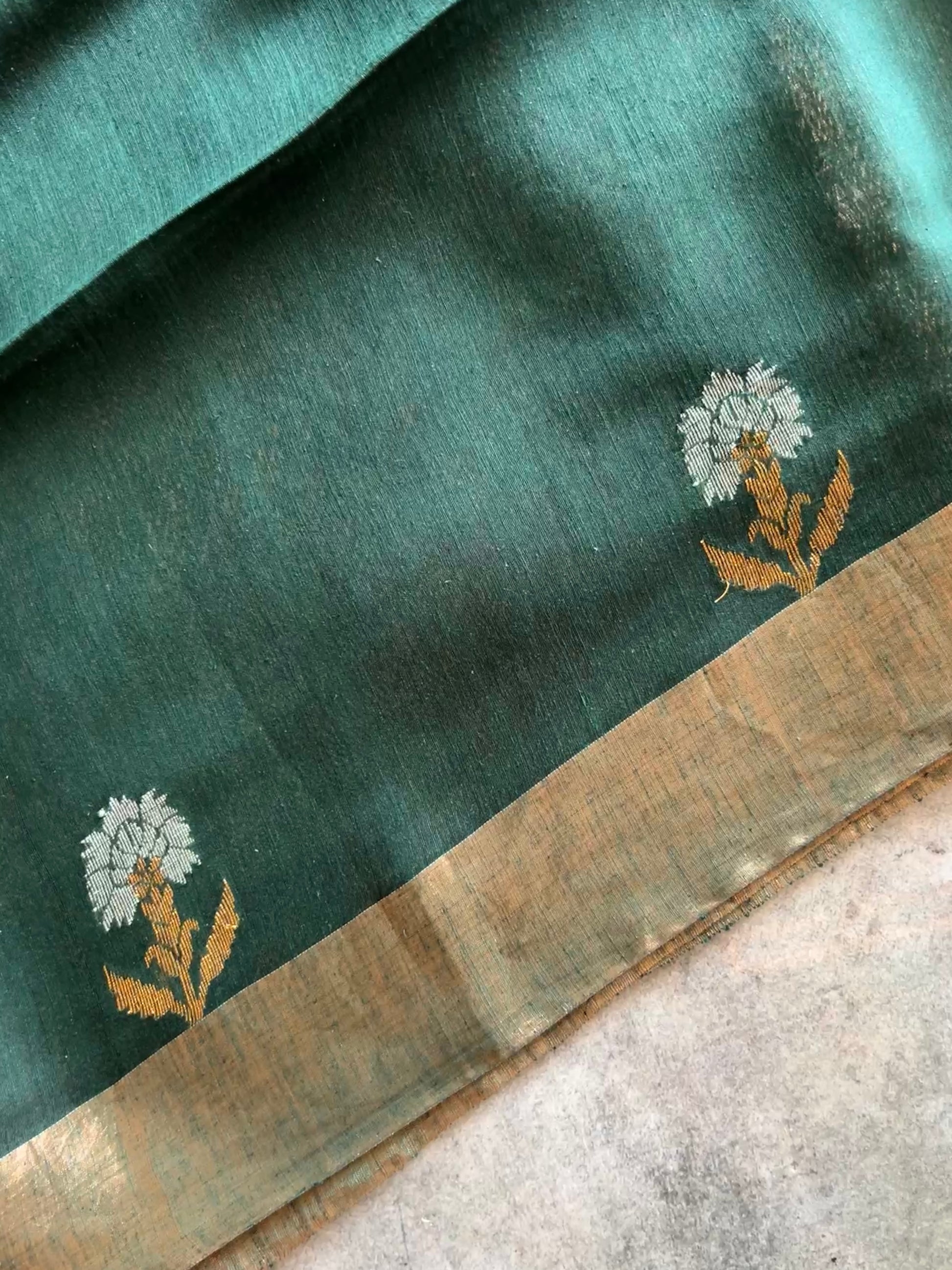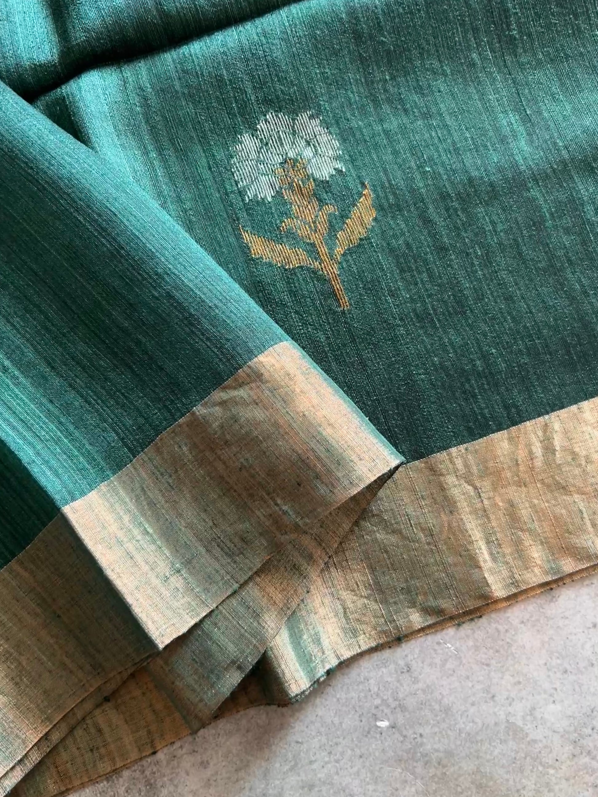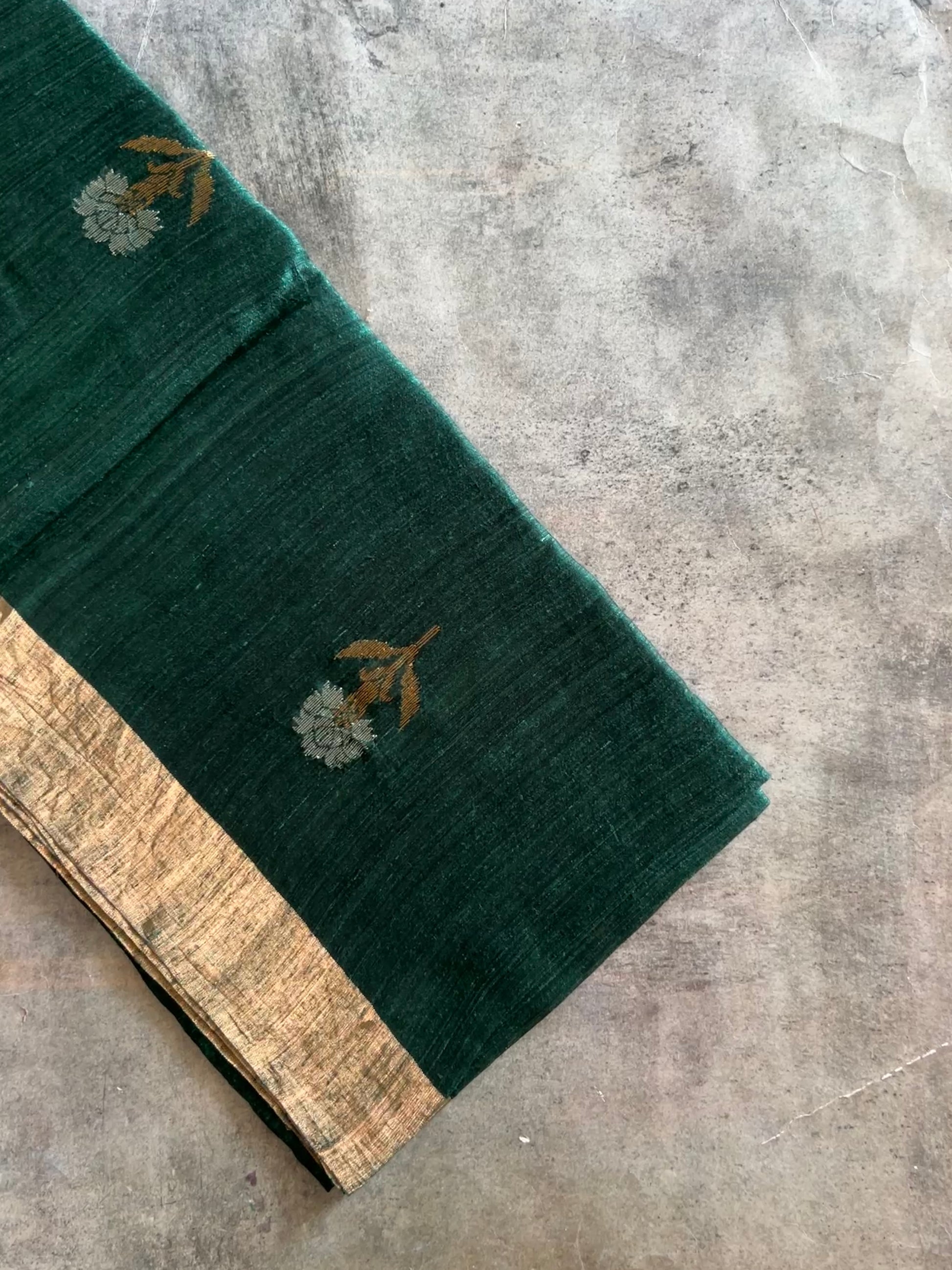 The textured richness of matka silk lends a natural, earthy charm, while the floral buttas add a graceful, feminine touch. The understated border frames the drape beautifully, and the zari pallu introduces a hint of opulence, making it perfect for both traditional occasions and artistic fashion statements. It's a saree that speaks softly but leaves a lasting impression.