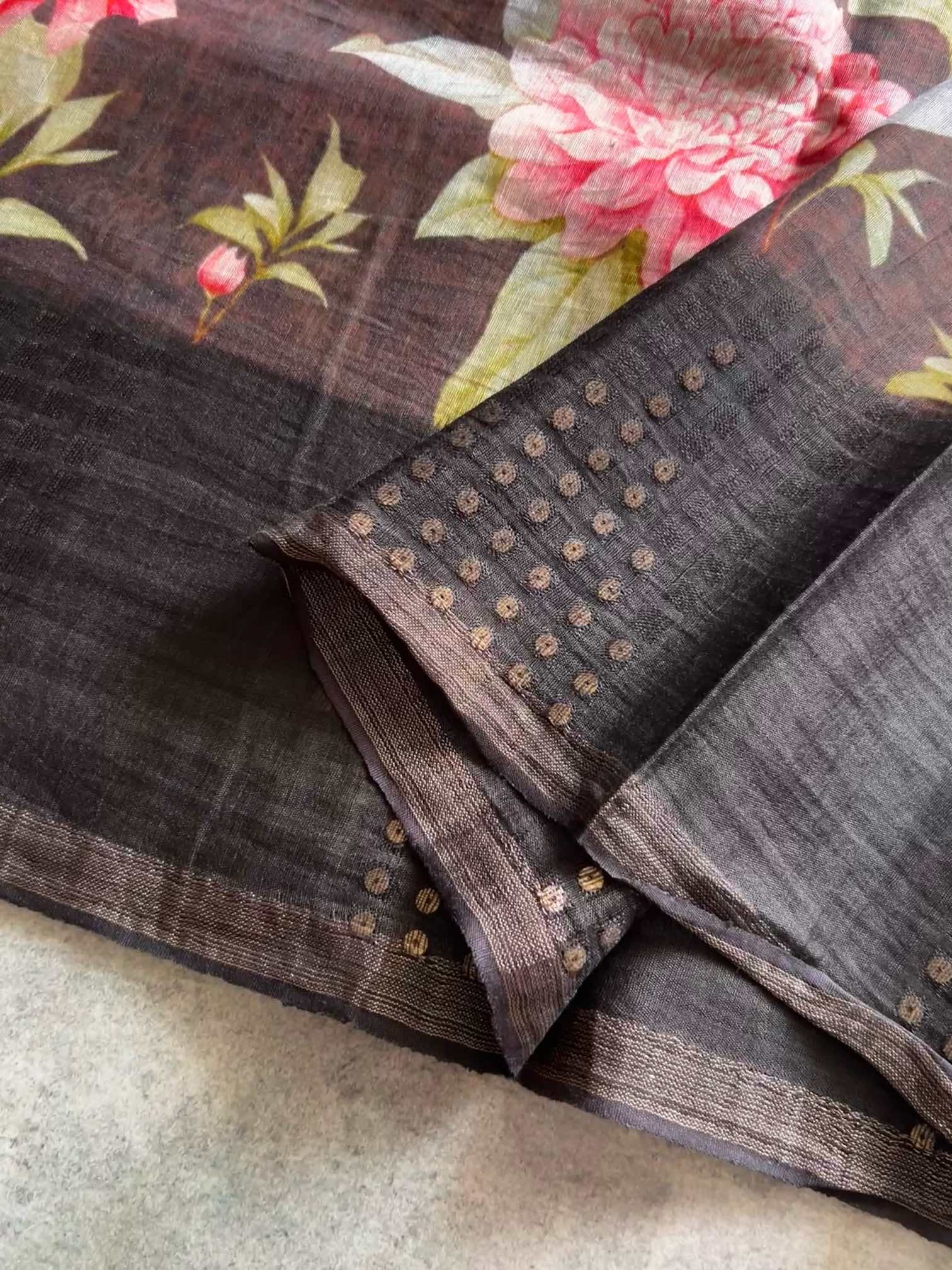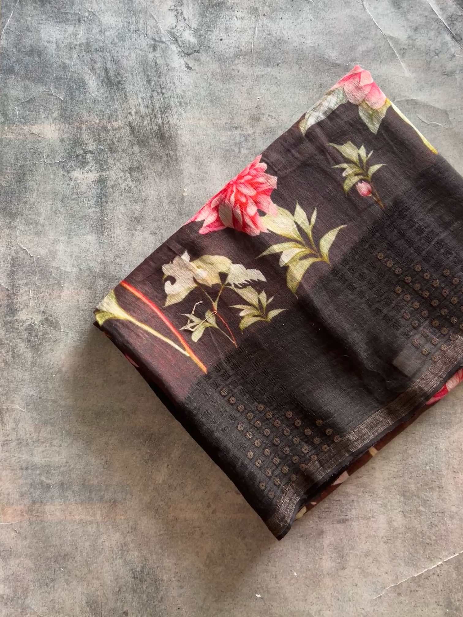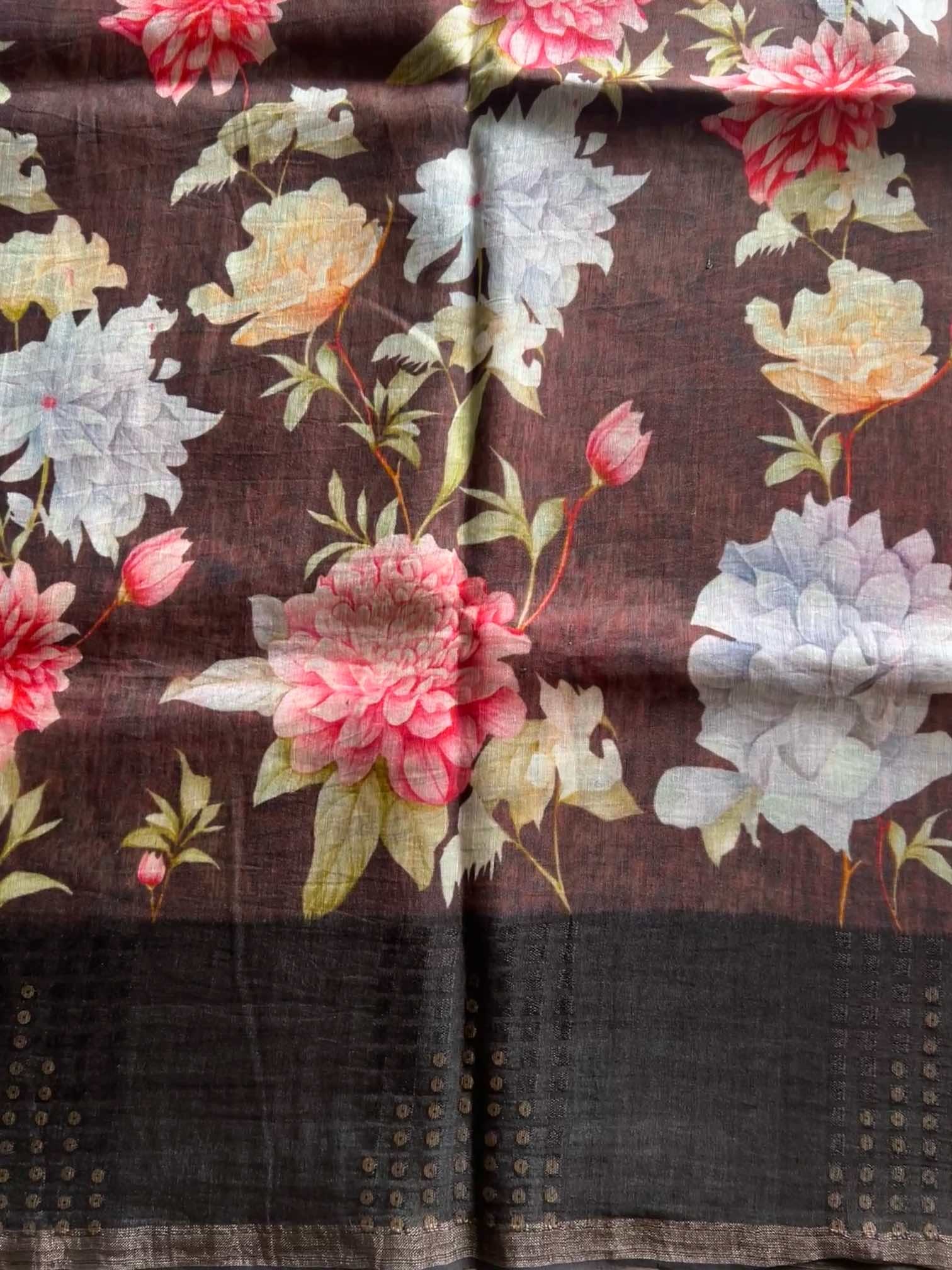 A graceful blend of nature and artistry, this floral printed linen silk saree exudes effortless elegance. The soft, breathable texture drapes beautifully, while the delicate gini work along the border adds a touch of refined shimmer, making it perfect for timeless, understated charm.