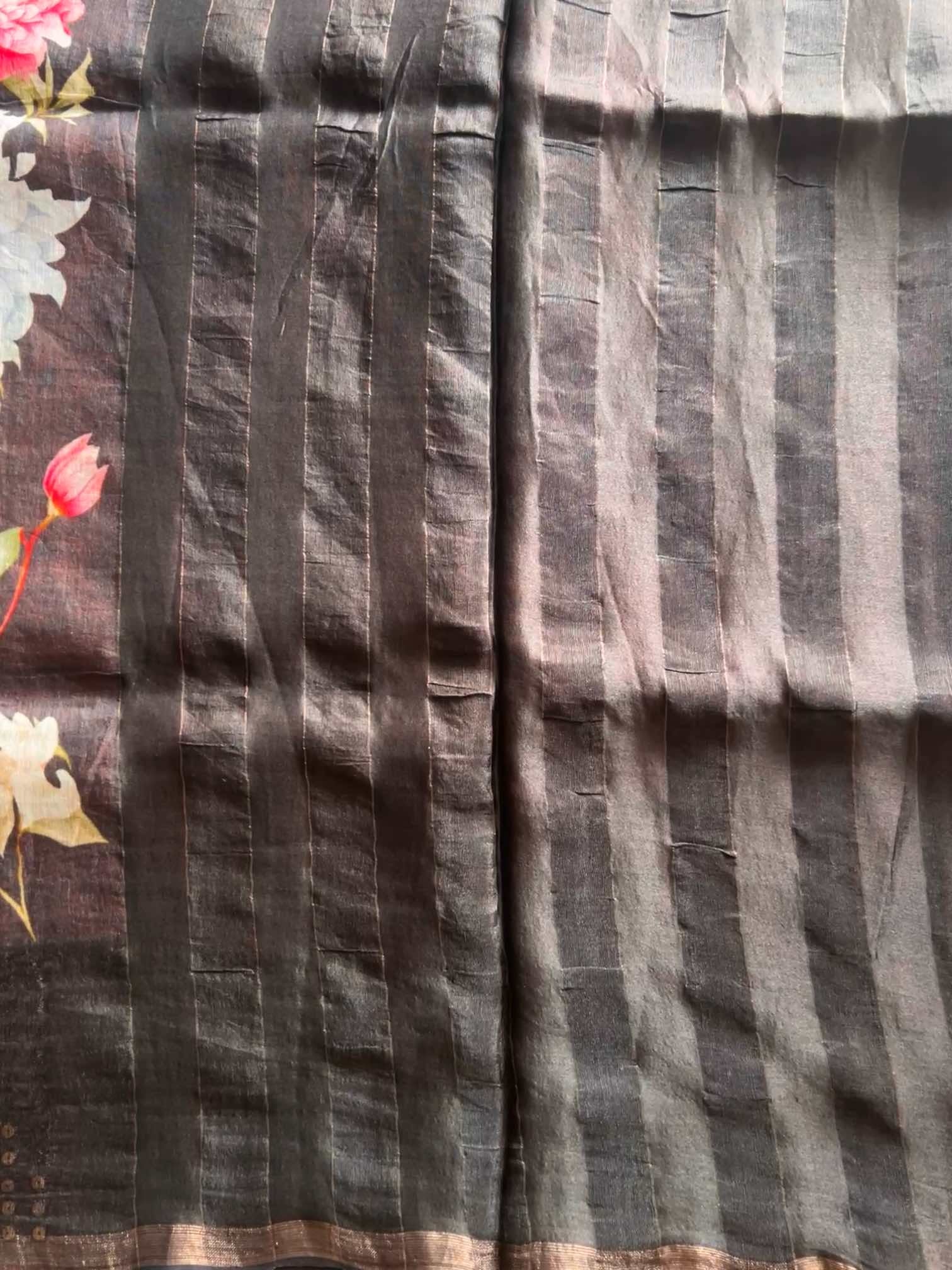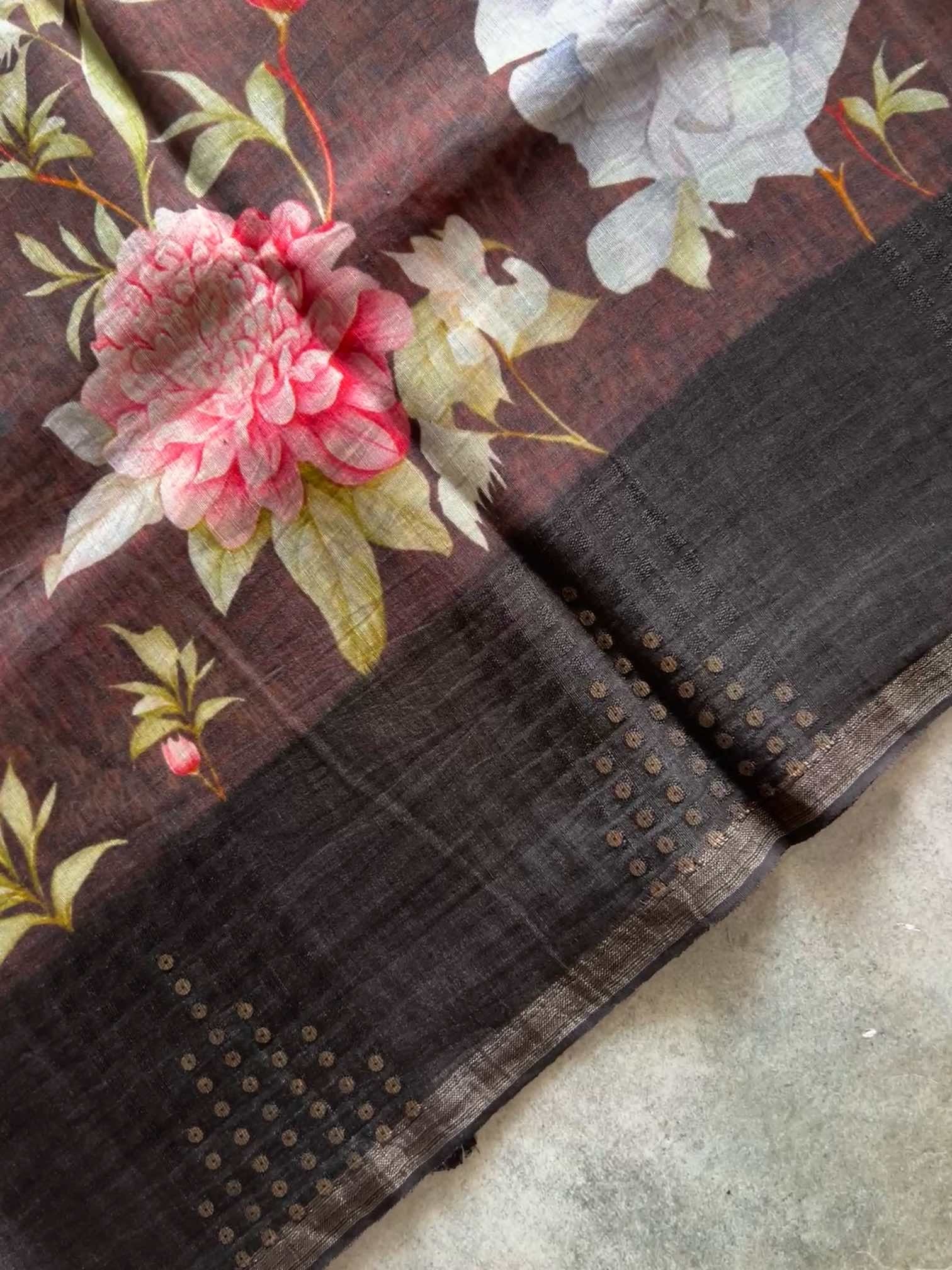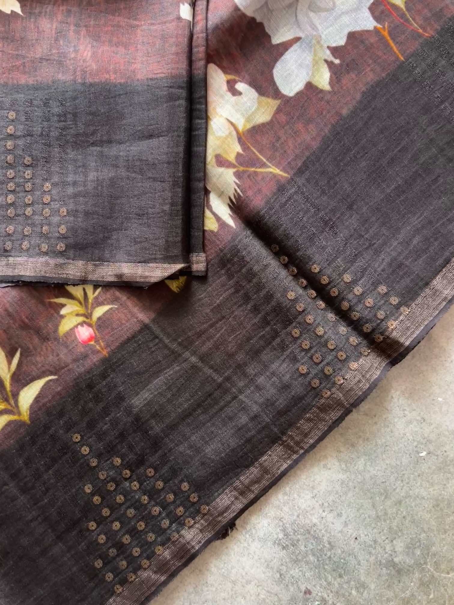 A graceful blend of nature and artistry, this floral printed linen silk saree exudes effortless elegance. The soft, breathable texture drapes beautifully, while the delicate gini work along the border adds a touch of refined shimmer, making it perfect for timeless, understated charm.