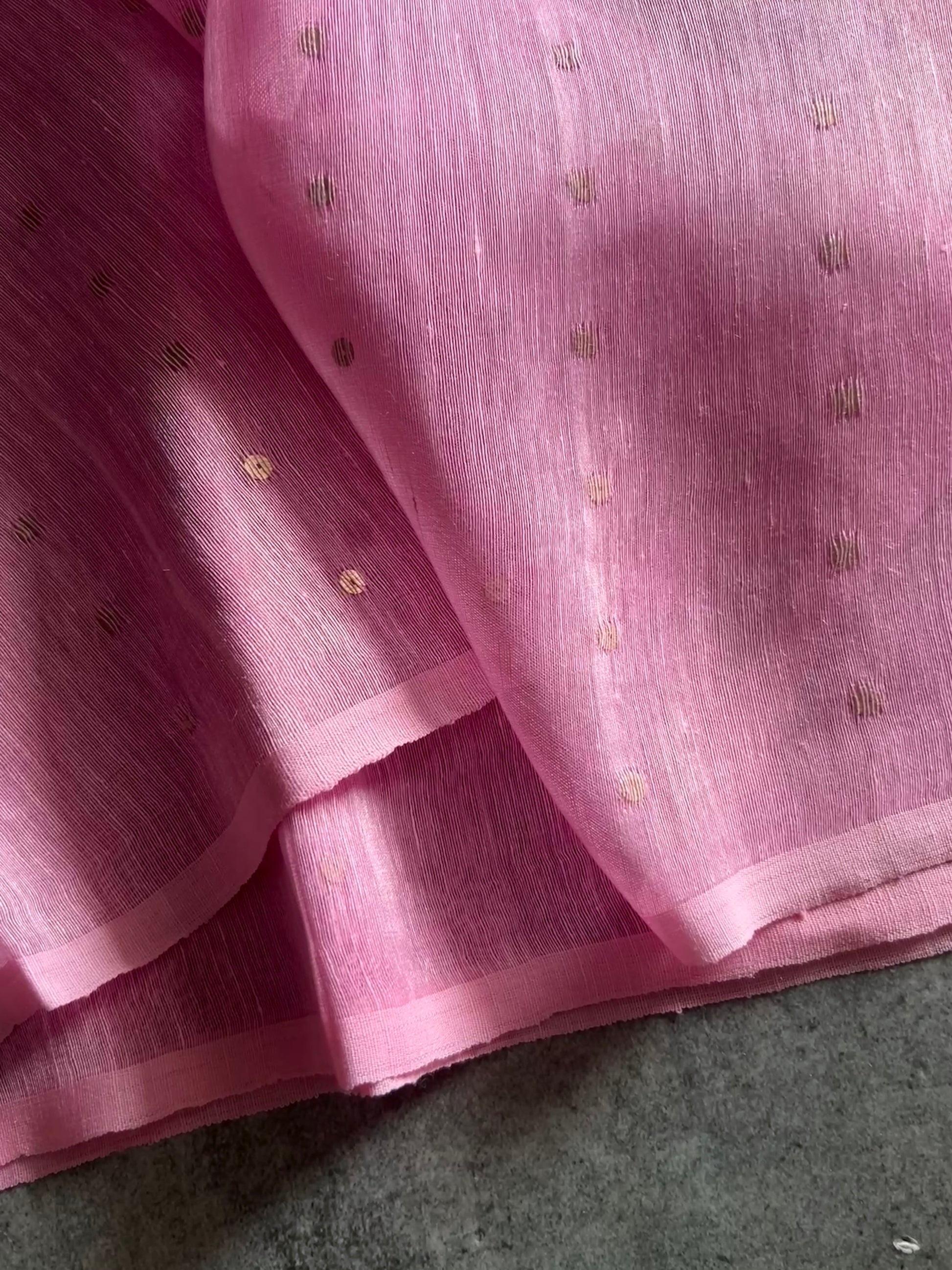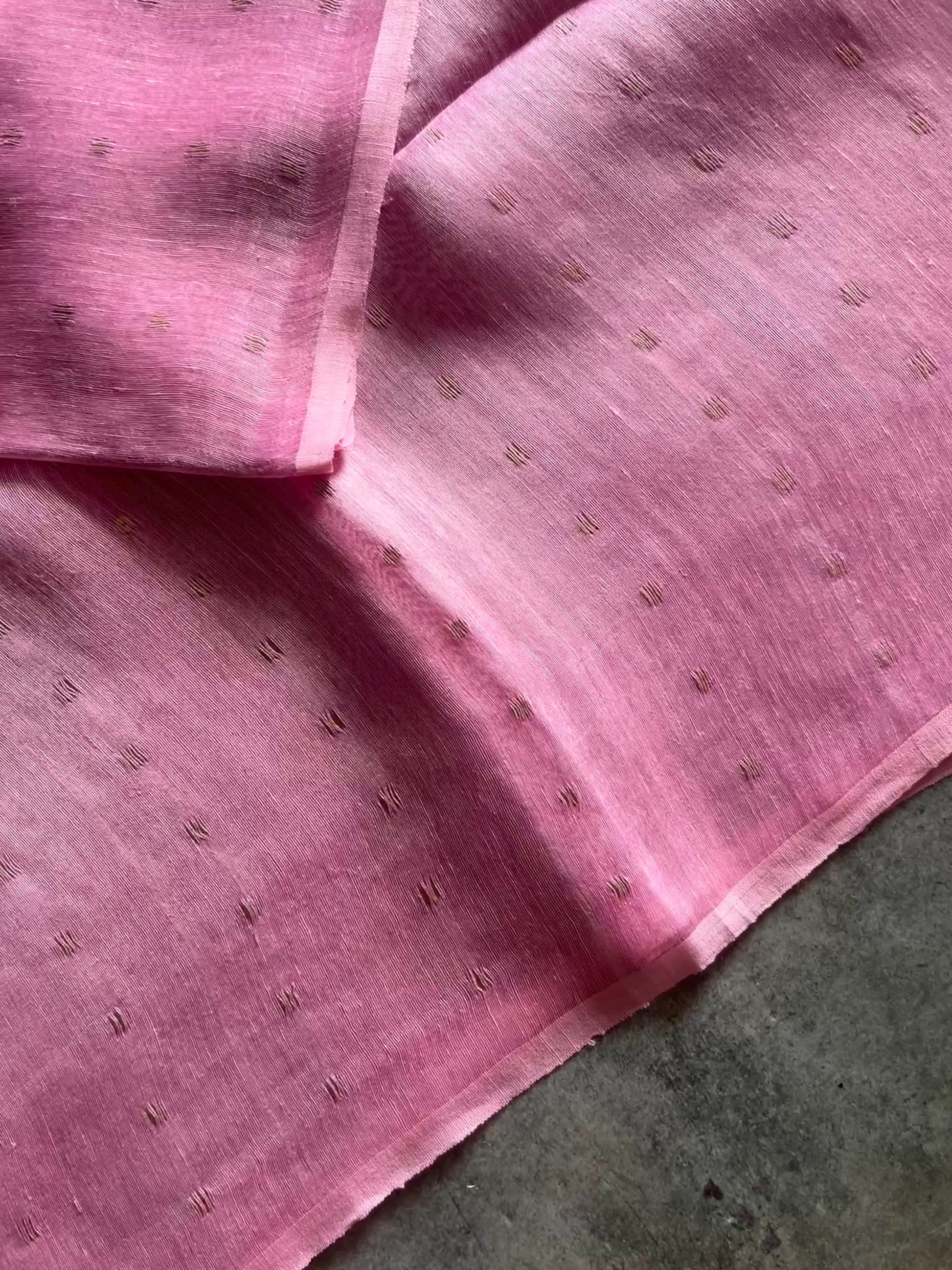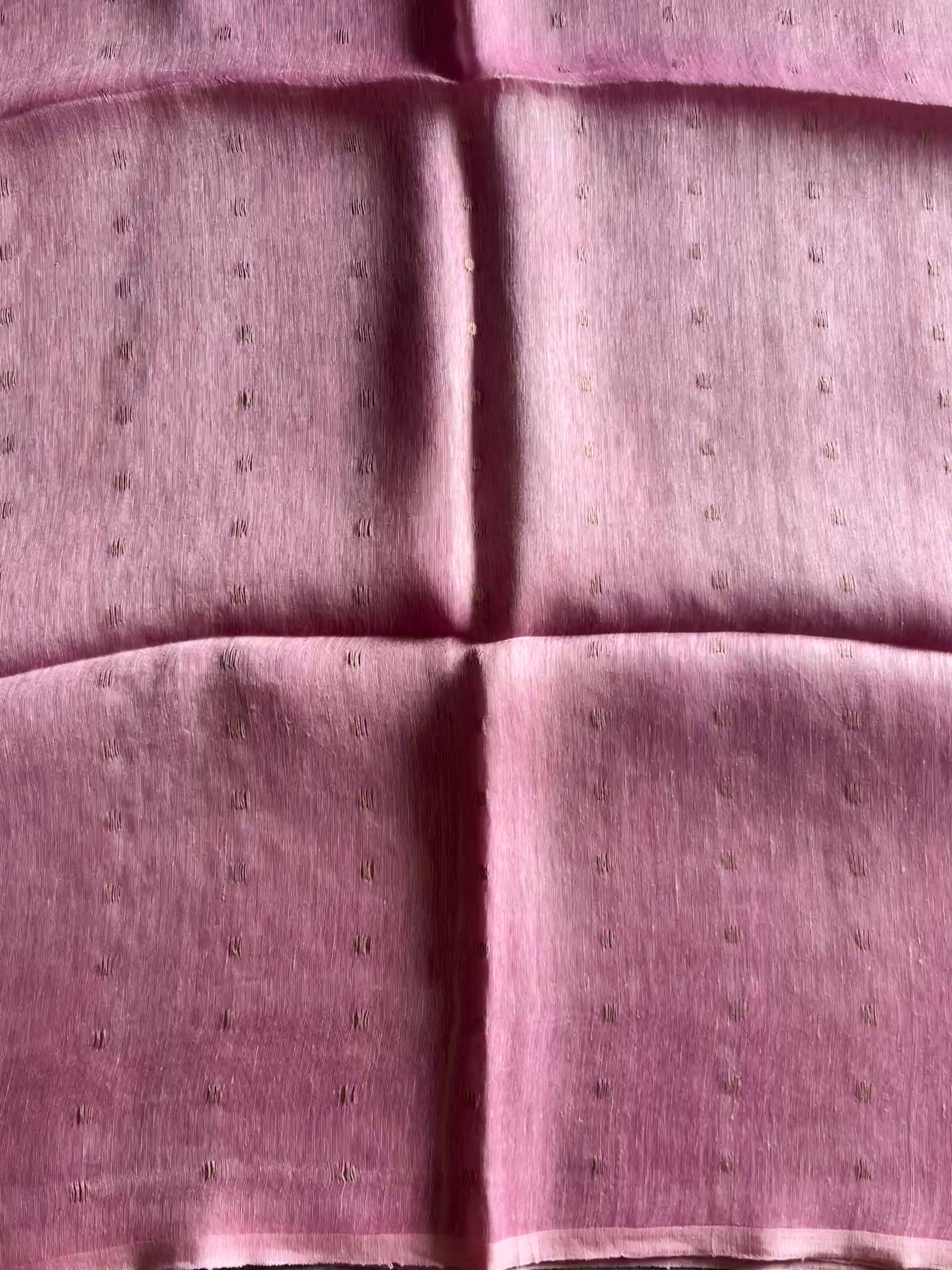 The linen silk fabric brings a perfect balance of softness and sheen, offering a lightweight yet luxurious feel. The Jamdhani work on the muslin pallu adds intricate, traditional handwoven motifs, elevating the saree with timeless beauty and cultural heritage. The gini work scattered across the saree adds a touch of opulence, with delicate metallic embroidery that catches the light. Together, these elements create a saree that exudes elegance, sophistication, and intricate craftsmanship, making it a stunning choice for special occasions.