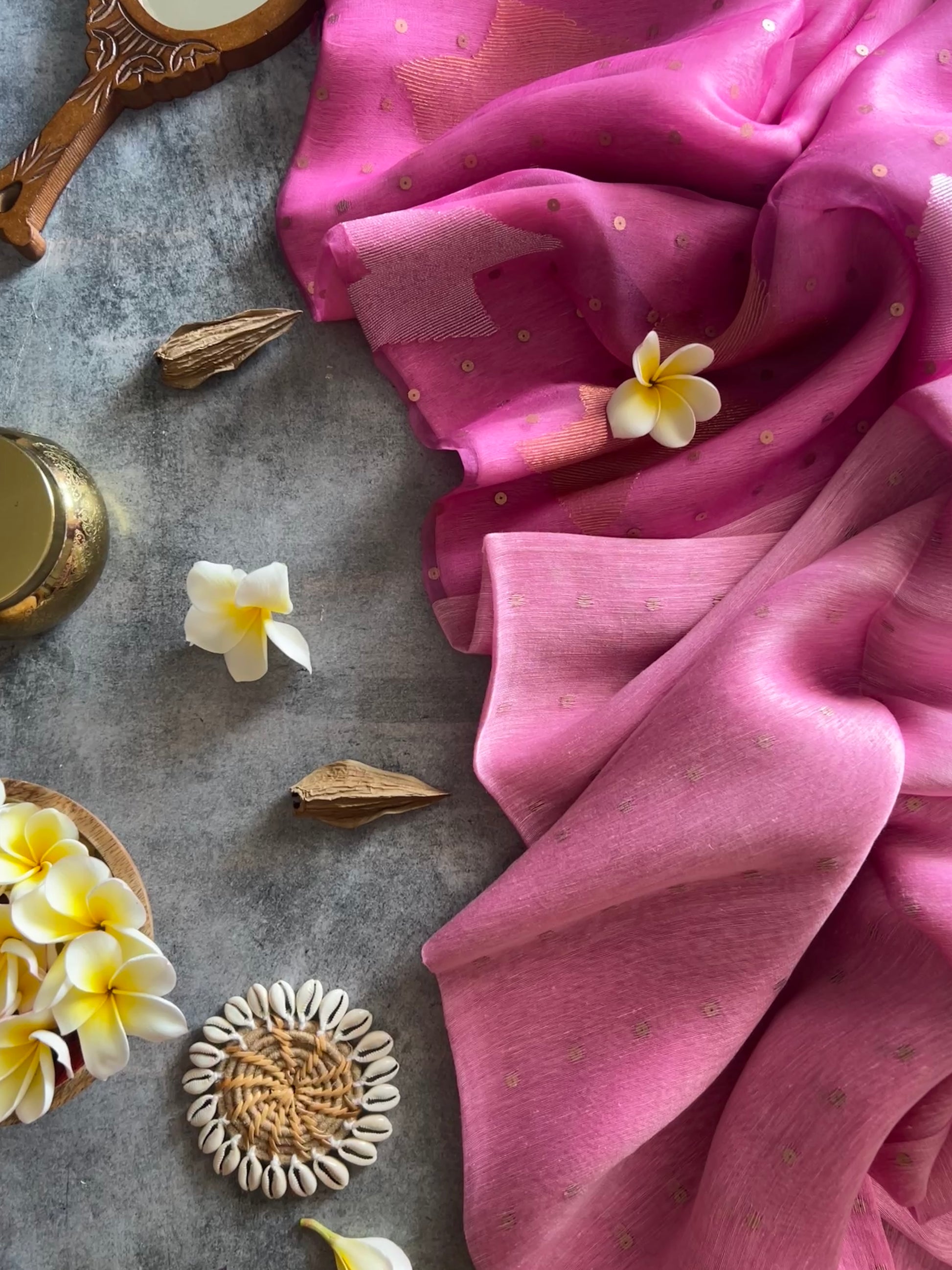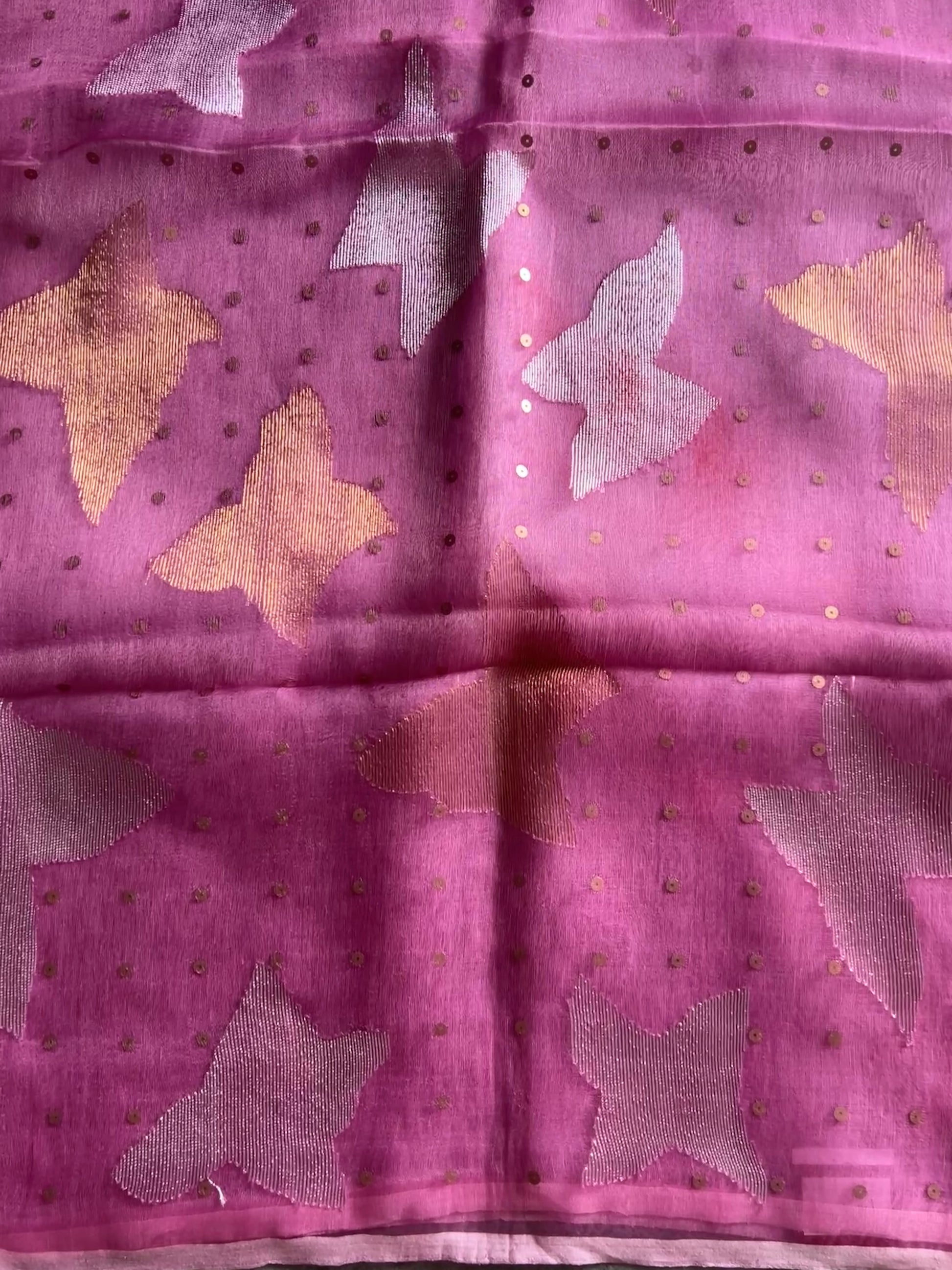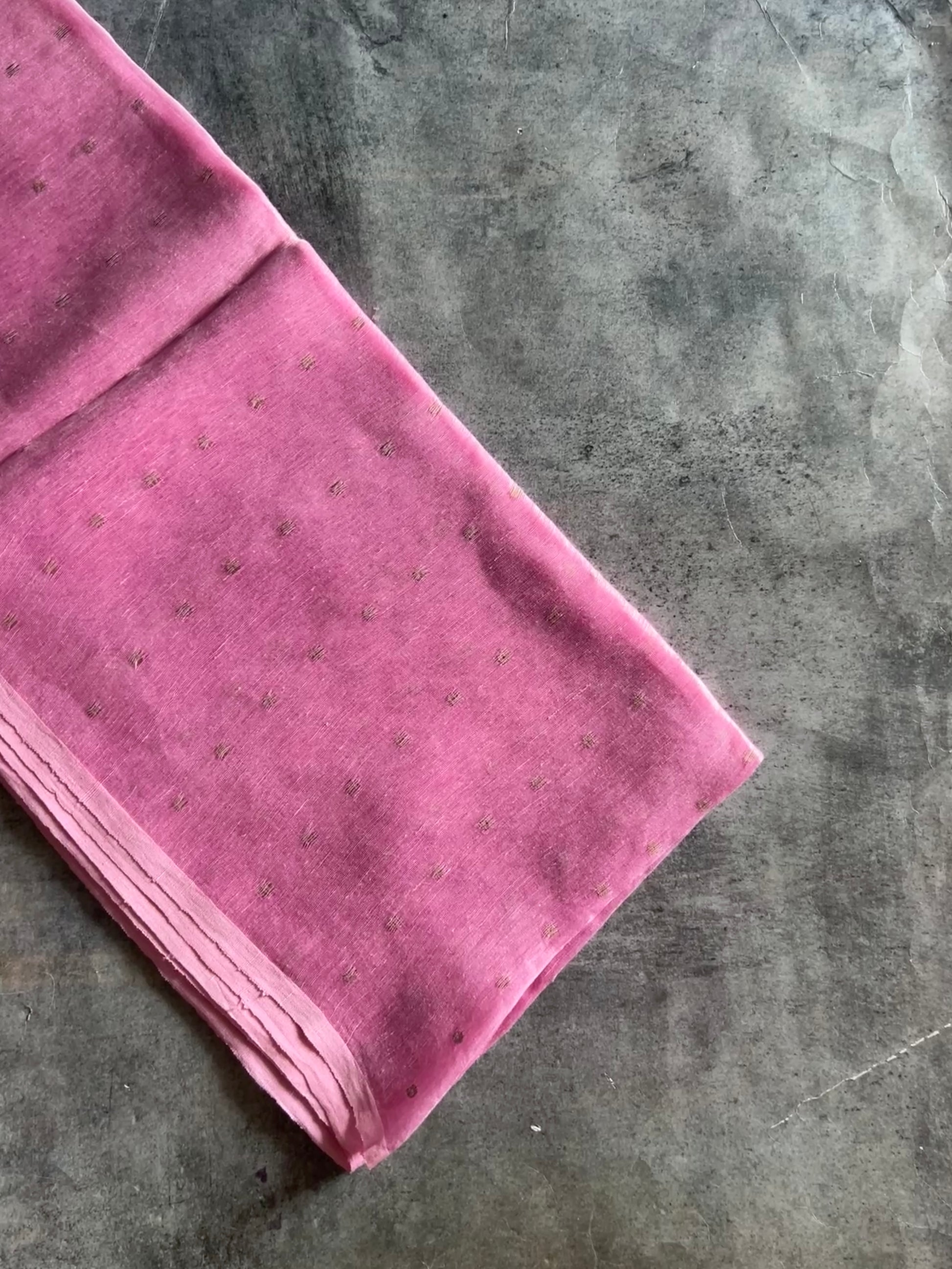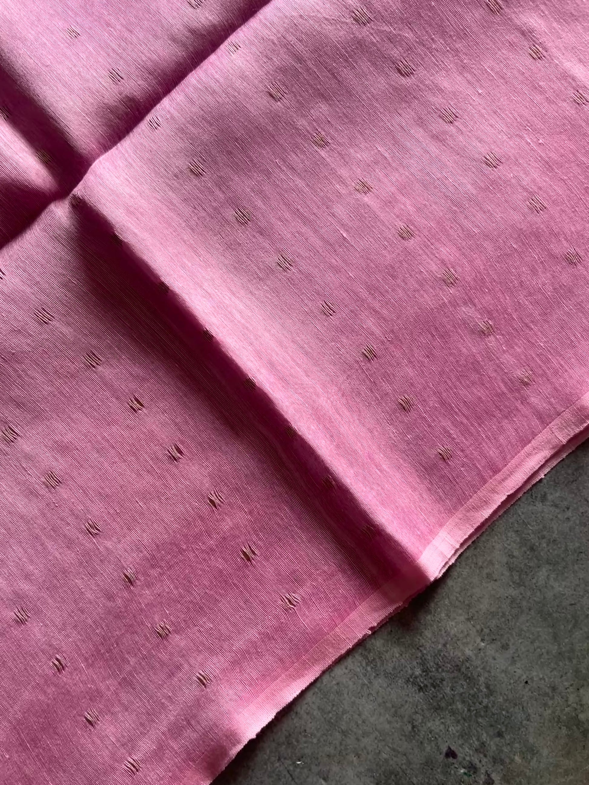 The linen silk fabric brings a perfect balance of softness and sheen, offering a lightweight yet luxurious feel. The Jamdhani work on the muslin pallu adds intricate, traditional handwoven motifs, elevating the saree with timeless beauty and cultural heritage. The gini work scattered across the saree adds a touch of opulence, with delicate metallic embroidery that catches the light. Together, these elements create a saree that exudes elegance, sophistication, and intricate craftsmanship, making it a stunning choice for special occasions.