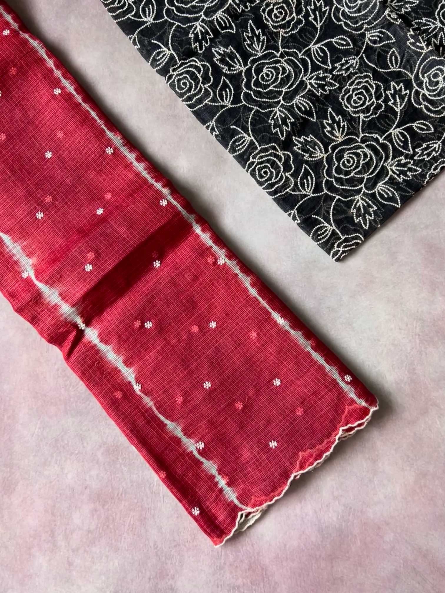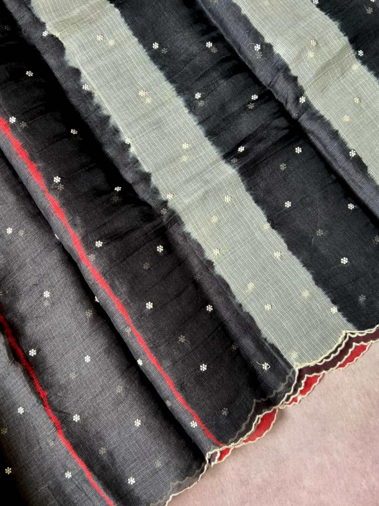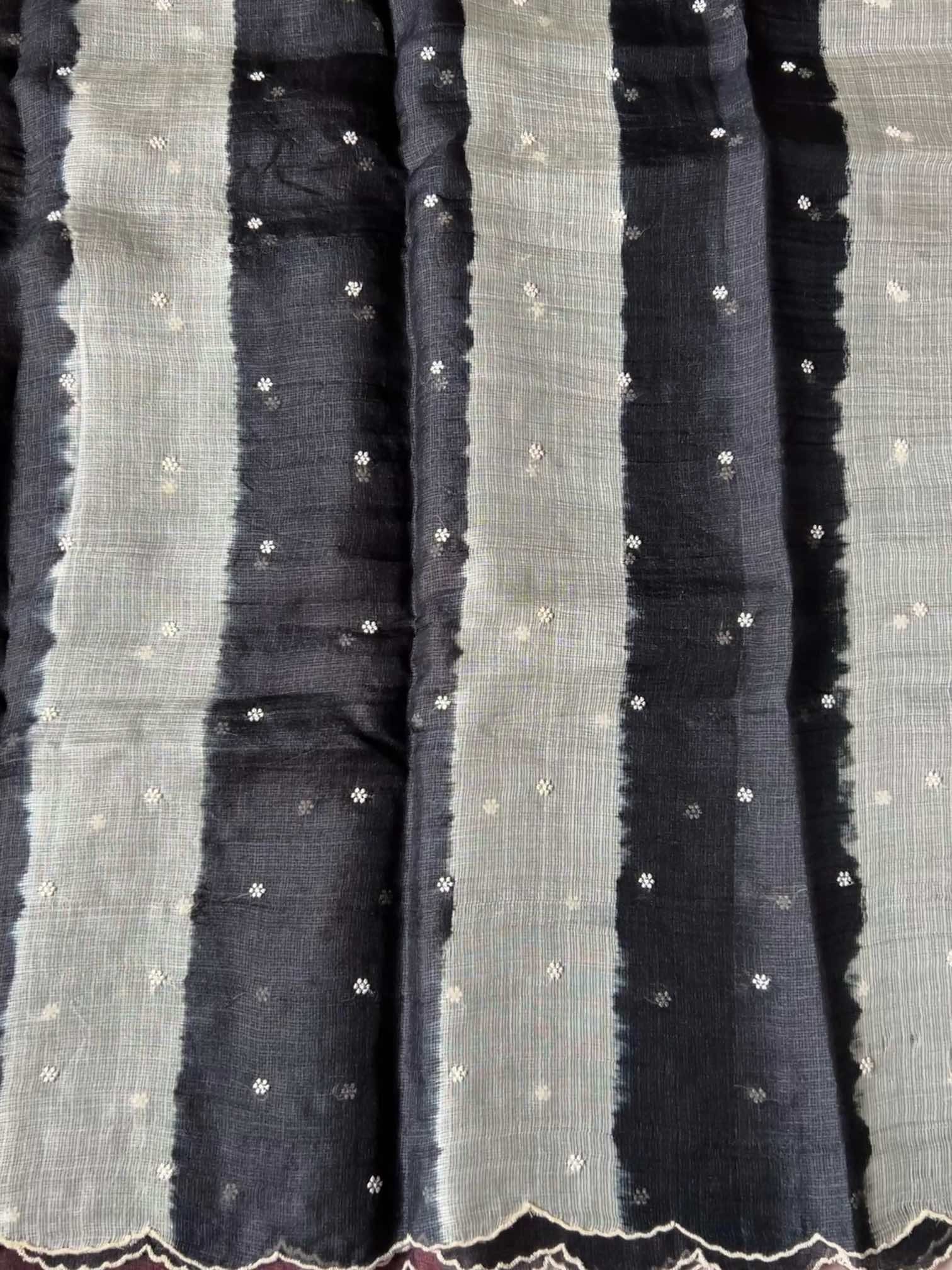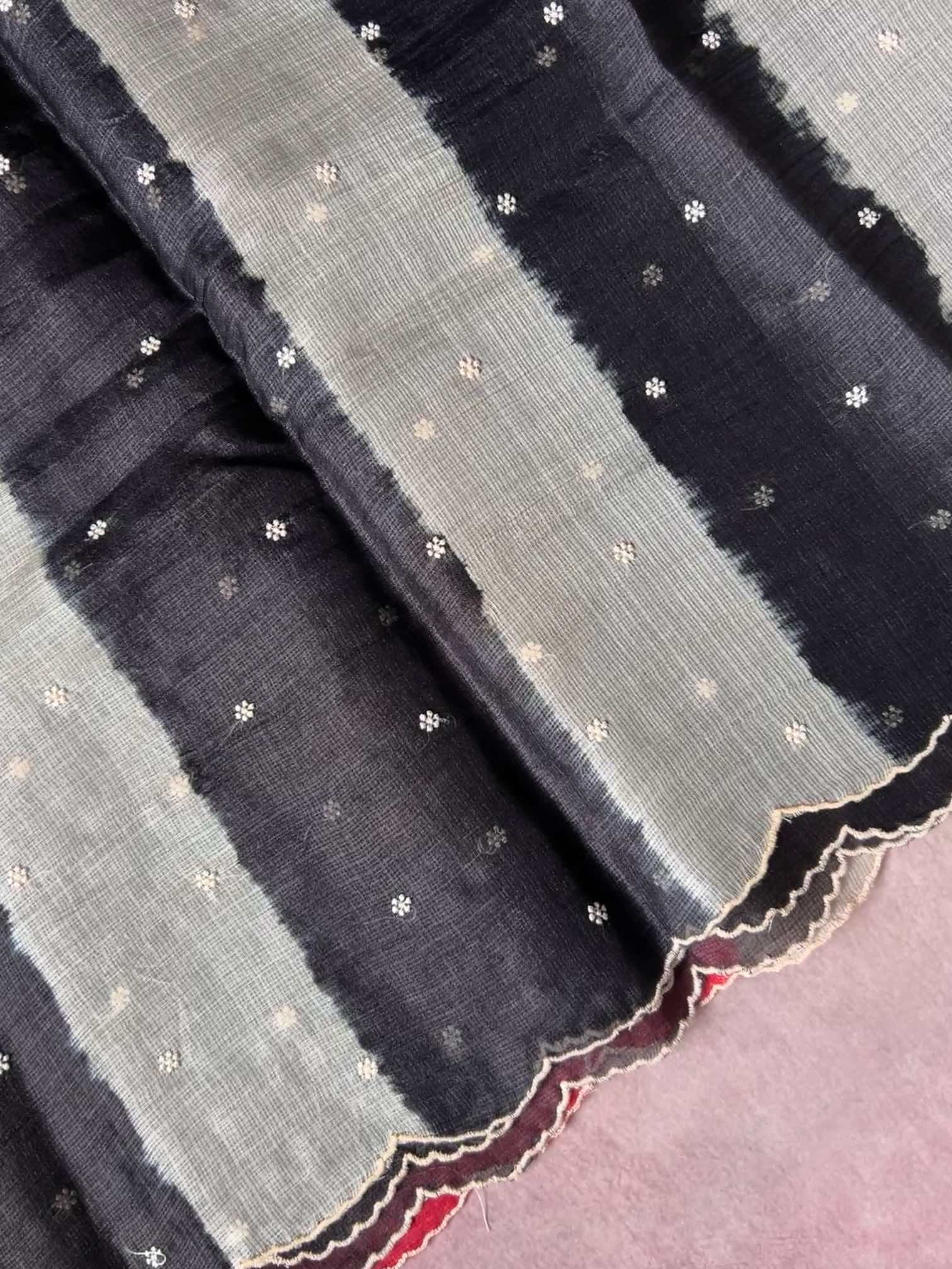 Tussar Kota with machine-embroidered mango buttas is a graceful fusion of tradition and modern craftsmanship. The natural sheen of tussar silk adds a rich, earthy elegance, while the lightweight Kota weave lends it an airy, delicate texture. The intricately embroidered mango buttas—symbolic of prosperity and heritage—bring a touch of timeless charm. This blend of refined fabric and subtle detailing makes it a perfect choice for both understated elegance and festive allure.