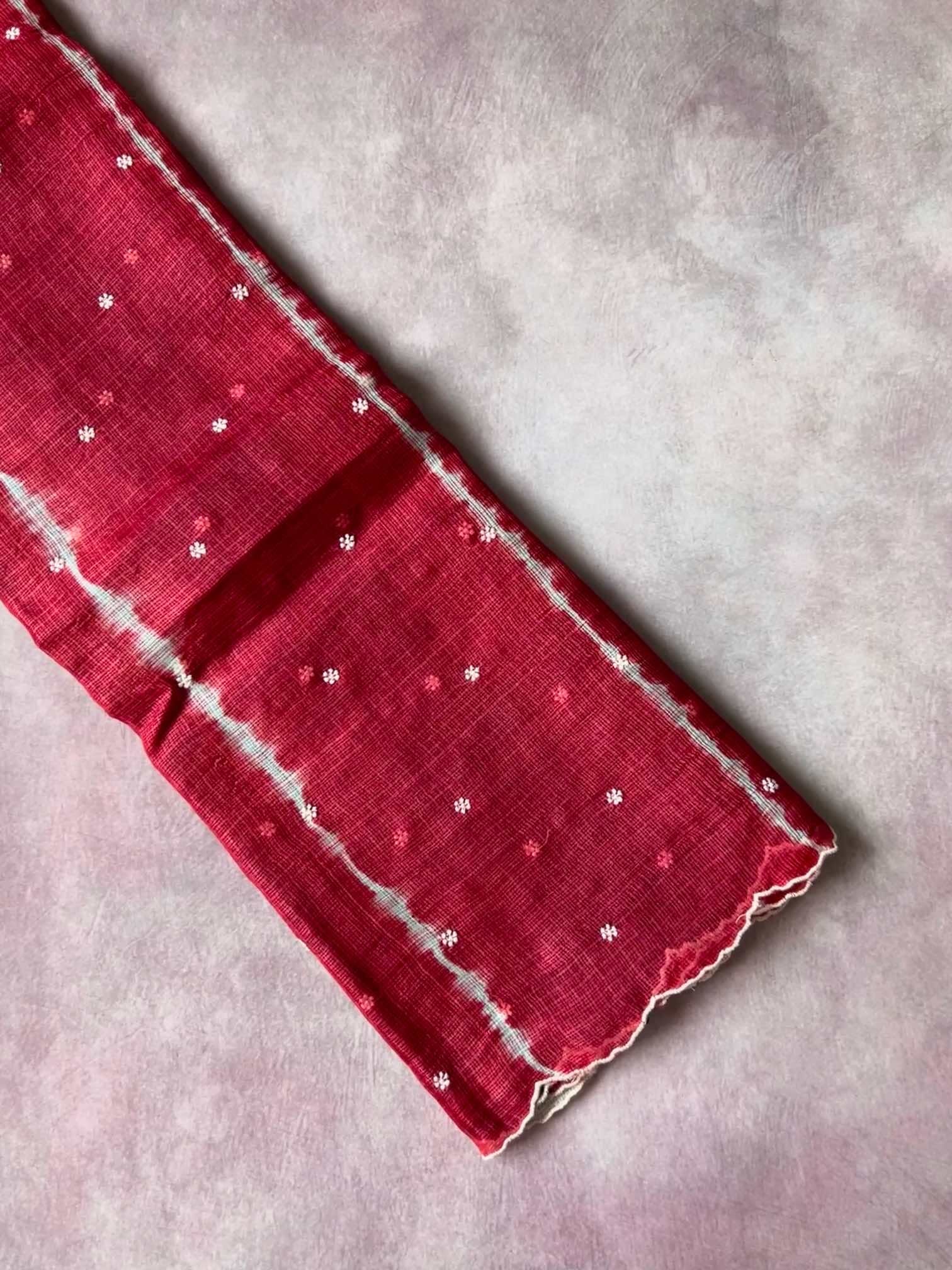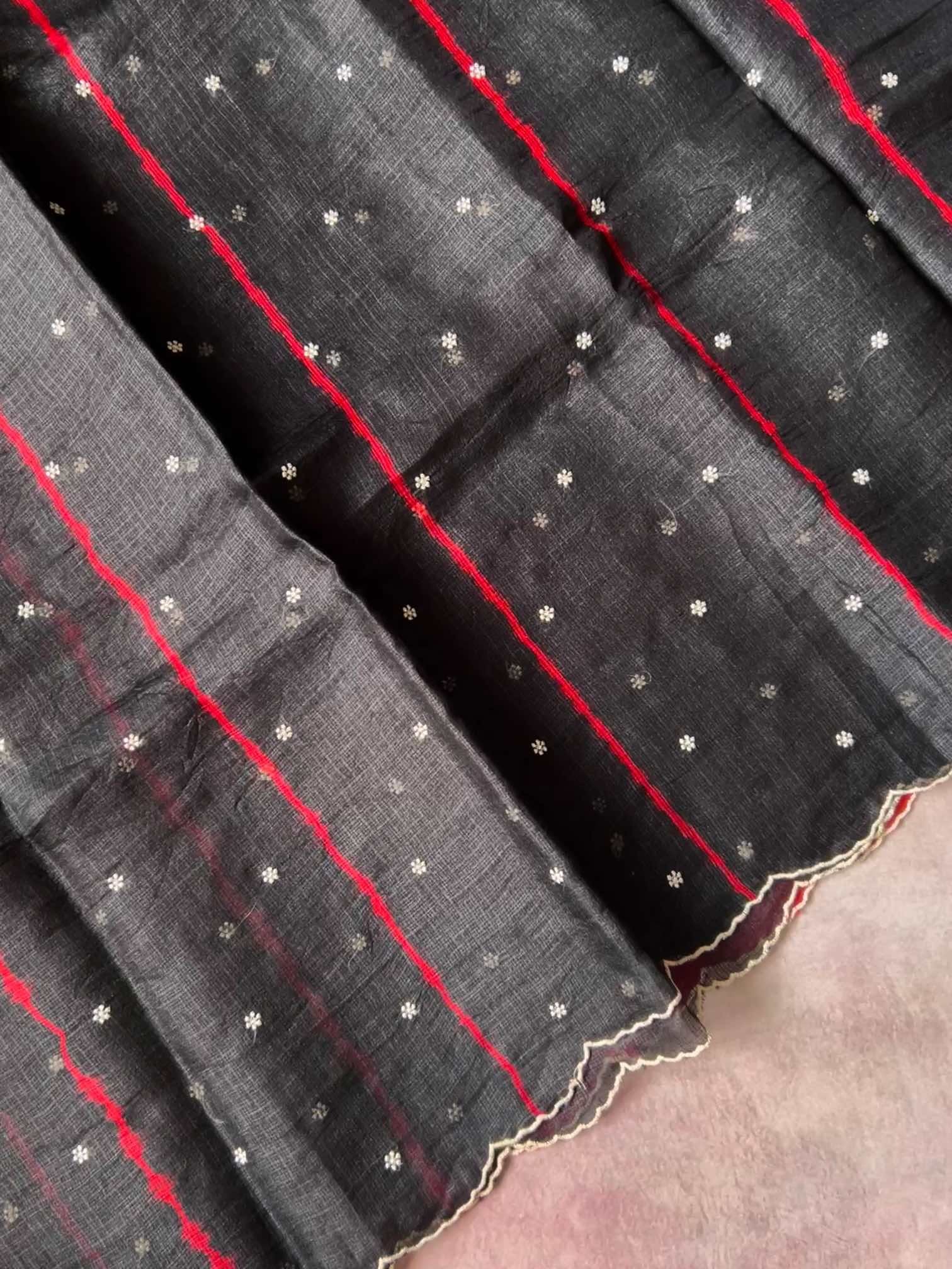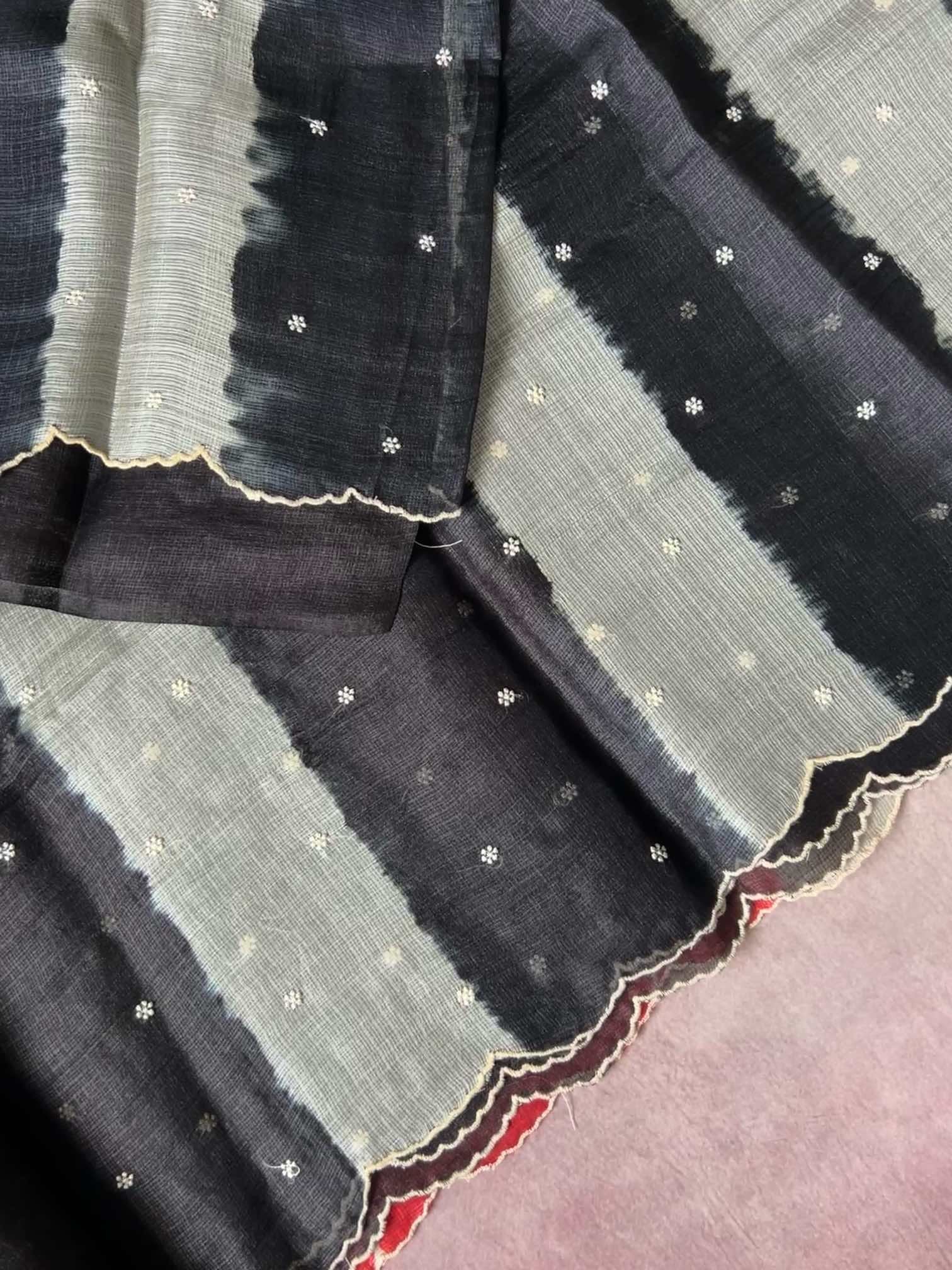 Tussar Kota with machine-embroidered mango buttas is a graceful fusion of tradition and modern craftsmanship. The natural sheen of tussar silk adds a rich, earthy elegance, while the lightweight Kota weave lends it an airy, delicate texture. The intricately embroidered mango buttas—symbolic of prosperity and heritage—bring a touch of timeless charm. This blend of refined fabric and subtle detailing makes it a perfect choice for both understated elegance and festive allure.