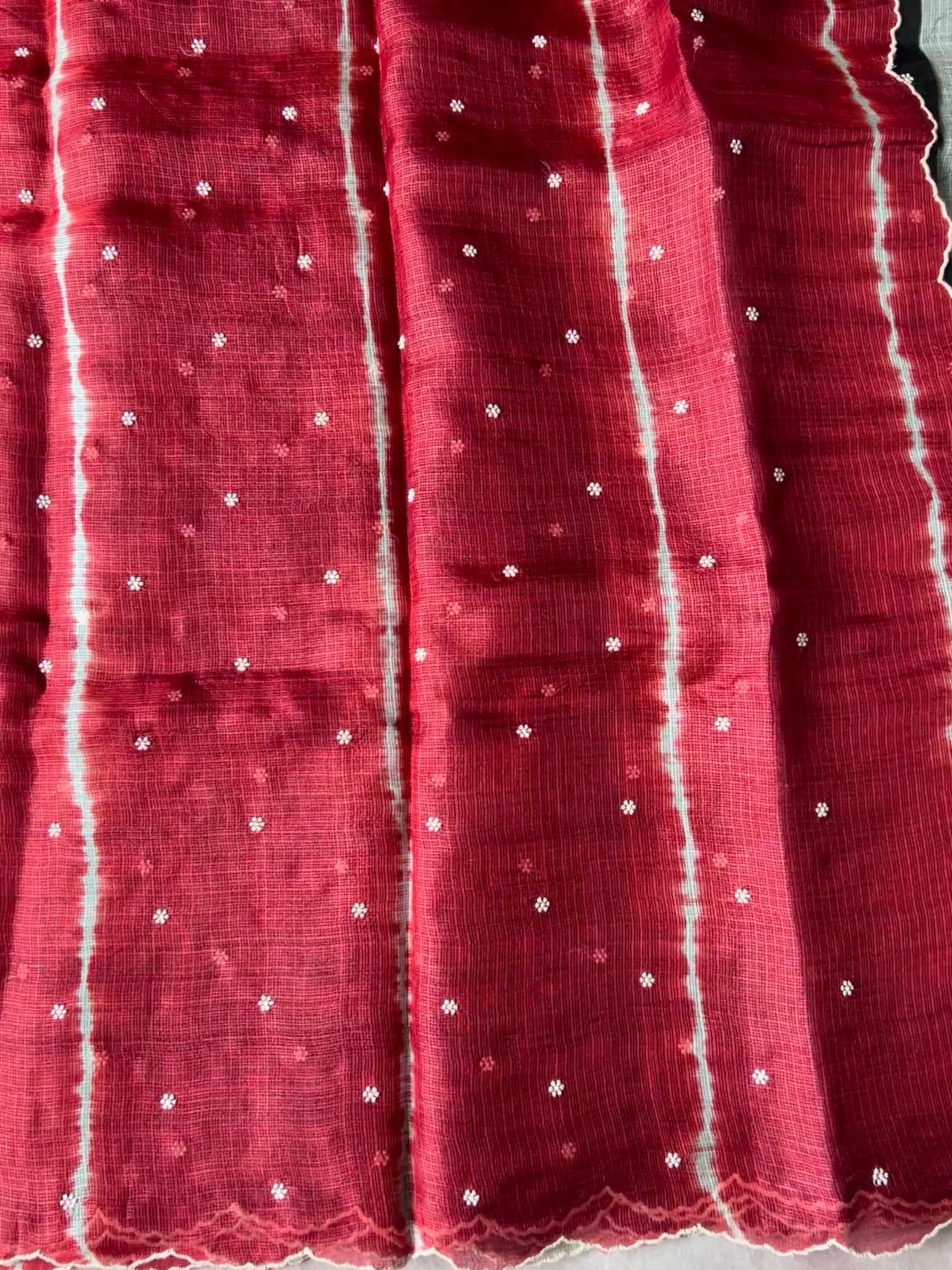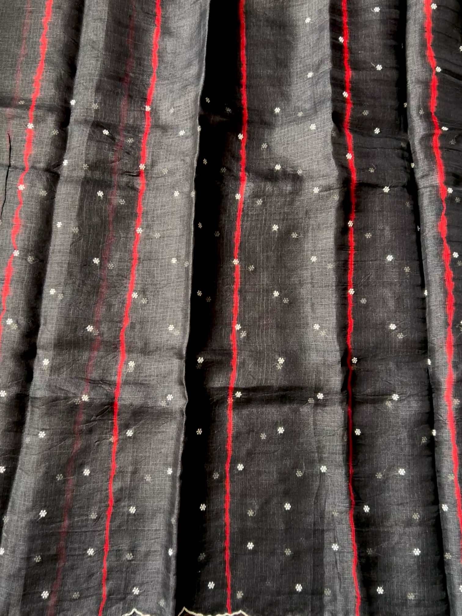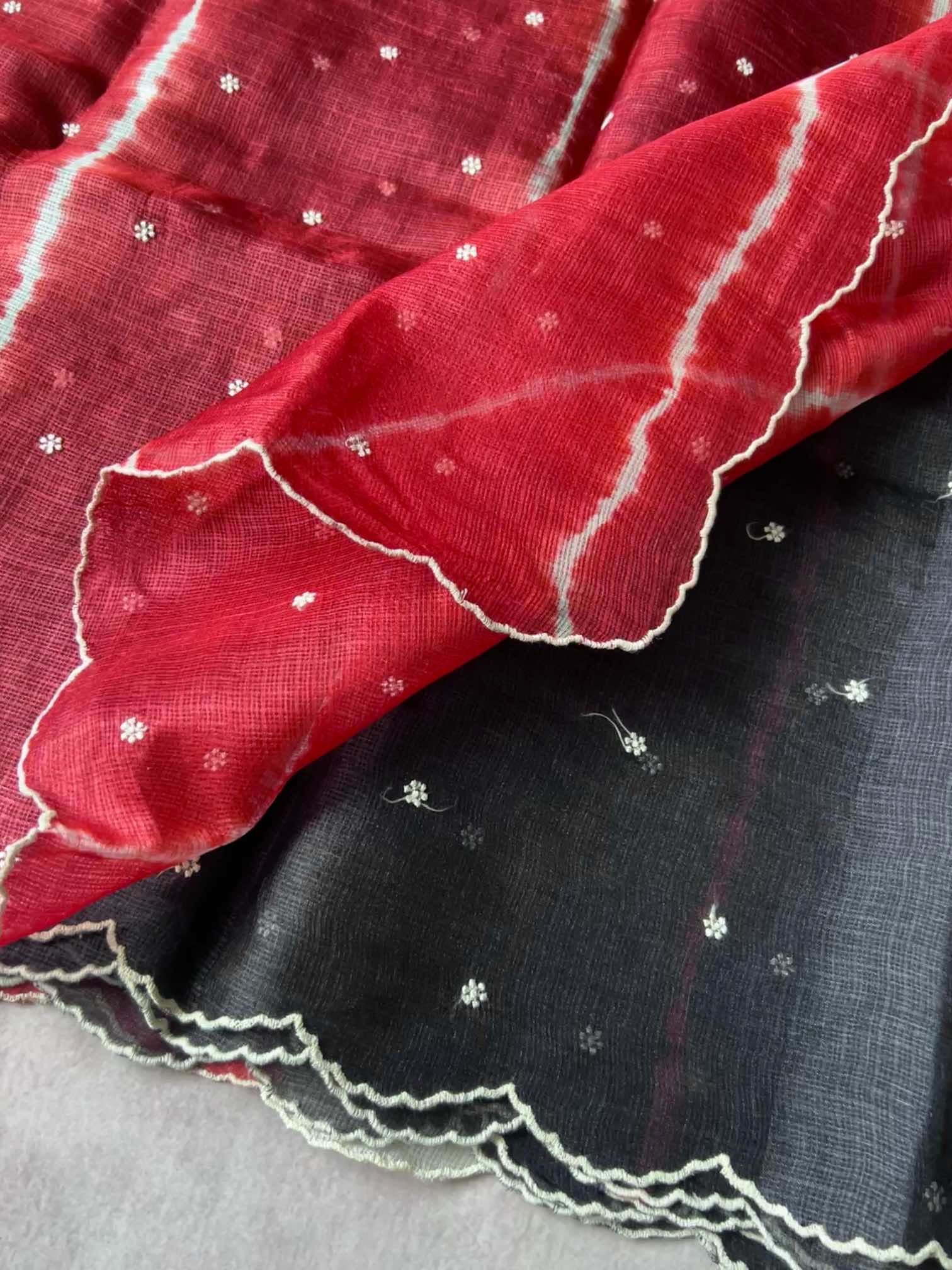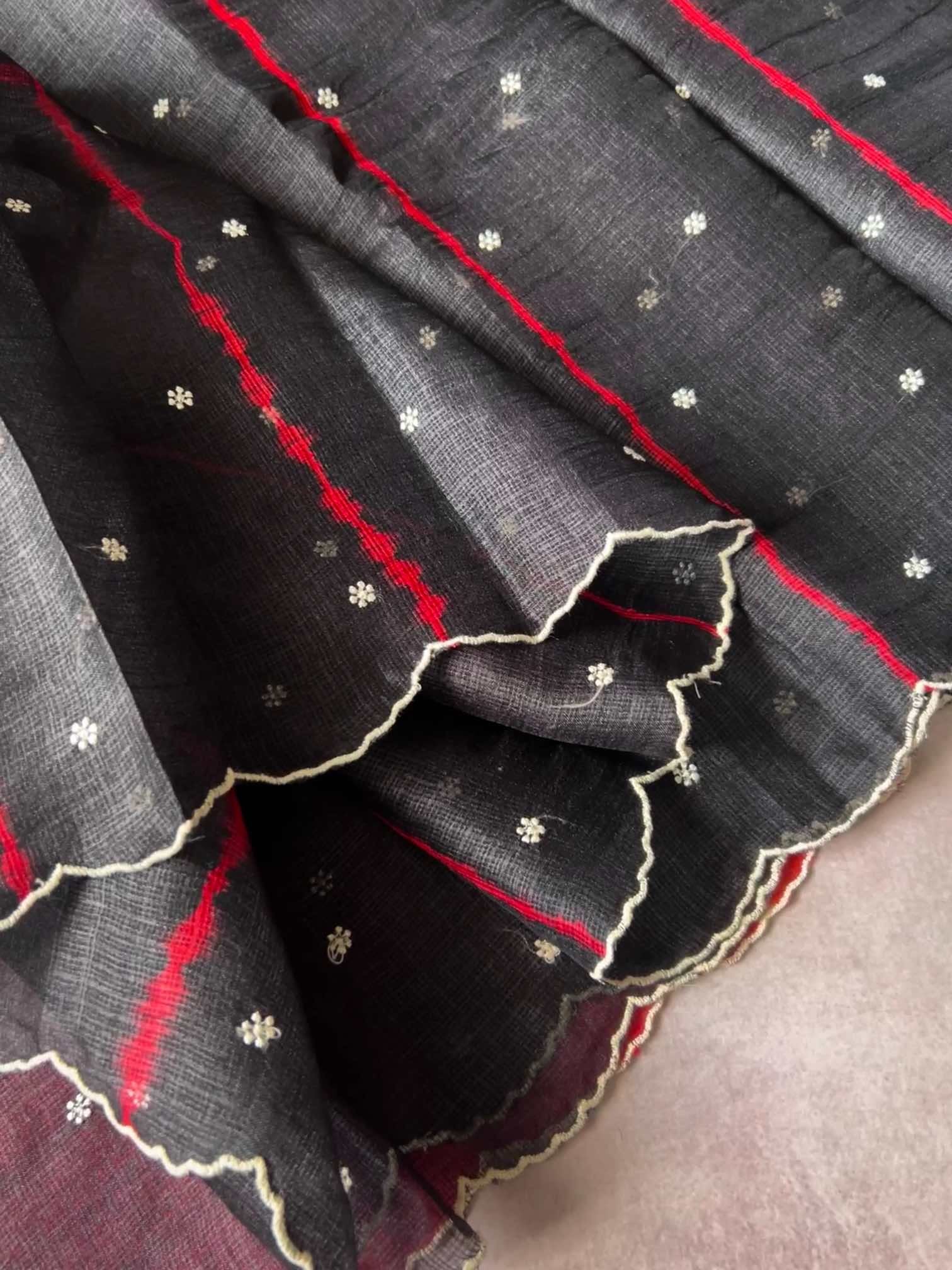 Tussar Kota with machine-embroidered mango buttas is a graceful fusion of tradition and modern craftsmanship. The natural sheen of tussar silk adds a rich, earthy elegance, while the lightweight Kota weave lends it an airy, delicate texture. The intricately embroidered mango buttas—symbolic of prosperity and heritage—bring a touch of timeless charm. This blend of refined fabric and subtle detailing makes it a perfect choice for both understated elegance and festive allure.