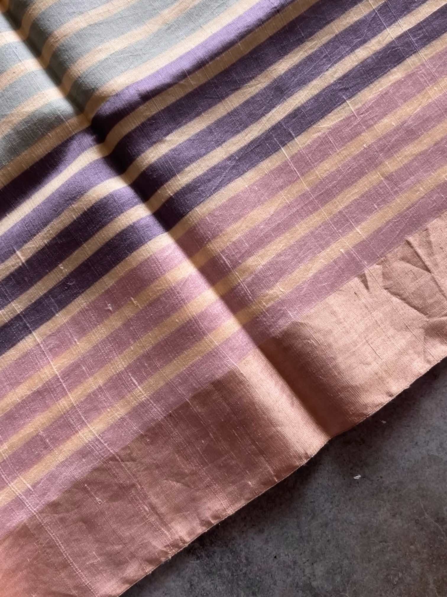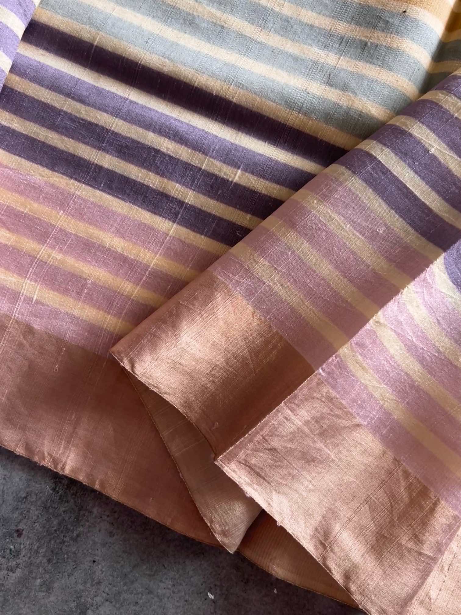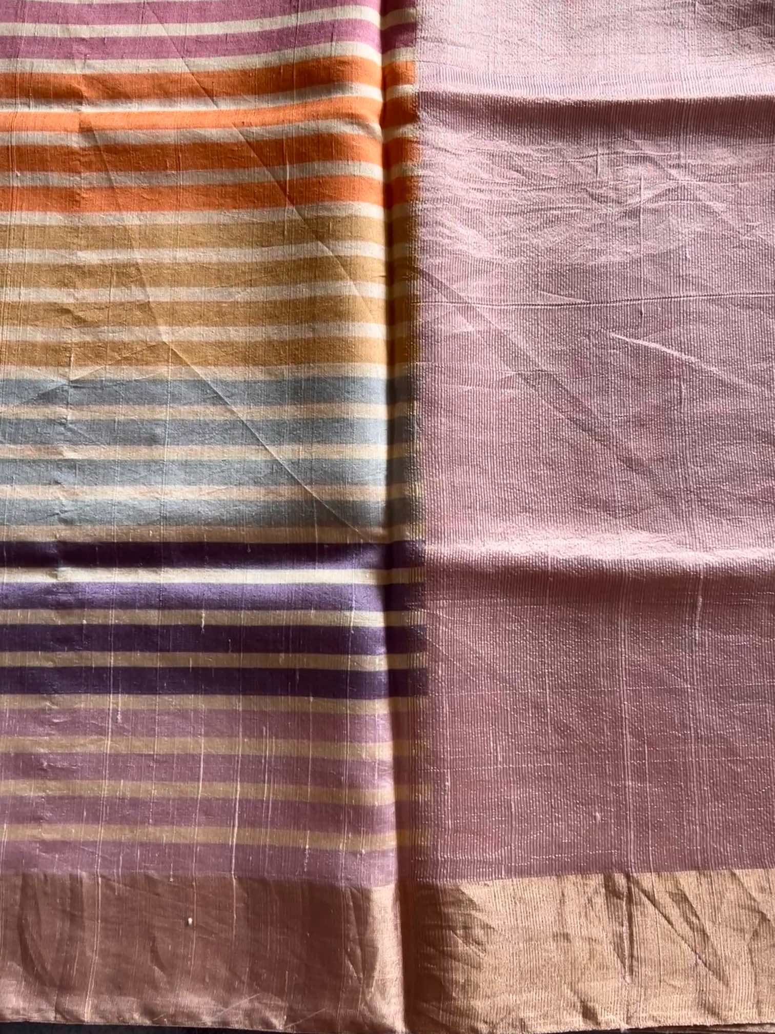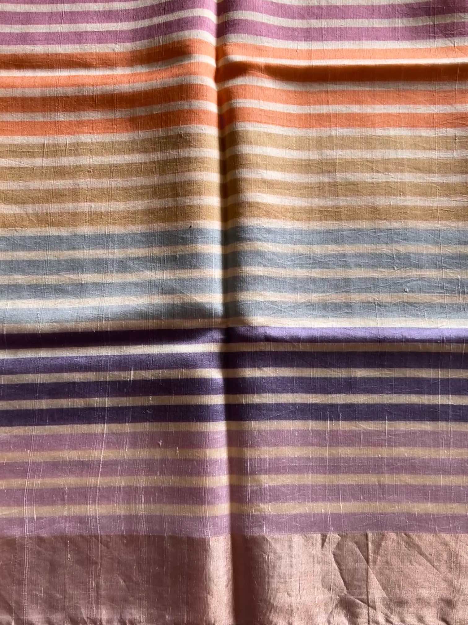 A Monga tussar silk saree with multicolour horizontal stripes is a celebration of natural beauty and vibrant artistry. The rich, textured weave of tussar silk lends an earthy elegance, while the lively stripes bring a playful burst of color. Together, they create a saree that feels effortlessly graceful, rooted in tradition yet refreshingly contemporary.